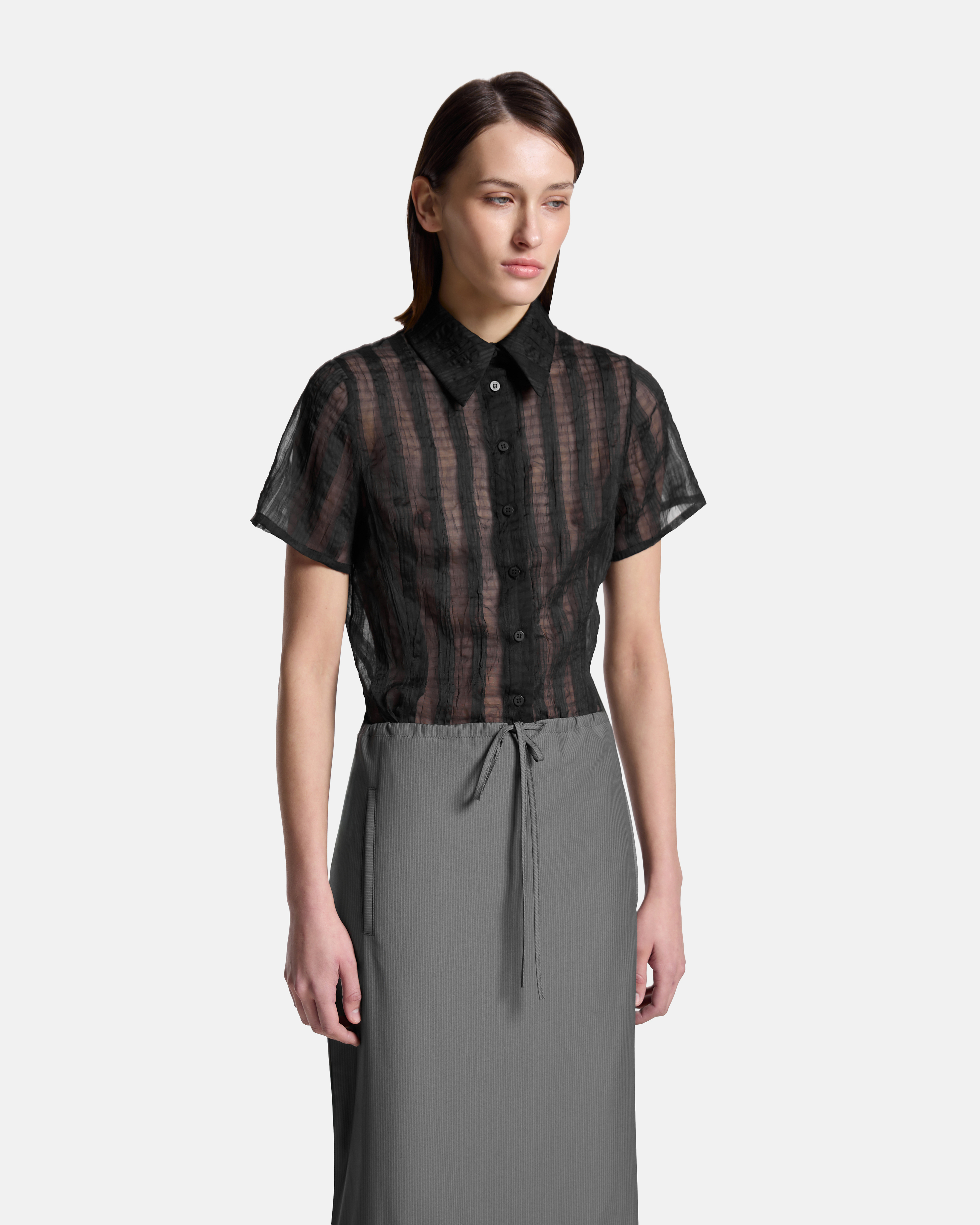 Блуза из шифона с фактурными вертикальными линиями продолжает тему «бельевых мотивов» в коллекции INVERO. Мы стремились к образу, в котором прозрачность и простота формы становятся выразительным инструментом — привычный силуэт приобретает новое, хрупкое звучание.