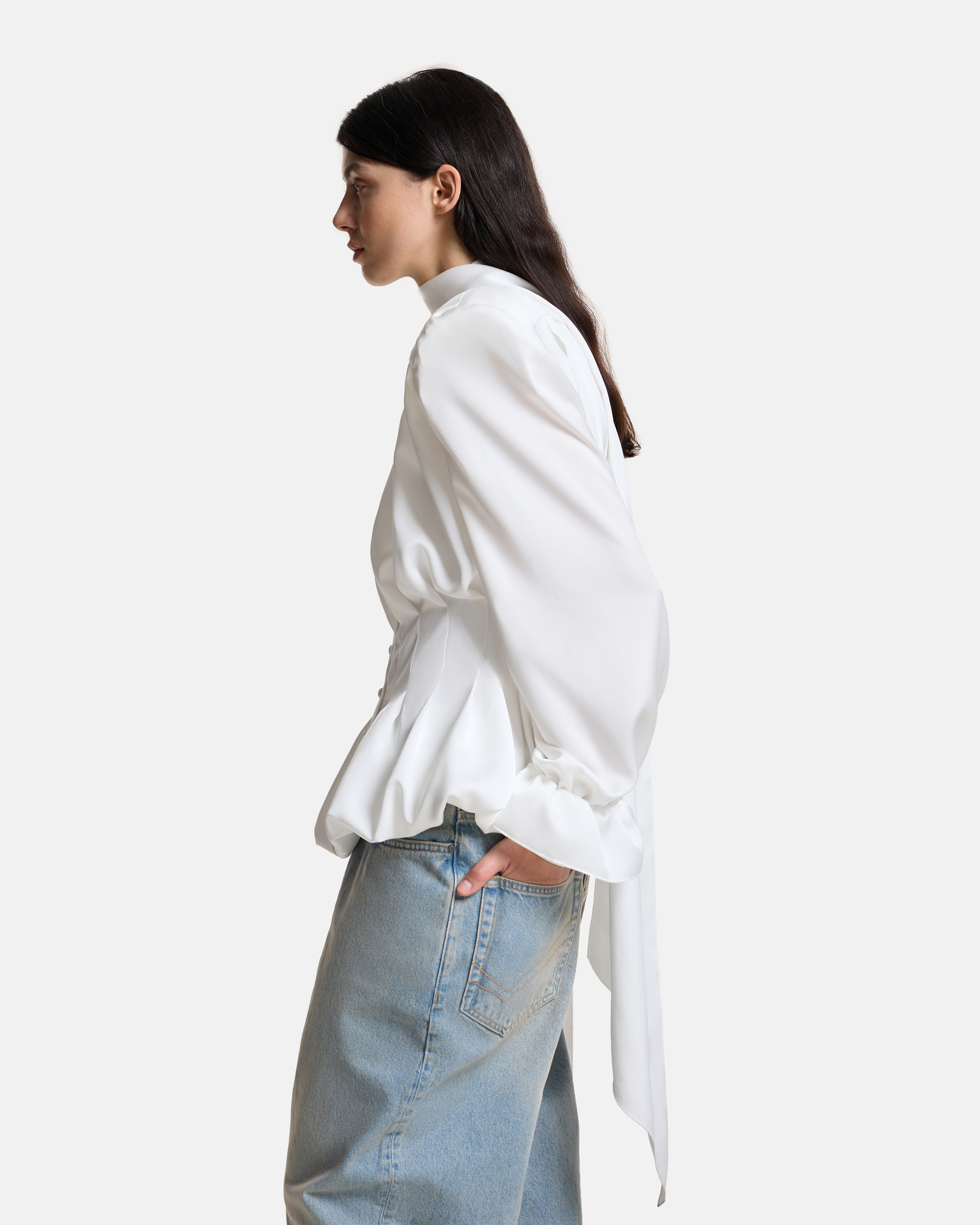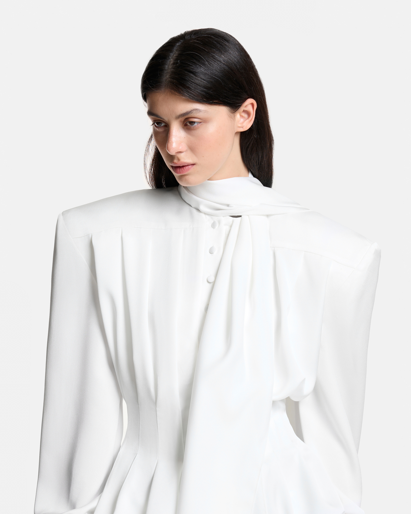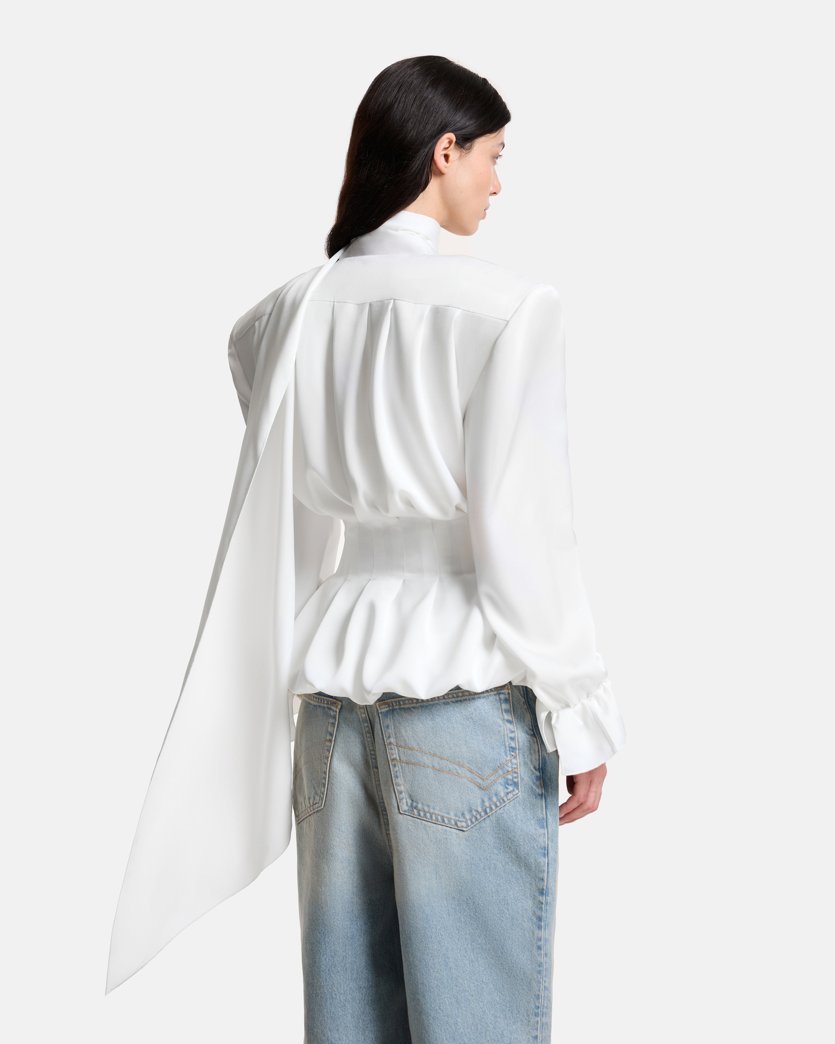 Блуза с лентами на подкладе приталенного силуэта застегивается на обтяжные пуговицы. Декорирована складками по всему изделию, на манжетах предусмотрены пуговицы для регулировки объема.