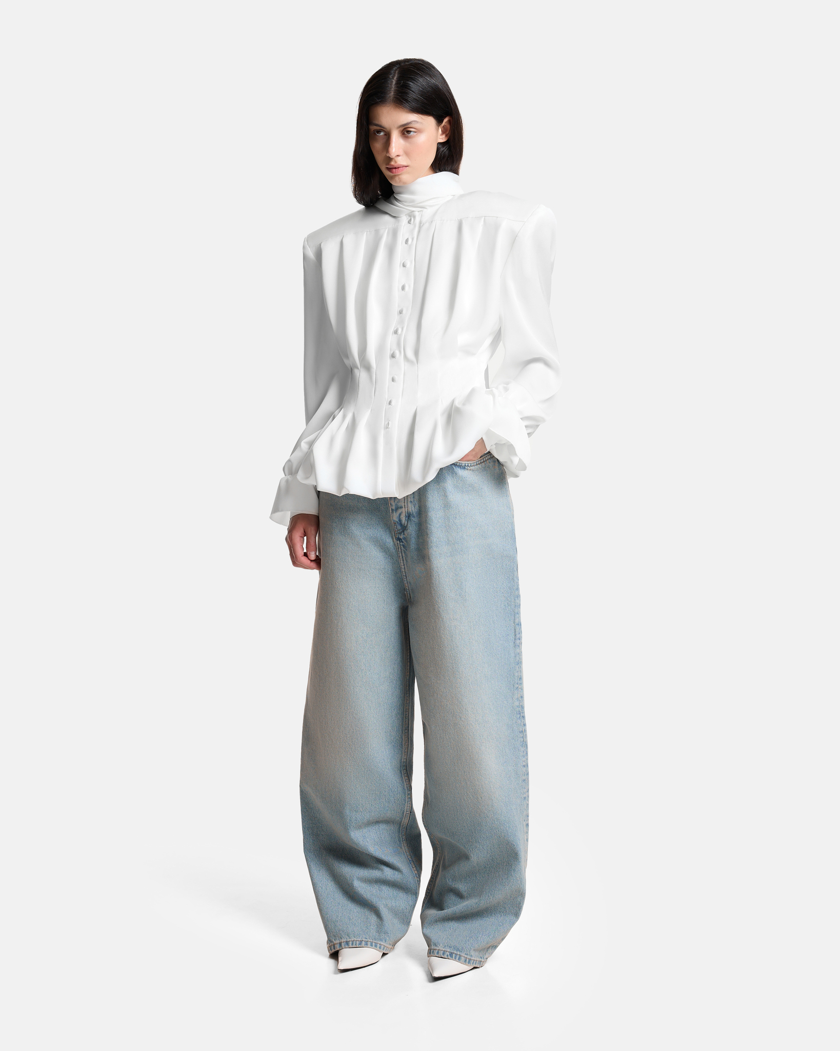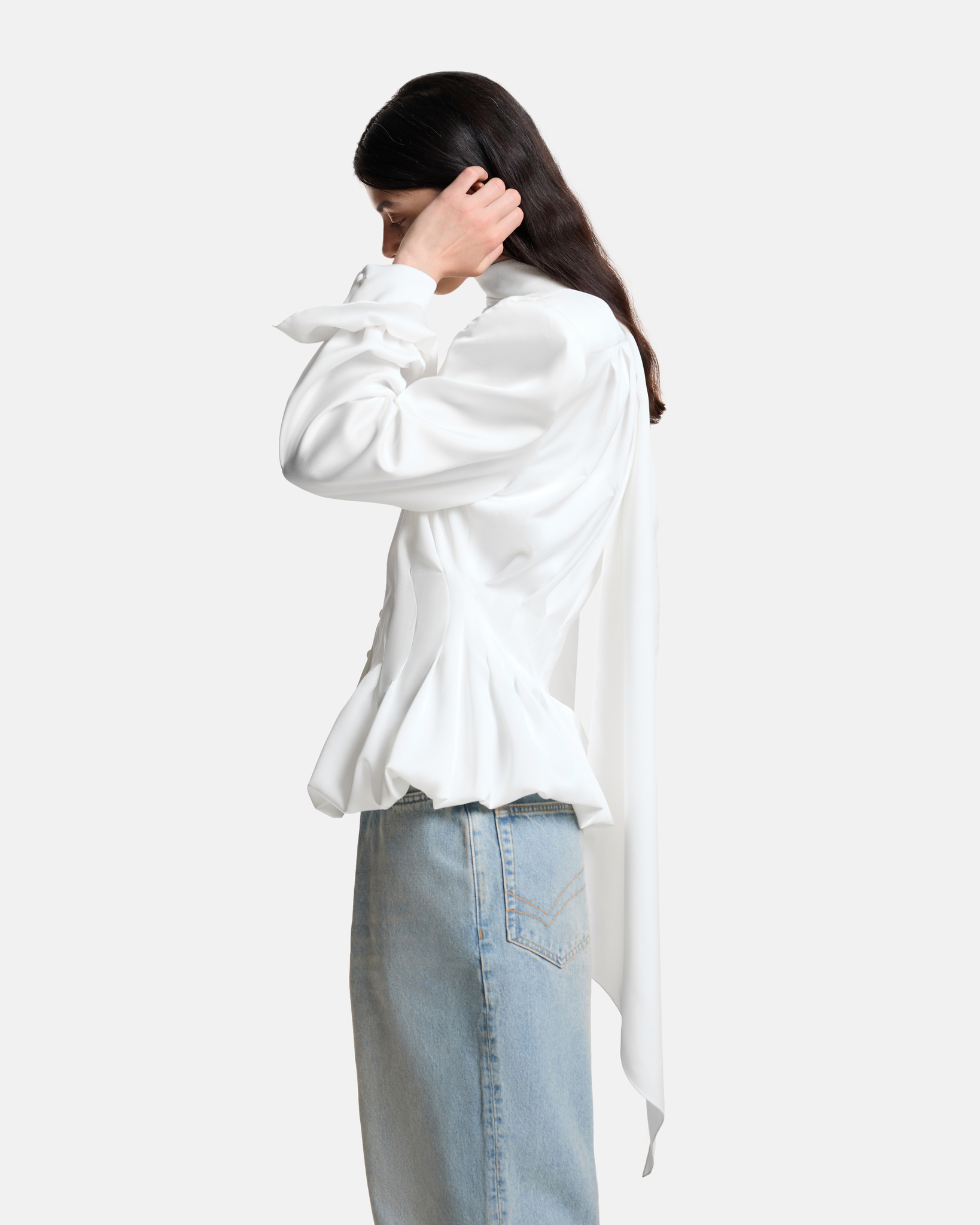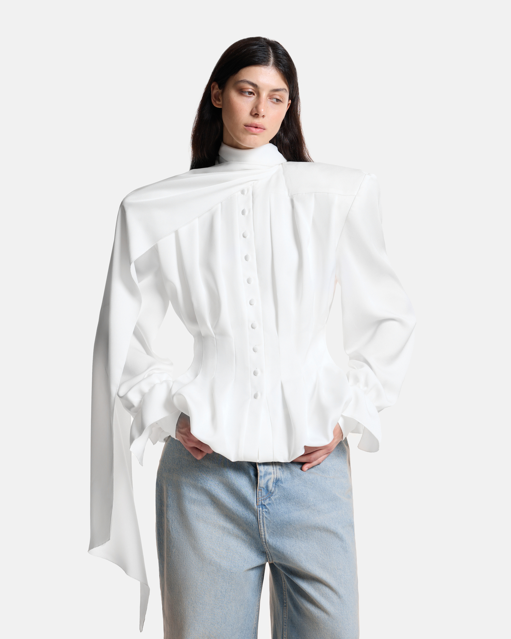 Блуза с лентами на подкладе приталенного силуэта застегивается на обтяжные пуговицы. Декорирована складками по всему изделию, на манжетах предусмотрены пуговицы для регулировки объема.