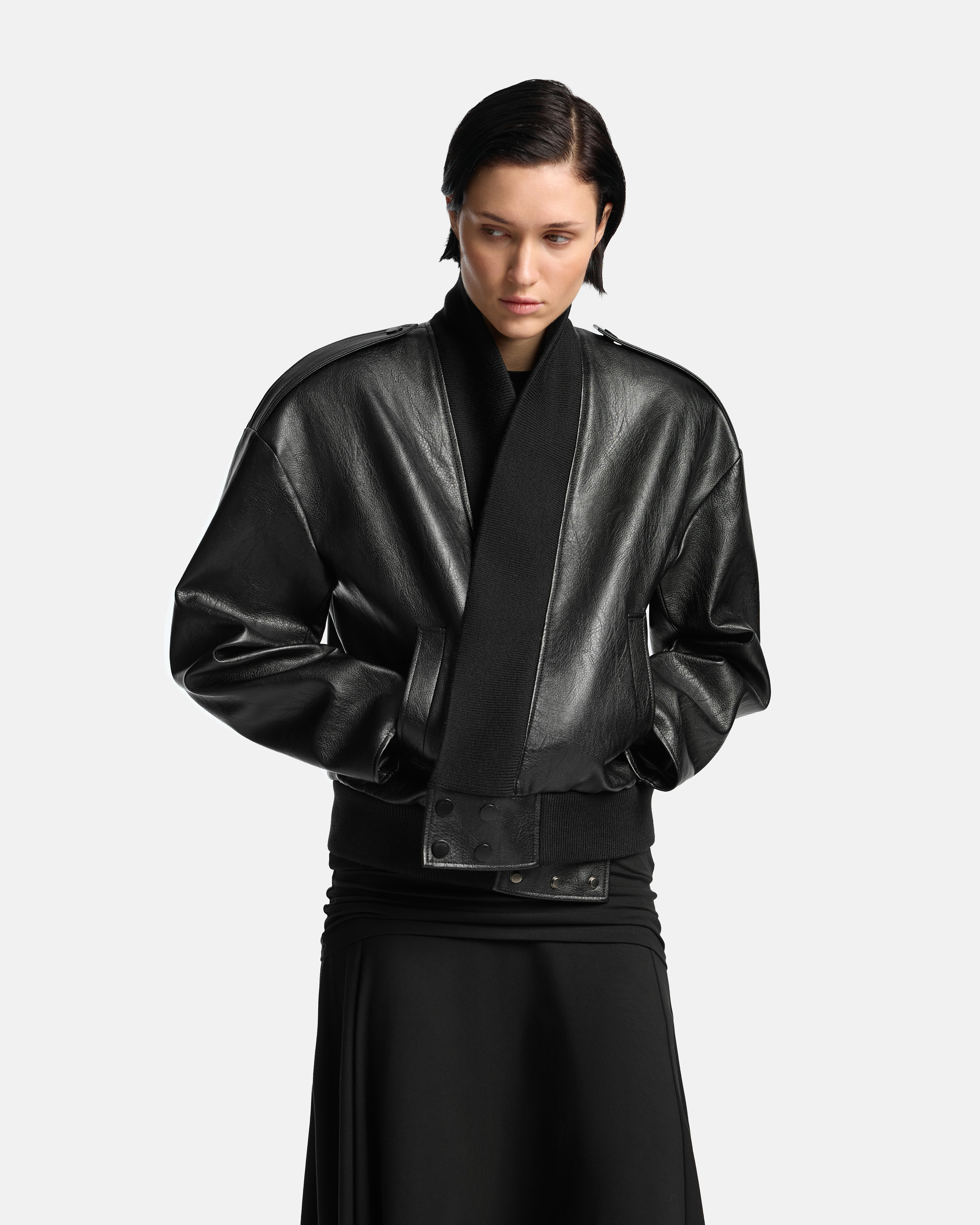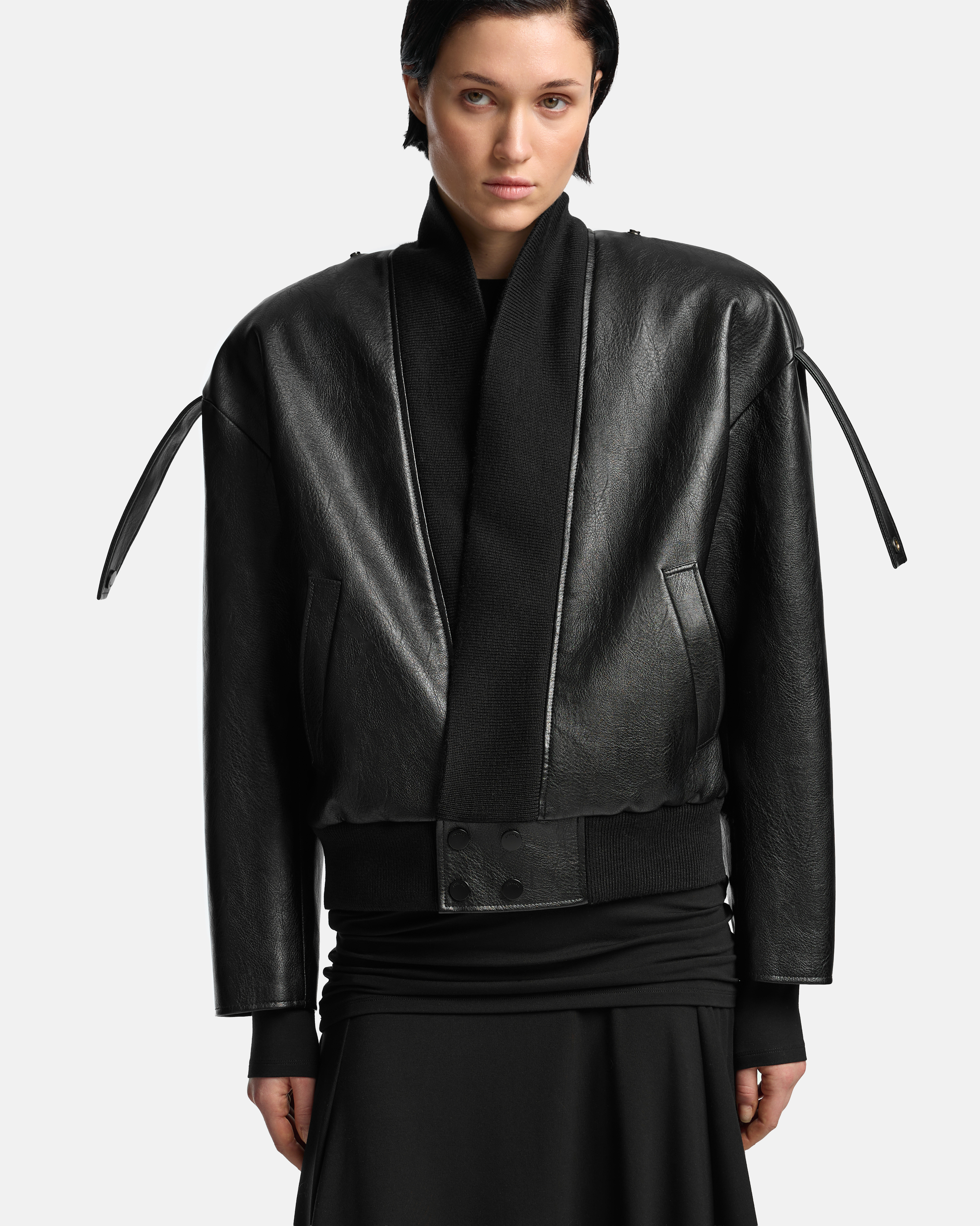 Название Archive фиксирует это состояние: вещь выглядит так, будто она уже прожила свою историю и только сейчас вернулась в сегодняшний контекст. Модель выполнена из экокожи, дополнена отвязанным шалевым воротником. Бомбер застёгивается на кнопки и имеет два функциональных кармана.