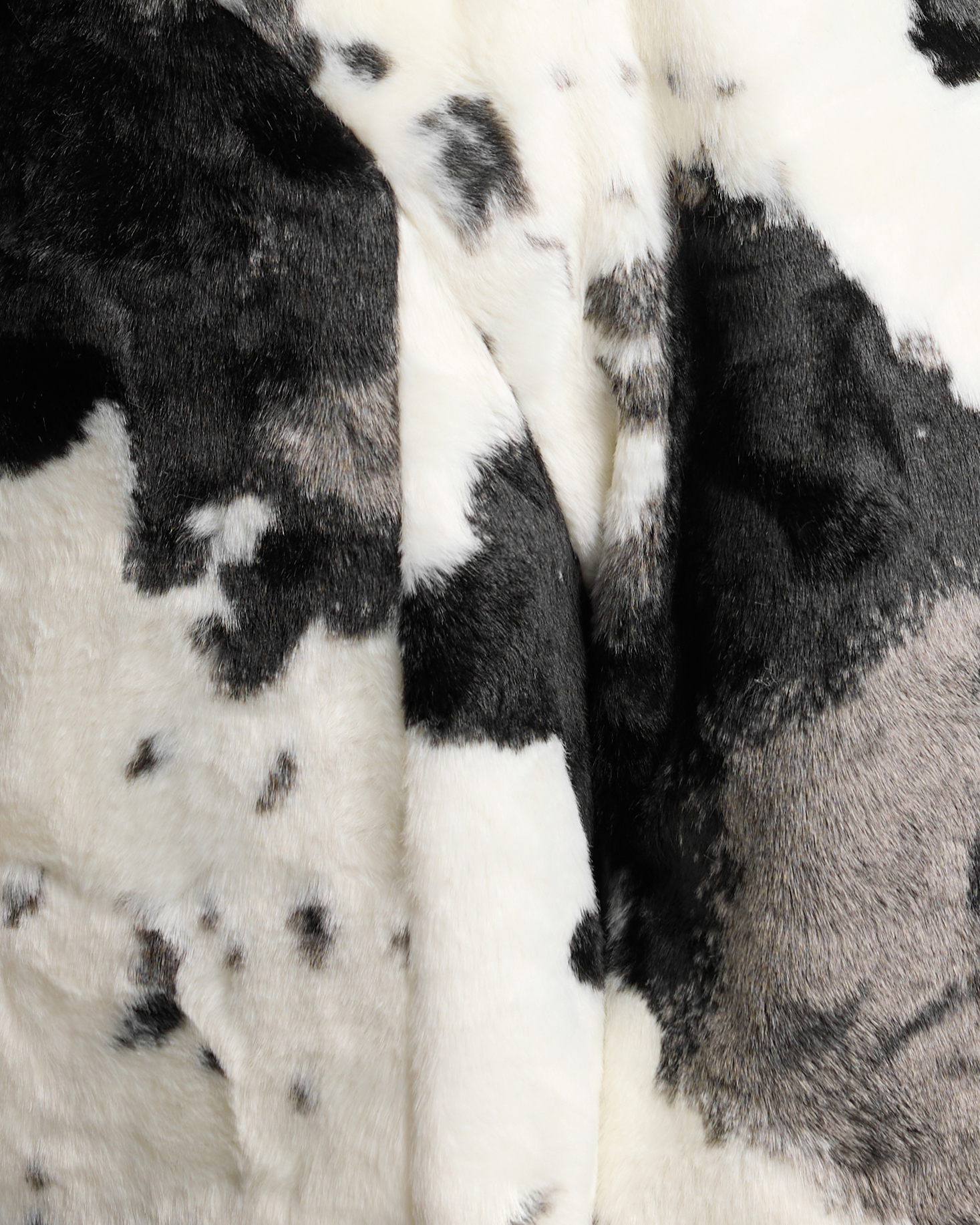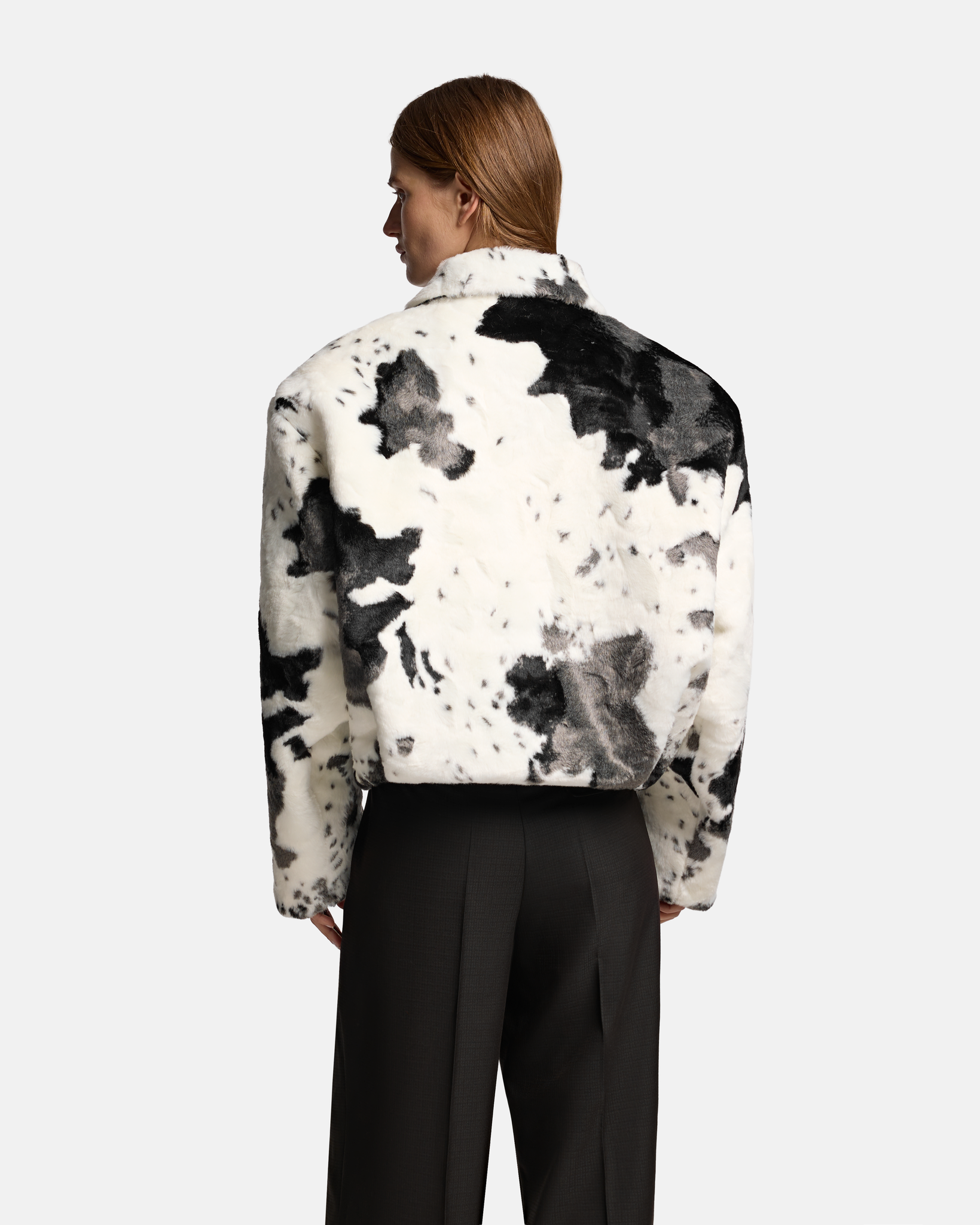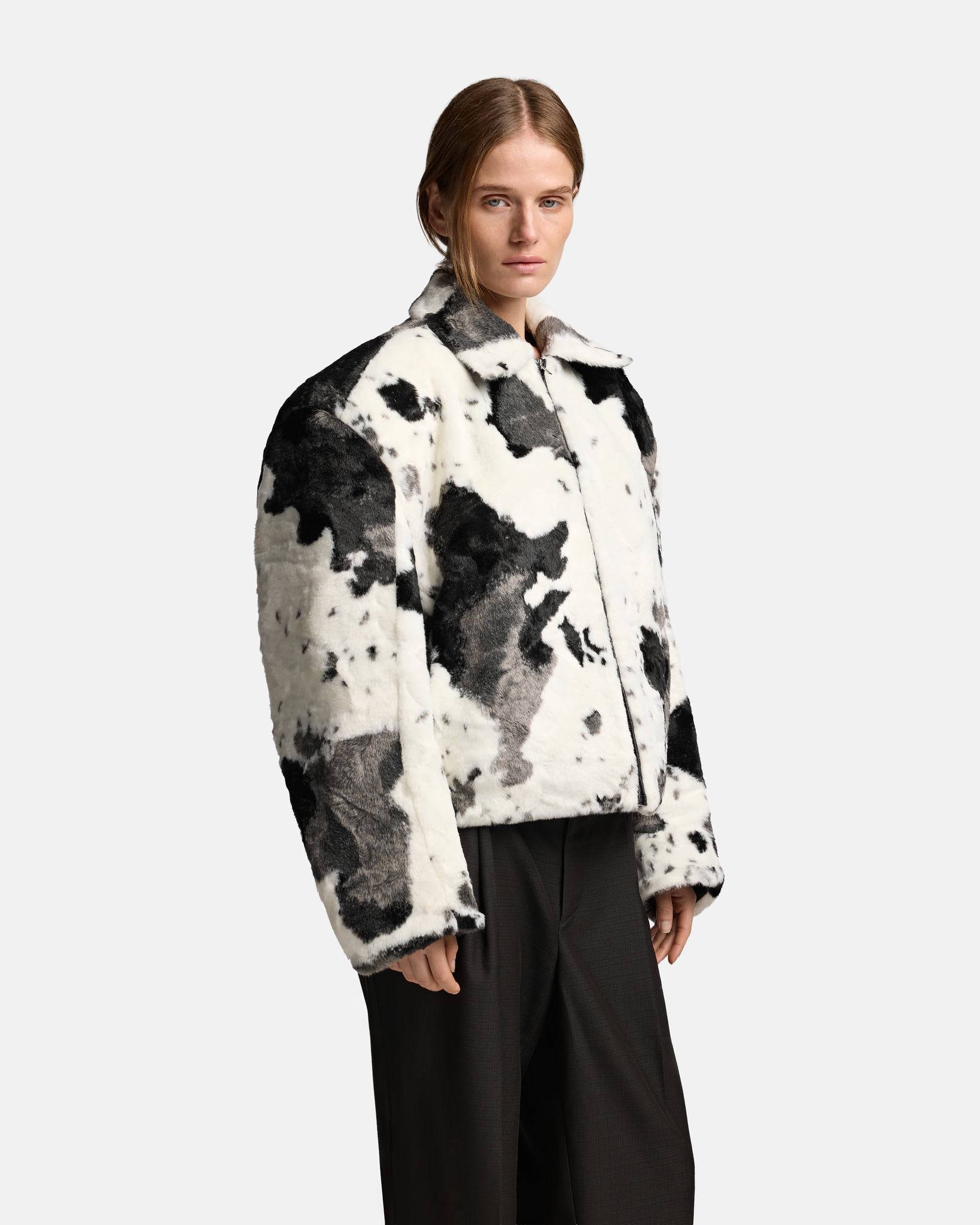 Бомбер D-силуэта из искусственного меха с принтом, напоминающим коровью шкуру. Мы искали способ соединить привычный для уличной одежды силуэт с более дерзким прочтением классической фактуры — отсюда и выбор рисунка.