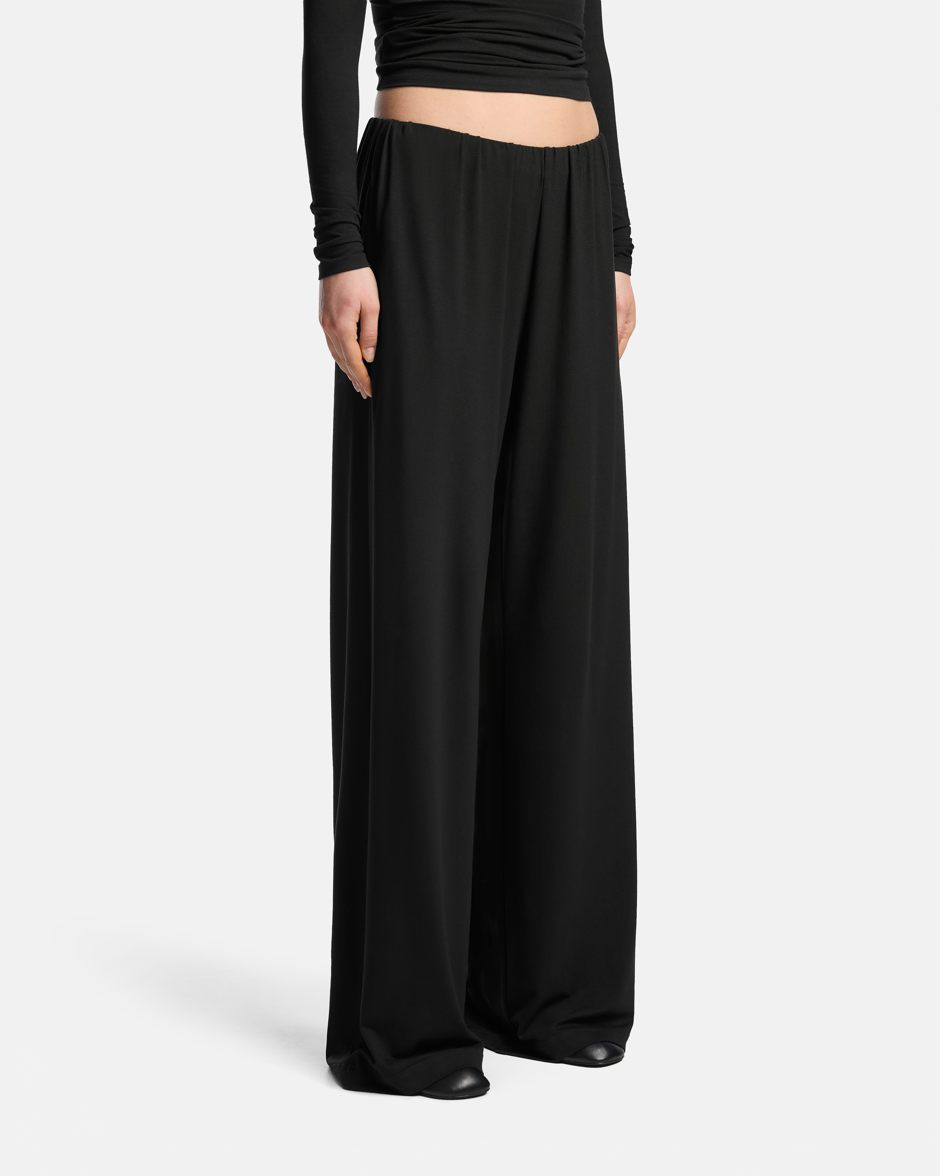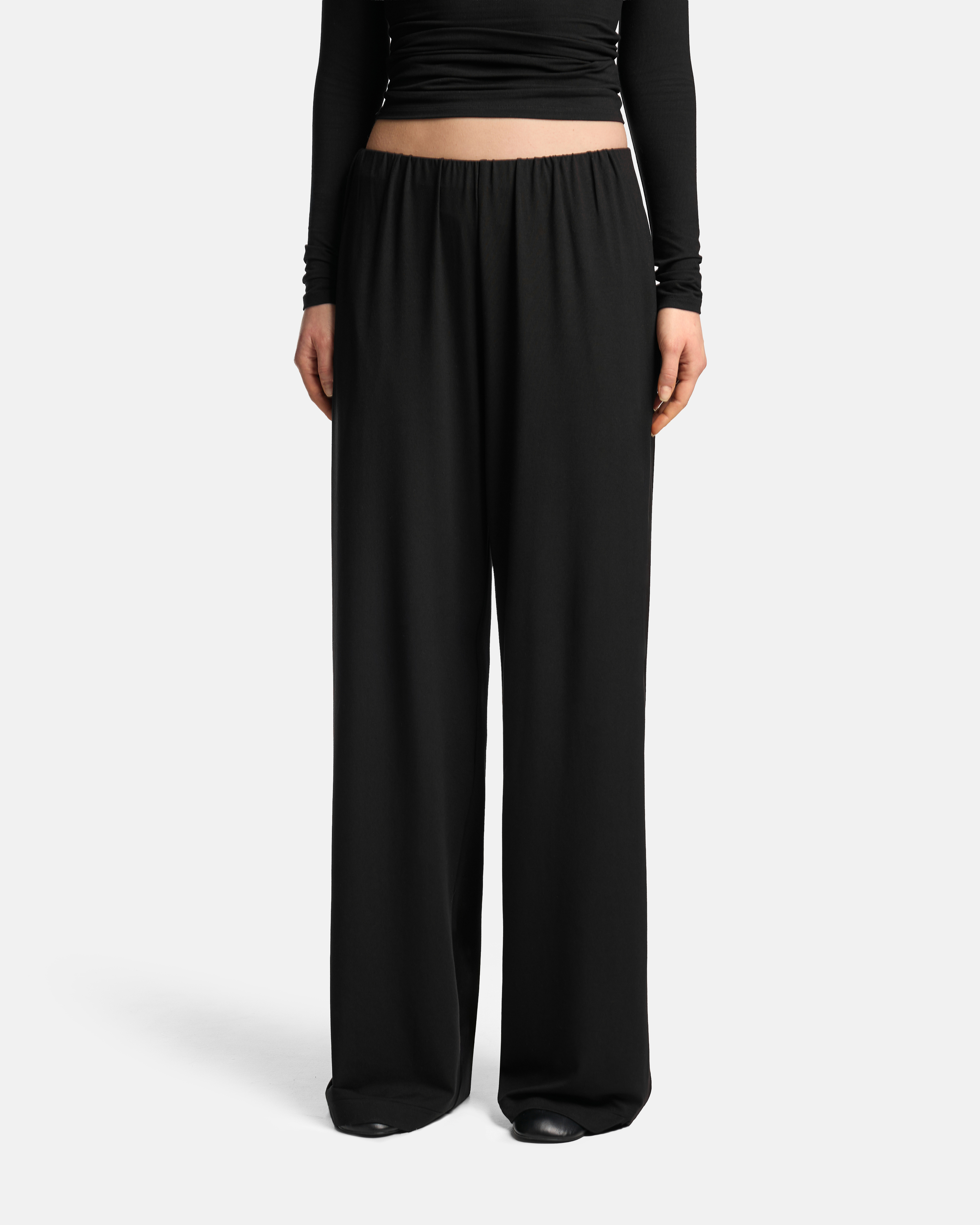 Брюки из эластичного вискозного трикотажа свободного кроя на резинке. Материал мягкий, тонкий и комфортный. Модель подходит для самостоятельной носки и хорошо работает в многослойных сочетаниях.