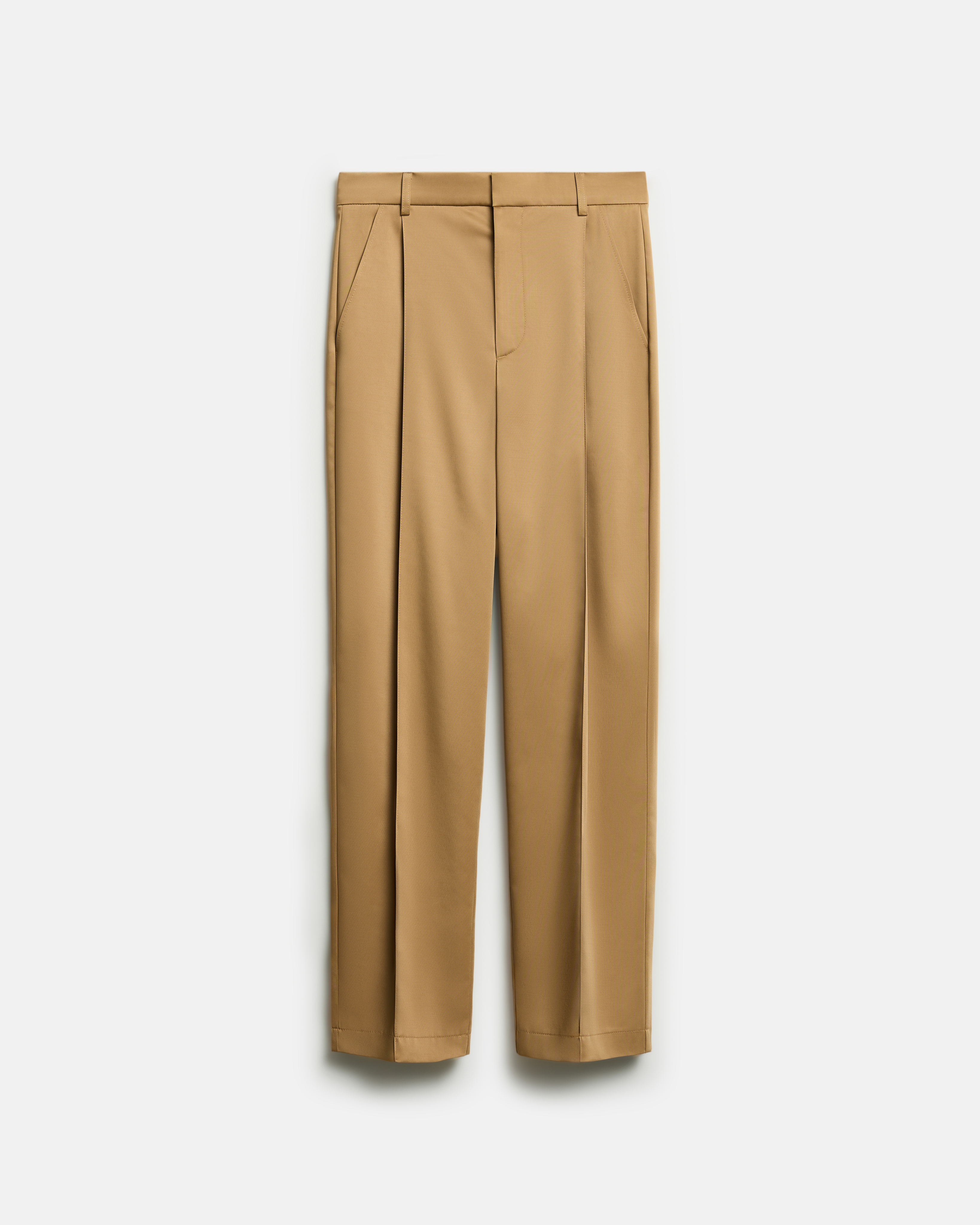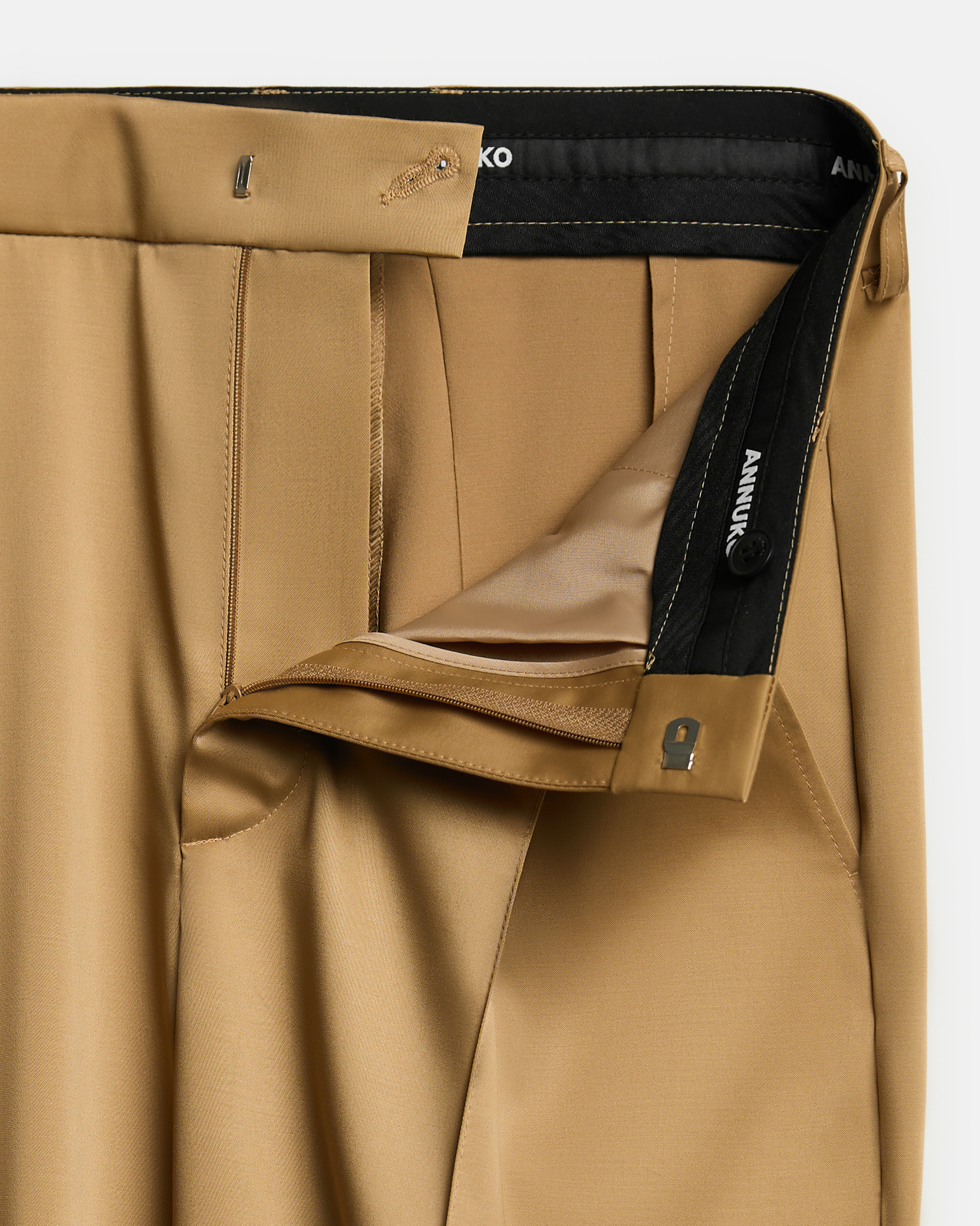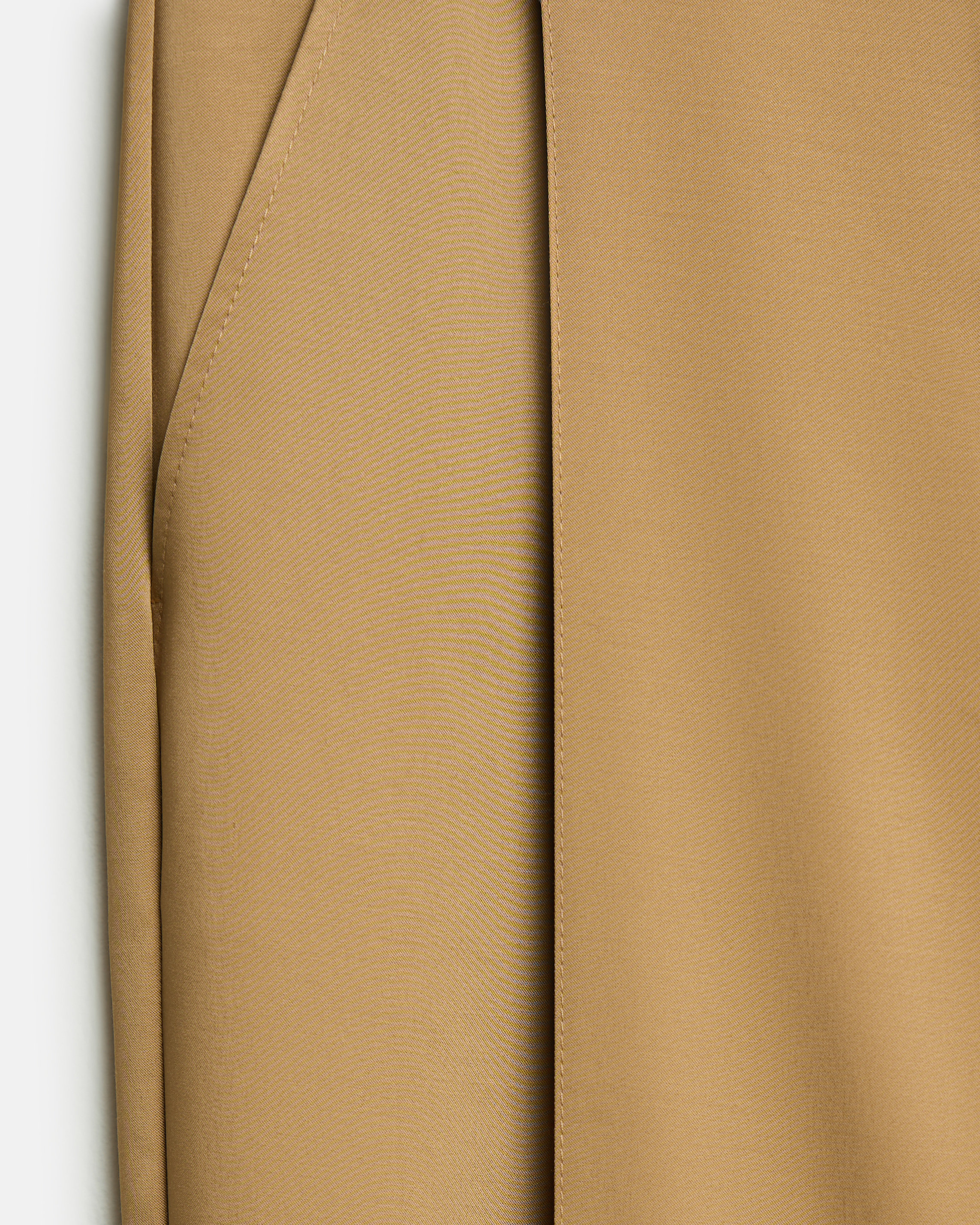 Пояс на корсажной ленте — держит форму и фиксирует посадку. Стрелки застрочены: линия остаётся чёткой от пояса до низа. Два боковых кармана. Застёжка — молния, потайной крючок и пуговка. Чистая конструкция и строгая вертикаль.