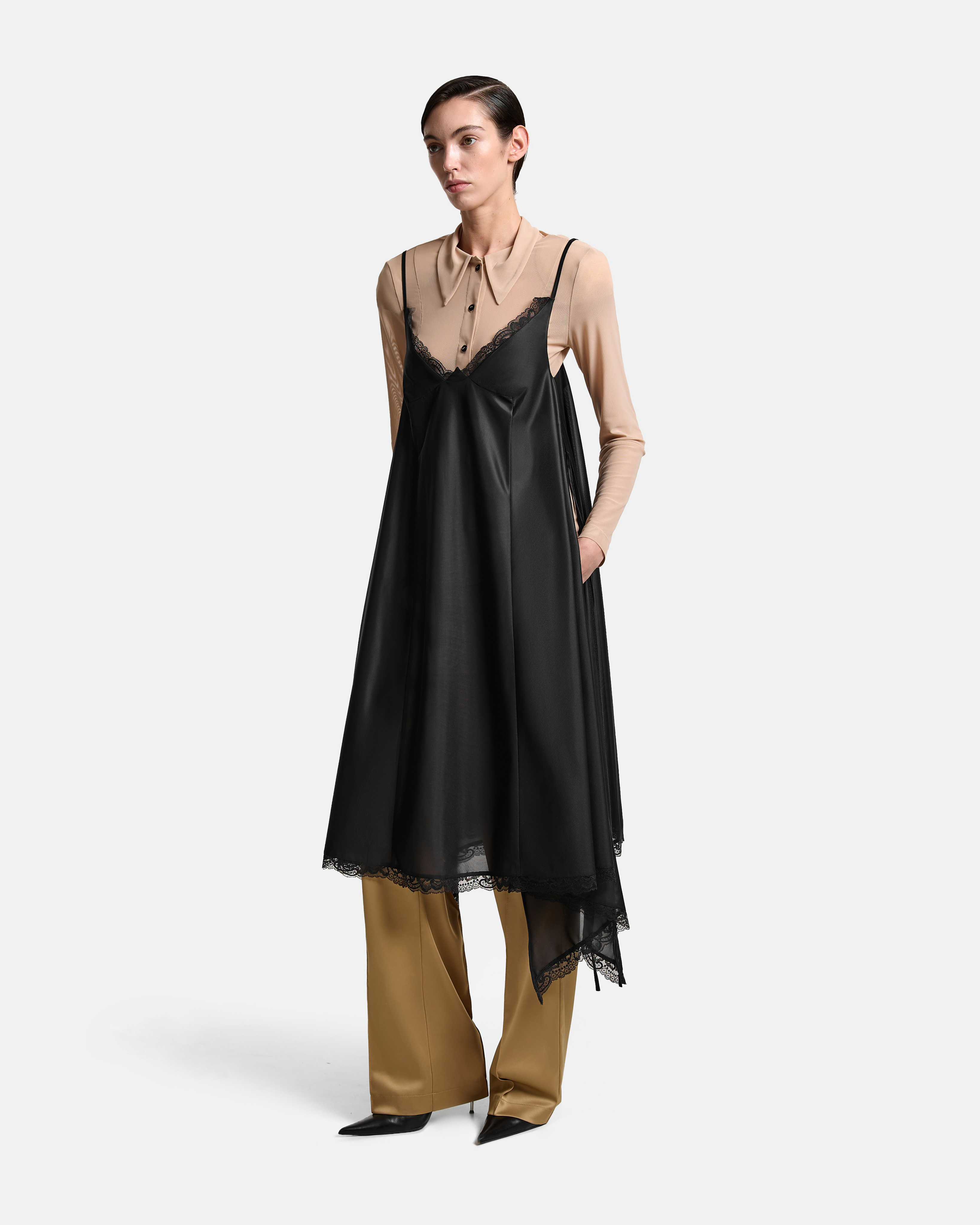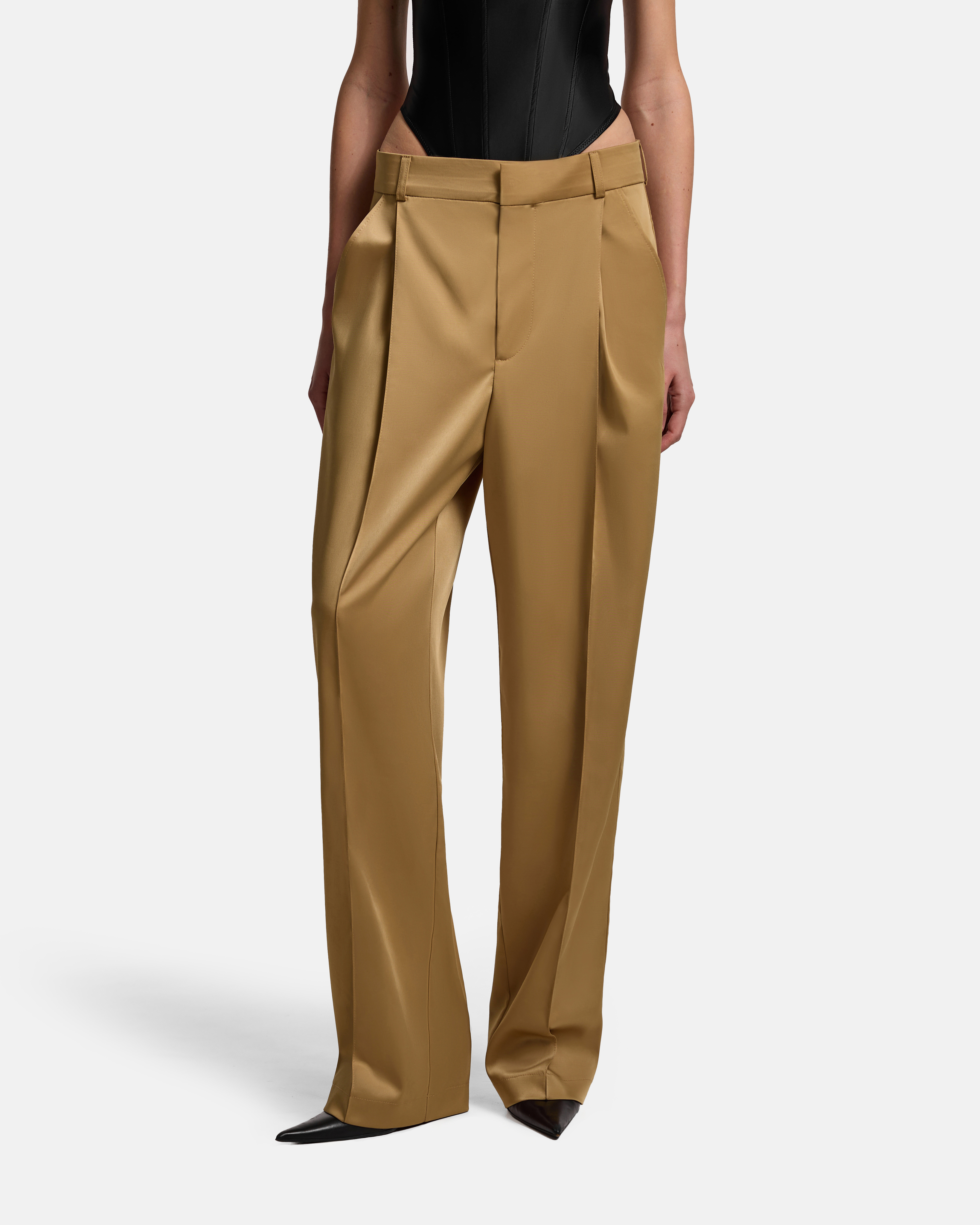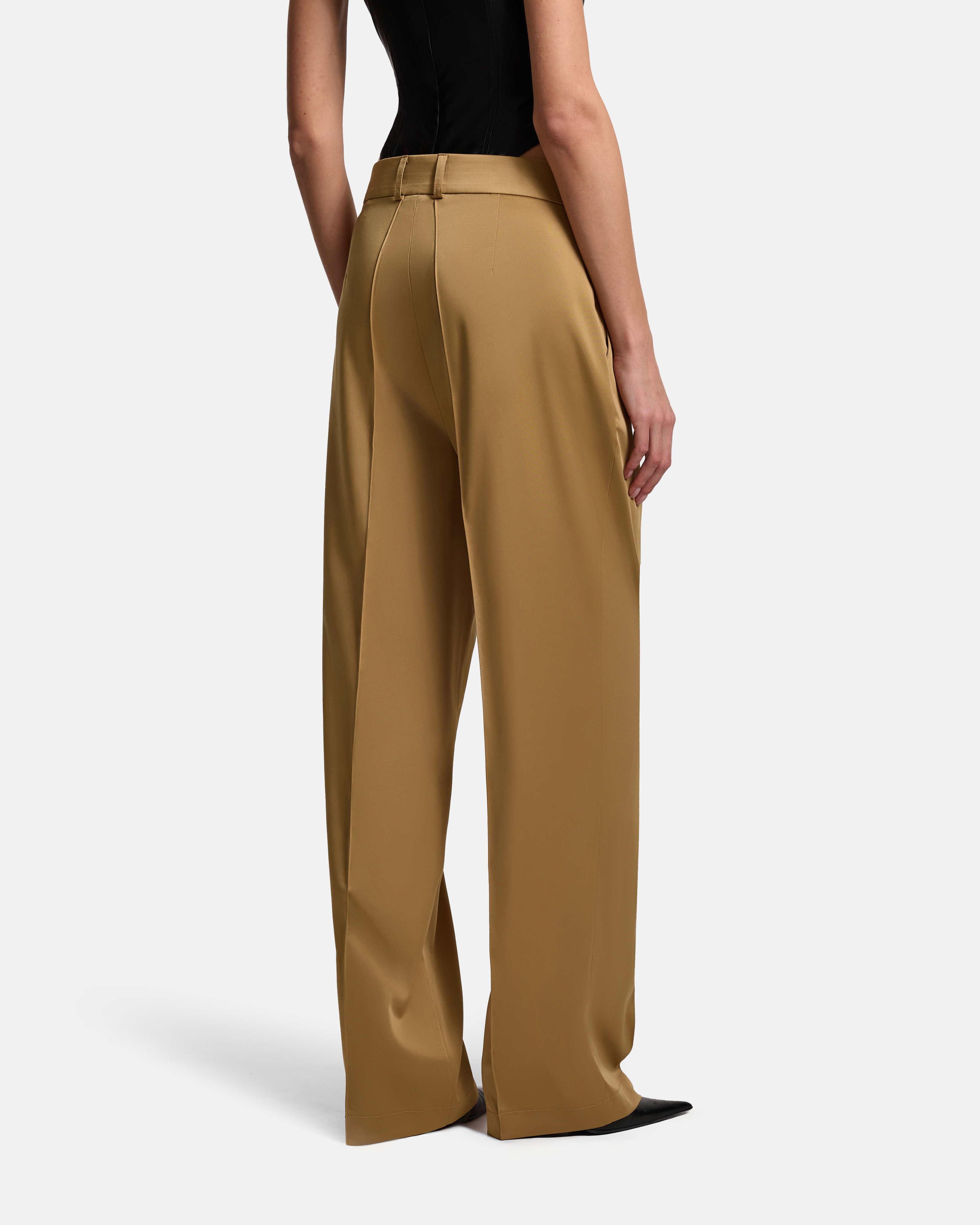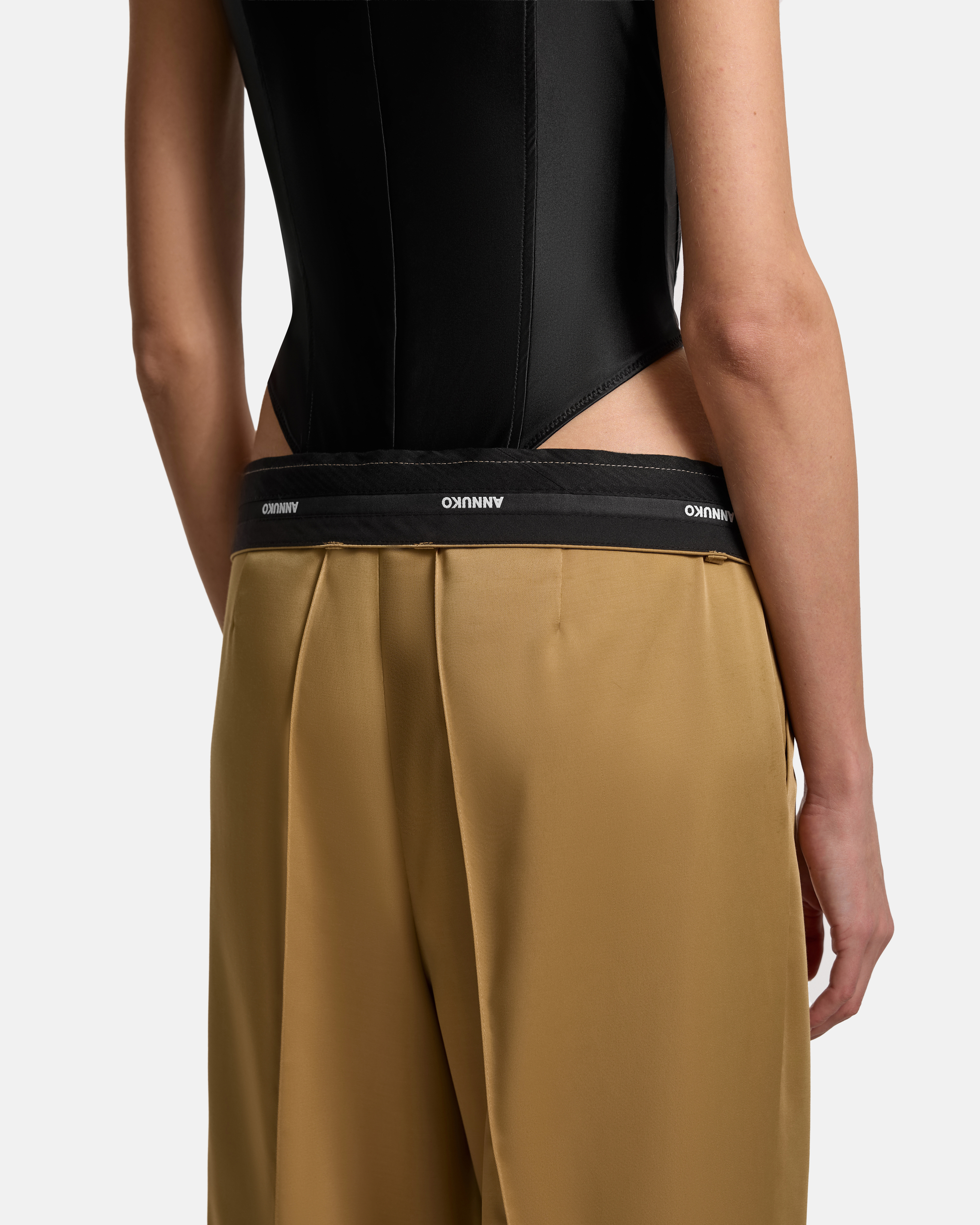 Пояс на корсажной ленте — держит форму и фиксирует посадку. Стрелки застрочены: линия остаётся чёткой от пояса до низа. Два боковых кармана. Застёжка — молния, потайной крючок и пуговка. Чистая конструкция и строгая вертикаль.