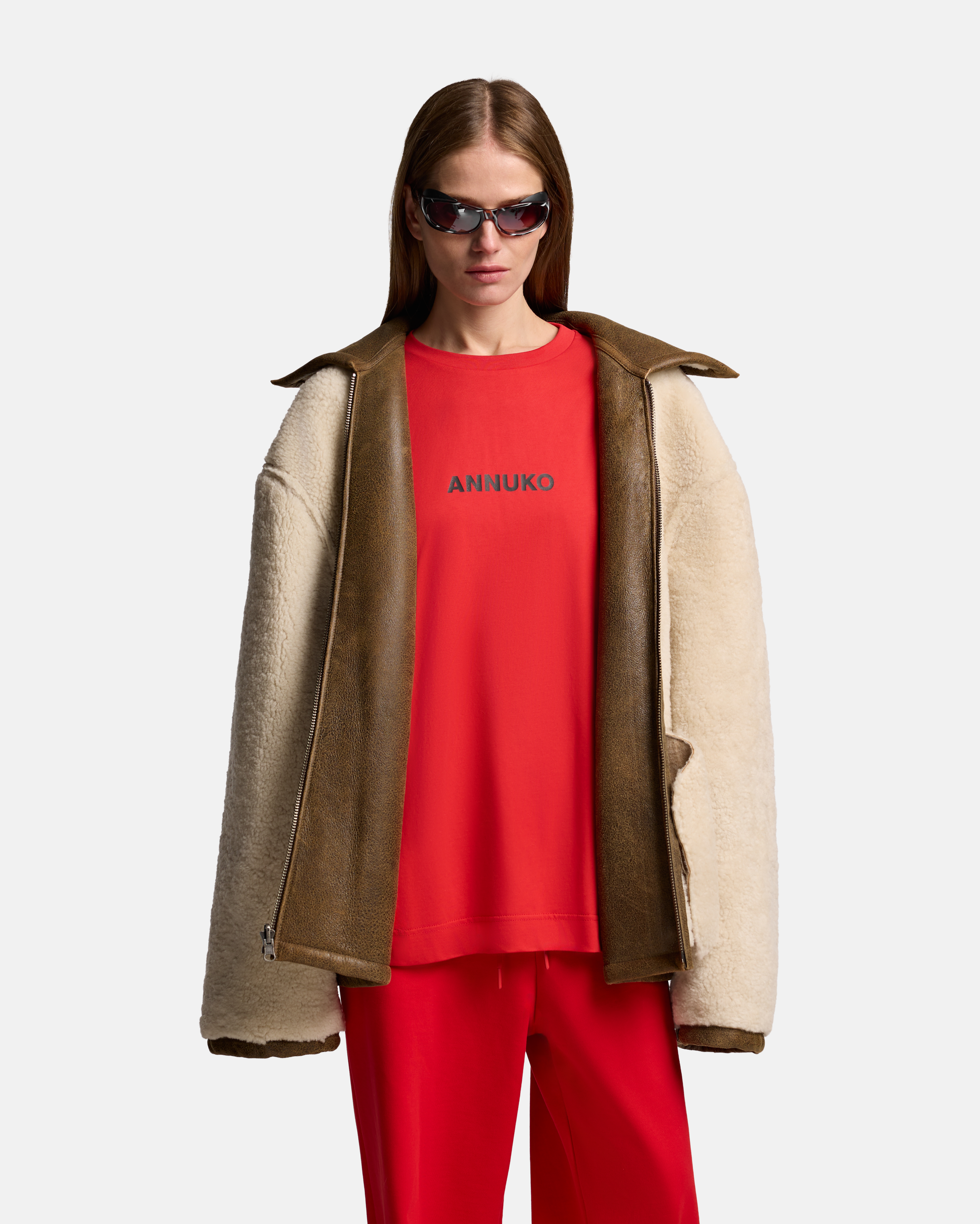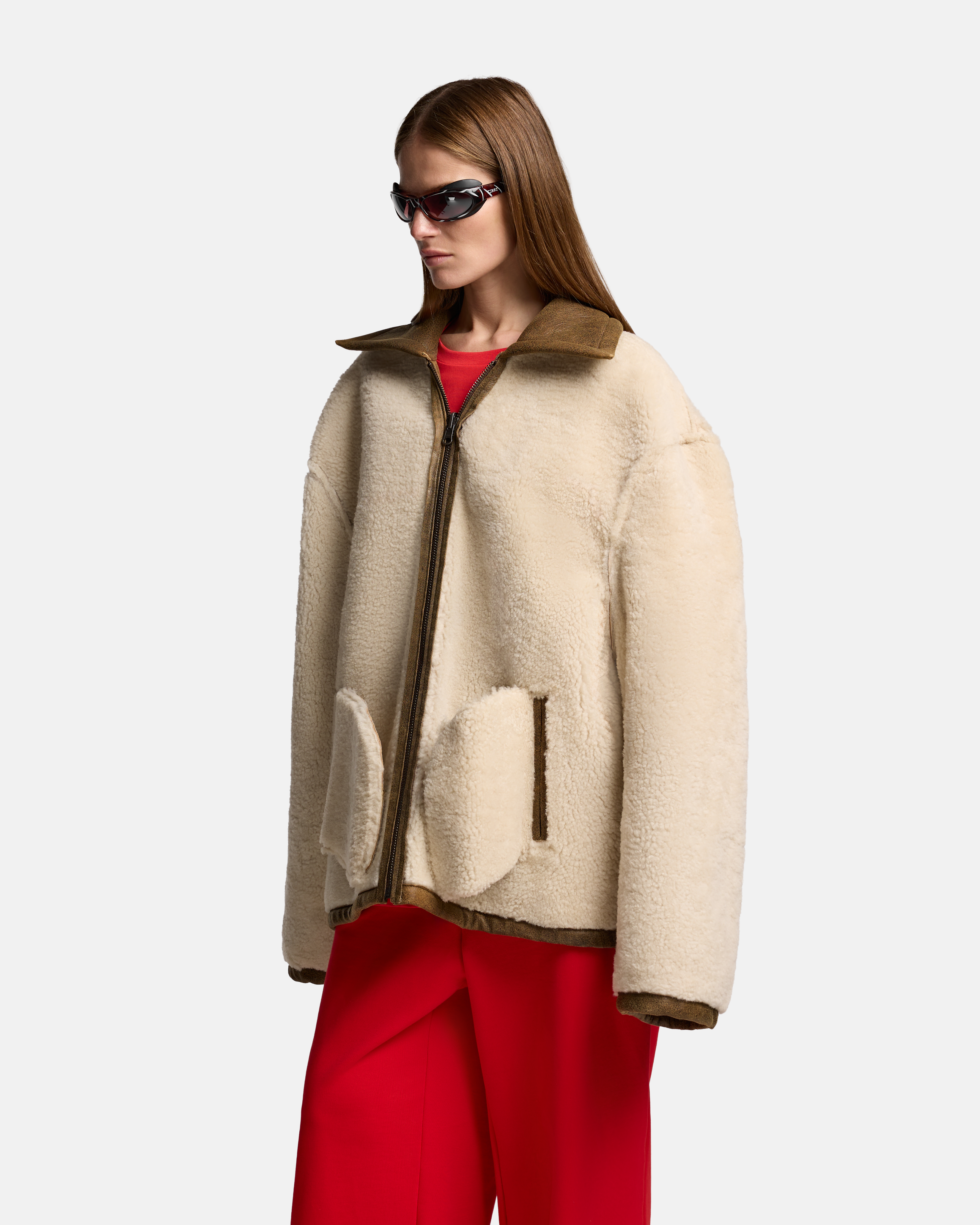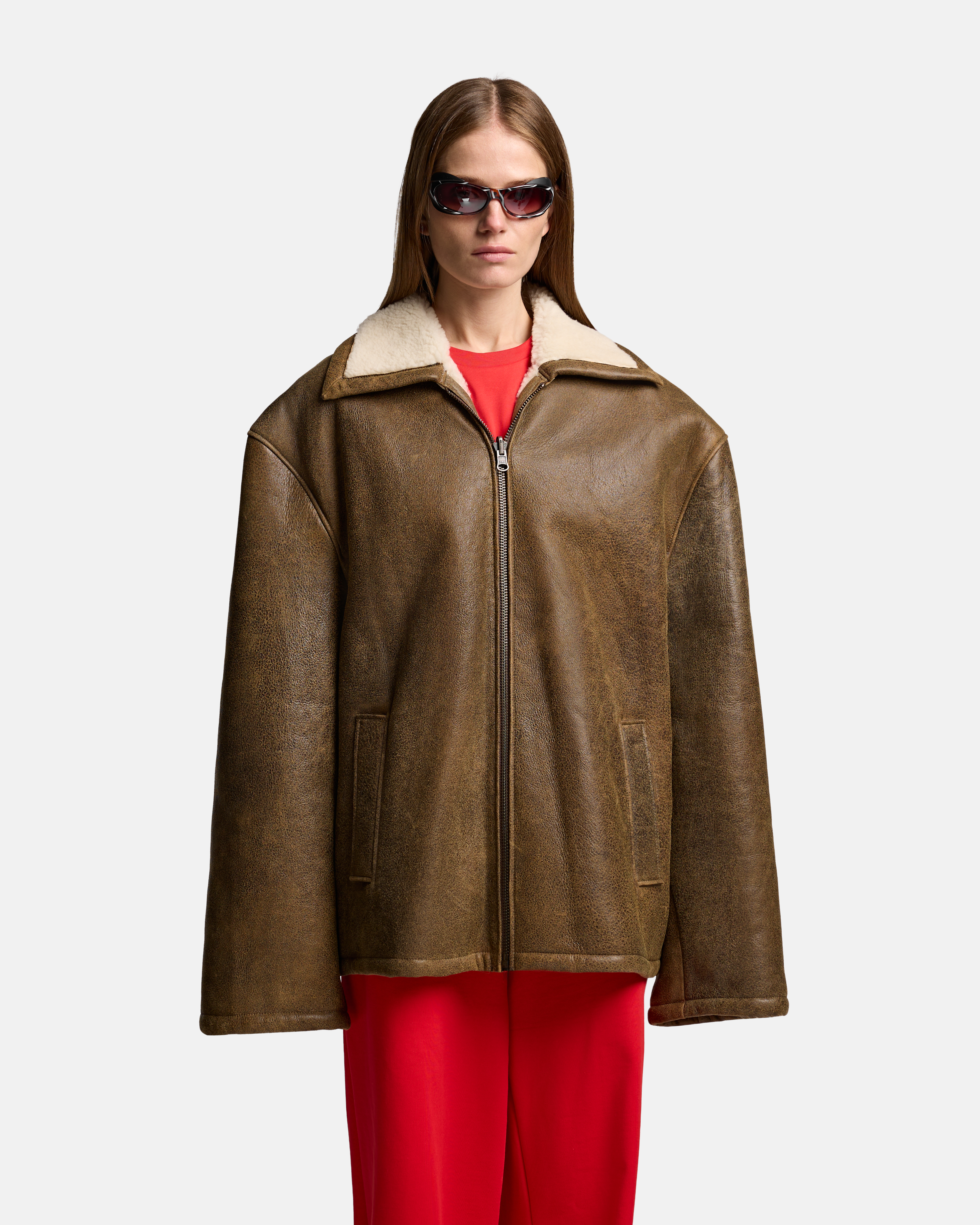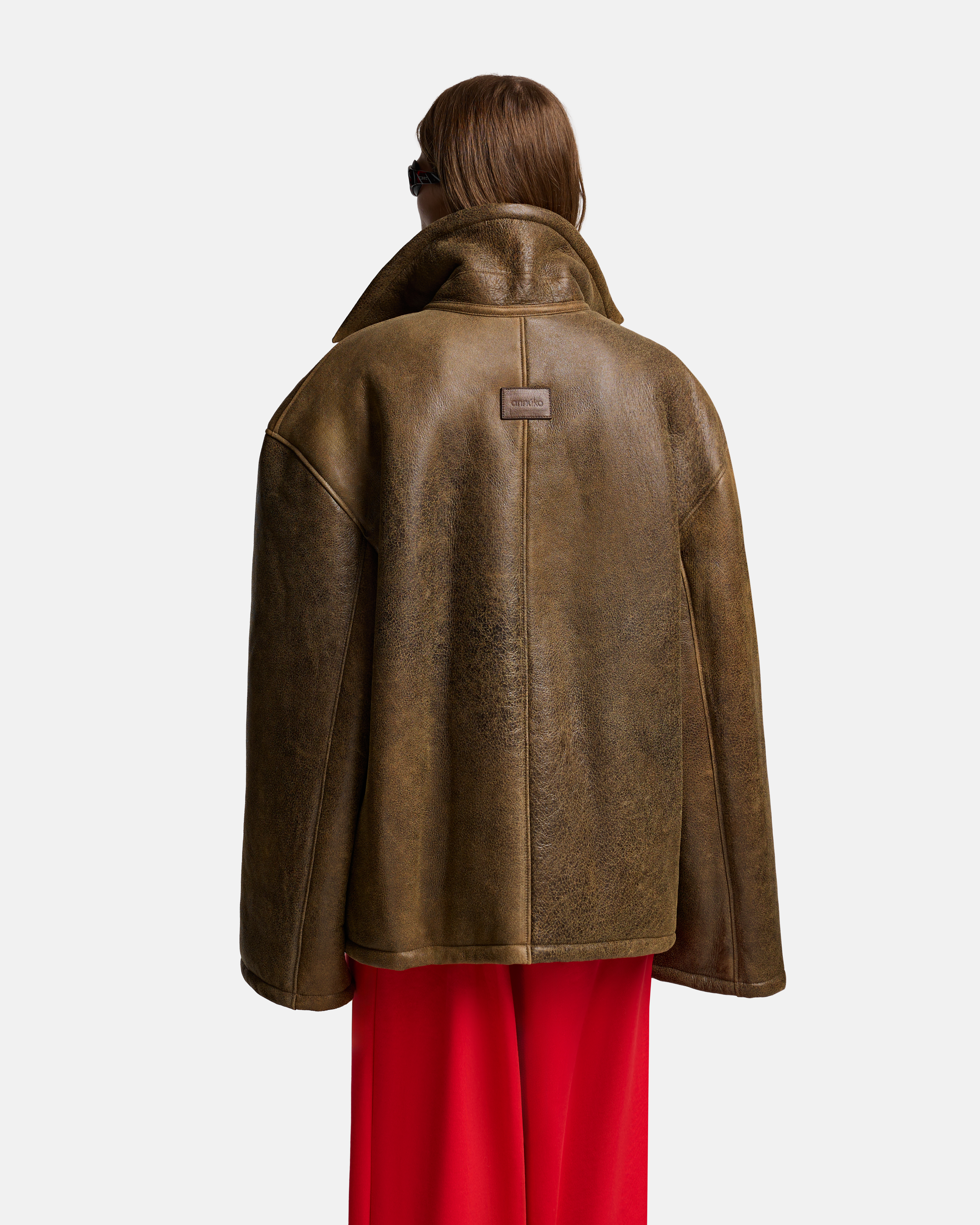Дублёнка из натуральной овчины строгого прямого силуэта с акцентированным воротником. Модель застёгивается на молнию и дополнена двумя карманами. Конструкция двухсторонняя: гладкая кожа подчёркивает чистоту линий и собранность образа, тогда как вывернутый наружу ворс придаёт объём и тактильную выразительность. Поверхность кожи обработана так, чтобы сохранить лёгкий винтажный эффект — он создаёт ощущение вещи с историей и усиливает её характер.