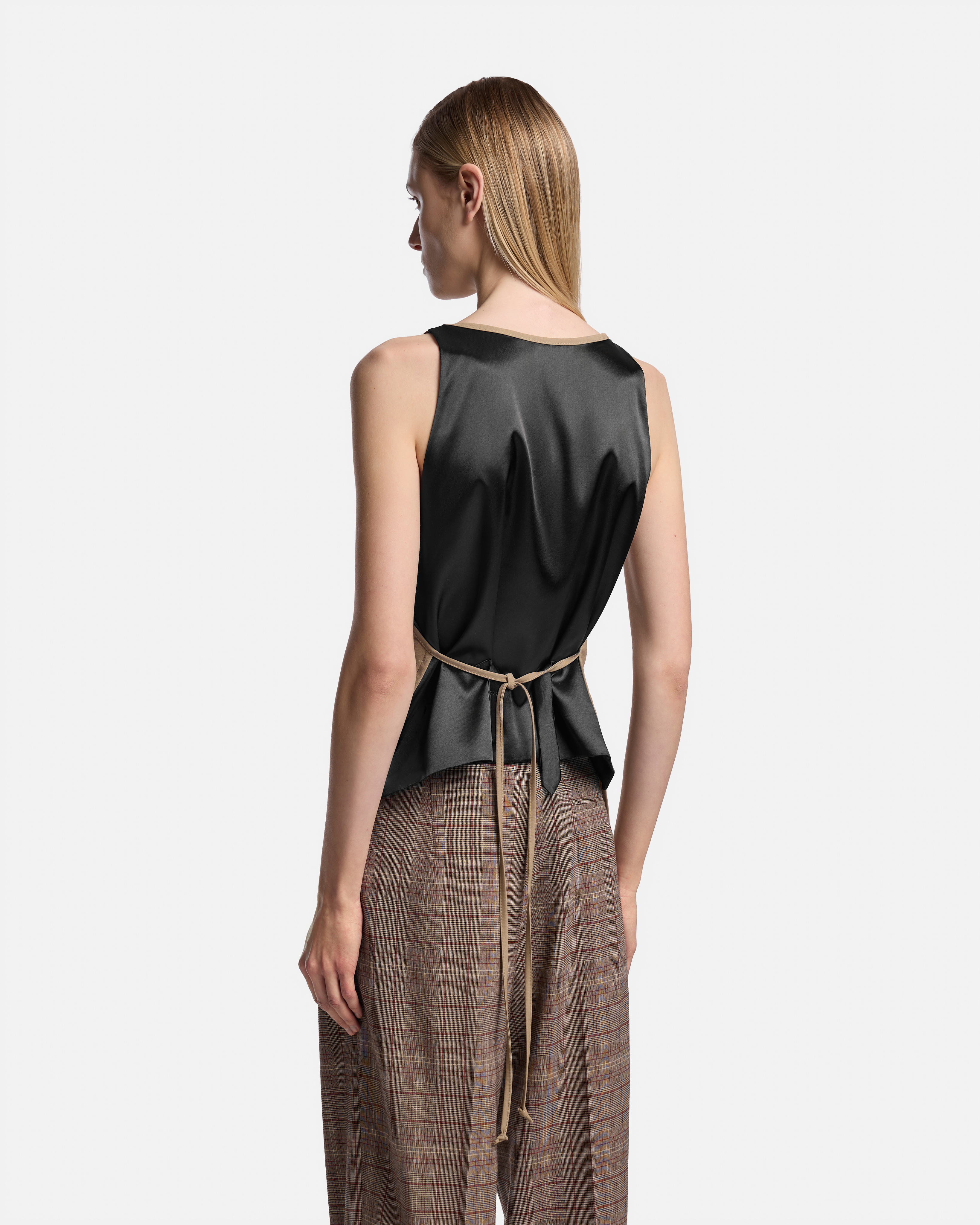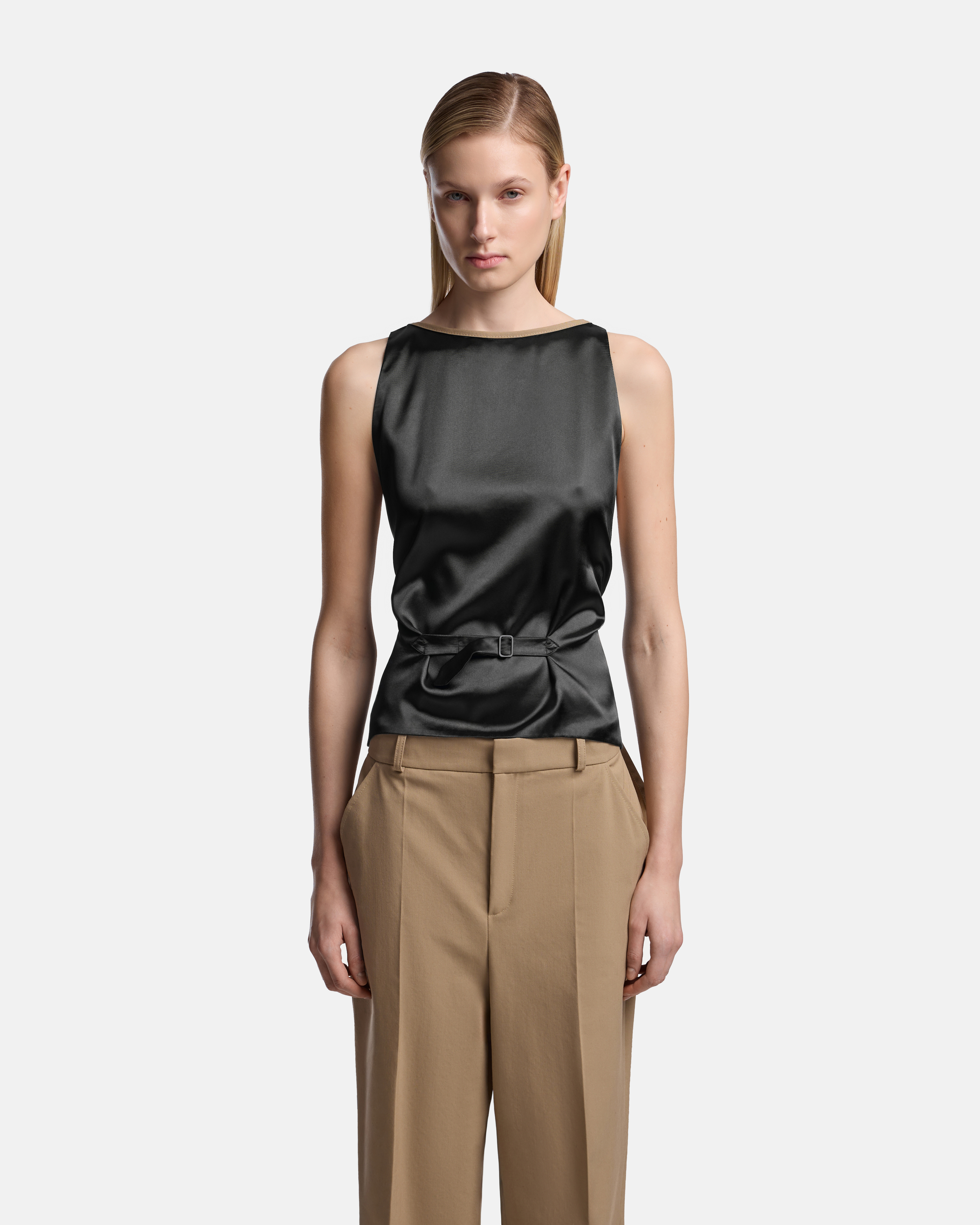 Модель фиксируется при помощи тонкого пояса, который формирует объём и задаёт силуэт. Задняя часть изделия изготовлена из атласа, что создаёт контраст фактур и меняет восприятие модели при развороте. Топ можно носить как самостоятельный элемент или использовать в многослойных сочетаниях.