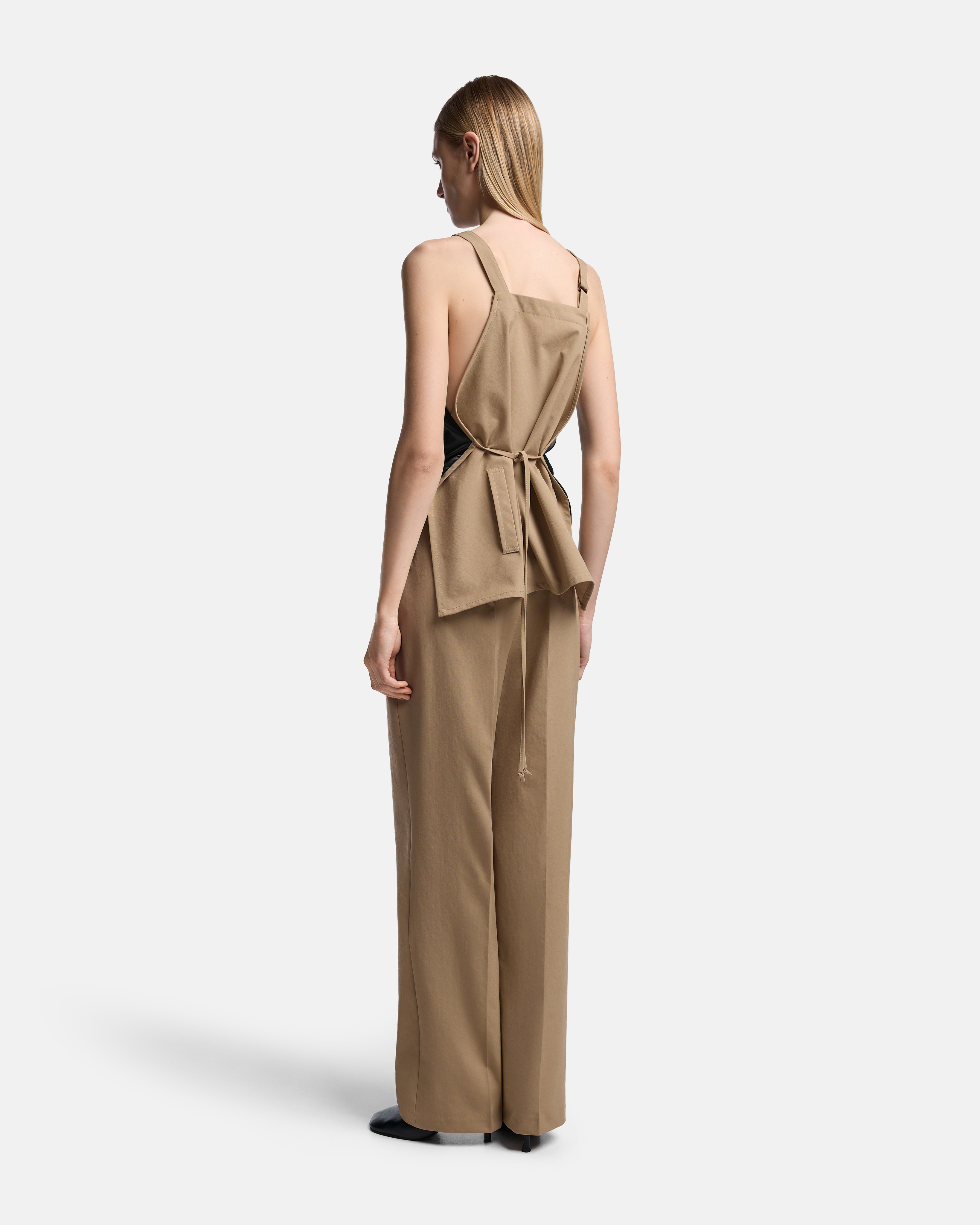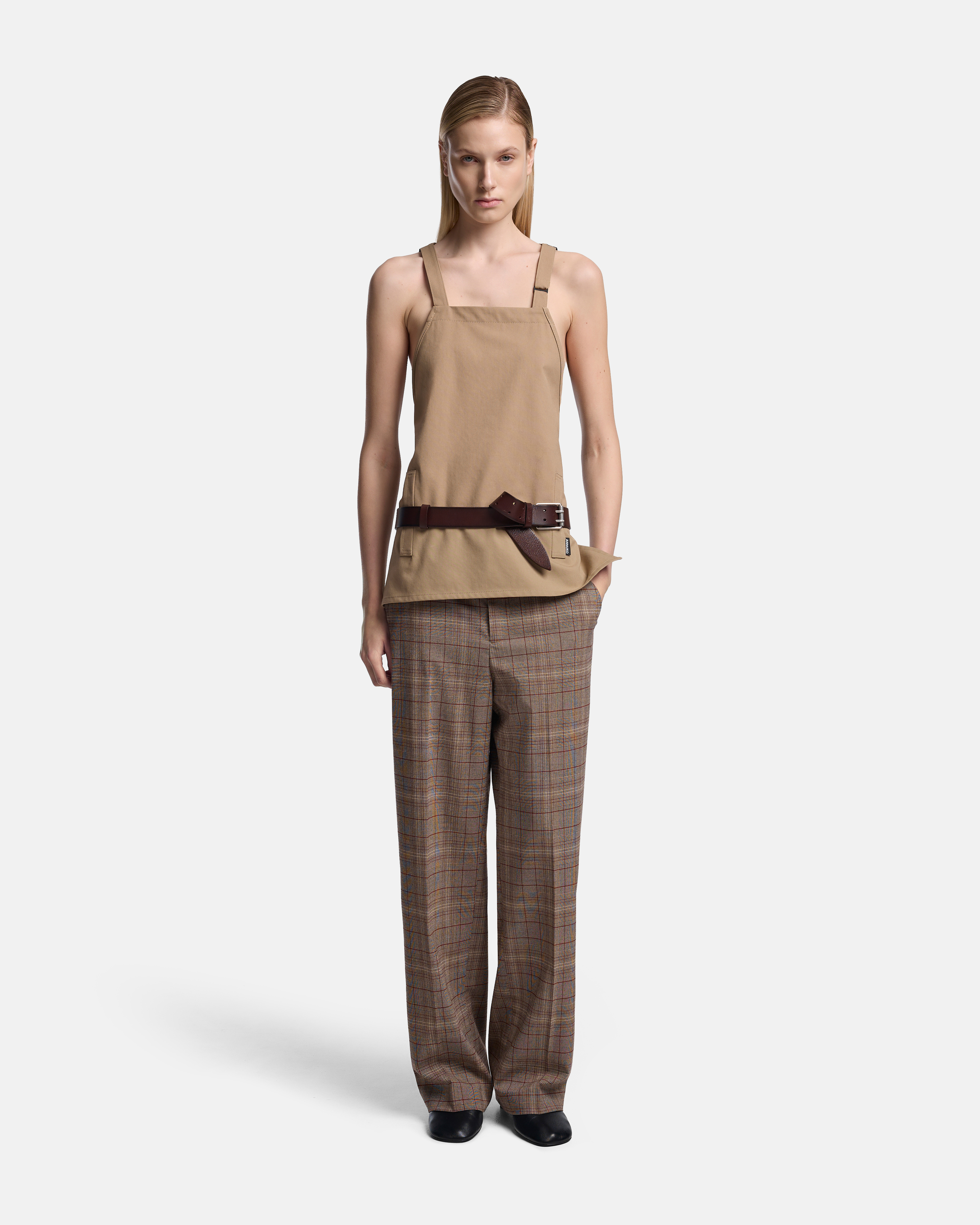 Двухсторонний топ-фартук из костюмной ткани с возможностью носки на обе стороны. Конструкция позволяет менять характер изделия за счёт разворота и выбора посадки.
