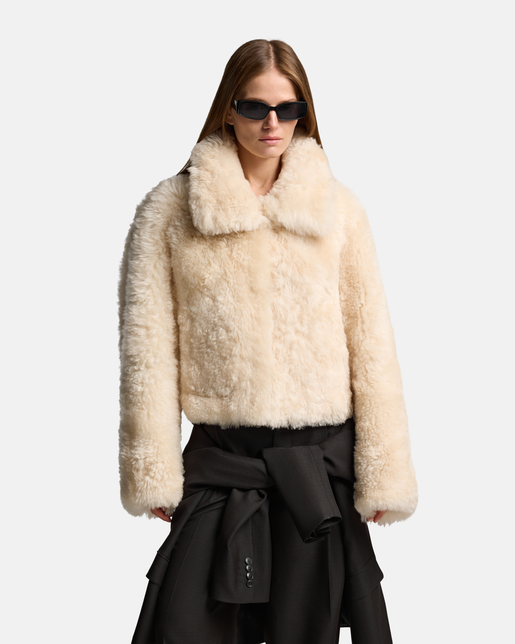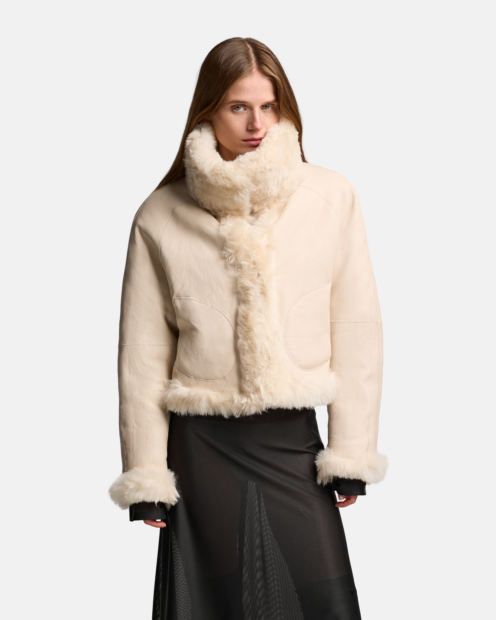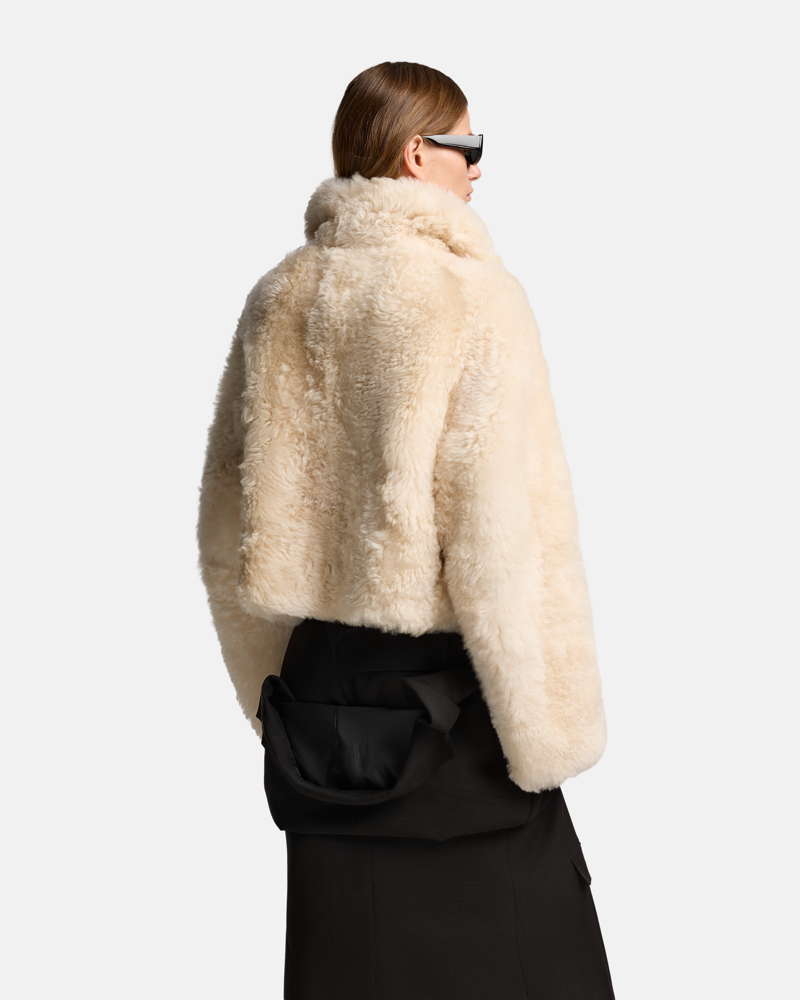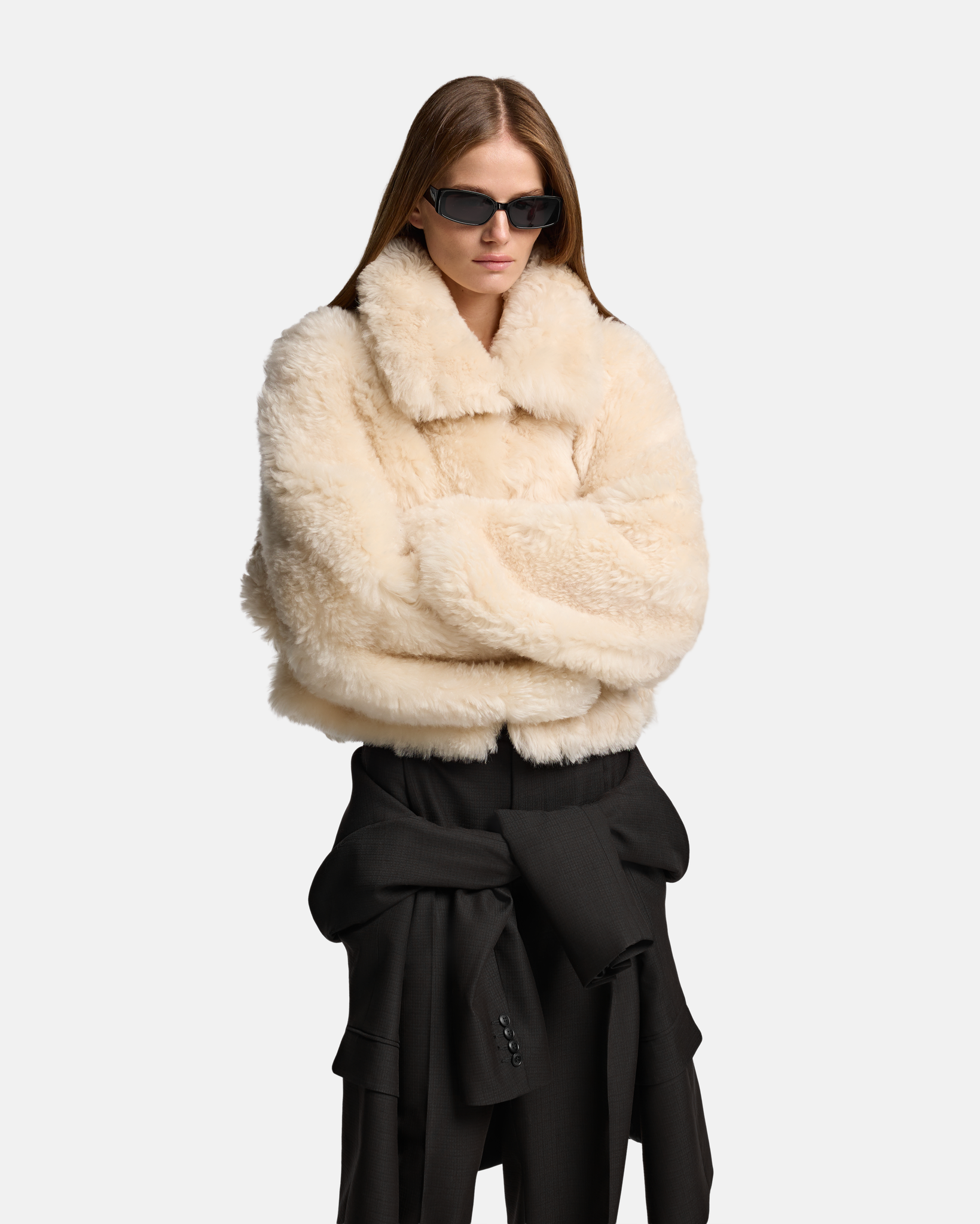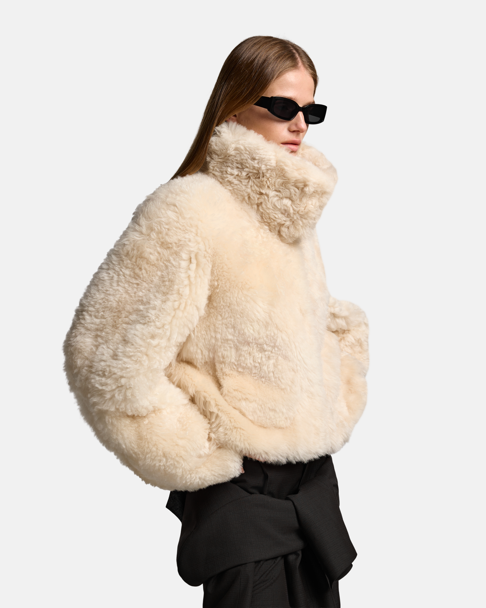 Шуба из натуральной овчины прямого силуэта с крупным отложным воротником. Двухсторонняя конструкция позволяет носить изделие по-разному: с мягким ворсом наружу или с гладкой кожей, которая подчёркивает графичность формы. Застёгивается на шубные крючки, что сохраняет поверхность изделия чистой и лаконичной. Имеет два кармана.