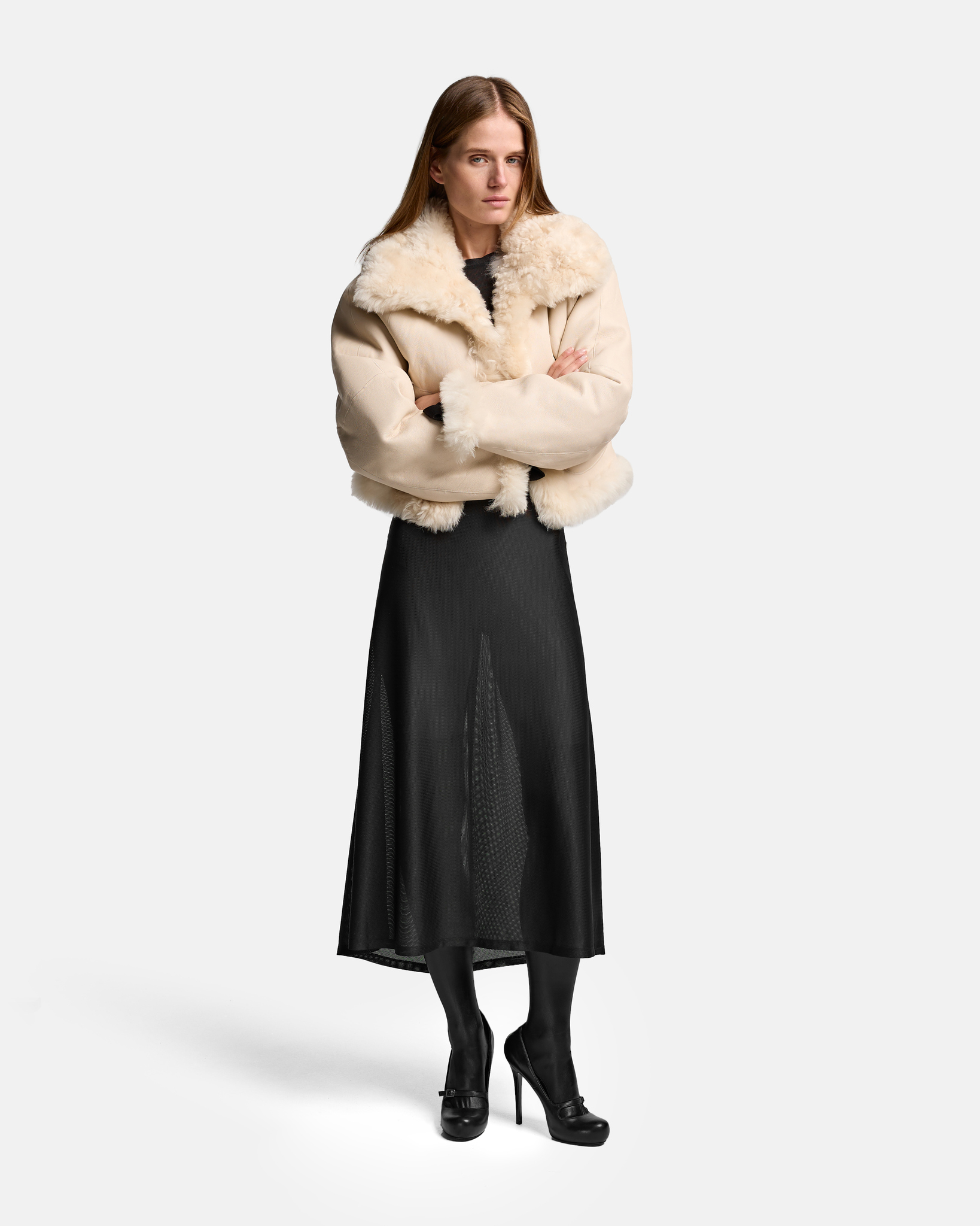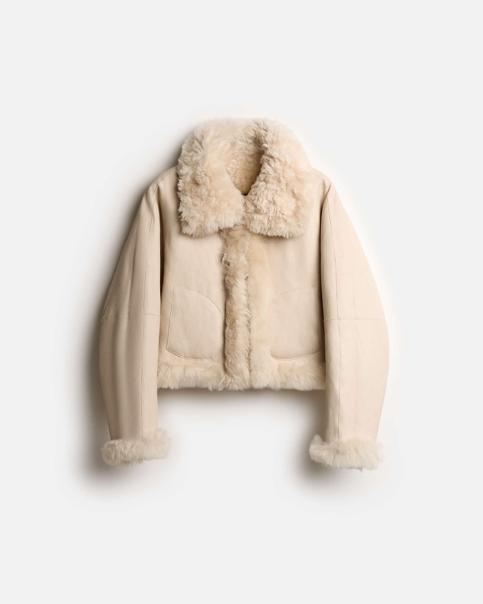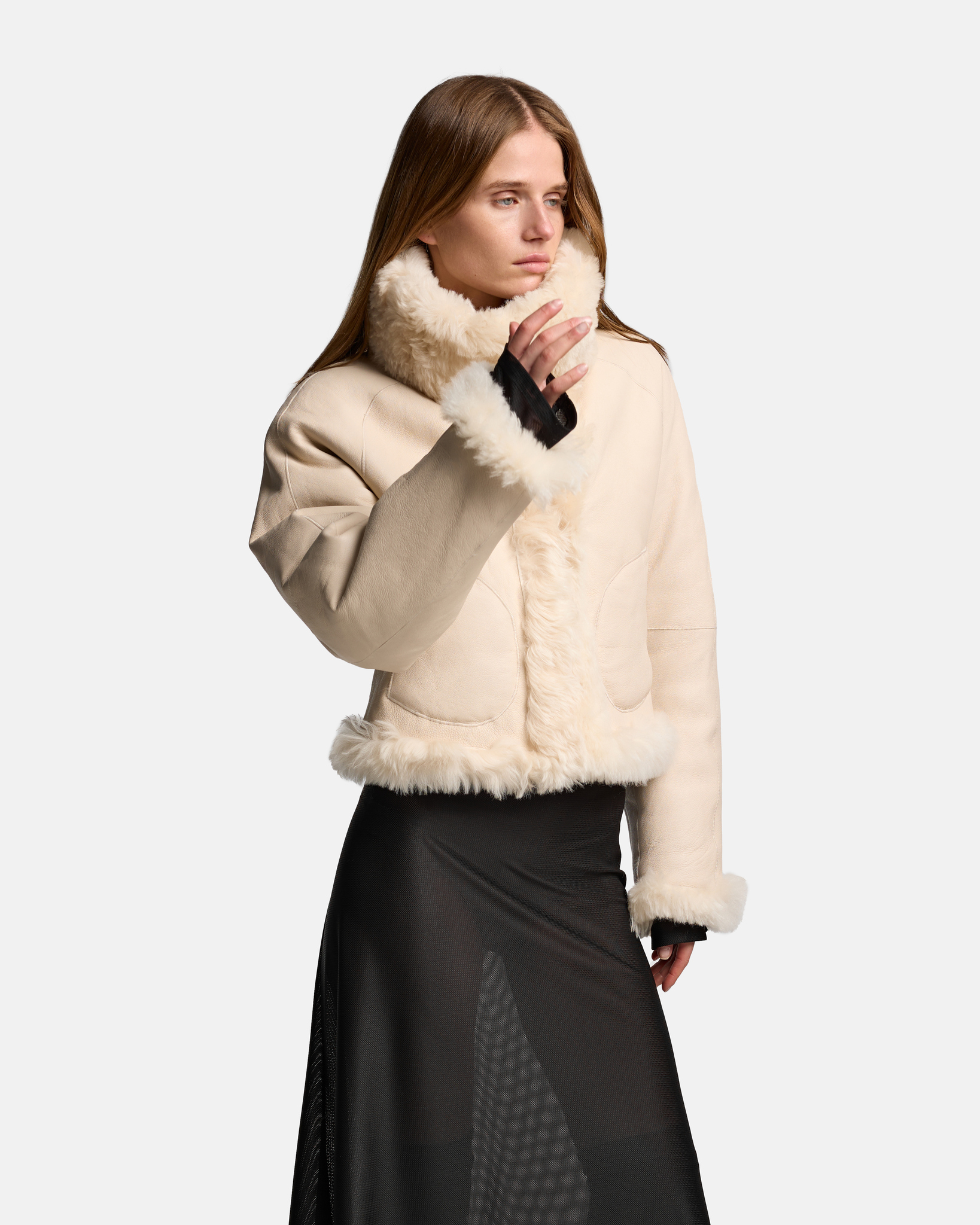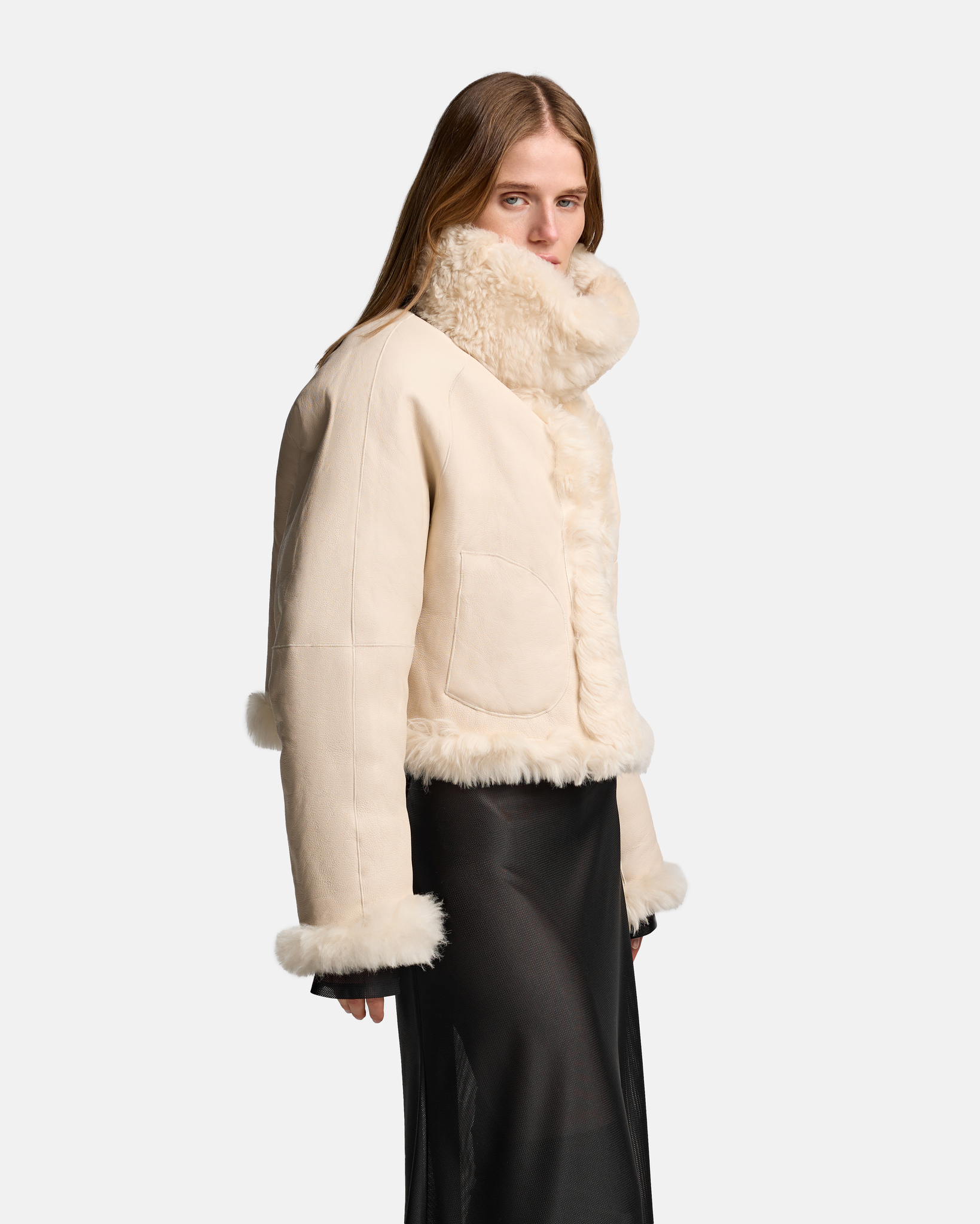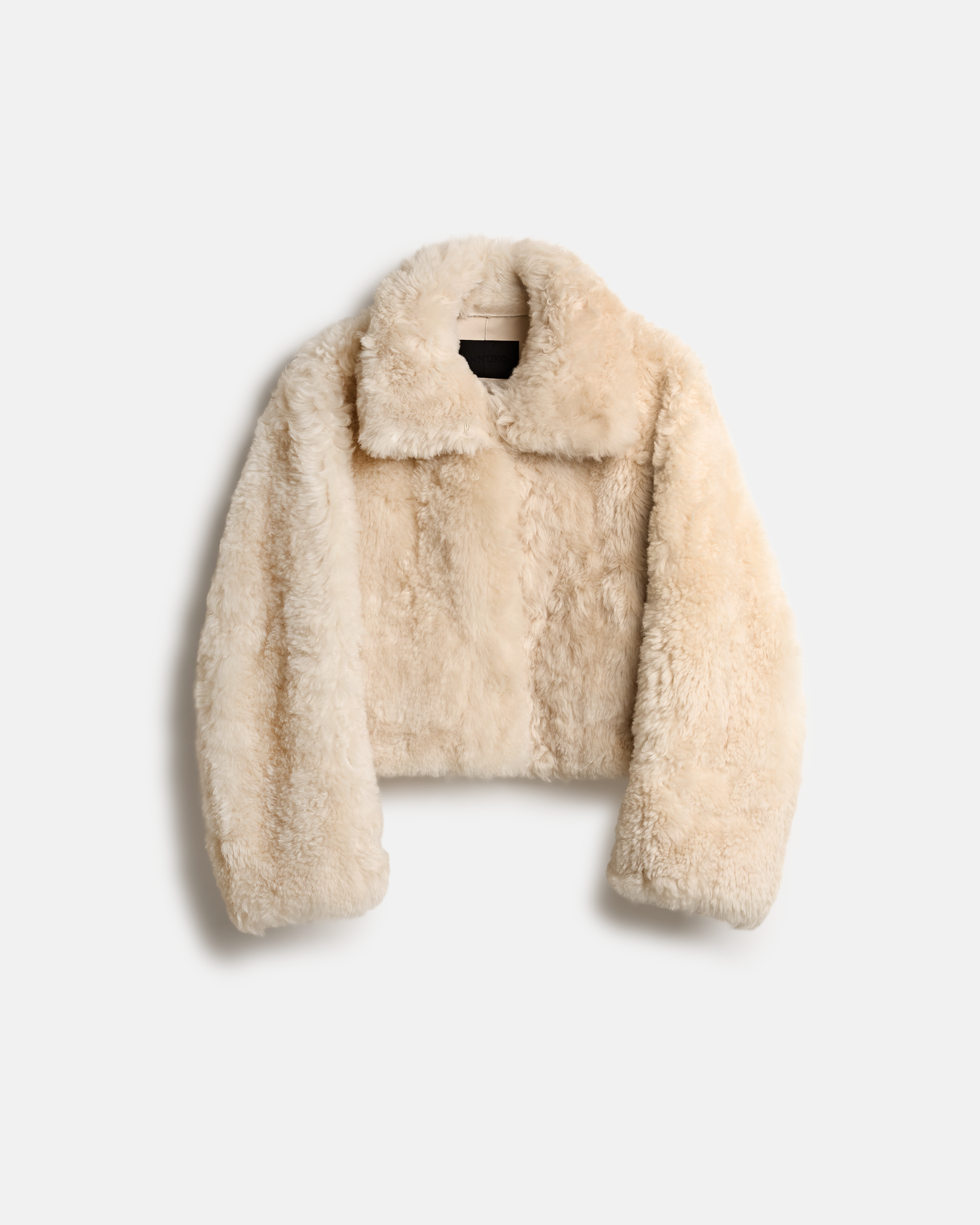 Шуба из натуральной овчины прямого силуэта с крупным отложным воротником. Двухсторонняя конструкция позволяет носить изделие по-разному: с мягким ворсом наружу или с гладкой кожей, которая подчёркивает графичность формы. Застёгивается на шубные крючки, что сохраняет поверхность изделия чистой и лаконичной. Имеет два кармана.