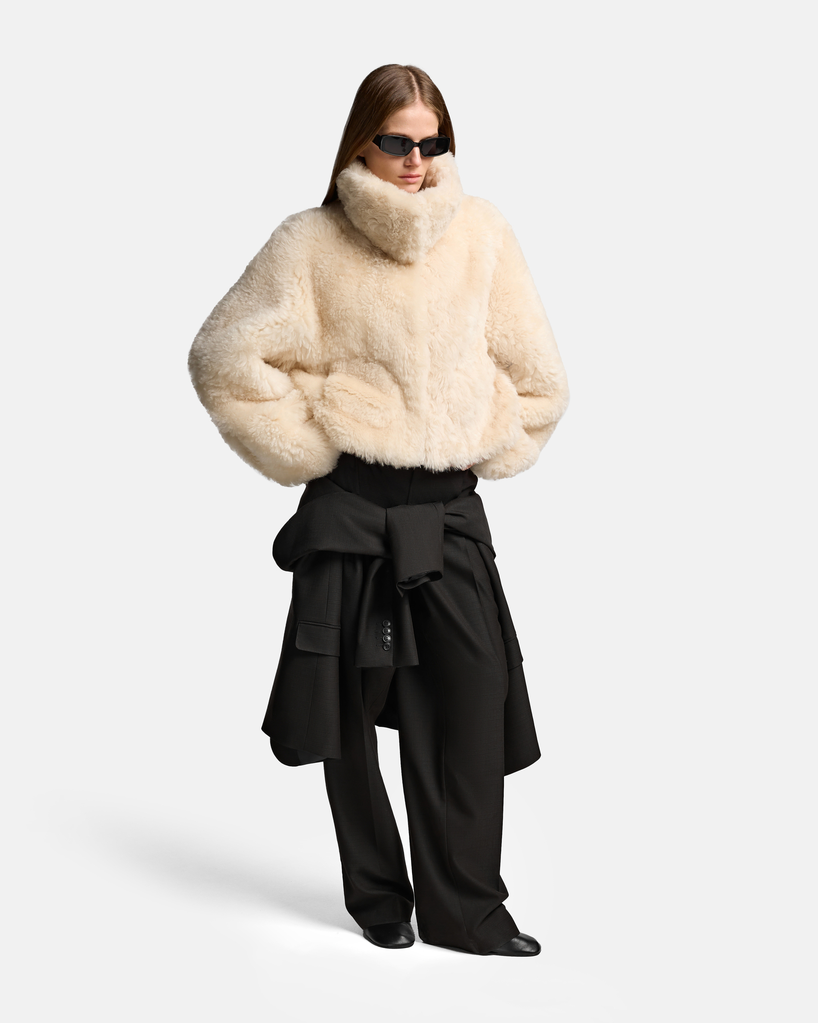 Форма рукава скроена особым образом — она сохраняет объём и свободу движения независимо от стороны носки. В этой шубе совмещены практичность и вариативность: одна вещь может выглядеть фактурно и объёмно или собранно и строго, позволяя менять характер образа в зависимости от ситуации.