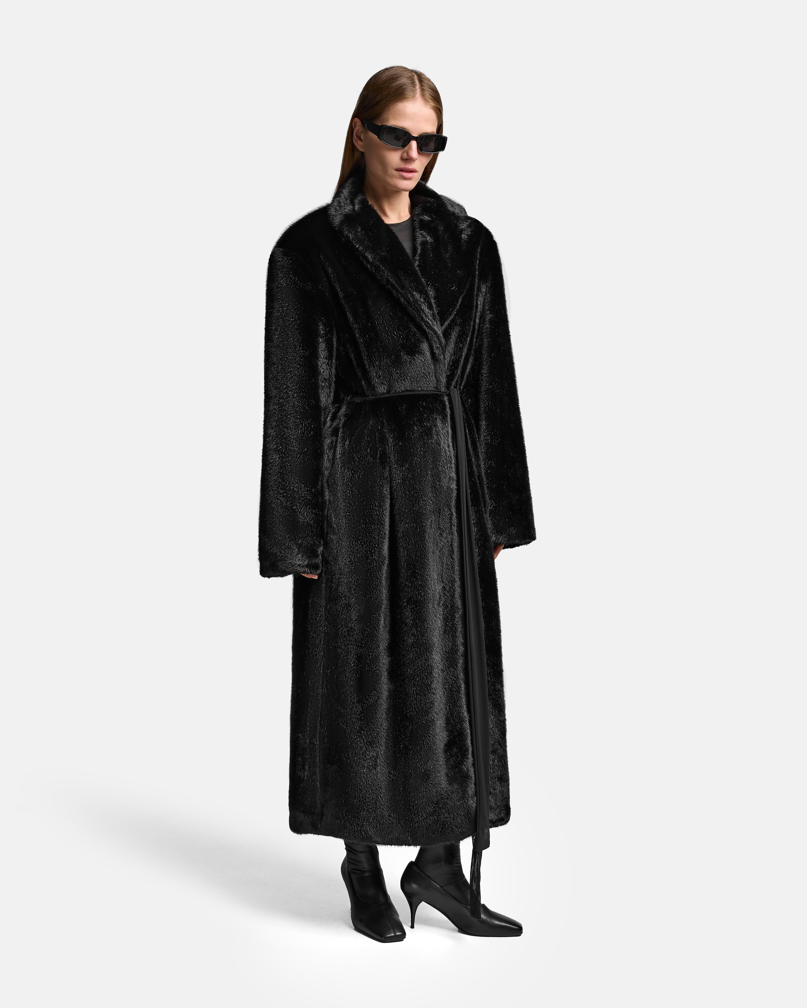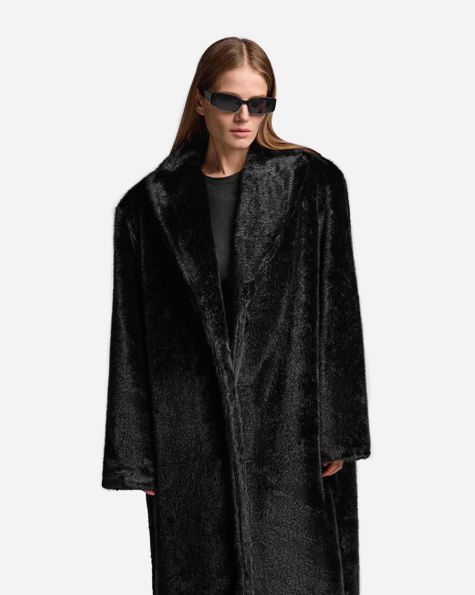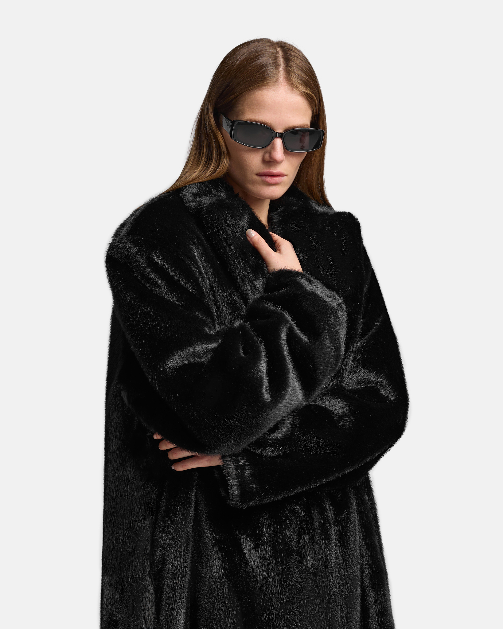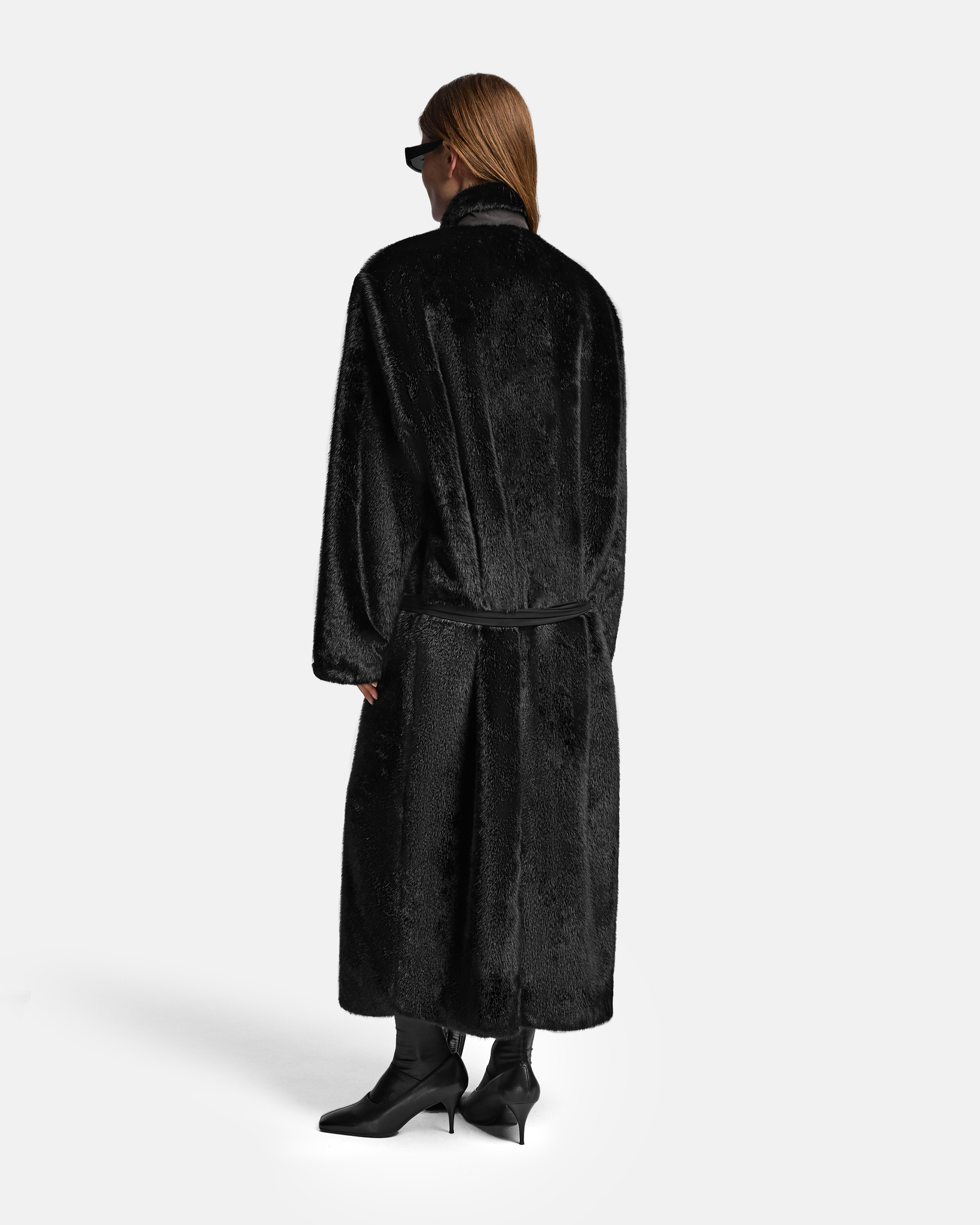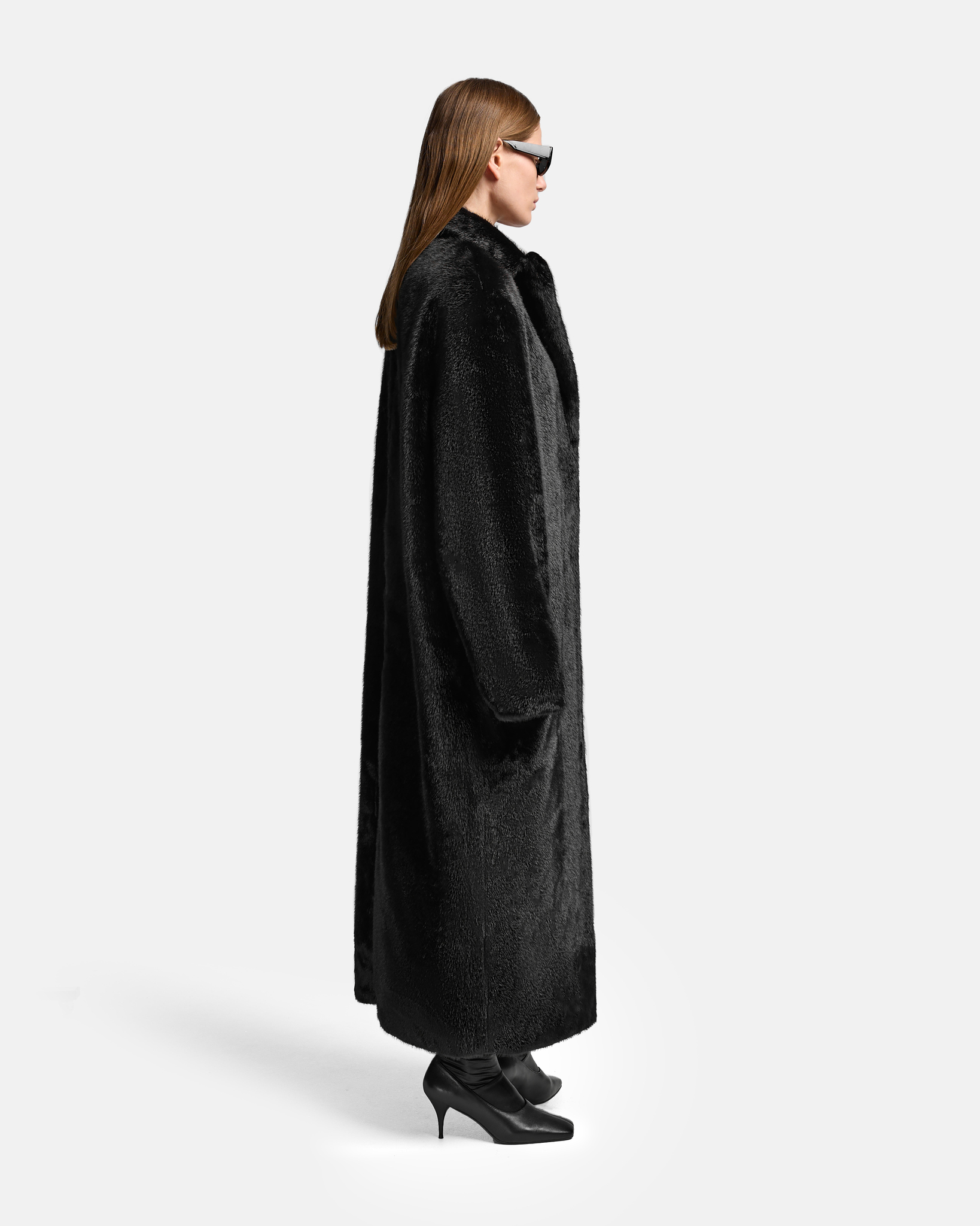 Шуба из эко-меха прямого силуэта, выполненная в двухсторонней конструкции. С одной стороны — густой ворс, с другой — гладкая поверхность, дающая ощущение строгости и собранности. Два кармана скрыты в боковых швах, застёжка — на шубные крючки, чтобы не перегружать плоскость изделия.