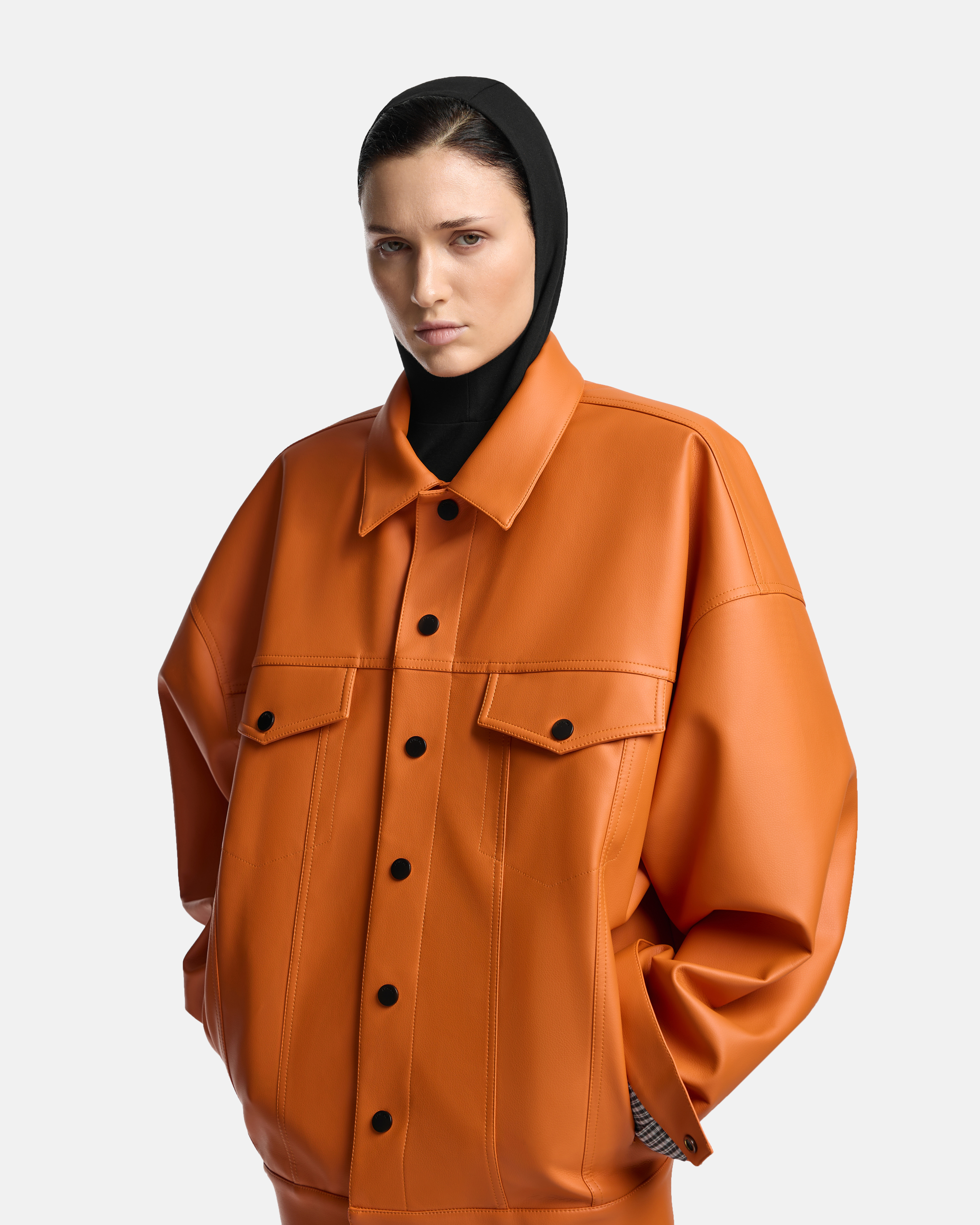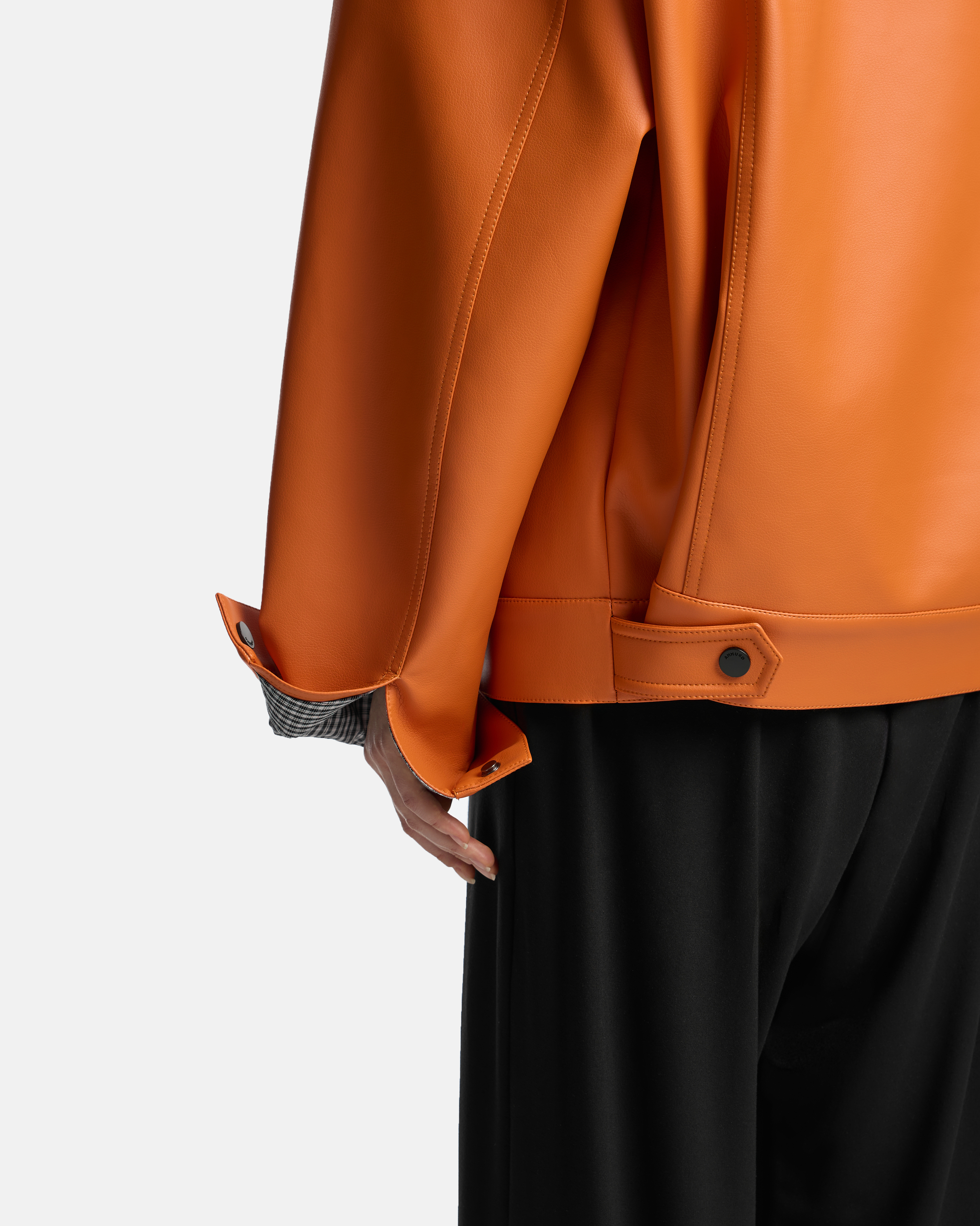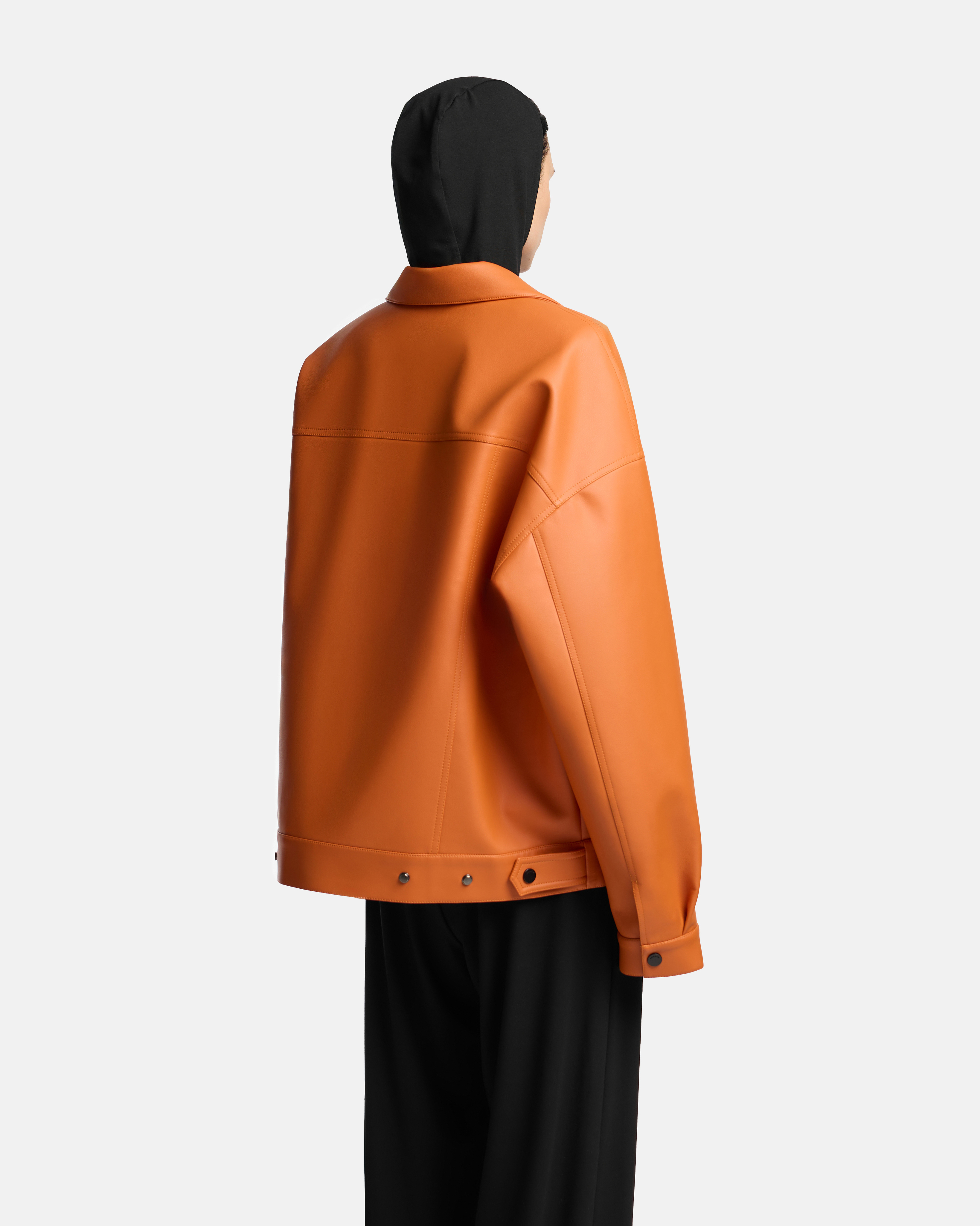 В коллекции бренда есть модели, форма которых читается с первого взгляда. Эта джинсовка из экокожи — как раз из таких: мягко округлённые линии создают выразительный объём по бокам. Посадку можно адаптировать под настроение с помощью задних пат с кнопками, которые подчёркивают О-образный силуэт.