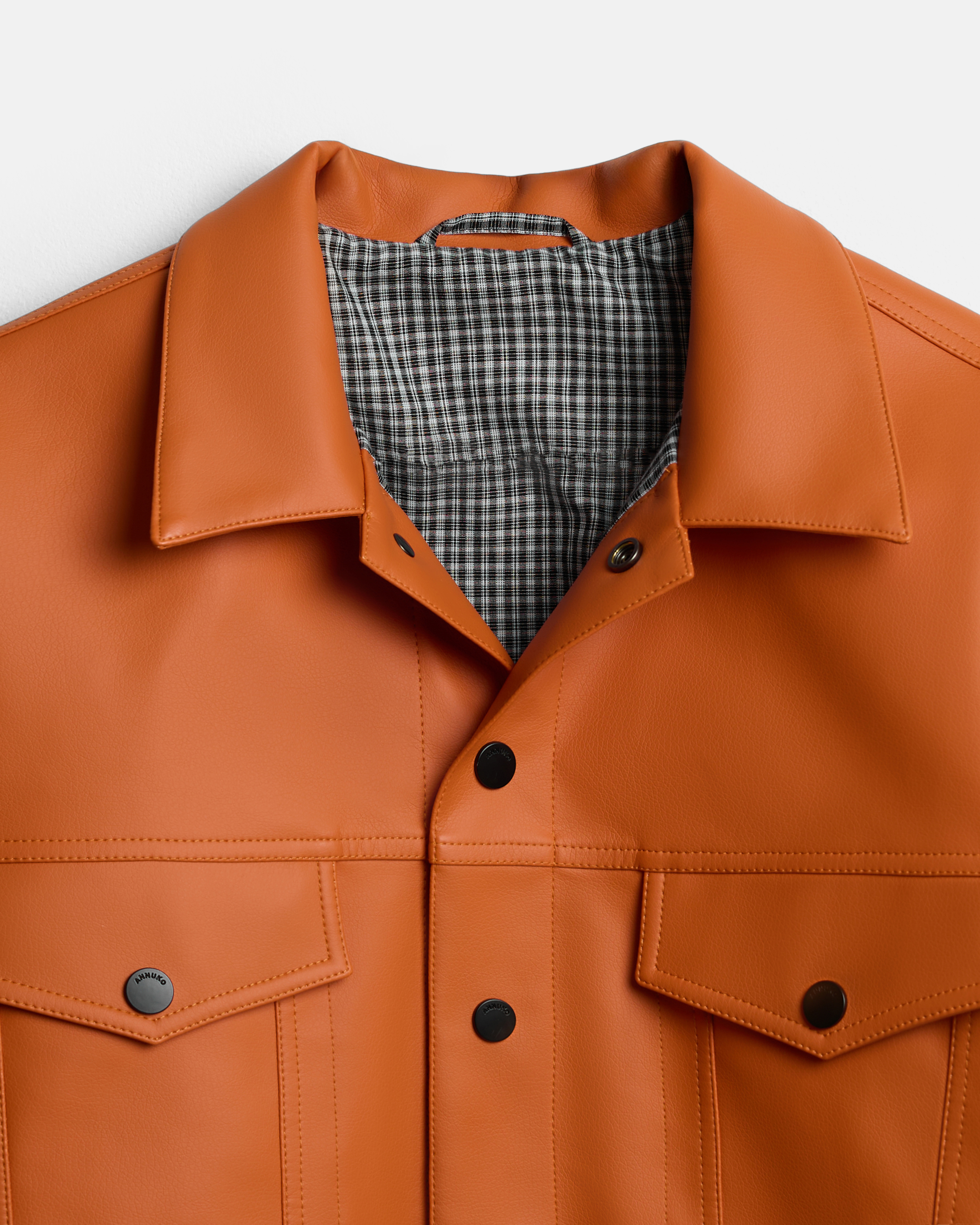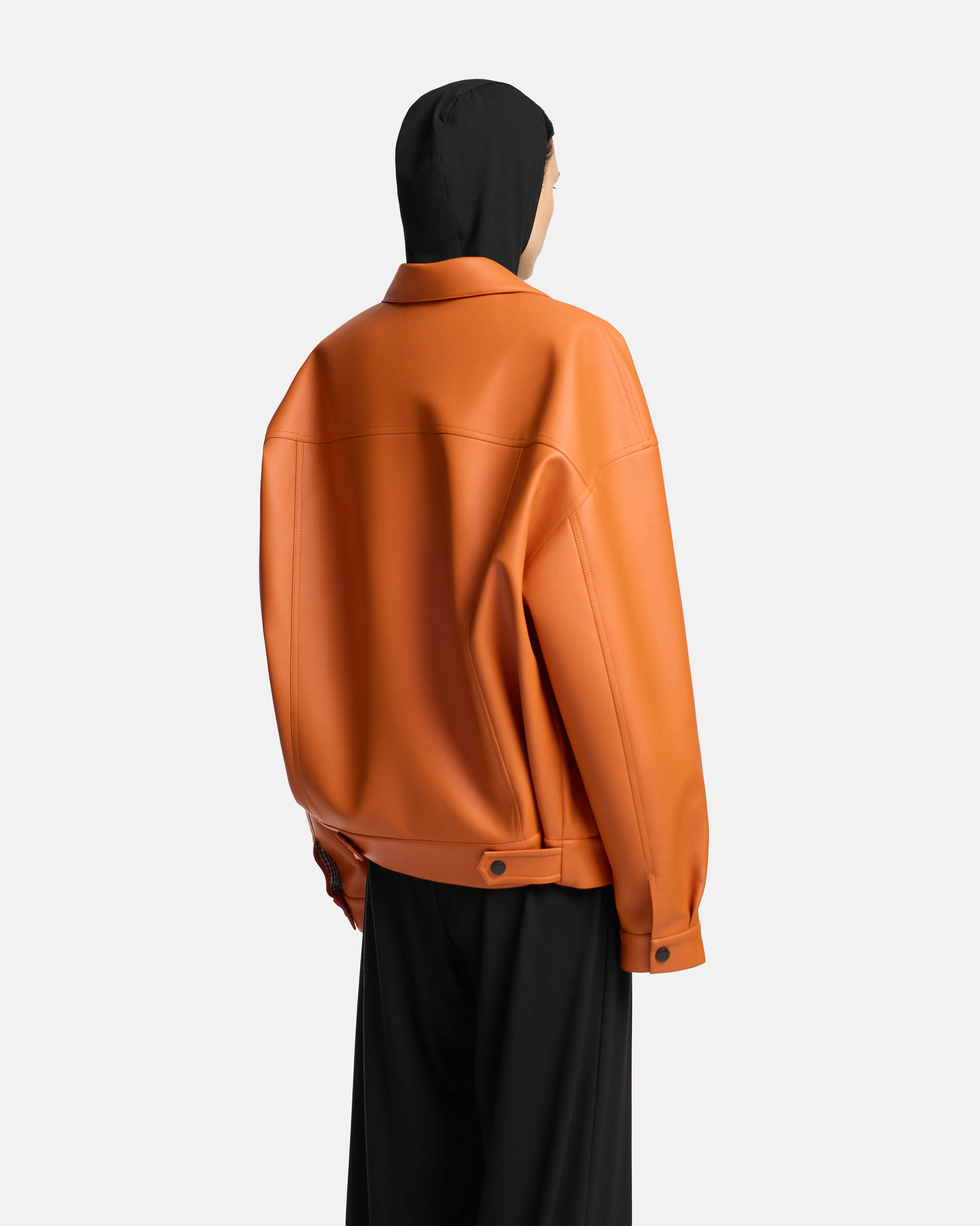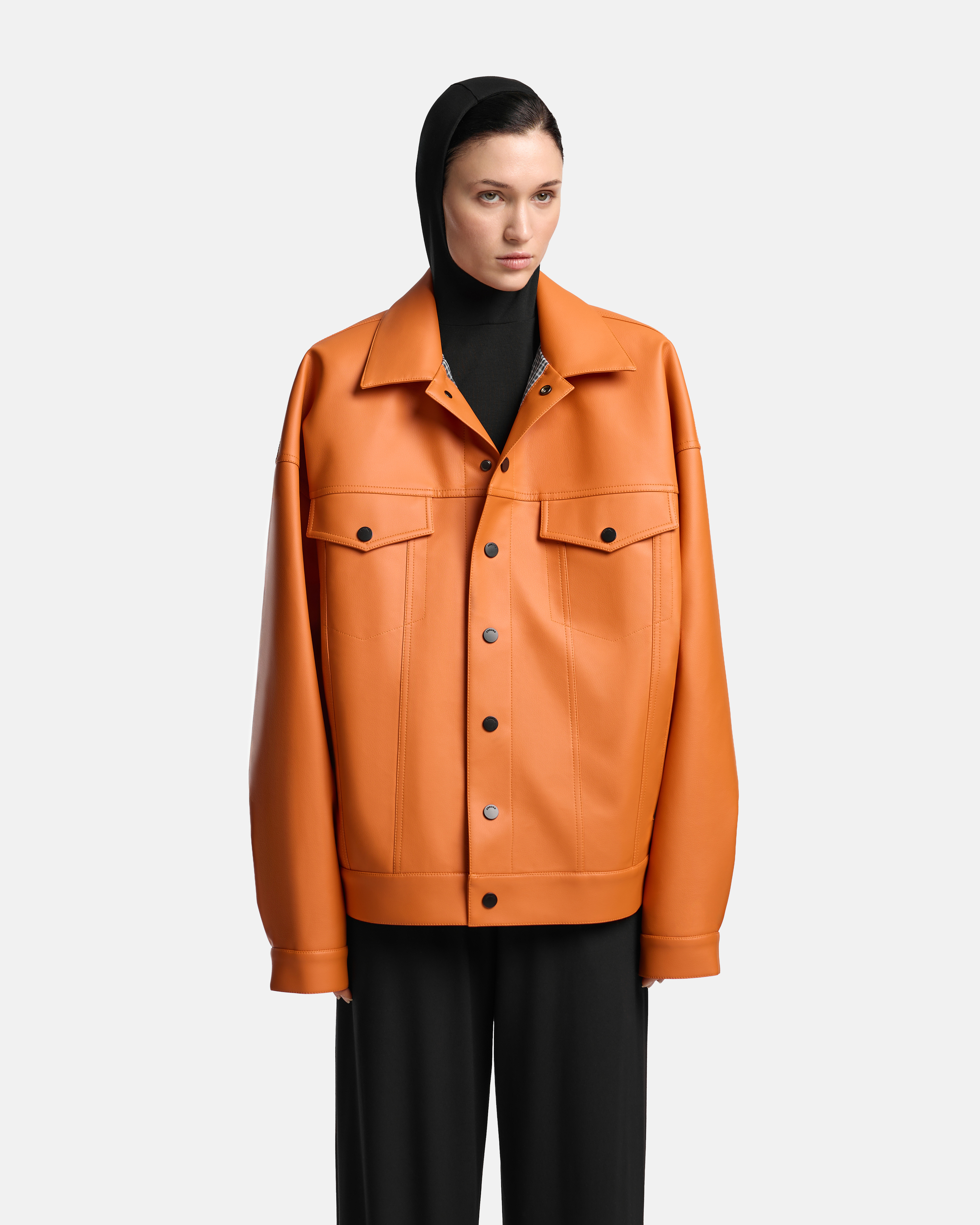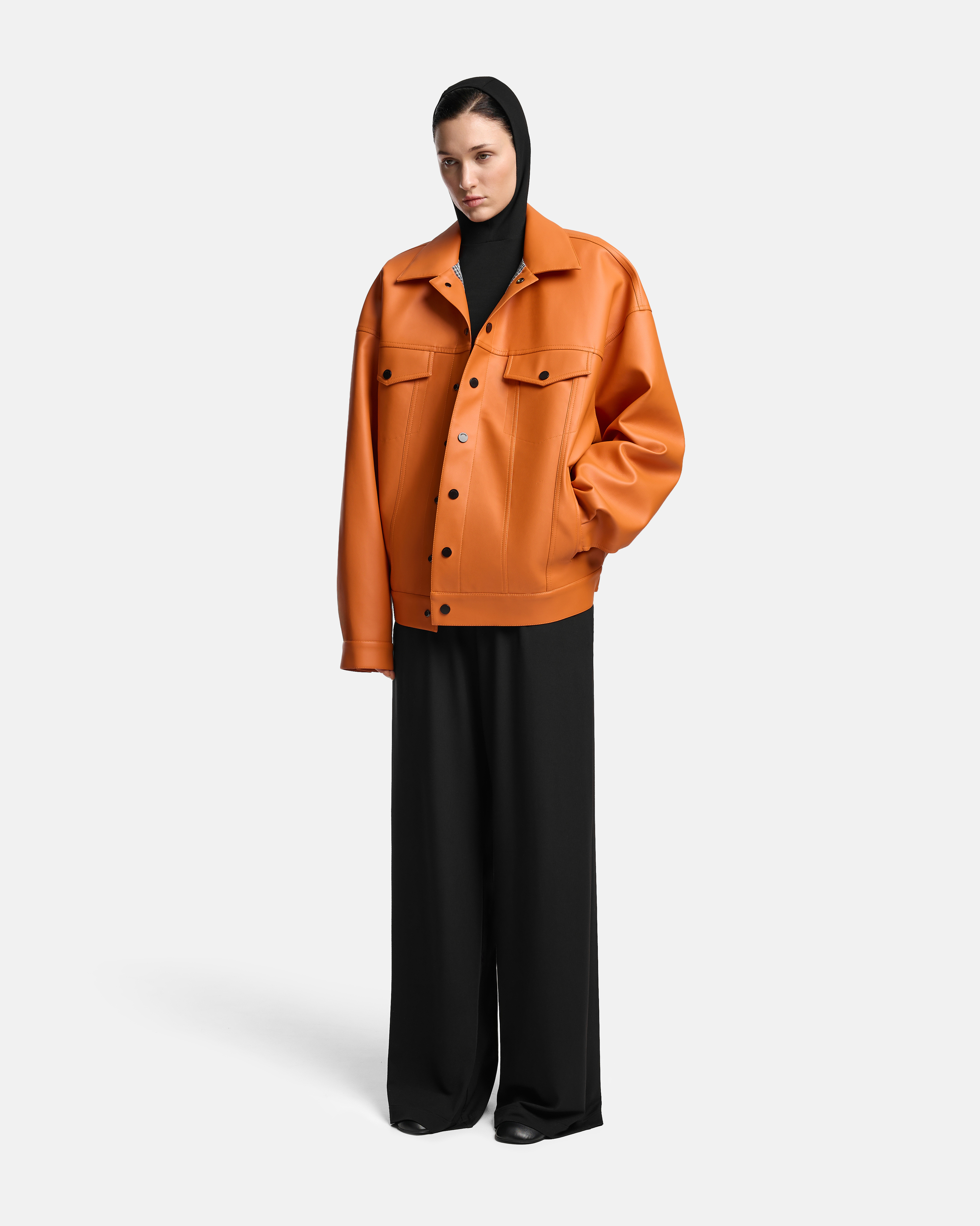 В коллекции бренда есть модели, форма которых читается с первого взгляда. Эта джинсовка из экокожи — как раз из таких: мягко округлённые линии создают выразительный объём по бокам. Посадку можно адаптировать под настроение с помощью задних пат с кнопками, которые подчёркивают О-образный силуэт.
