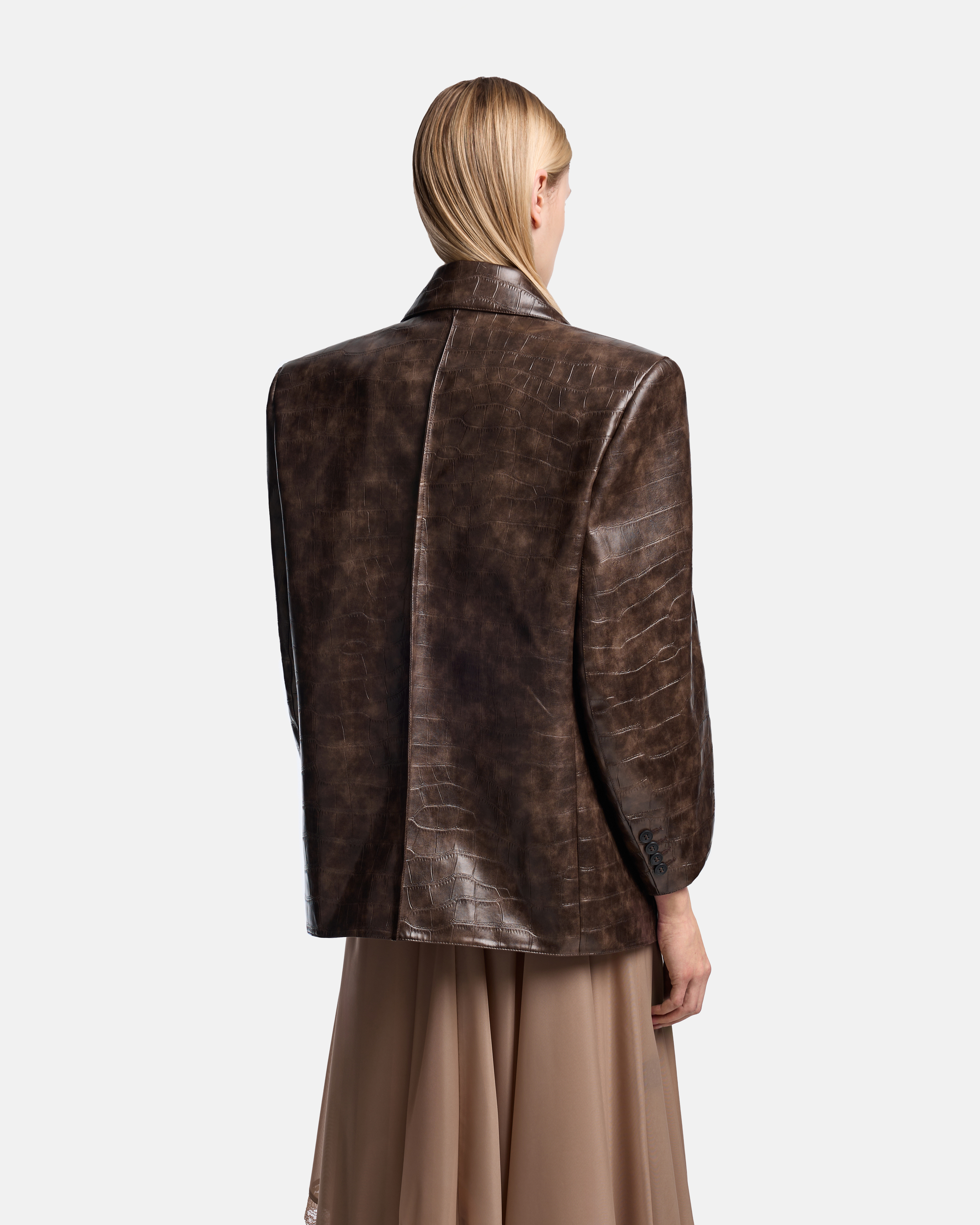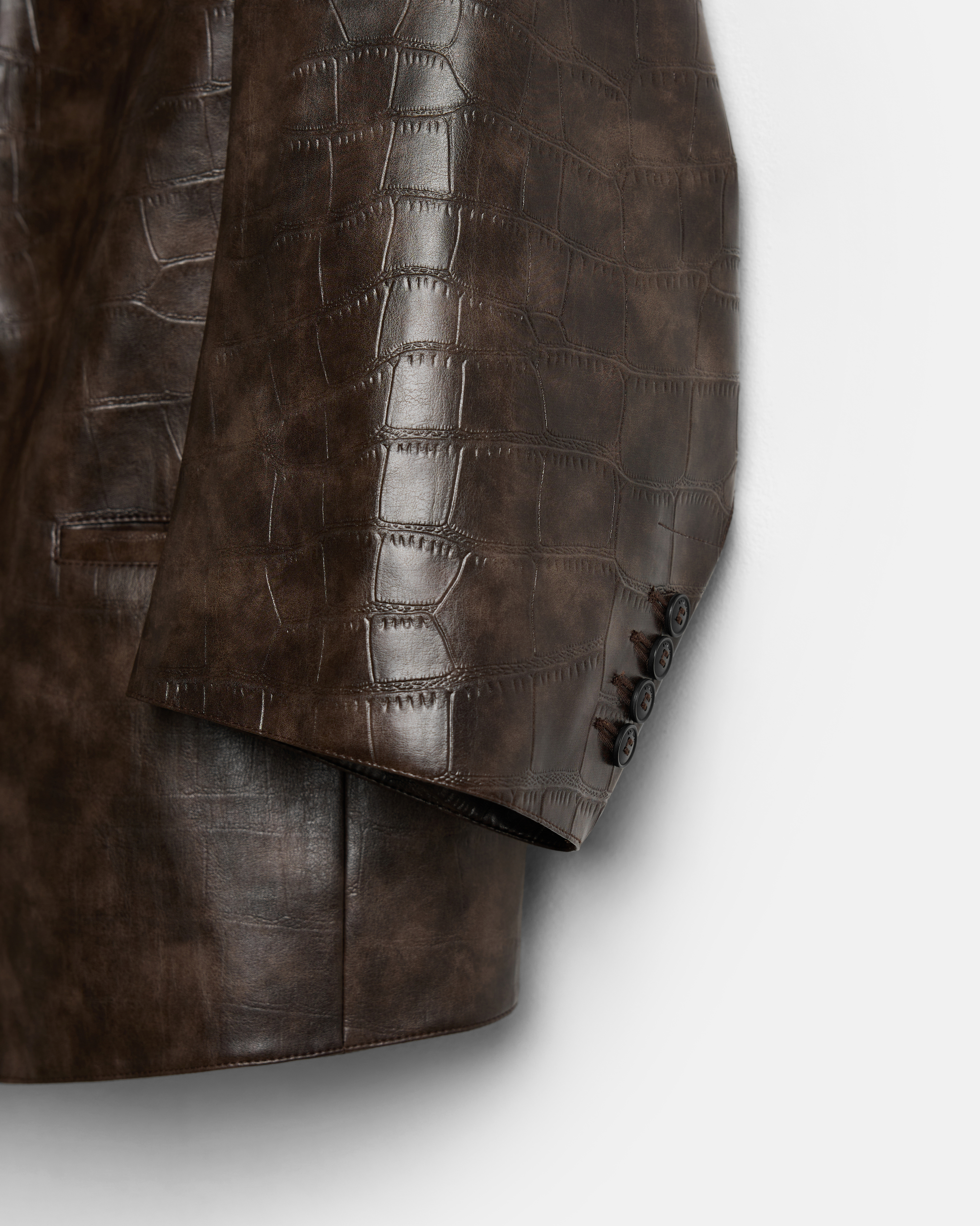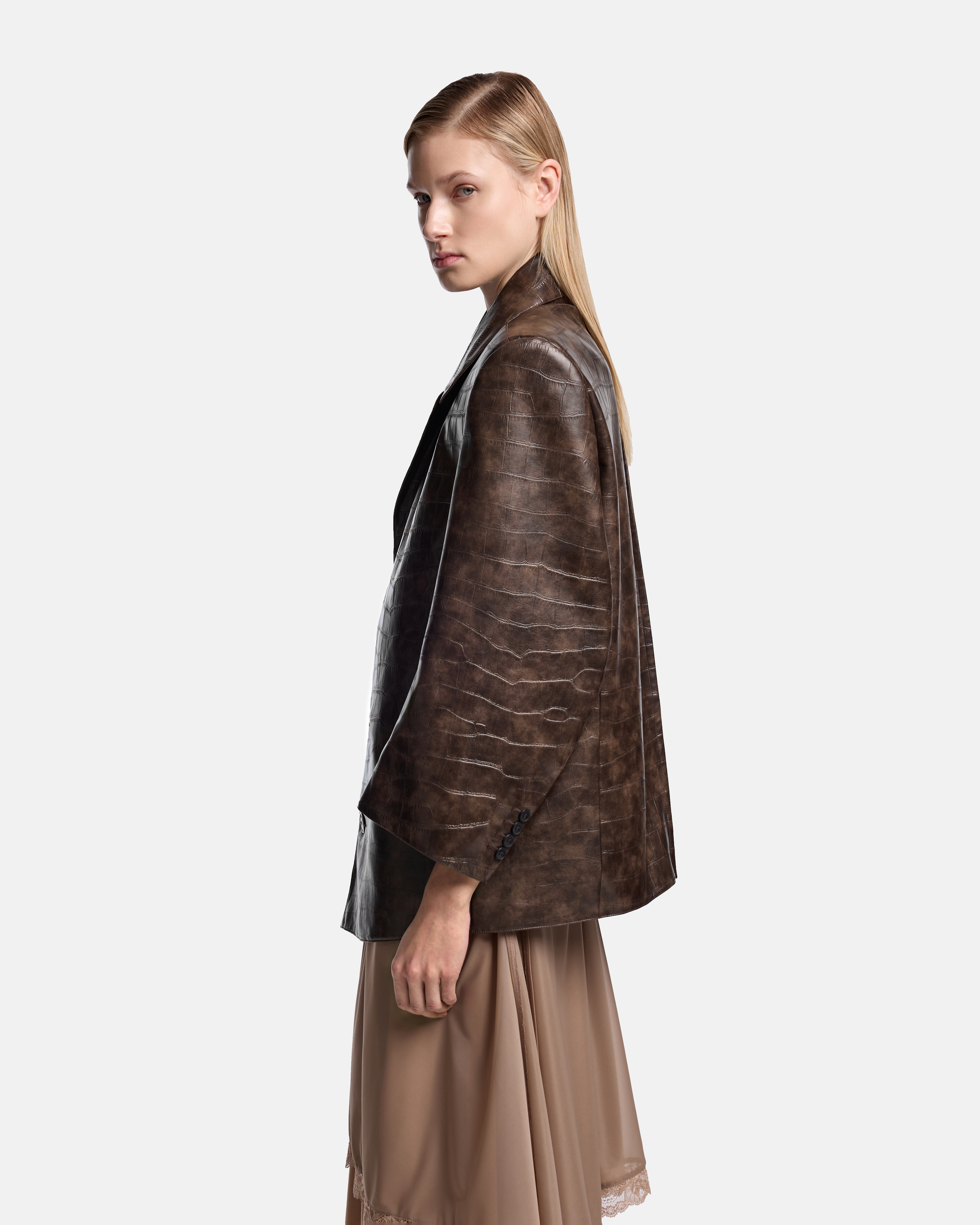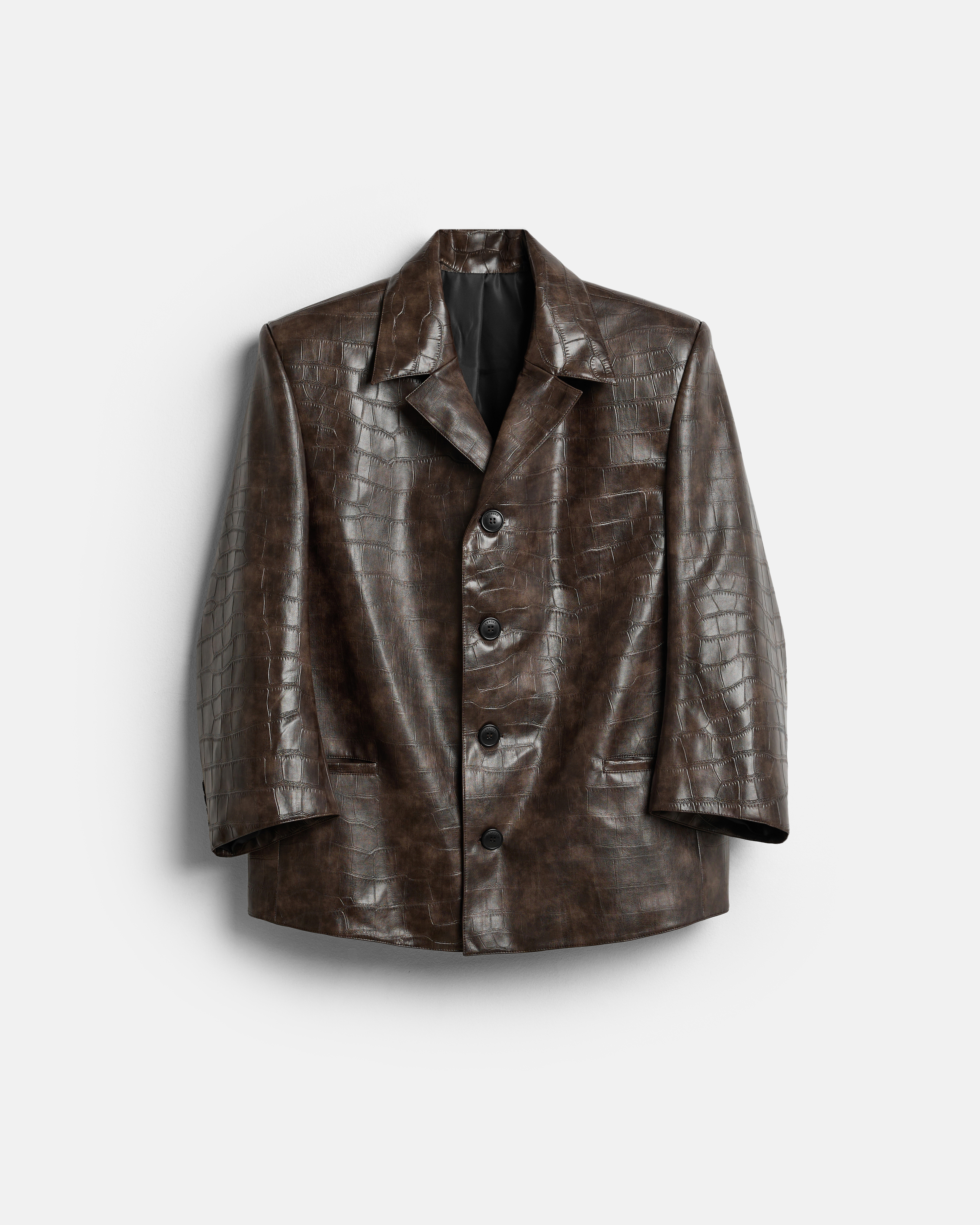 Куртка-пиджак GRANDPA — однобортная модель на стыке классического пиджака и верхней одежды. Выполнена из экокожи с выраженной фактурой рептилии, которая задаёт изделию плотность и визуальную глубину.