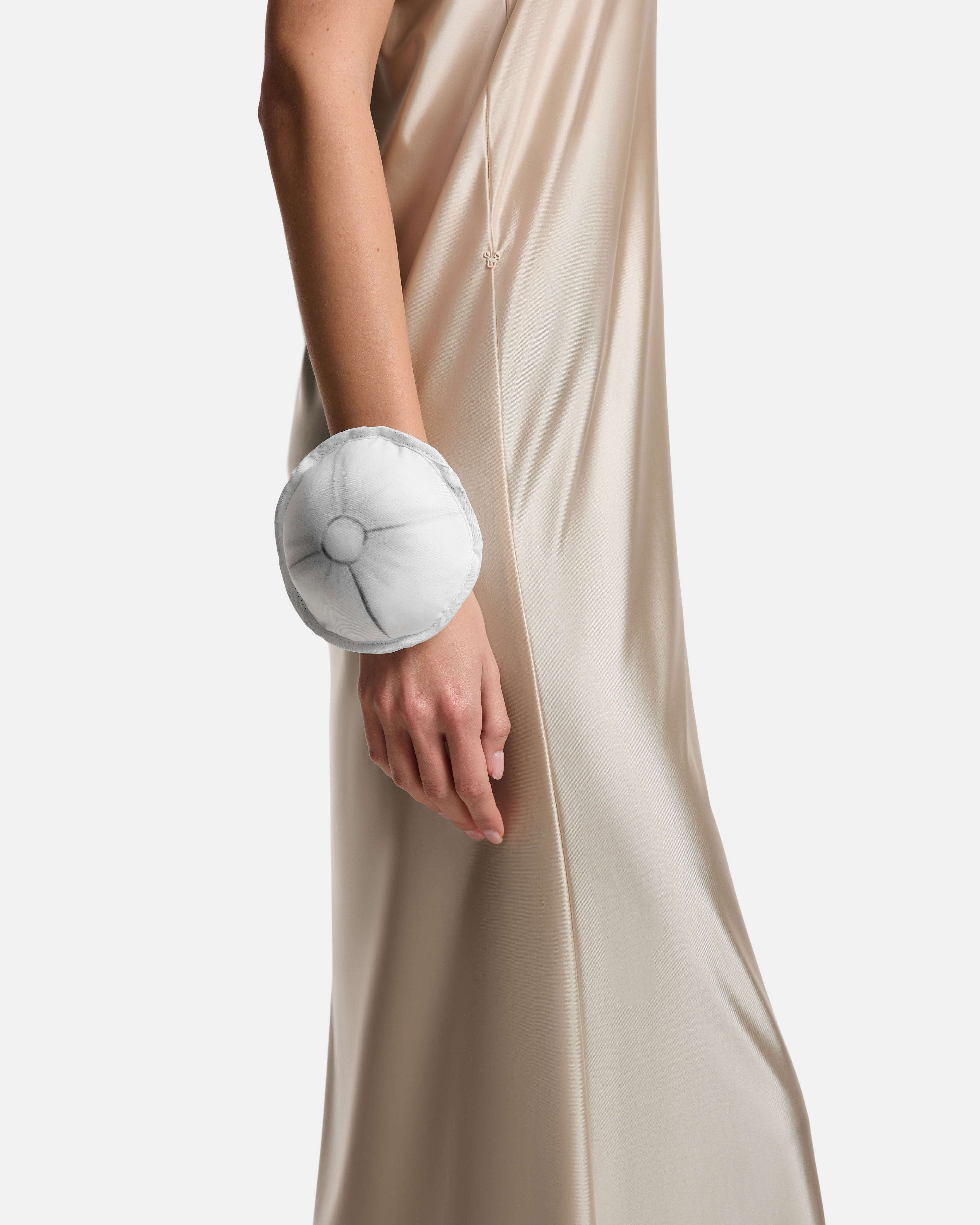 Переосмыслили портновскую игольницу — превратили её в браслет. Круглая подушка с тем же принтом Carriage Tie, что и на сумке: мягкие линии, расходящиеся от центра, полутона и эффект объёма при полностью гладкой поверхности. На запястье сидит уверенно — благодаря резинке. Маленький объект-акцент.