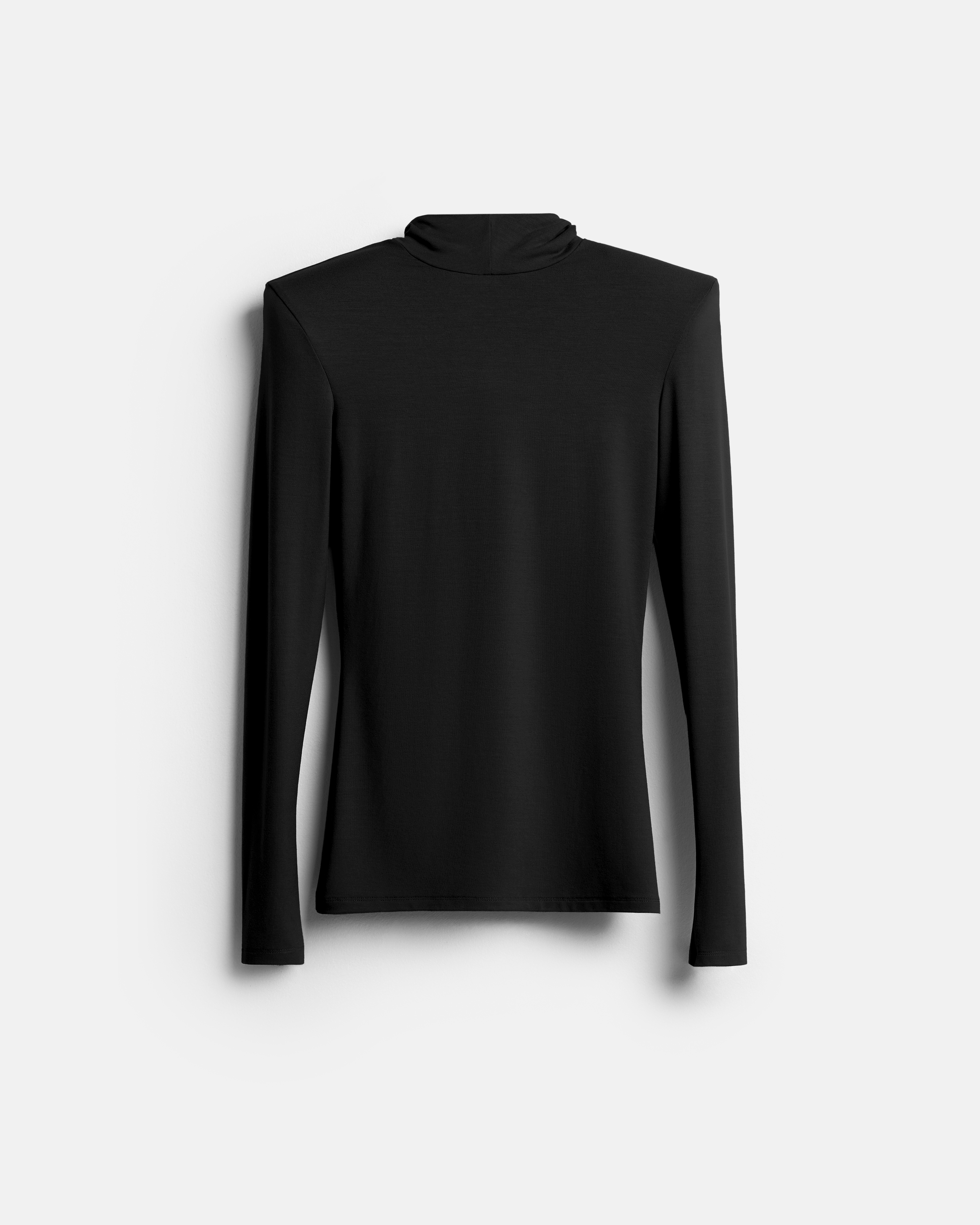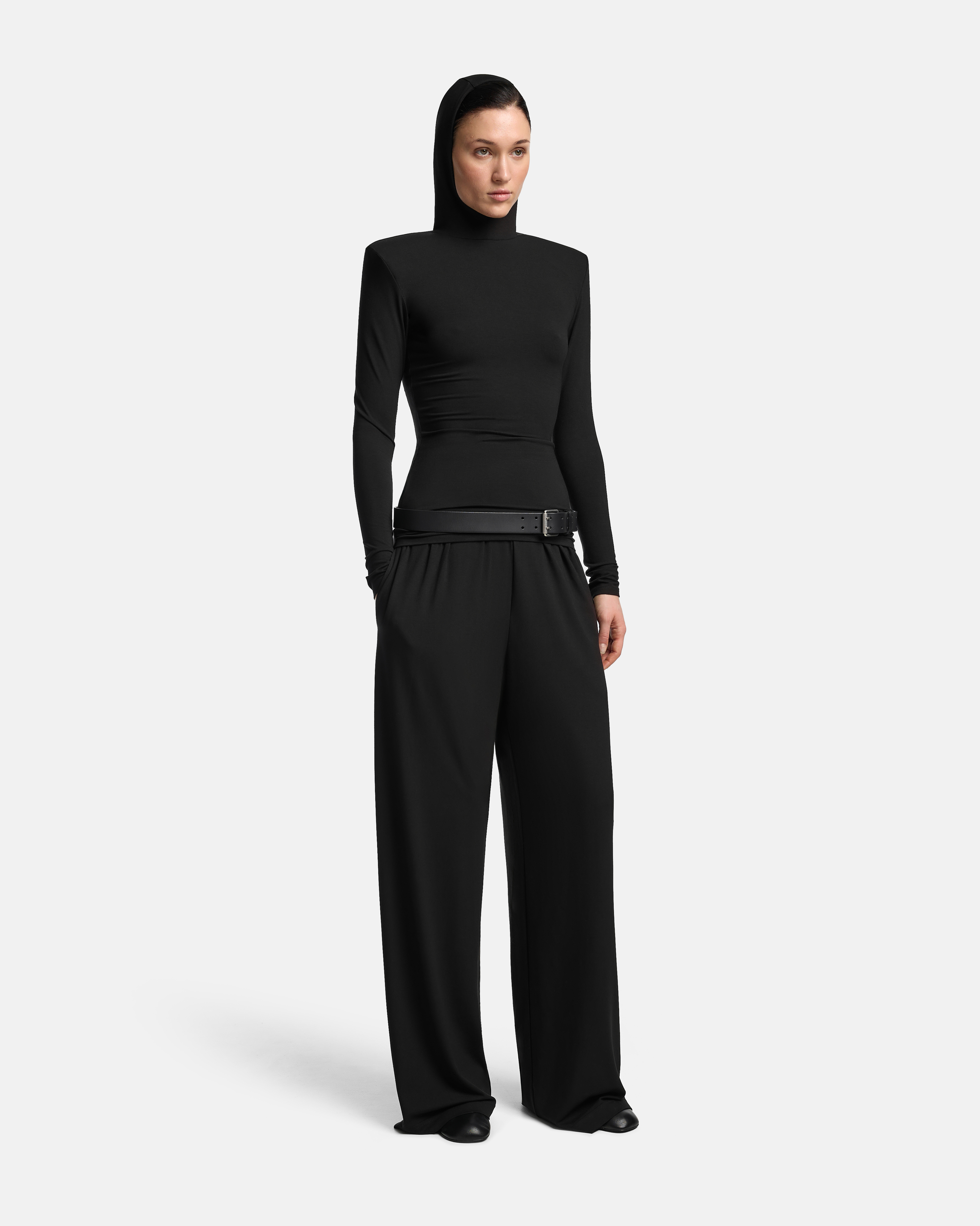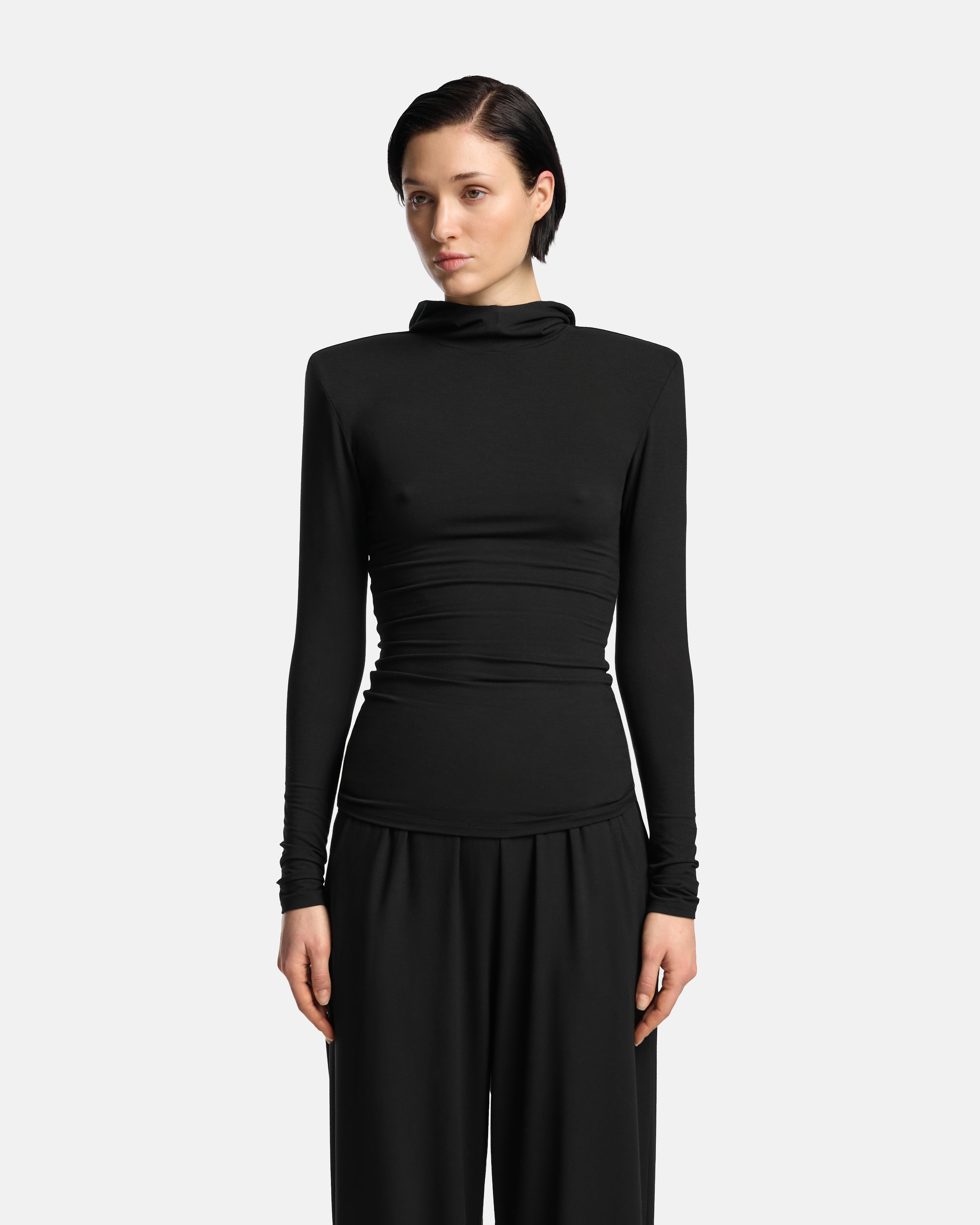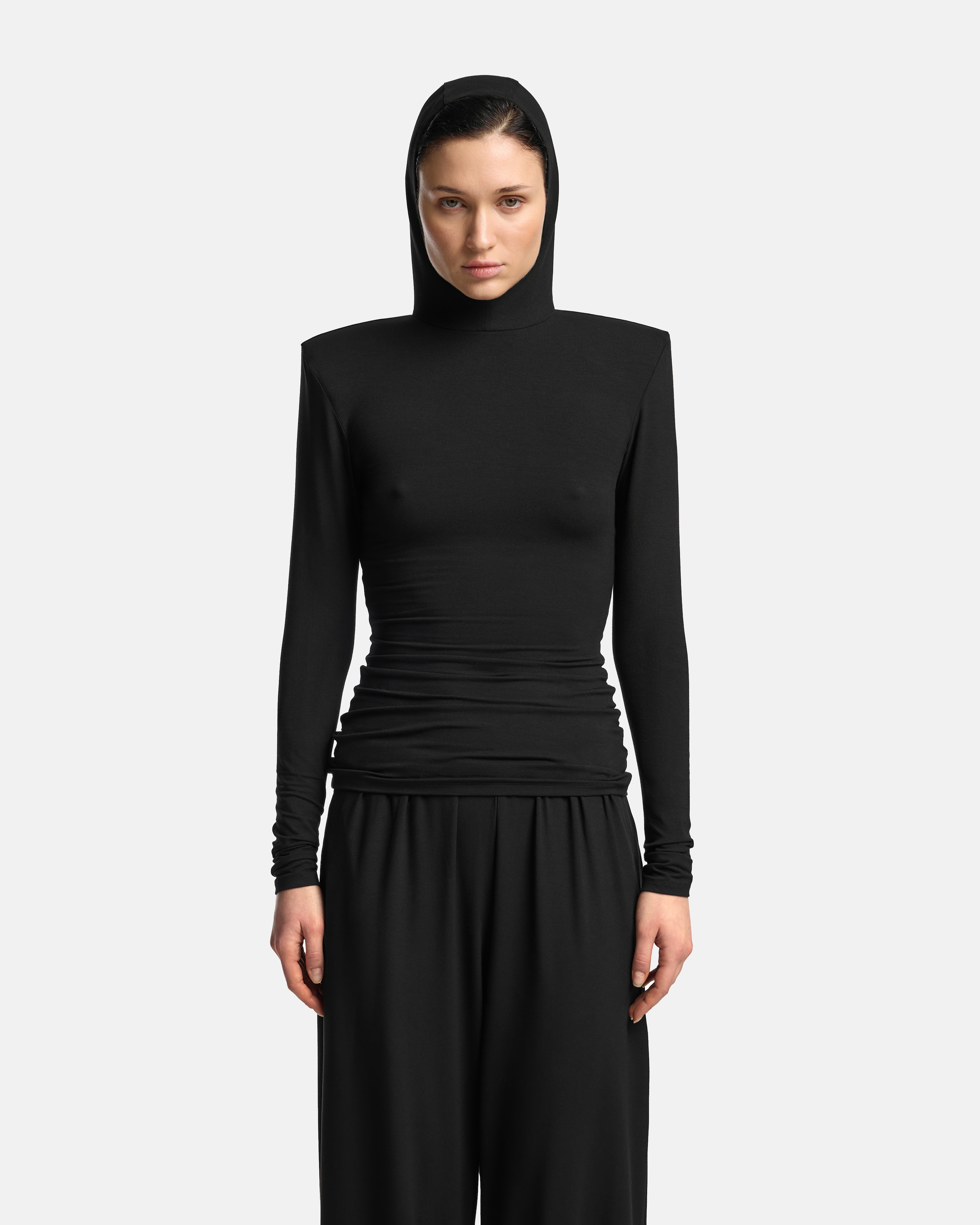 Лонгслив с капюшоном выполнен из эластичного вискозного трикотажа. Материал мягкий, тонкий и комфортный, плотно прилегает к телу и формирует собранный силуэт.