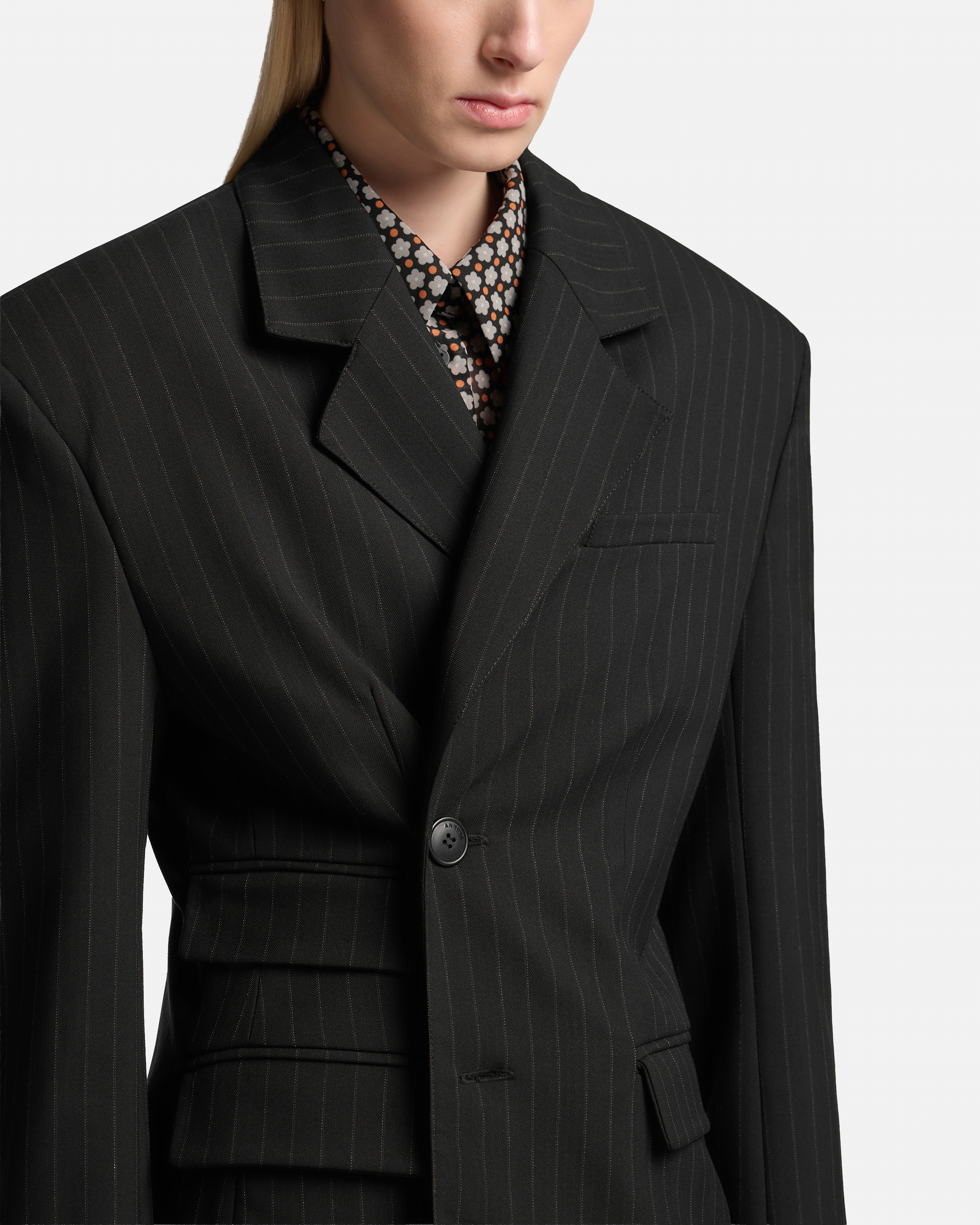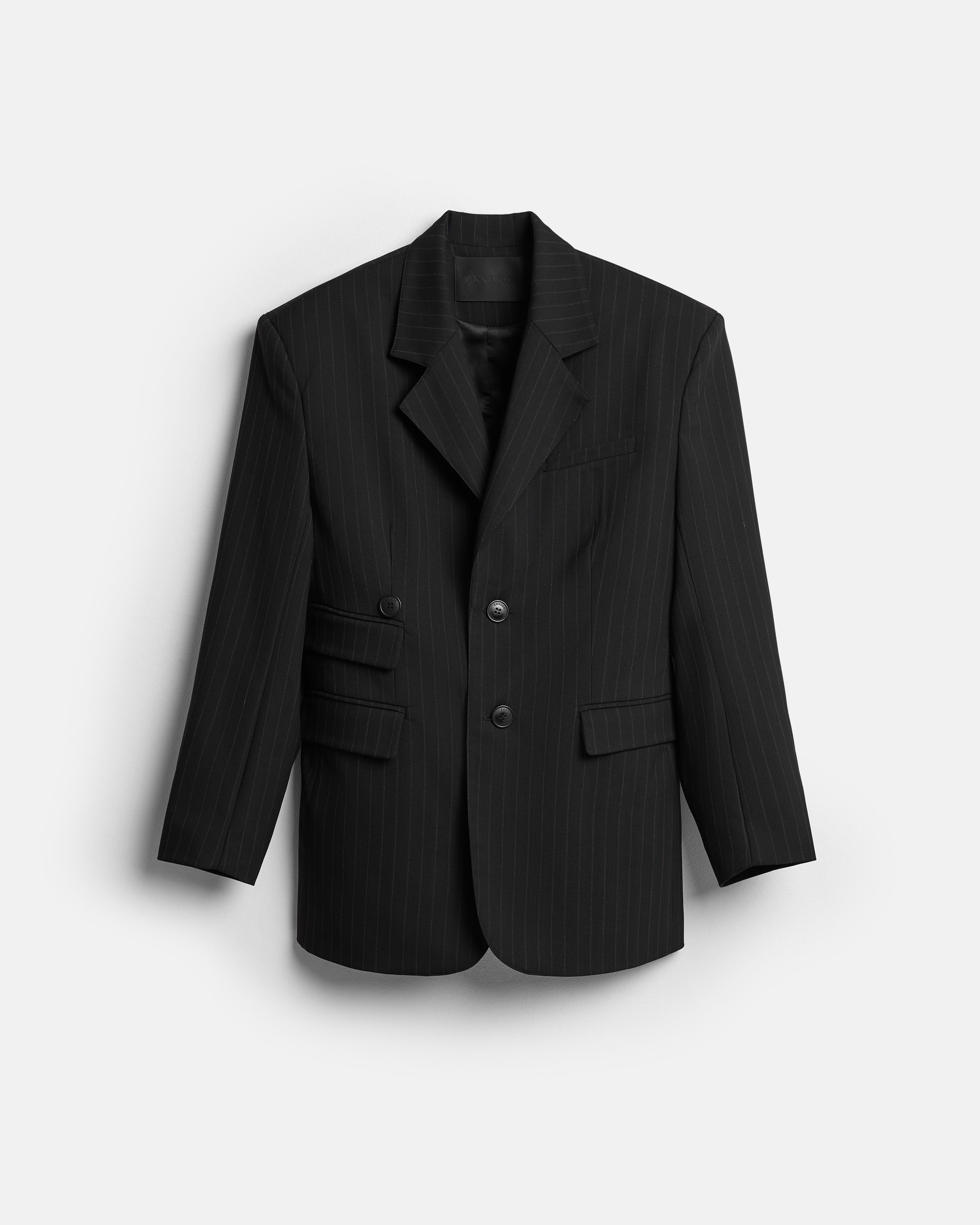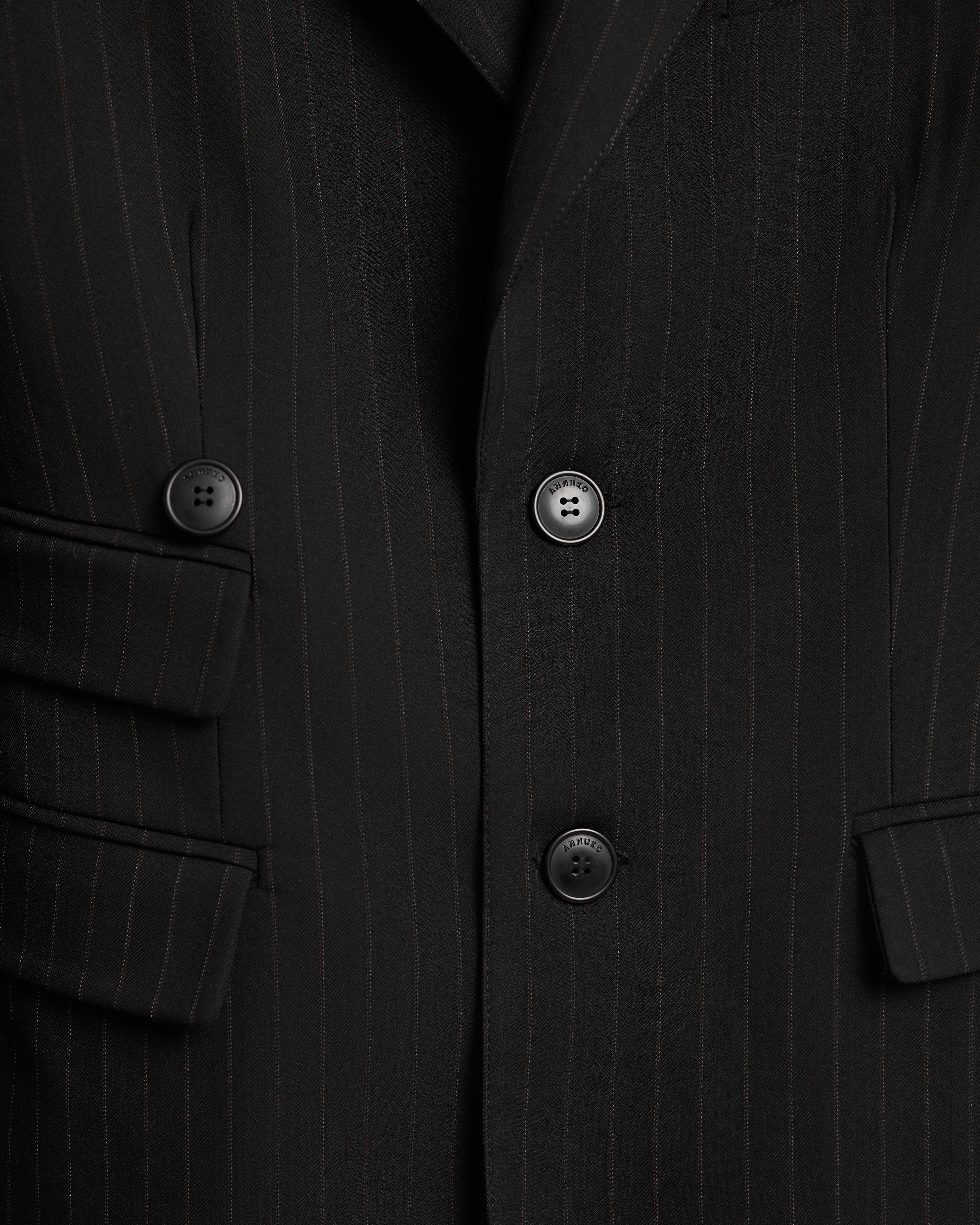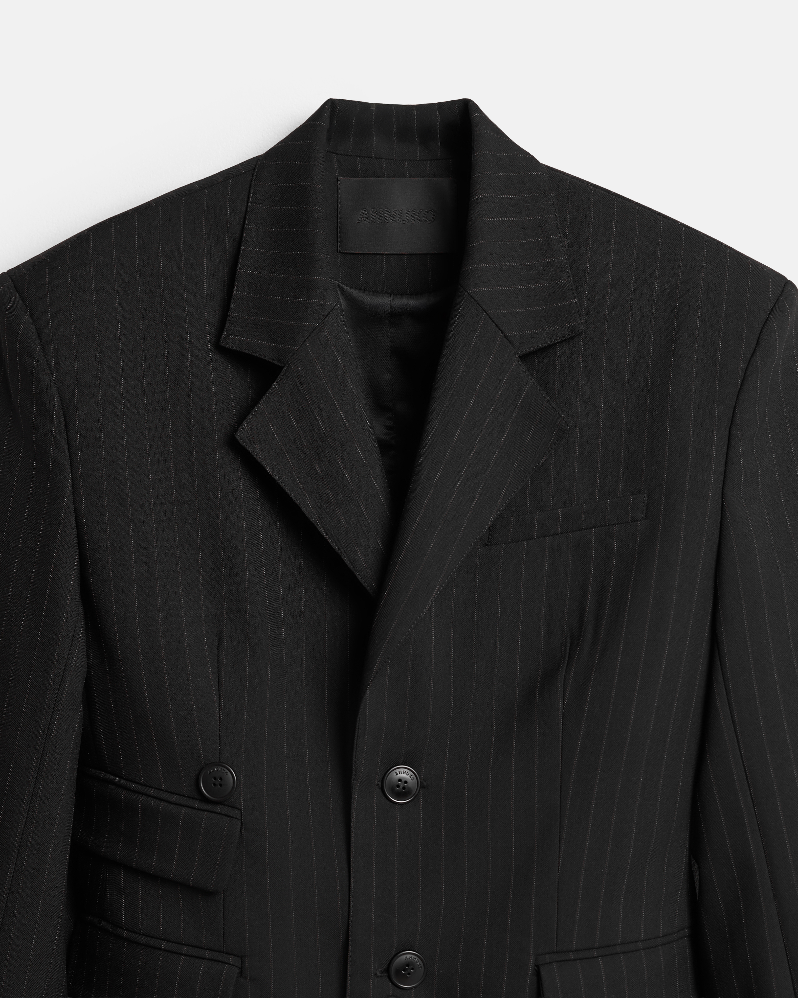 Пиджак из костюмной ткани в тонкую полоску с выстроенной плечевой конструкцией. Жёсткая линия плеч формирует чёткий, собранный силуэт. Конструкция позволяет трансформировать форму изделия: пиджак можно застёгивать по-разному, меняя посадку — от прямой до более приталенной. Два наружных кармана, классические лацканы.