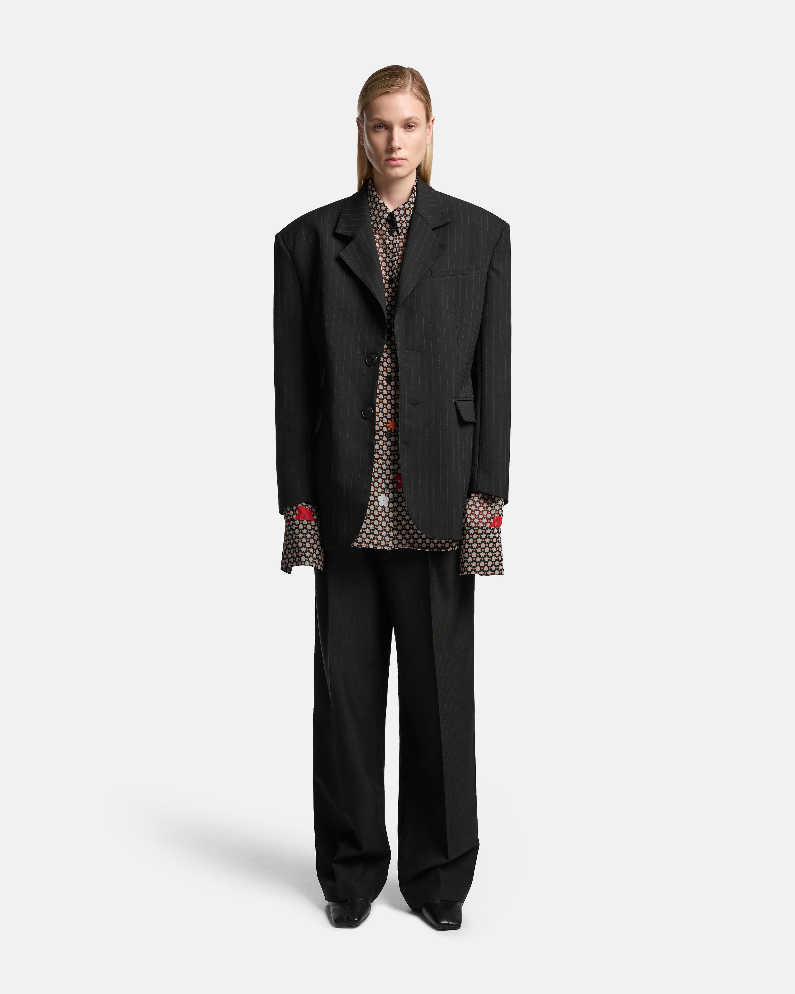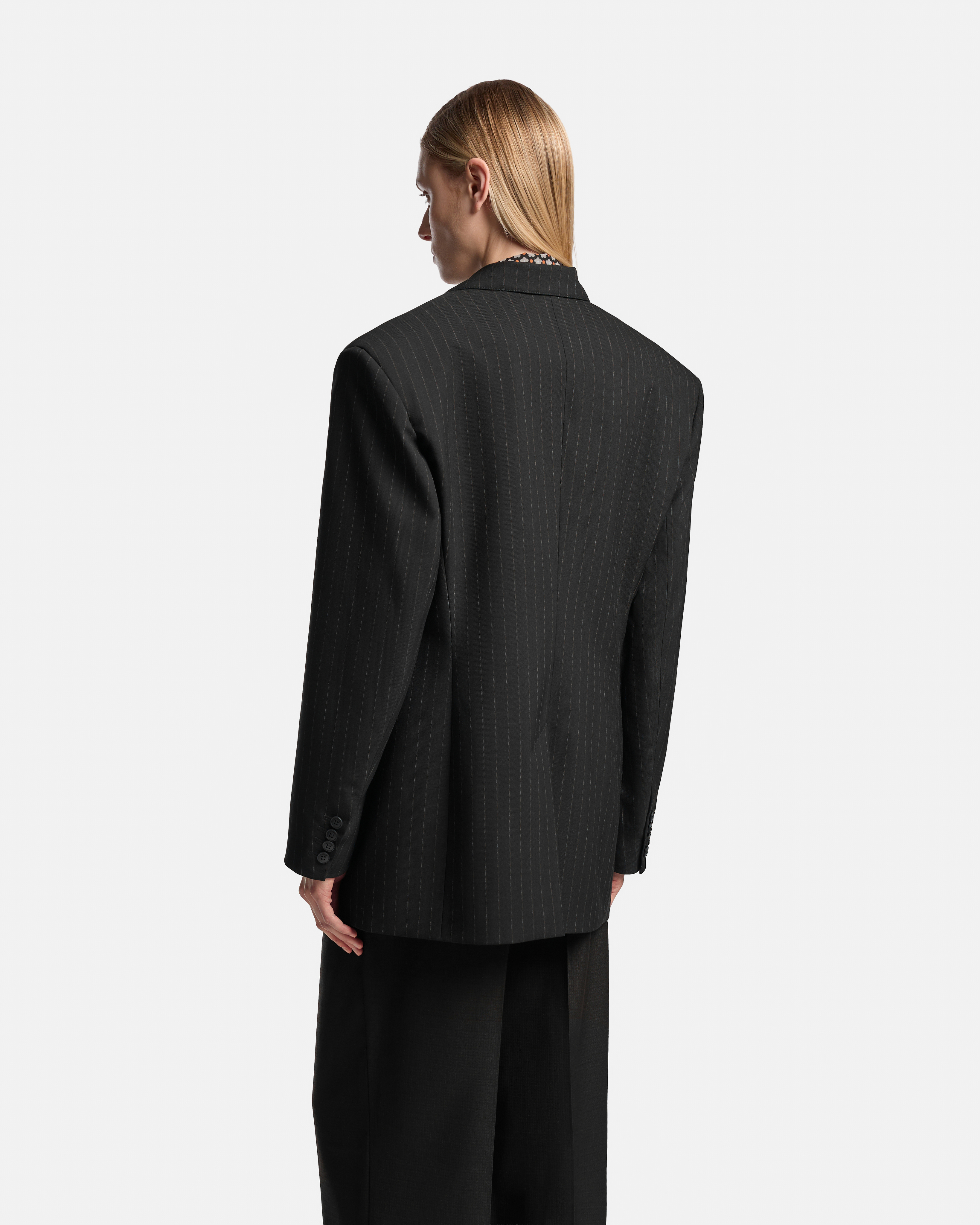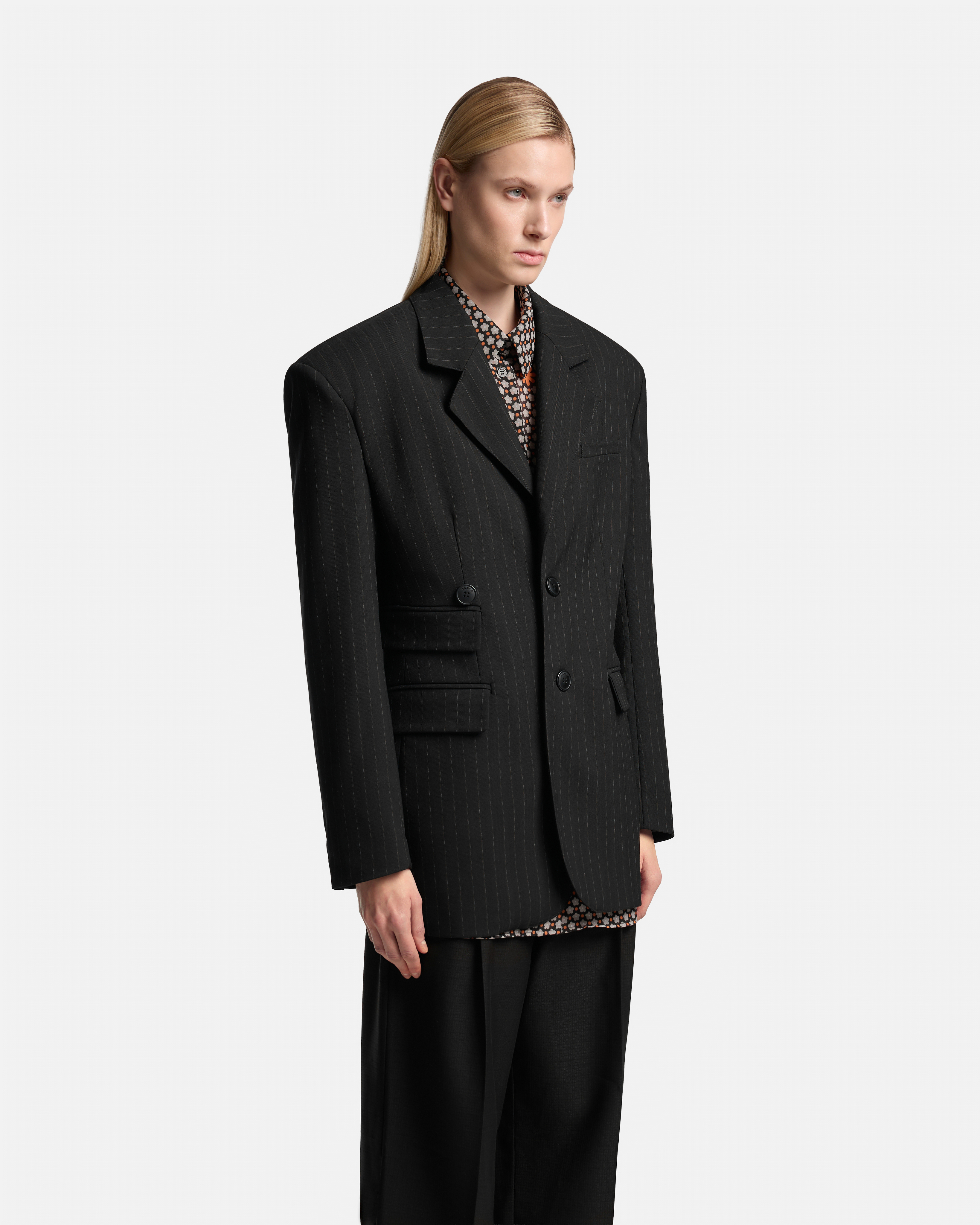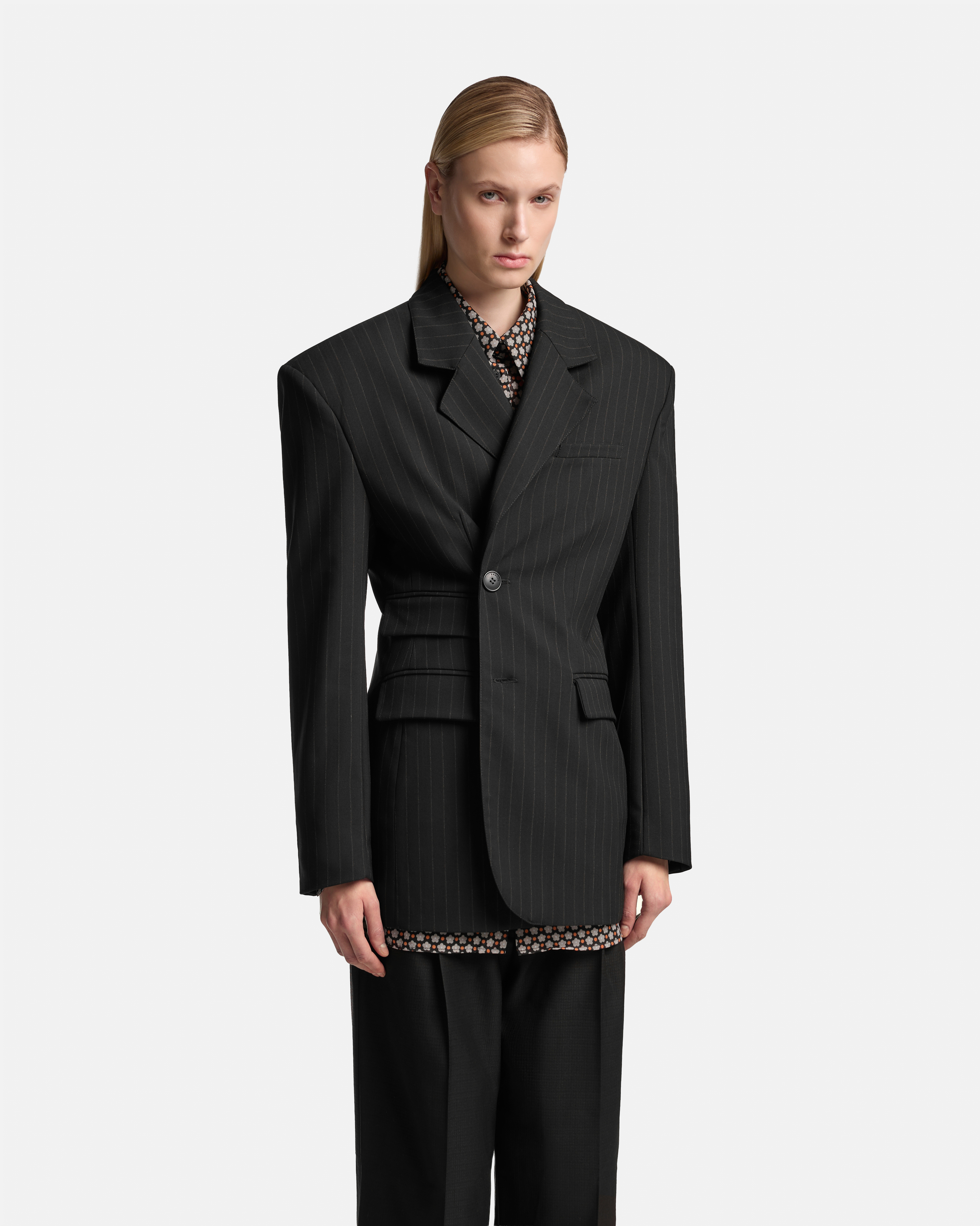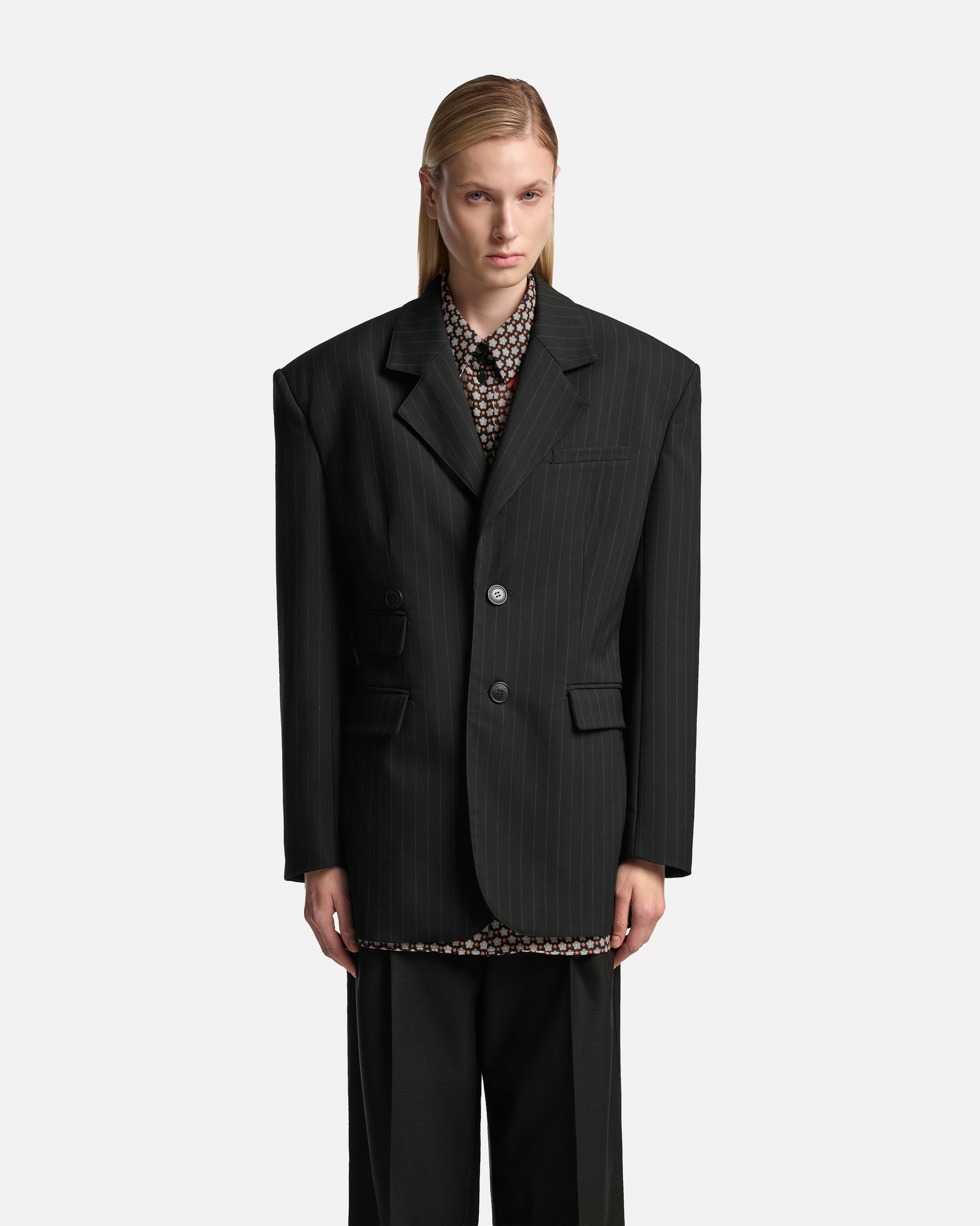 Пиджак из костюмной ткани в тонкую полоску с выстроенной плечевой конструкцией. Жёсткая линия плеч формирует чёткий, собранный силуэт. Конструкция позволяет трансформировать форму изделия: пиджак можно застёгивать по-разному, меняя посадку — от прямой до более приталенной. Два наружных кармана, классические лацканы.