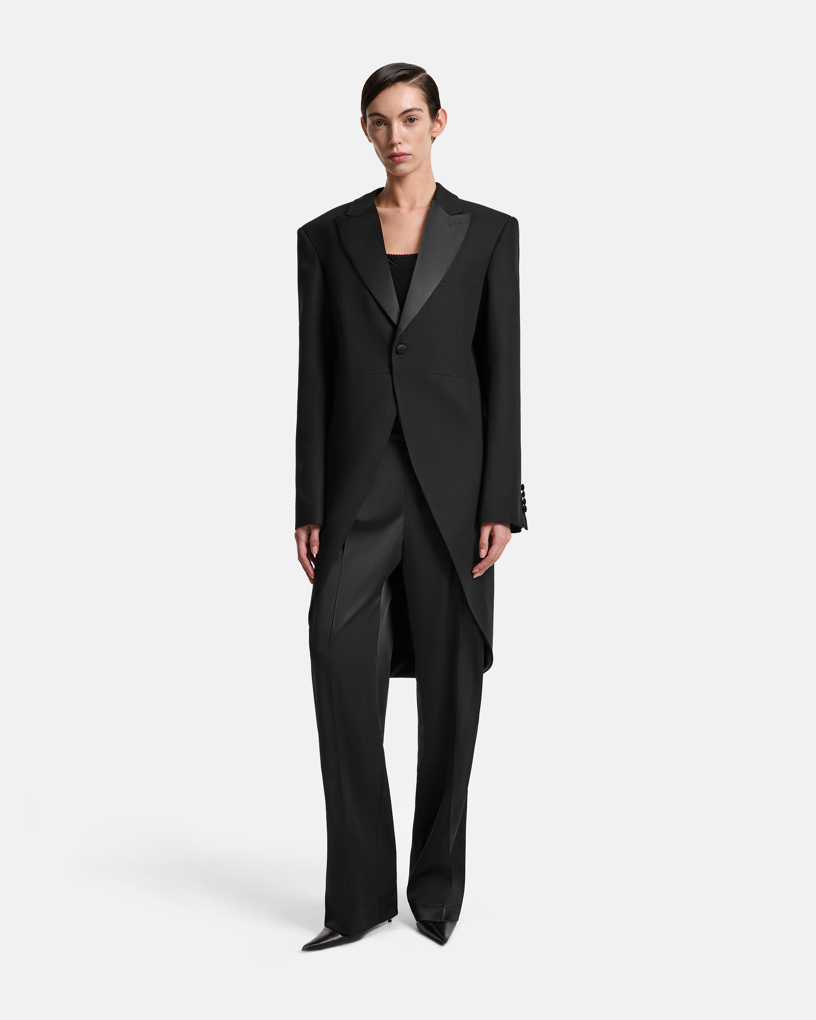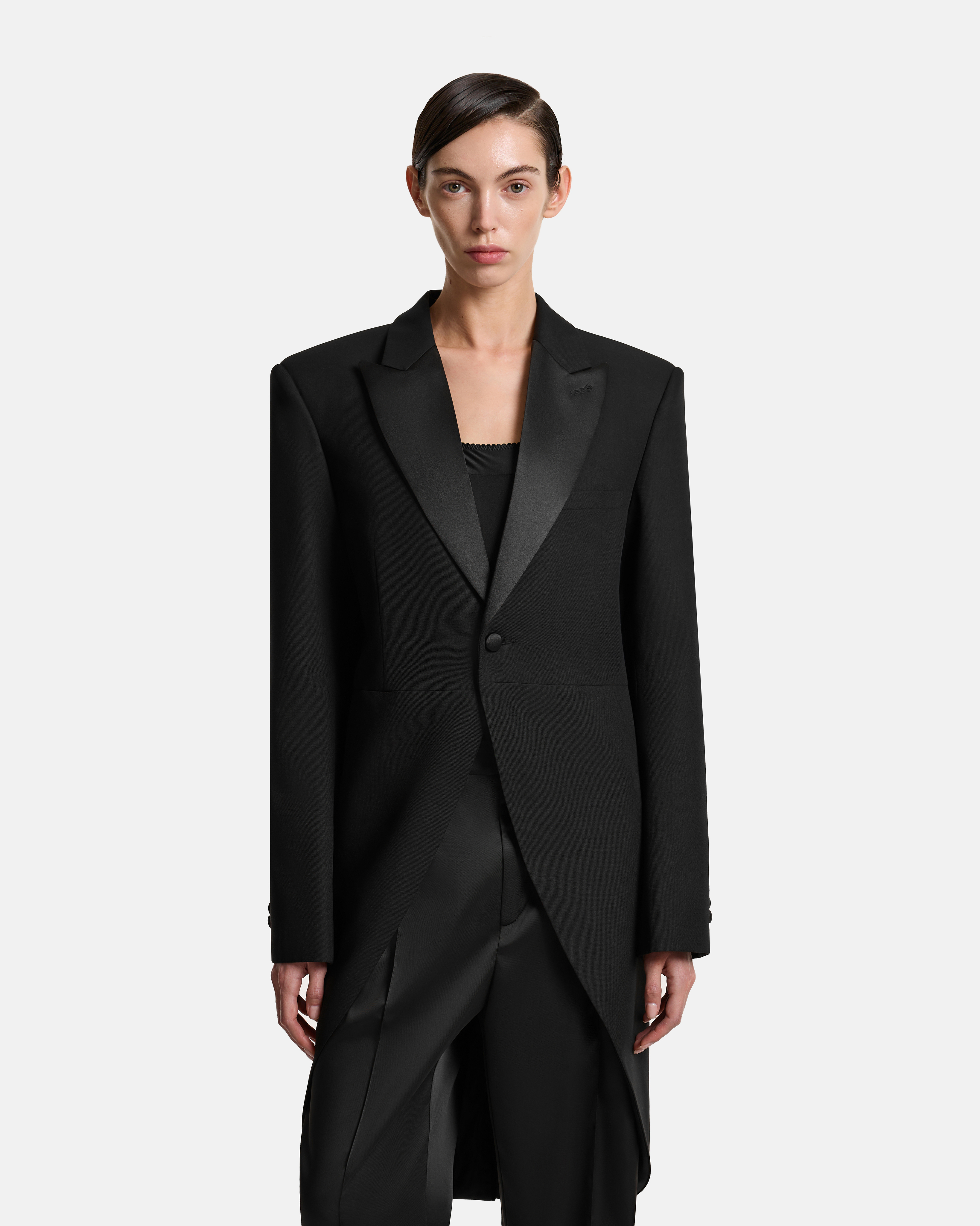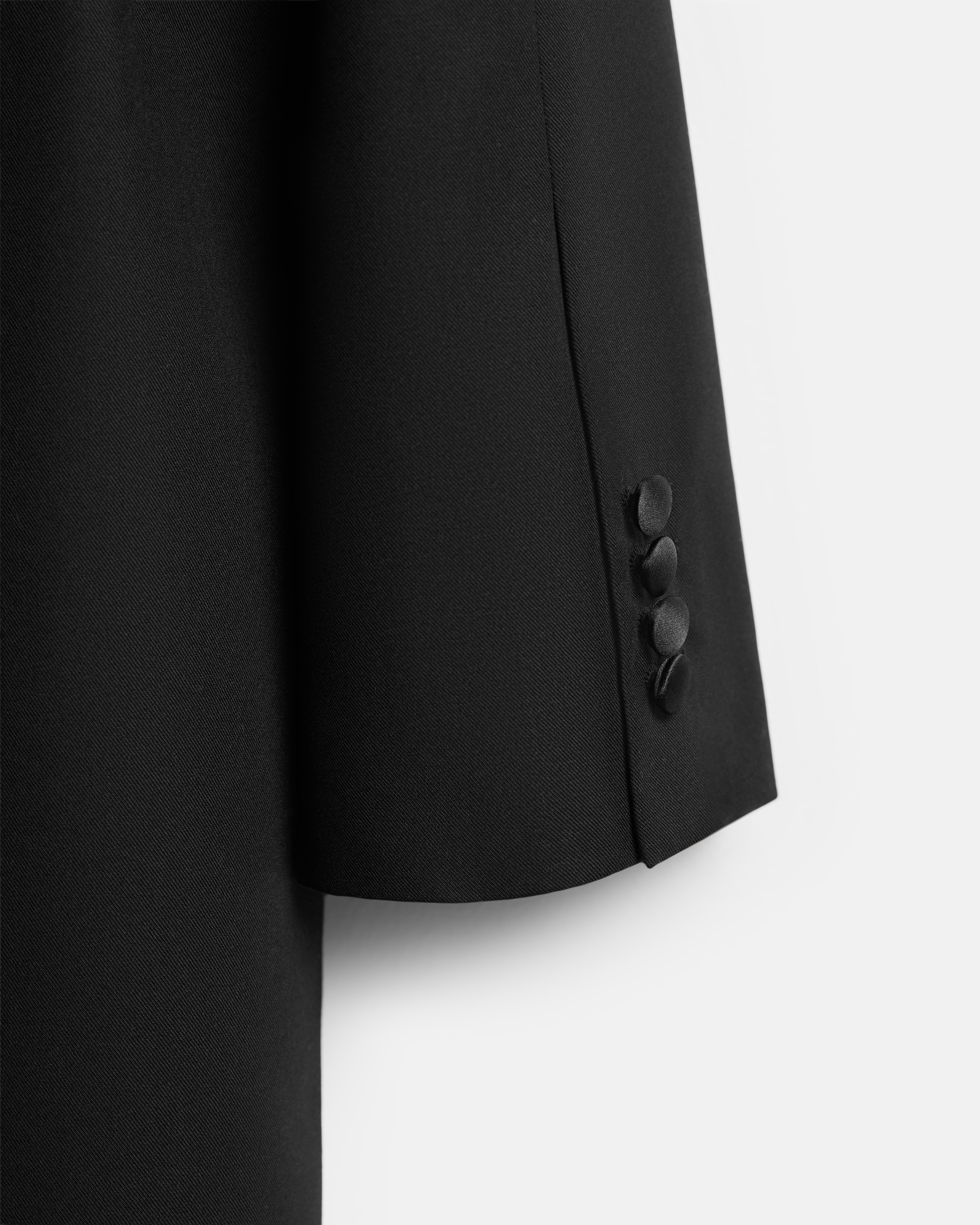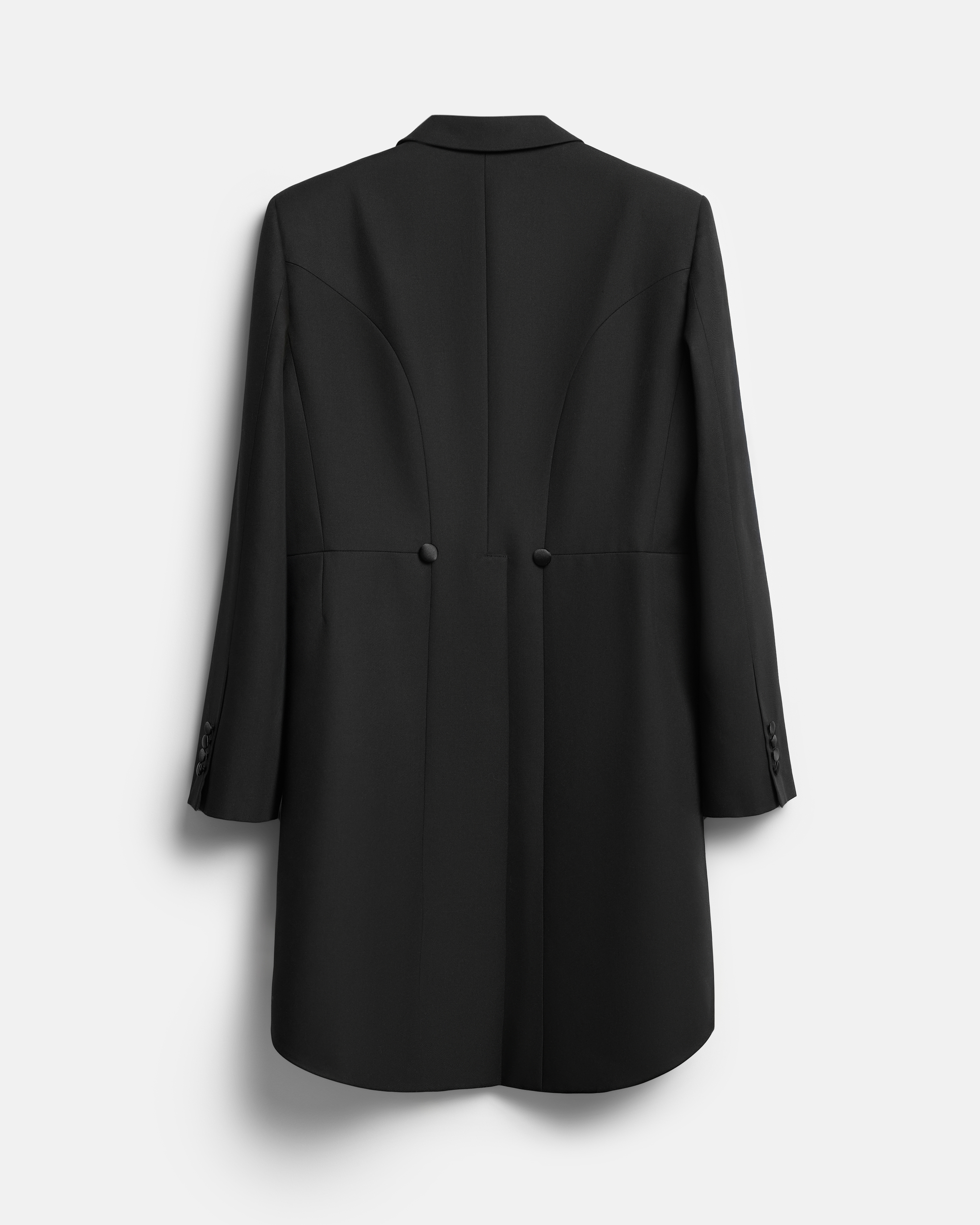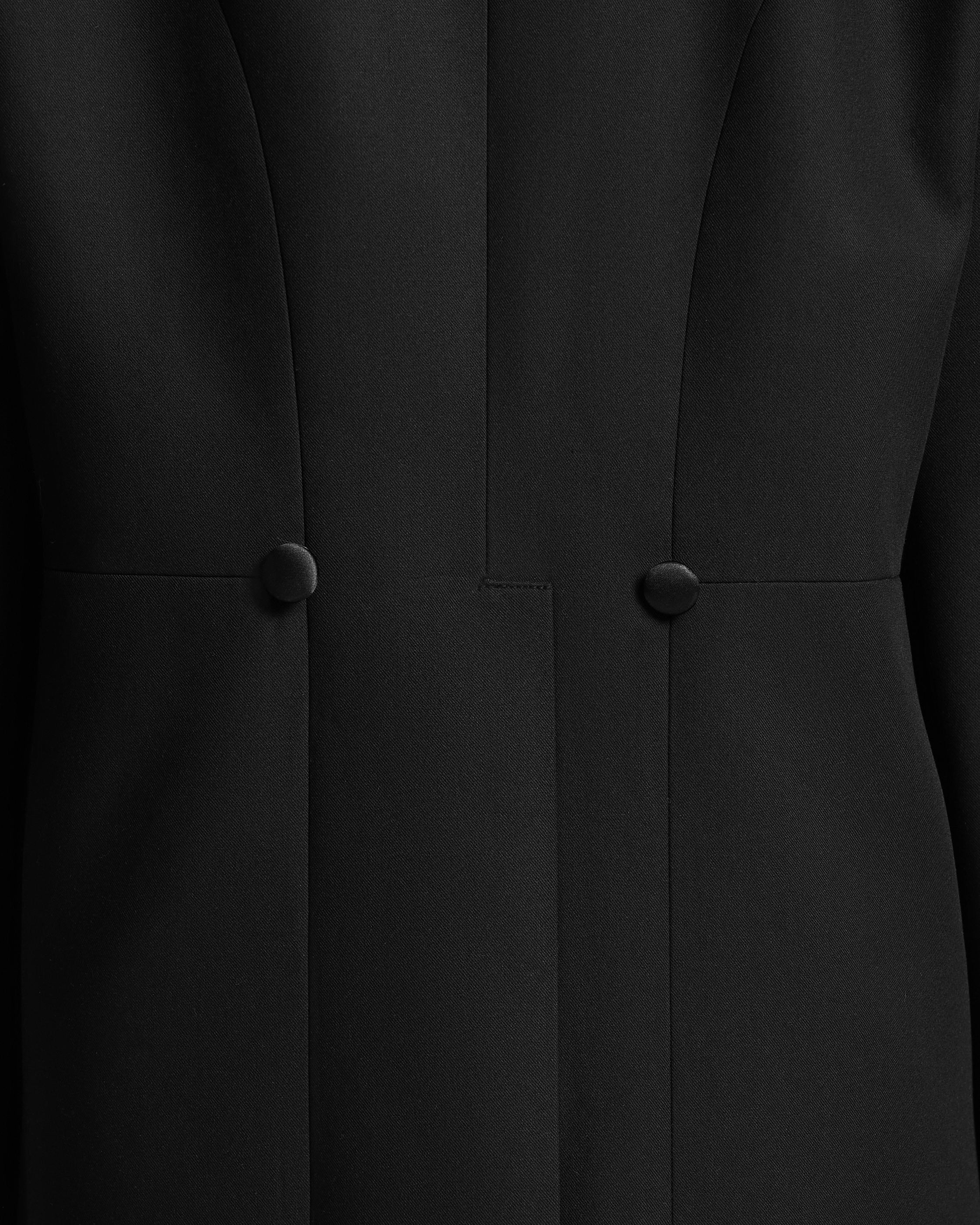 Мы собрали свою версию по канонам прошлых лет: одна пуговица, атласные лацканы, вырезанные скосы спереди, удлинённая округлая спинка с парой пуговиц. Плечи собраны, рукав с рядом пуговиц. Строгая вертикаль и чистая линия — фрак, вписанный в сегодняшний гардероб.
