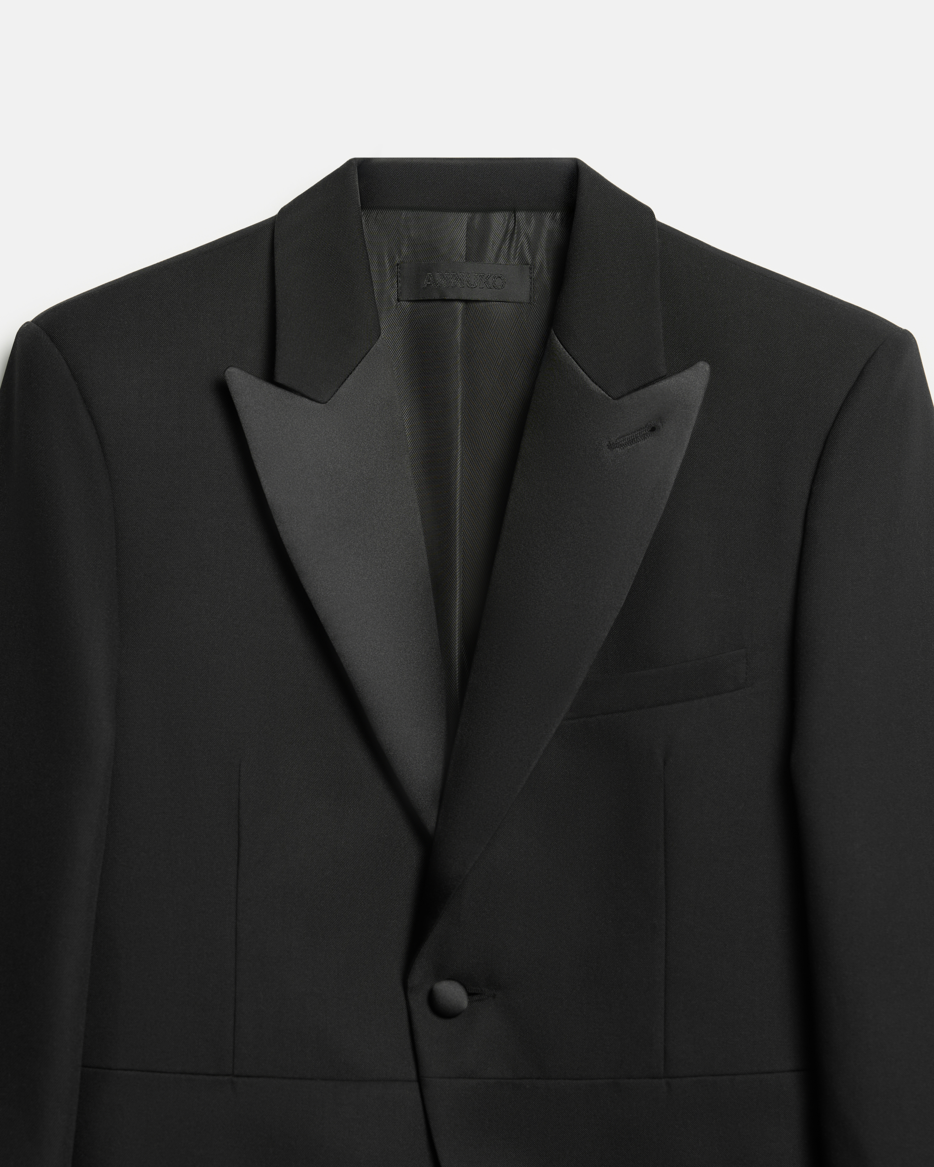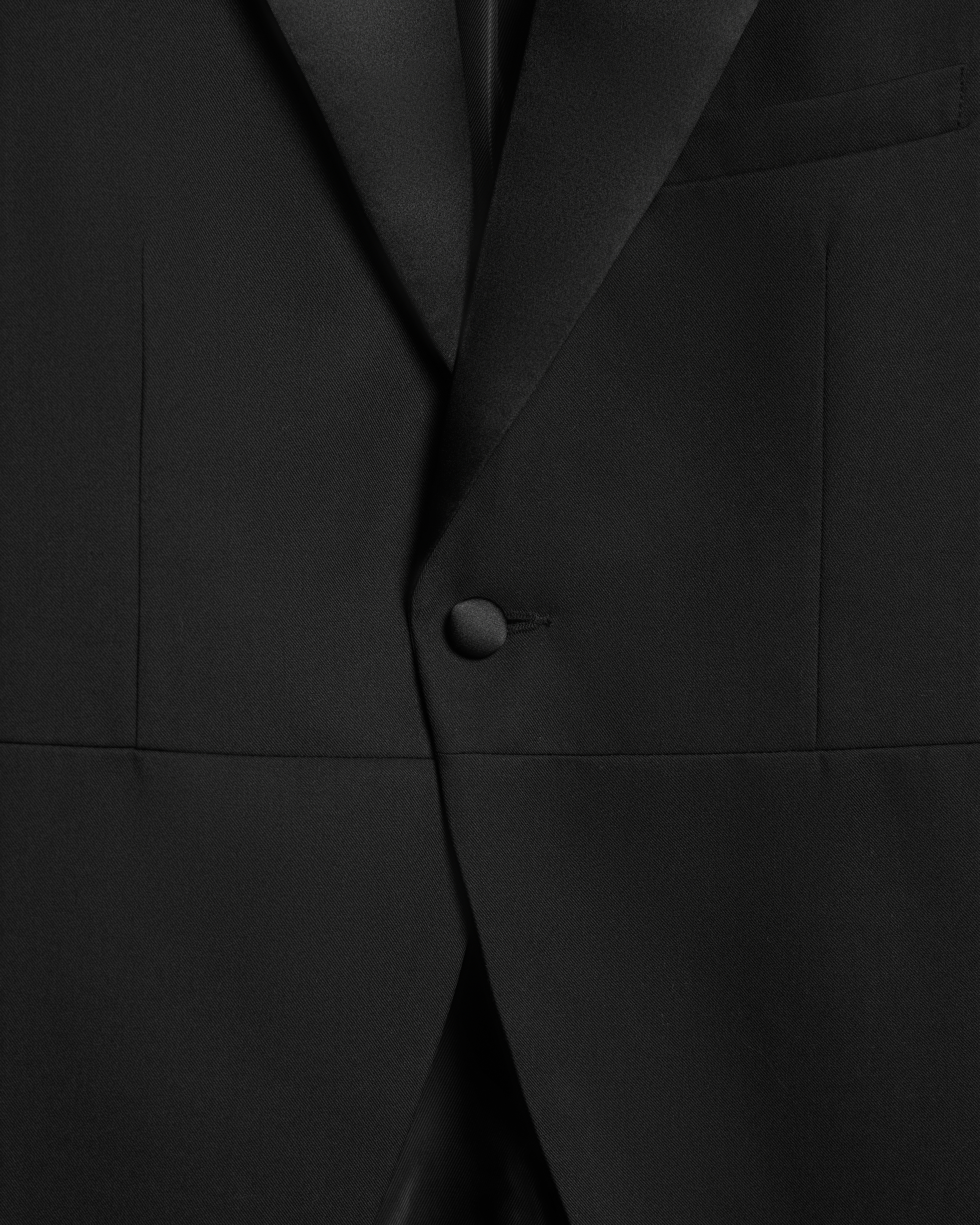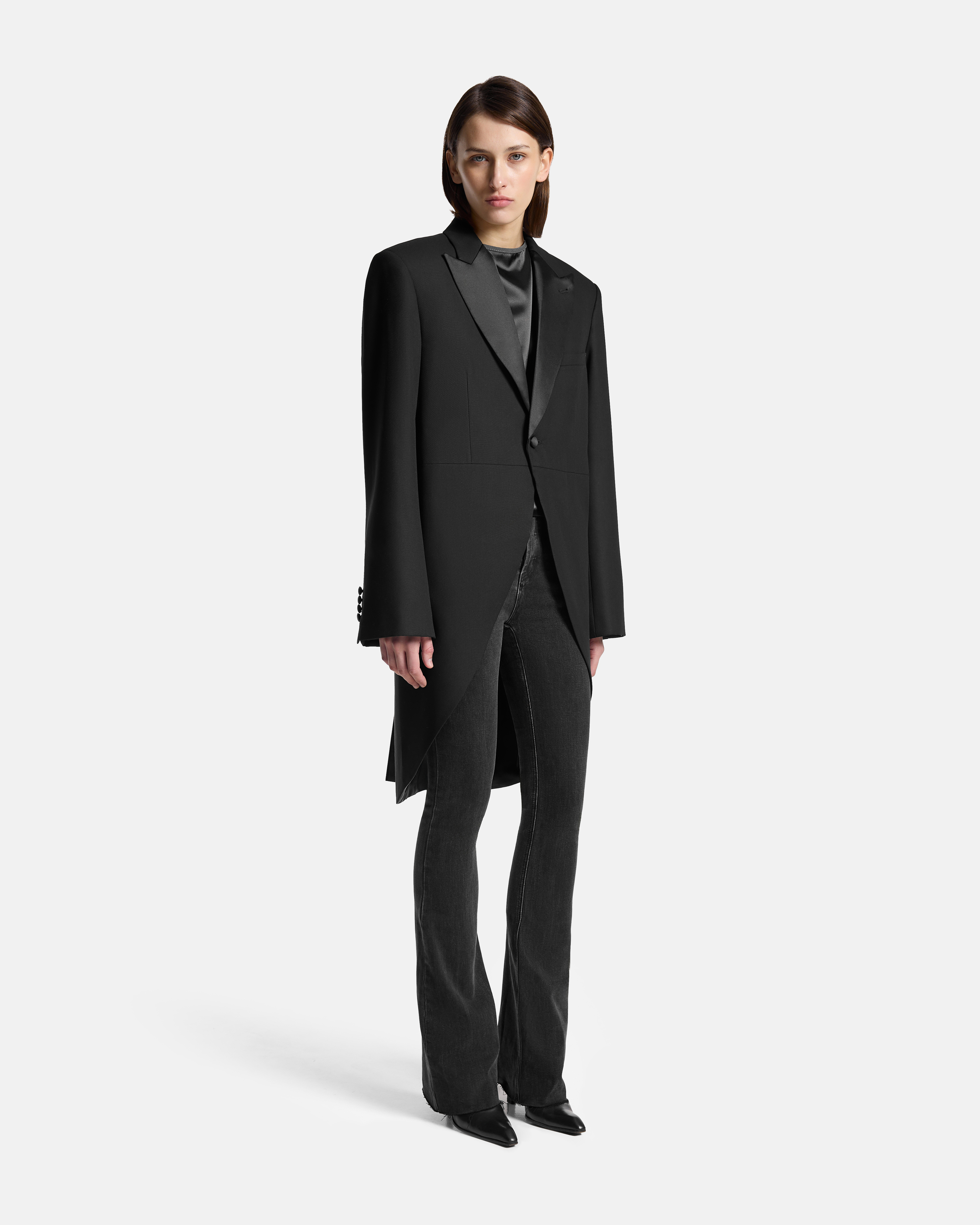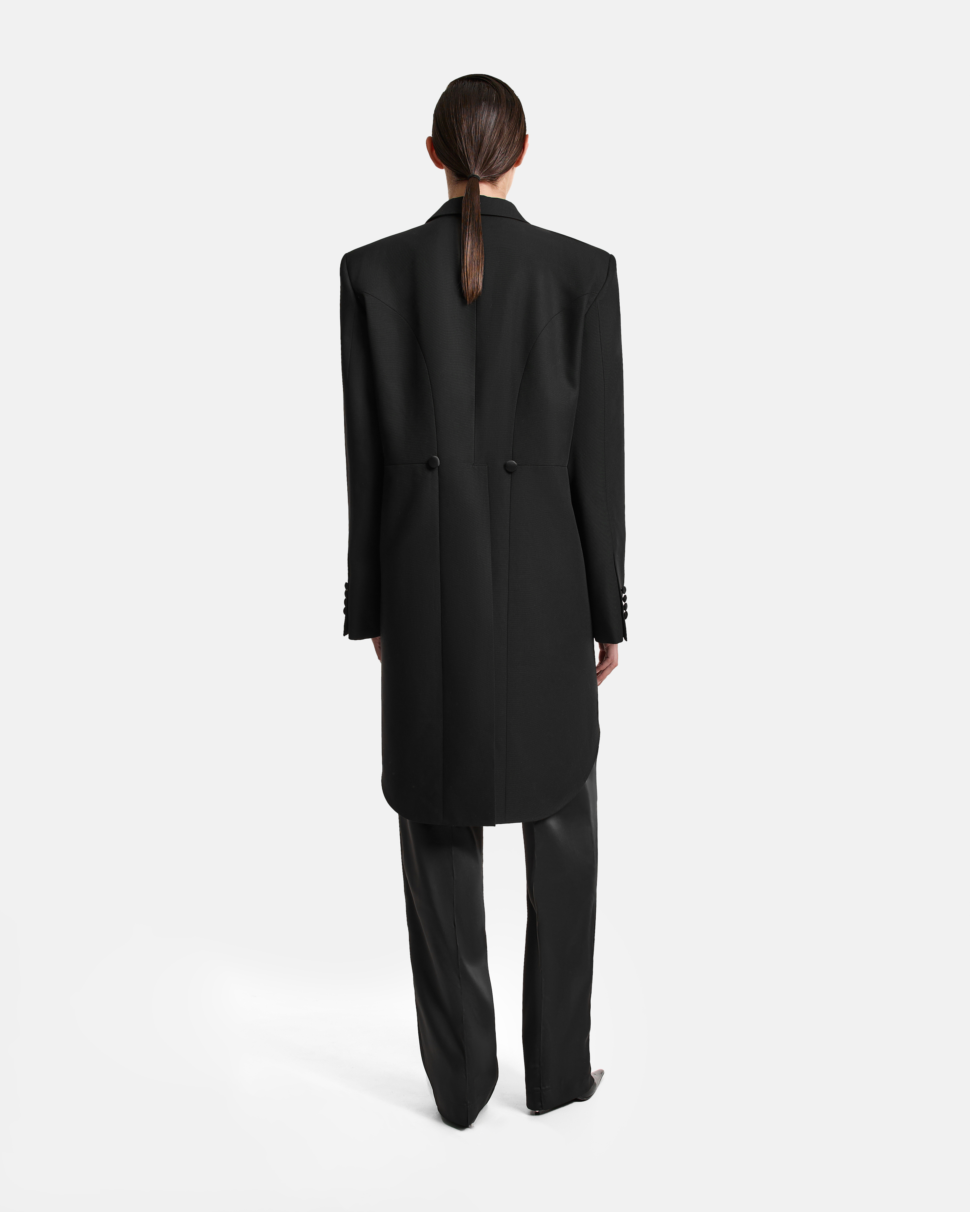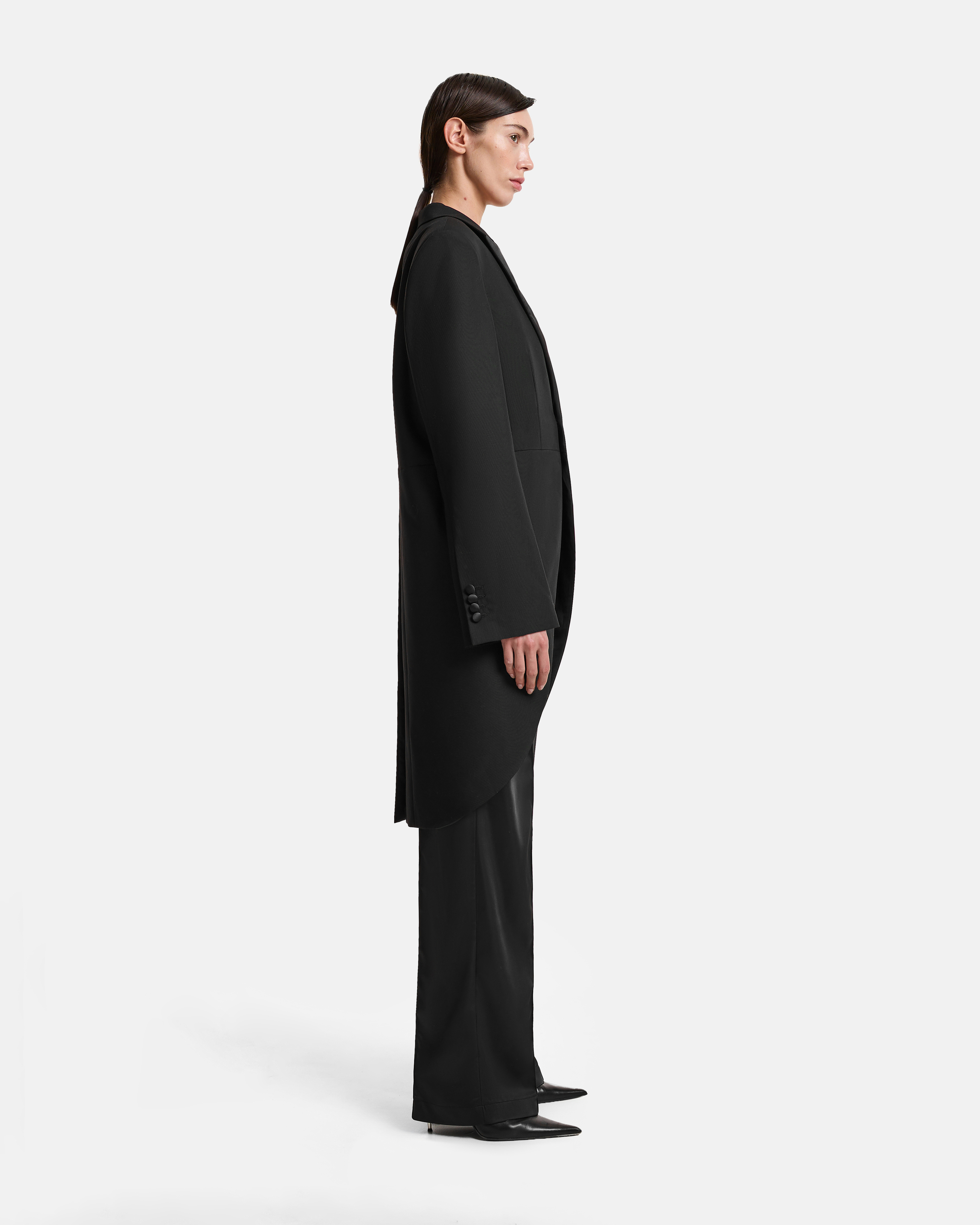Мы собрали свою версию по канонам прошлых лет: одна пуговица, атласные лацканы, вырезанные скосы спереди, удлинённая округлая спинка с парой пуговиц. Плечи собраны, рукав с рядом пуговиц. Строгая вертикаль и чистая линия — фрак, вписанный в сегодняшний гардероб.