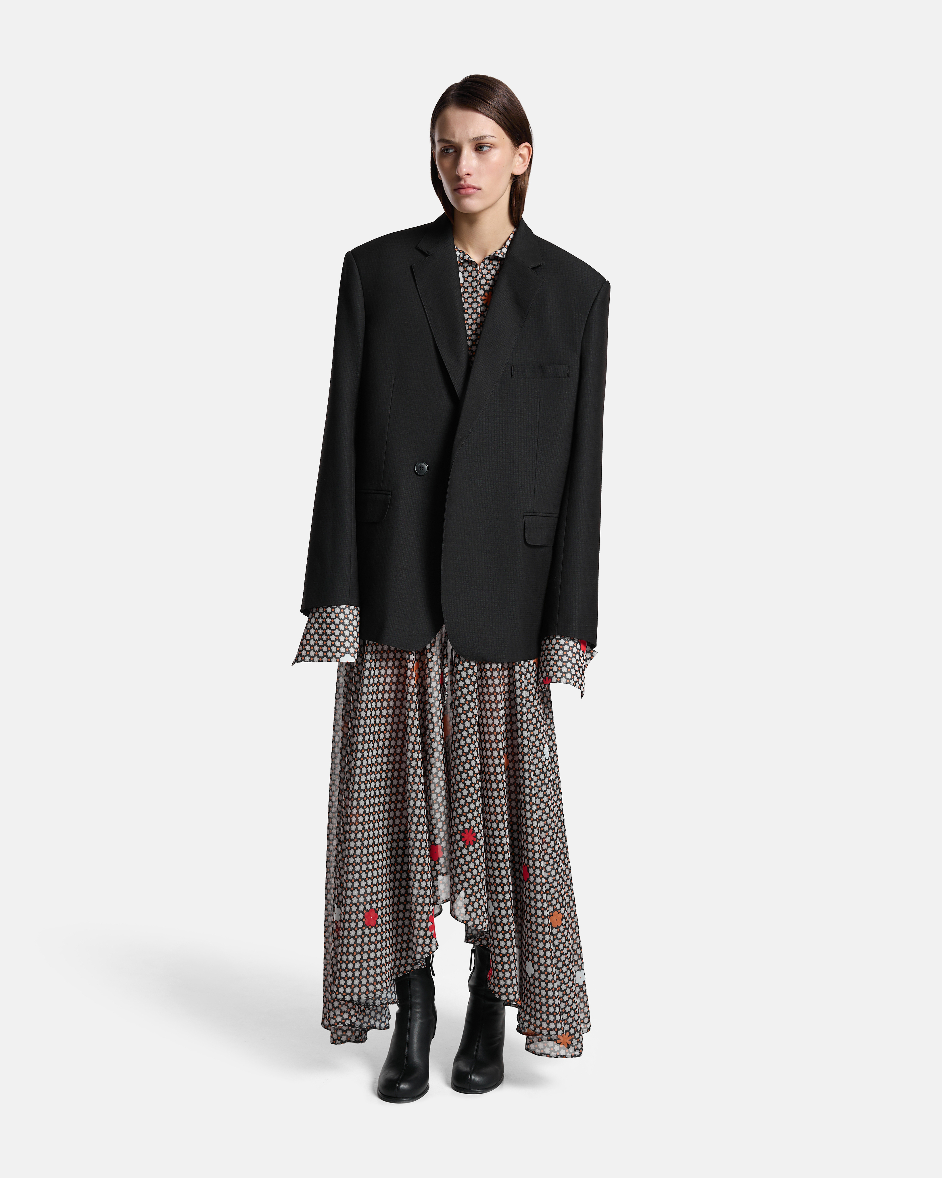 Мы сделали скрытую застёжку, чтобы сохранить чистоту линии и ясность силуэта. Сзади — шлица, позволяющая сохранять свободу движения, не нарушая строгую геометрию формы. Конструкцию дополняют два кармана с клапанами, нагрудный карман и внутренний — для сохранения функциональности.