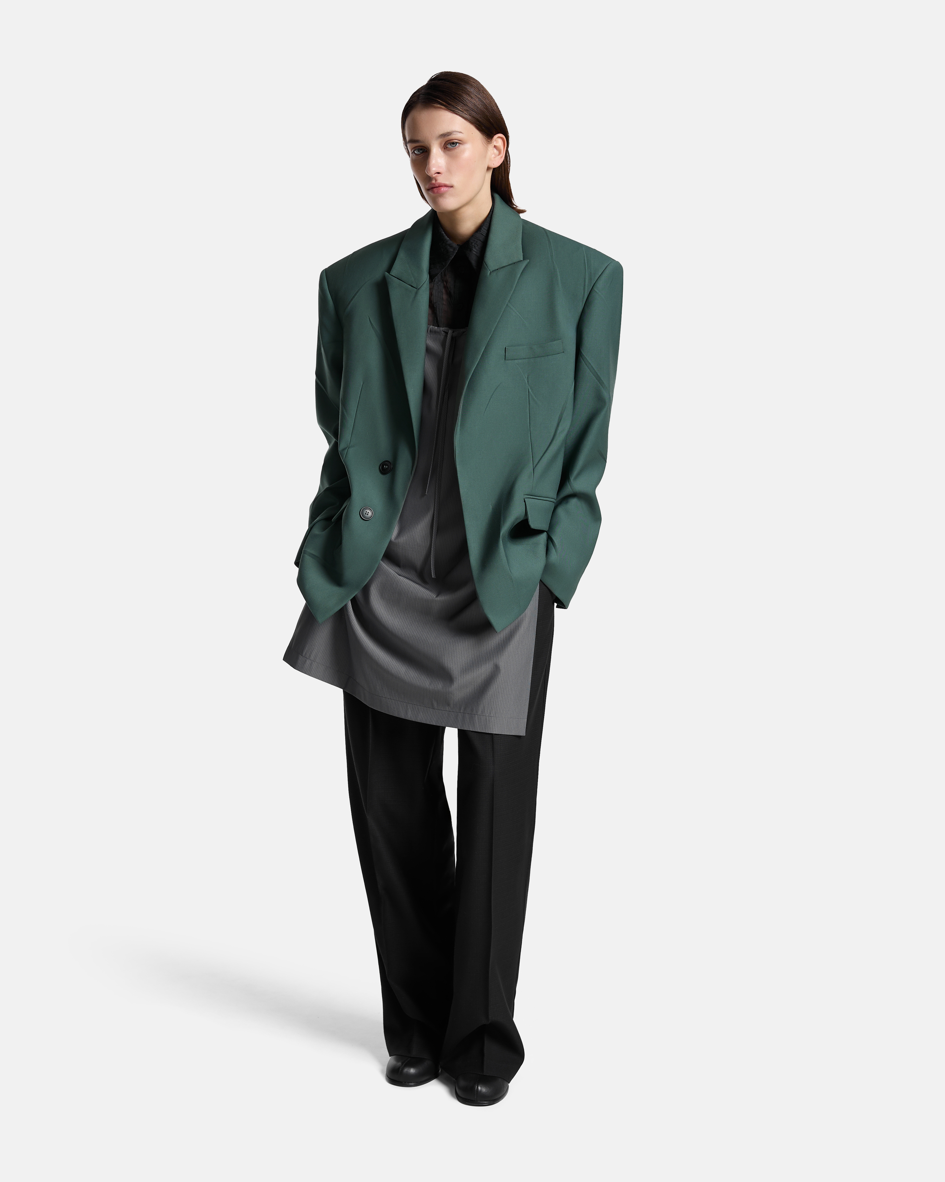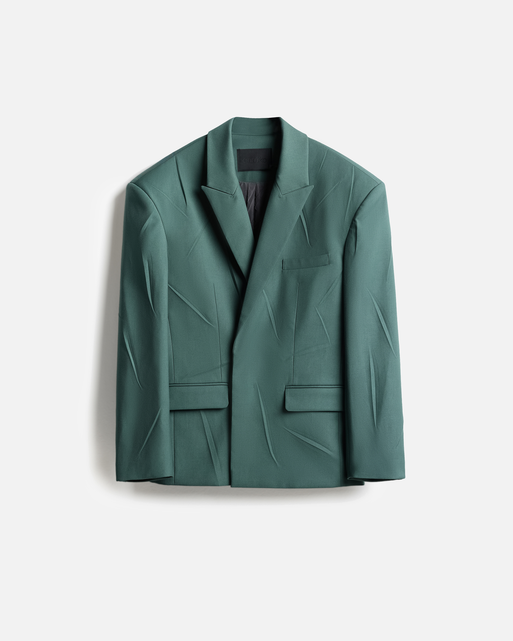 Мы видим его как объект, в котором классическая форма переосмыслена через работу с фактурой и деталями: строгая архитектура плеча, ясные линии лацканов и одновременно хаотичная, ручная пластика поверхности.