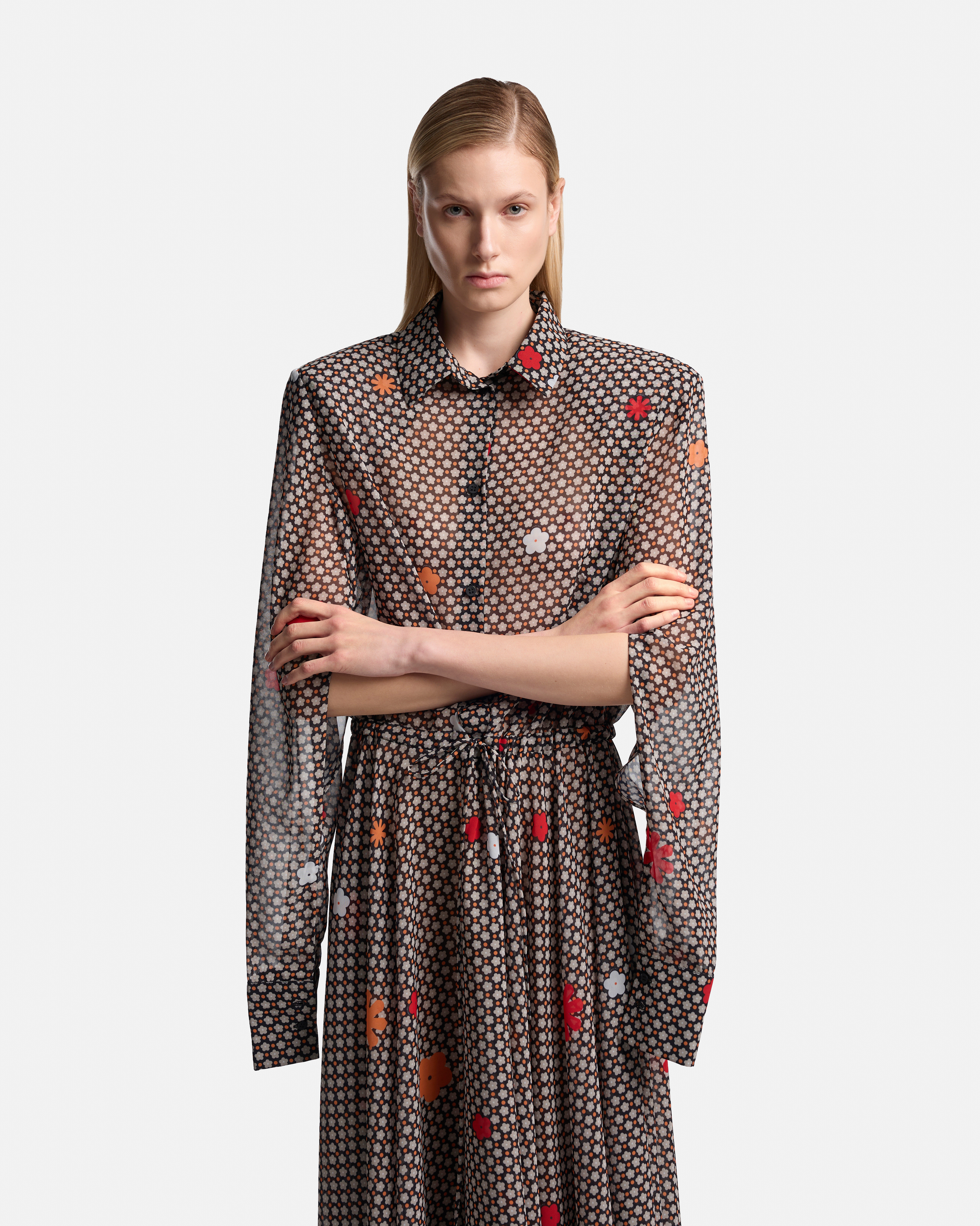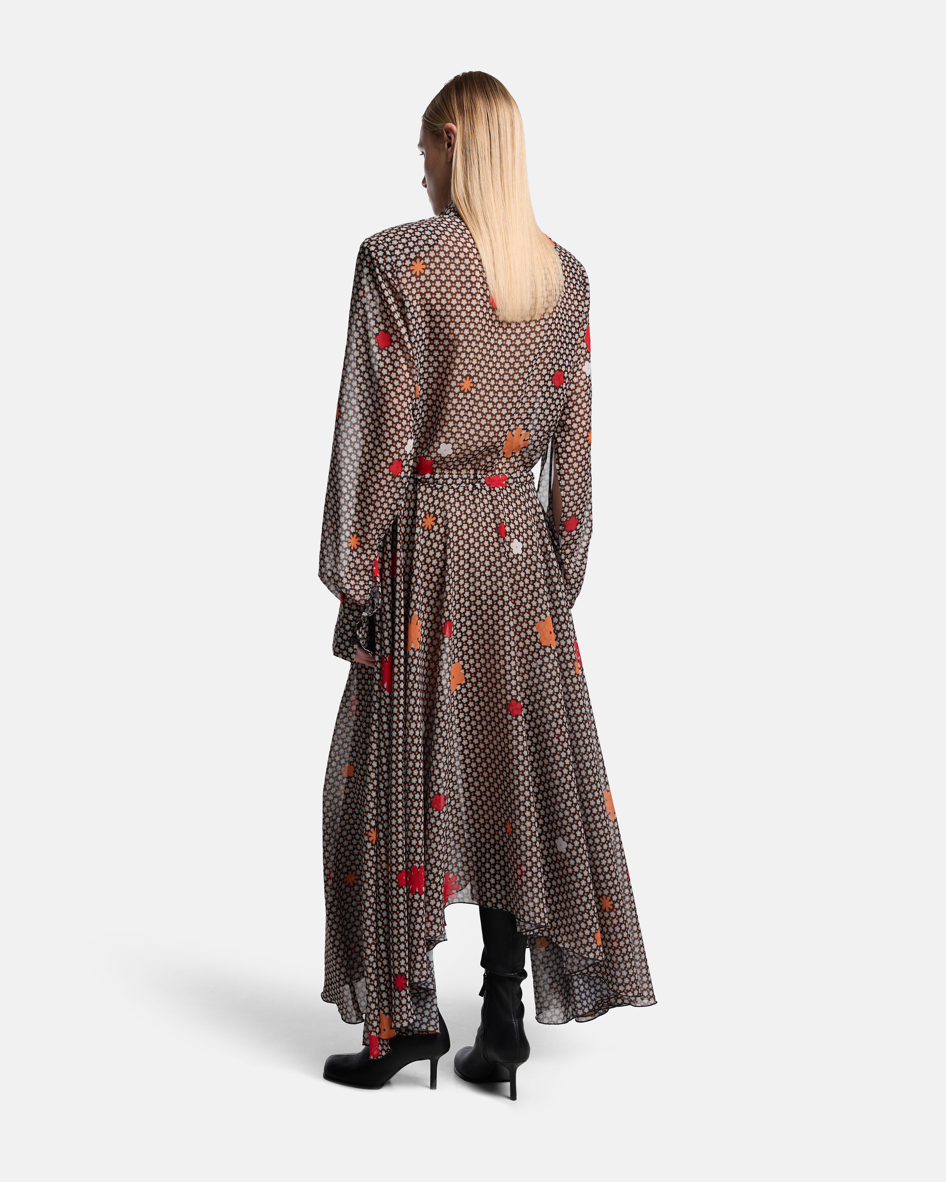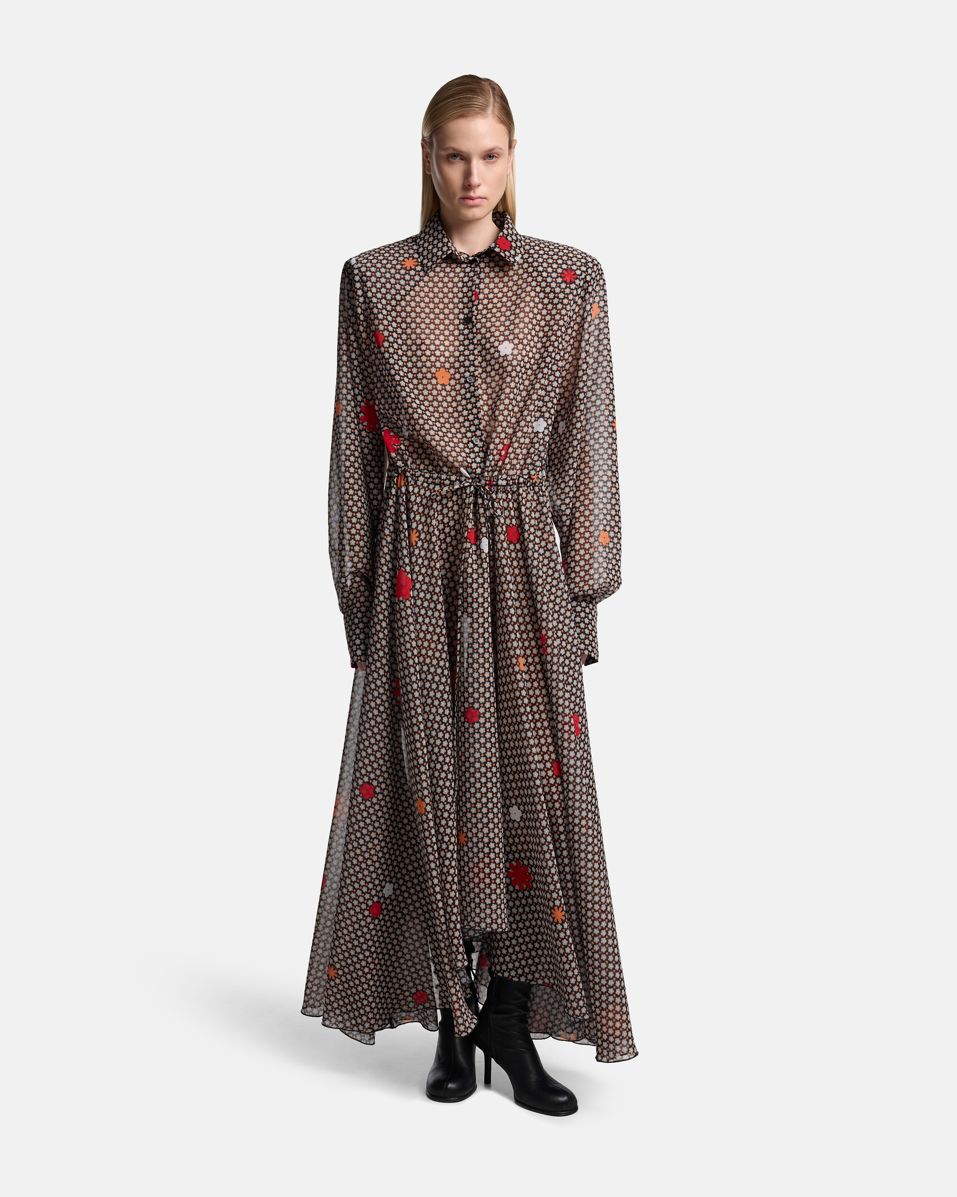 Платье выполнено из лёгкой полупрозрачной ткани с мелким принтом и акцентными цветочными элементами. Конструкция кейп: рукава раскрываются, создавая эффект накидки и усиливая движение ткани. Верх оформлен рубашечным воротником и пуговицами, струящаяся юбка формирует вытянутый силуэт. Линия талии регулируется — платье можно носить свободно или приталивать. Подплечники отстёгиваются, позволяя менять степень архитектурности образа.