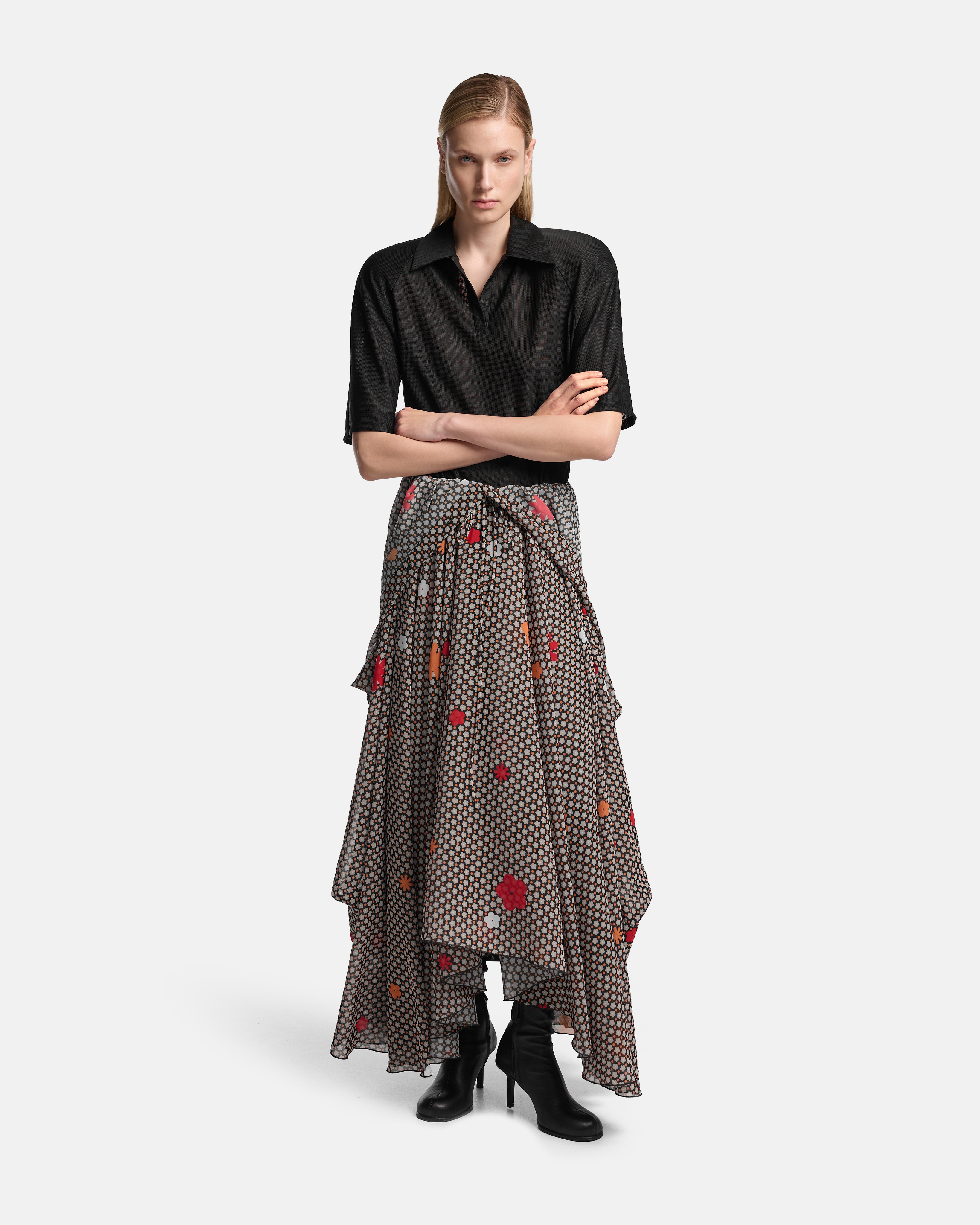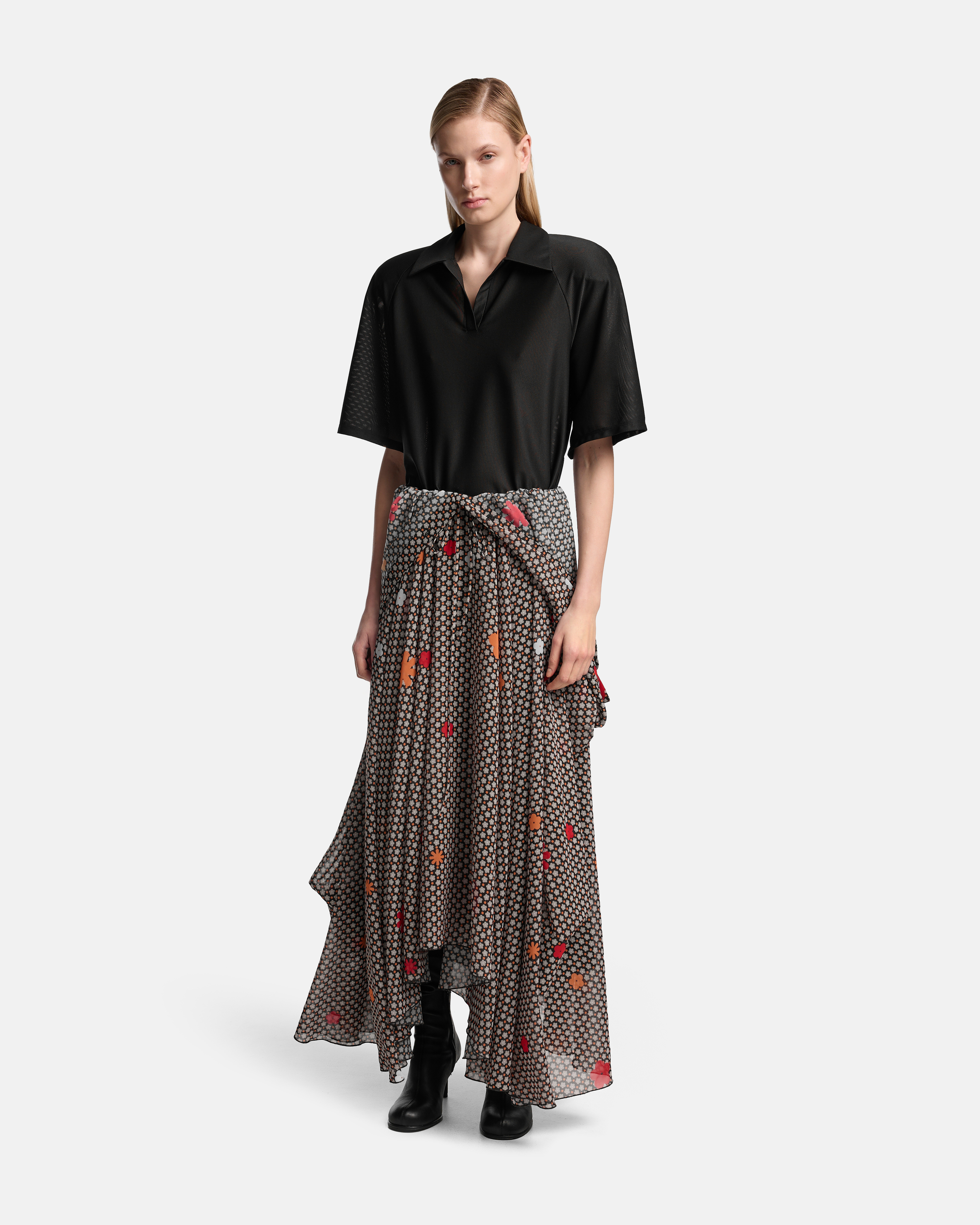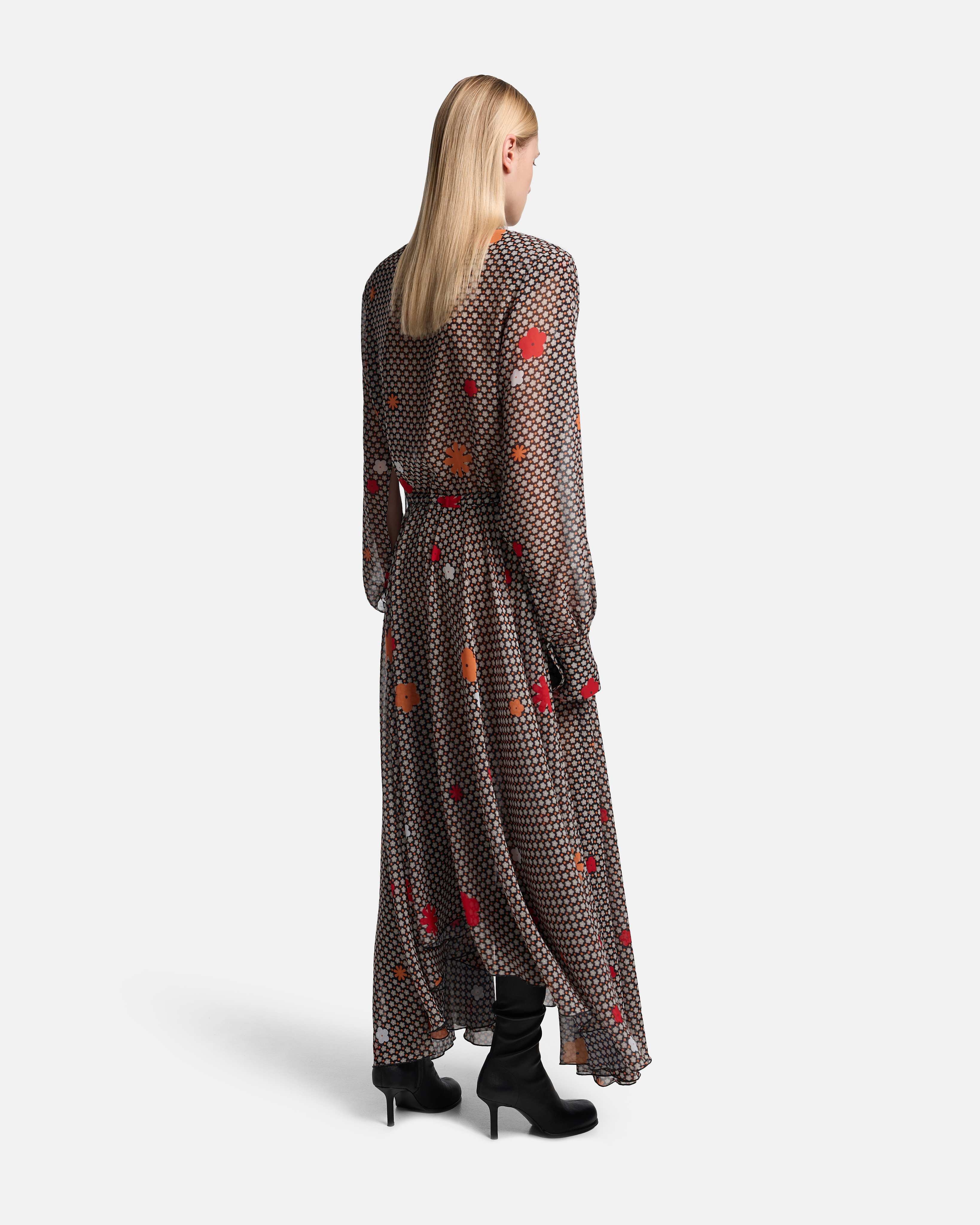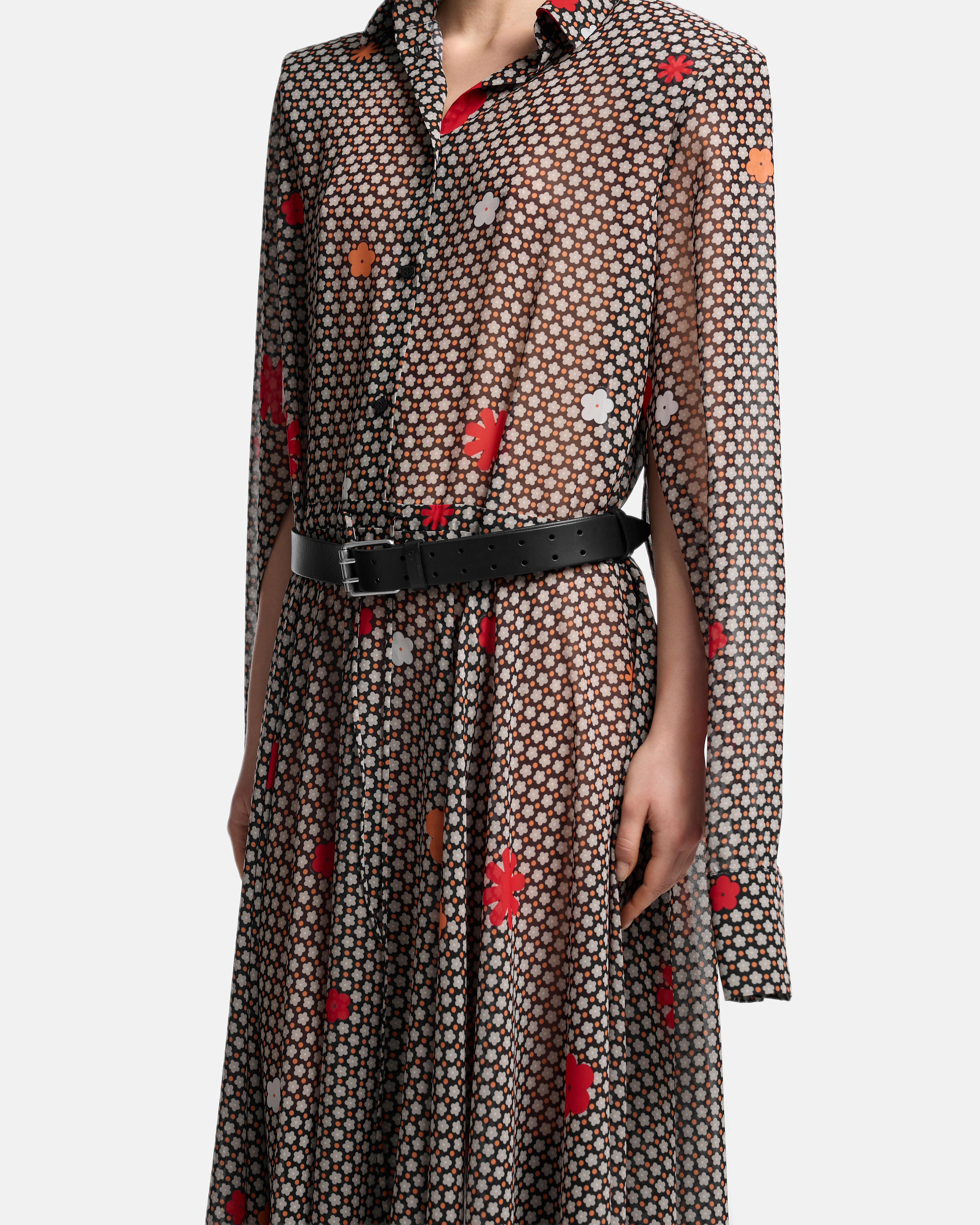 Платье выполнено из лёгкой полупрозрачной ткани с мелким принтом и акцентными цветочными элементами. Конструкция кейп: рукава раскрываются, создавая эффект накидки и усиливая движение ткани. Верх оформлен рубашечным воротником и пуговицами, струящаяся юбка формирует вытянутый силуэт. Линия талии регулируется — платье можно носить свободно или приталивать. Подплечники отстёгиваются, позволяя менять степень архитектурности образа.
