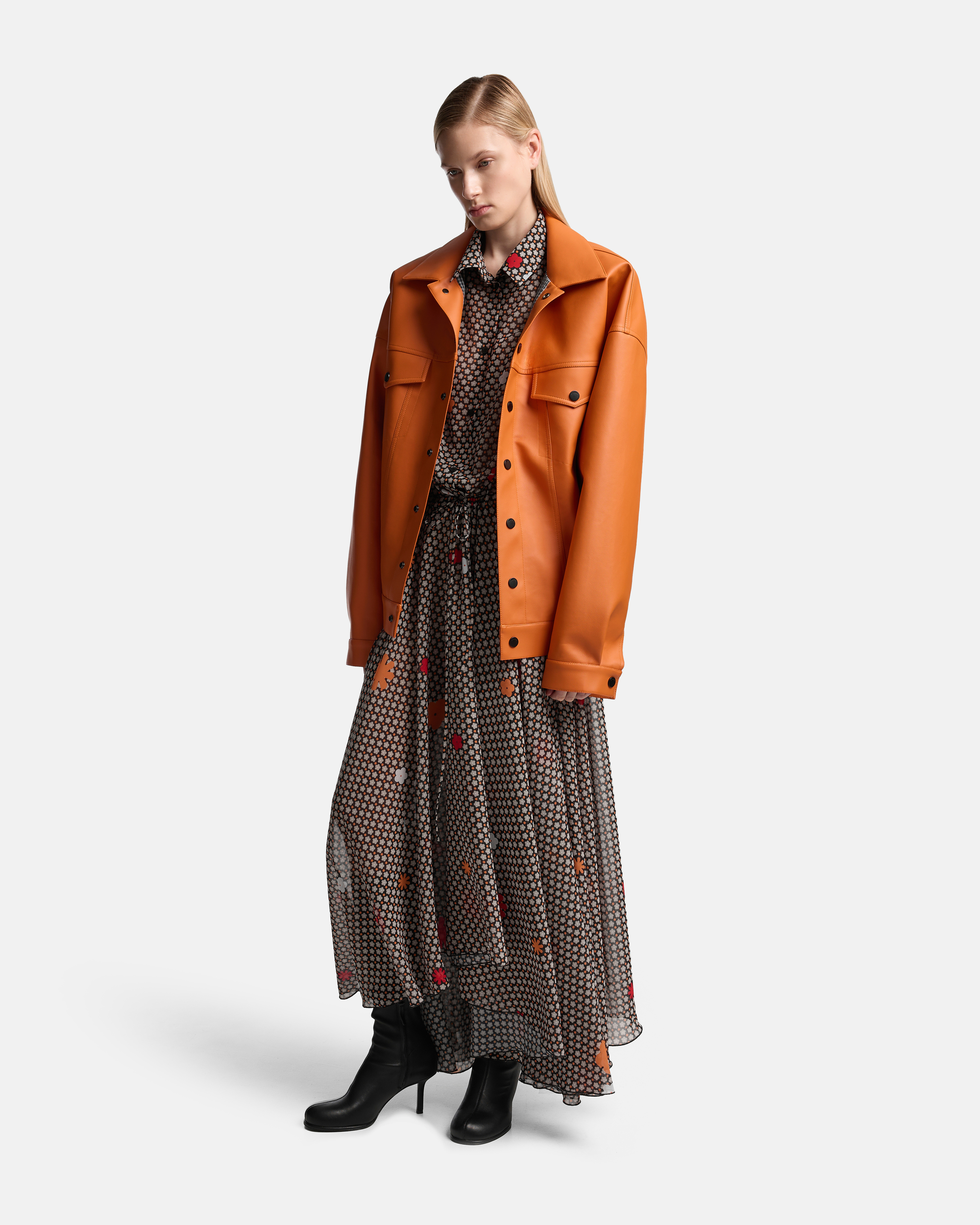 В этом сезоне мы размышляли о состоянии между привычным и ускользающим. Принт построен на повторе — как визуальный ритм дней, маршрутов и мыслей, которые возвращаются снова и снова. В глубине узора можно заметить логотип ANNUKO — он не заявлен напрямую. На этом фоне появляются цветочные акценты — как сбой в системе, эмоциональный жест, напоминание о живом. Платье становится формой этого диалога: структура и текучесть, порядок и внутренняя свобода сосуществуют в одном объекте.