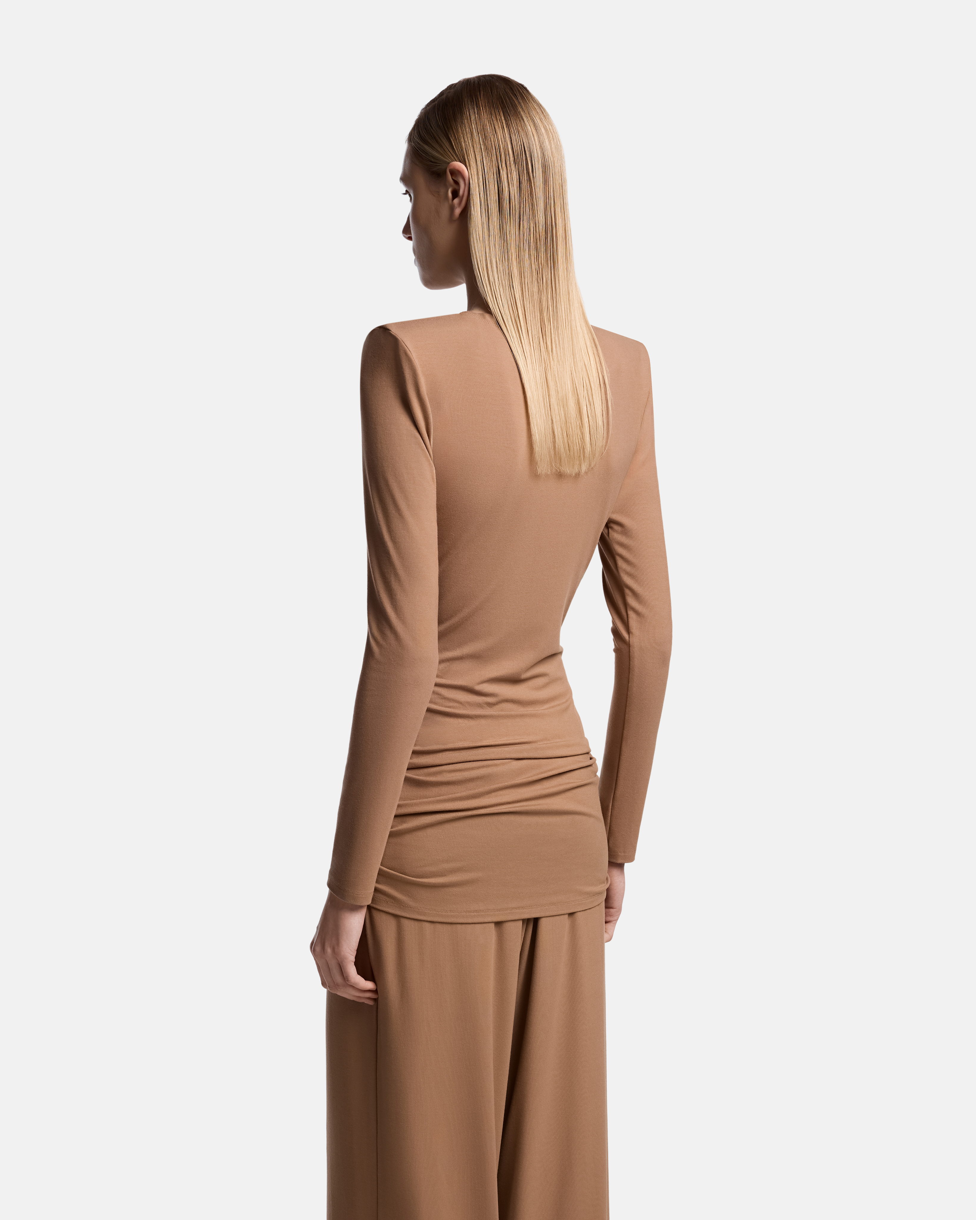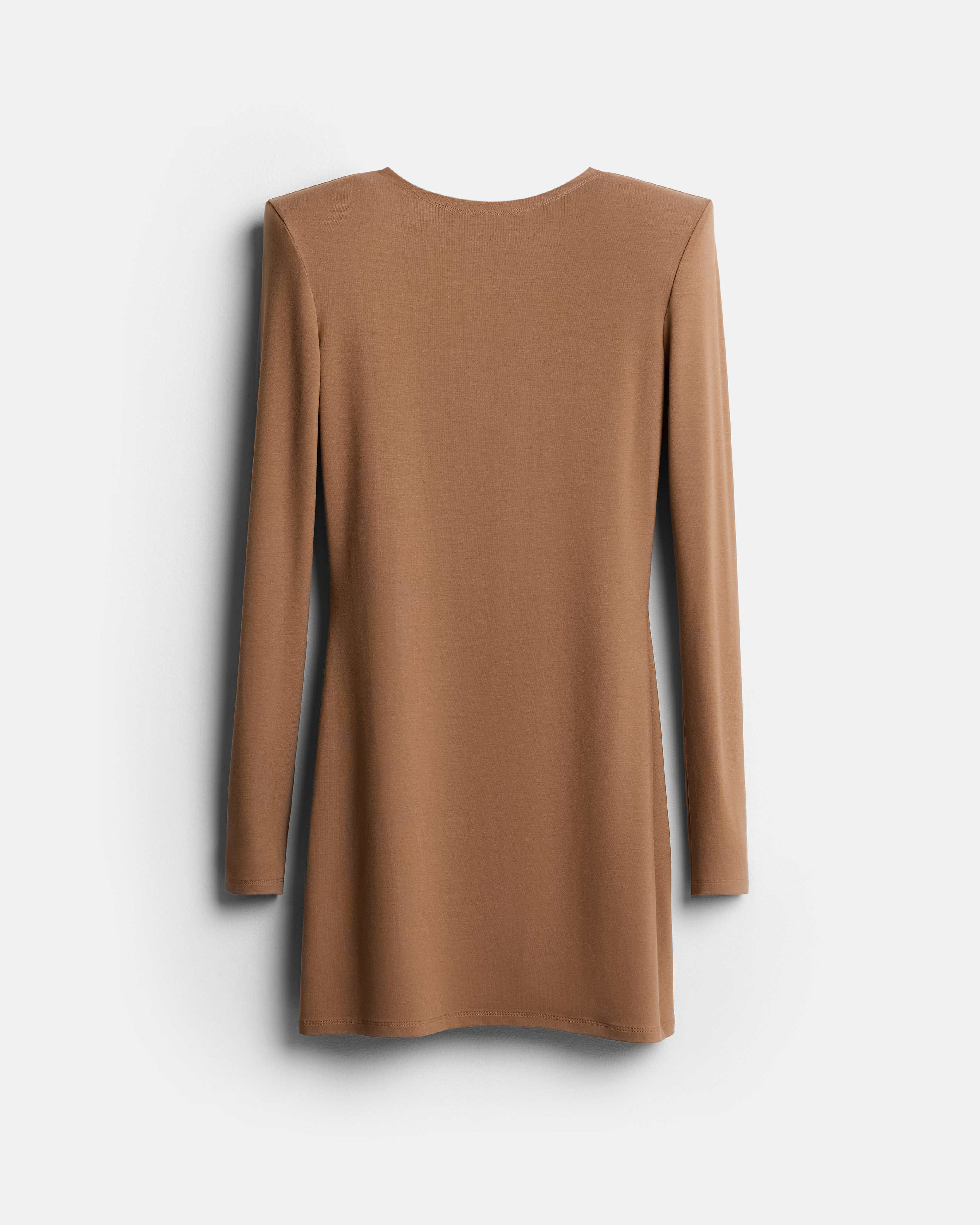Платье-лонгслив из эластичного вискозного трикотажа. Материал мягкий, тонкий и комфортный, плотно прилегает к телу и формирует собранный силуэт.