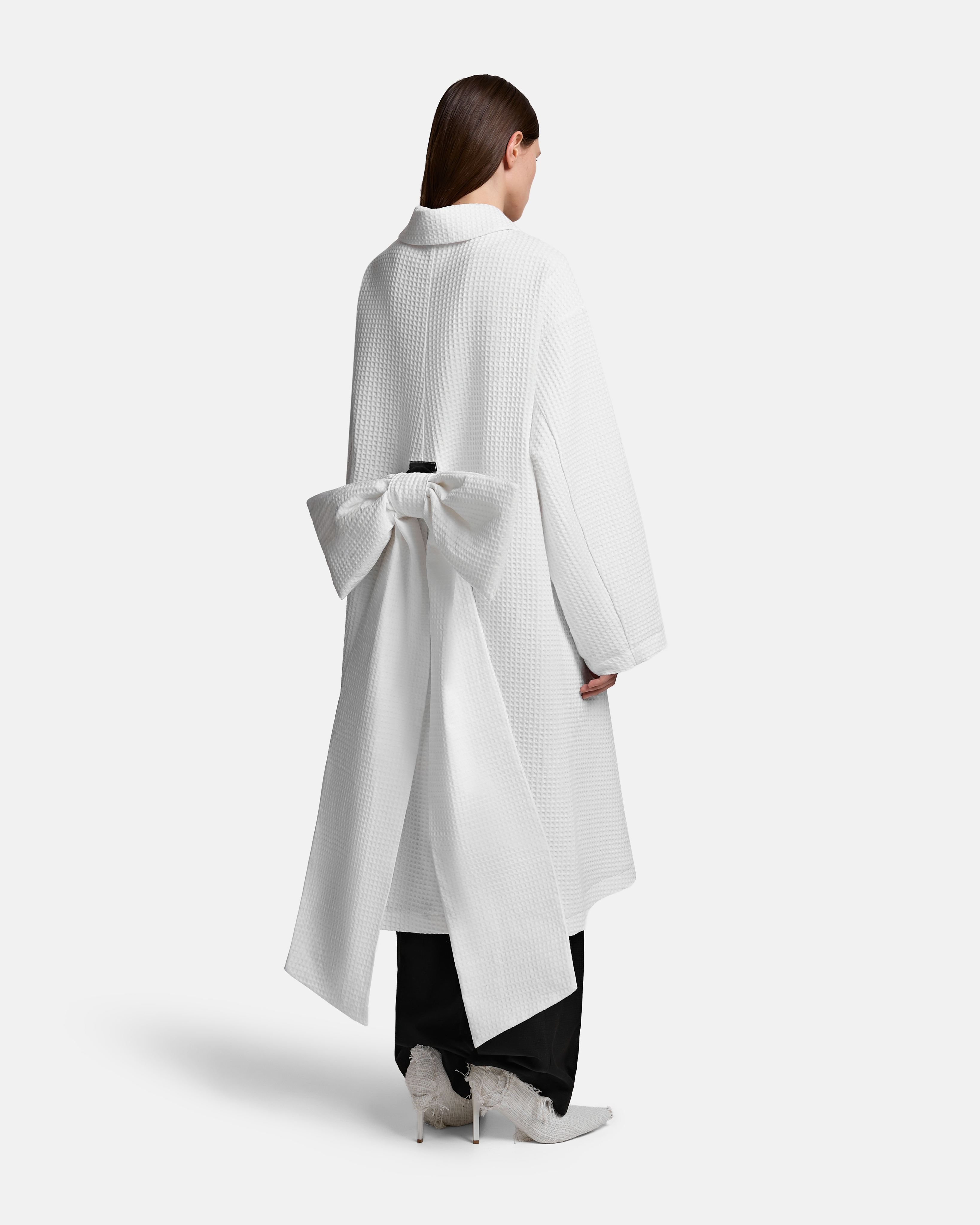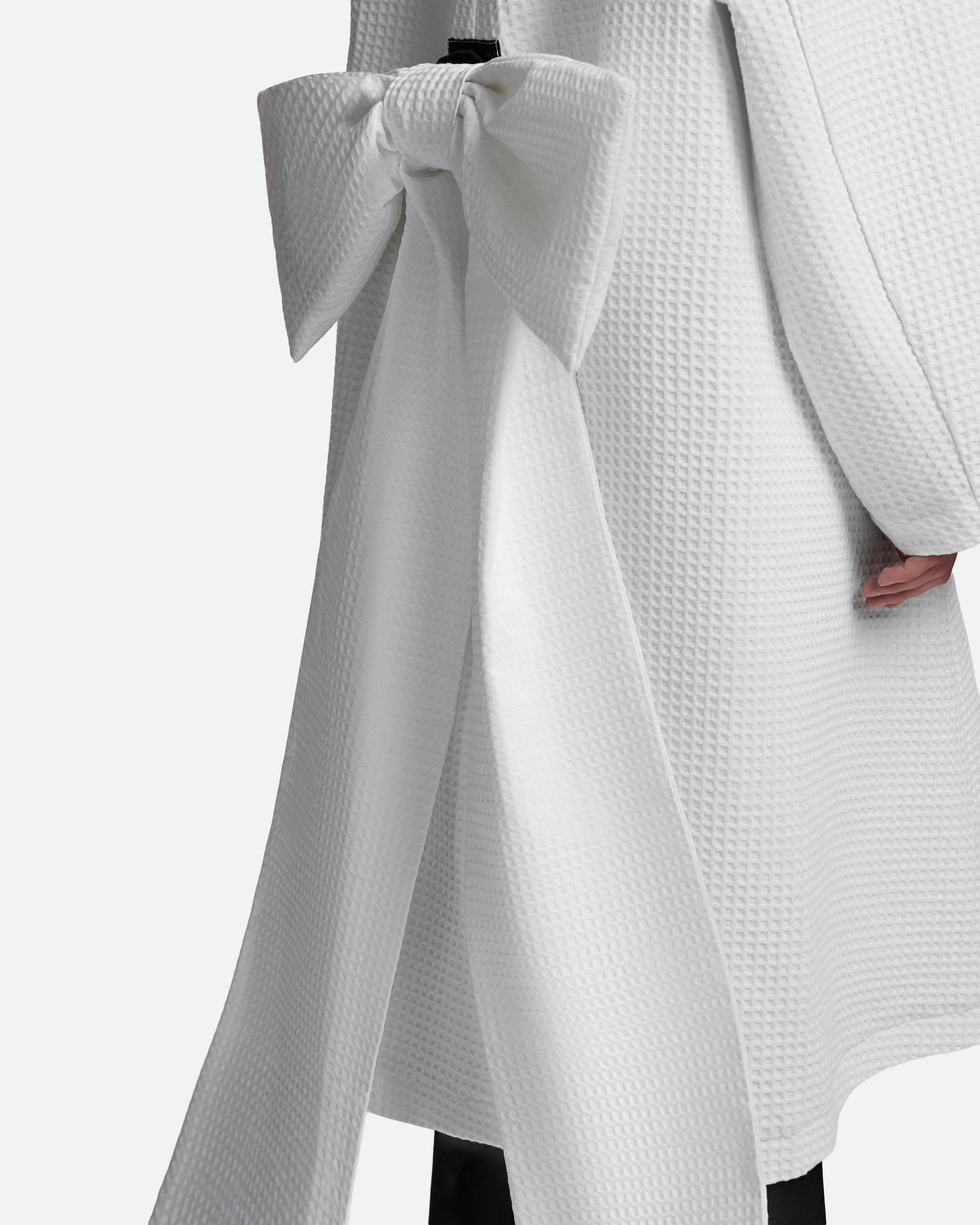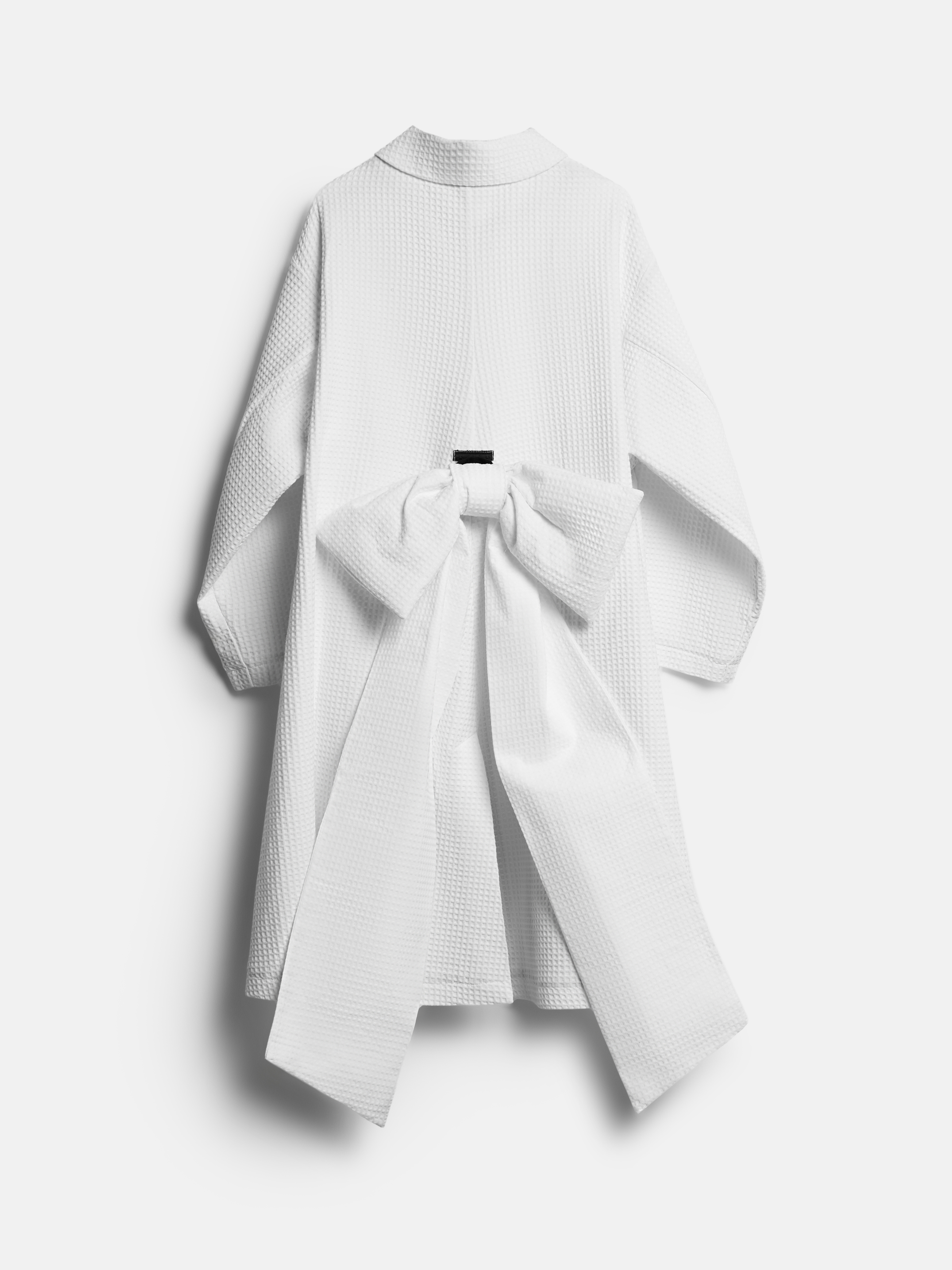 Платье двустороннее и живёт в двух состояниях: абсолютно белая или белая с чёрной контрастной обработкой по краю. На спинке — крепление для съёмного банта: деталь из «языка» белья, который мы часто цитируем. Есть бельевая застёжка — её можно застегнуть, чтобы сделать силуэт приталенным.