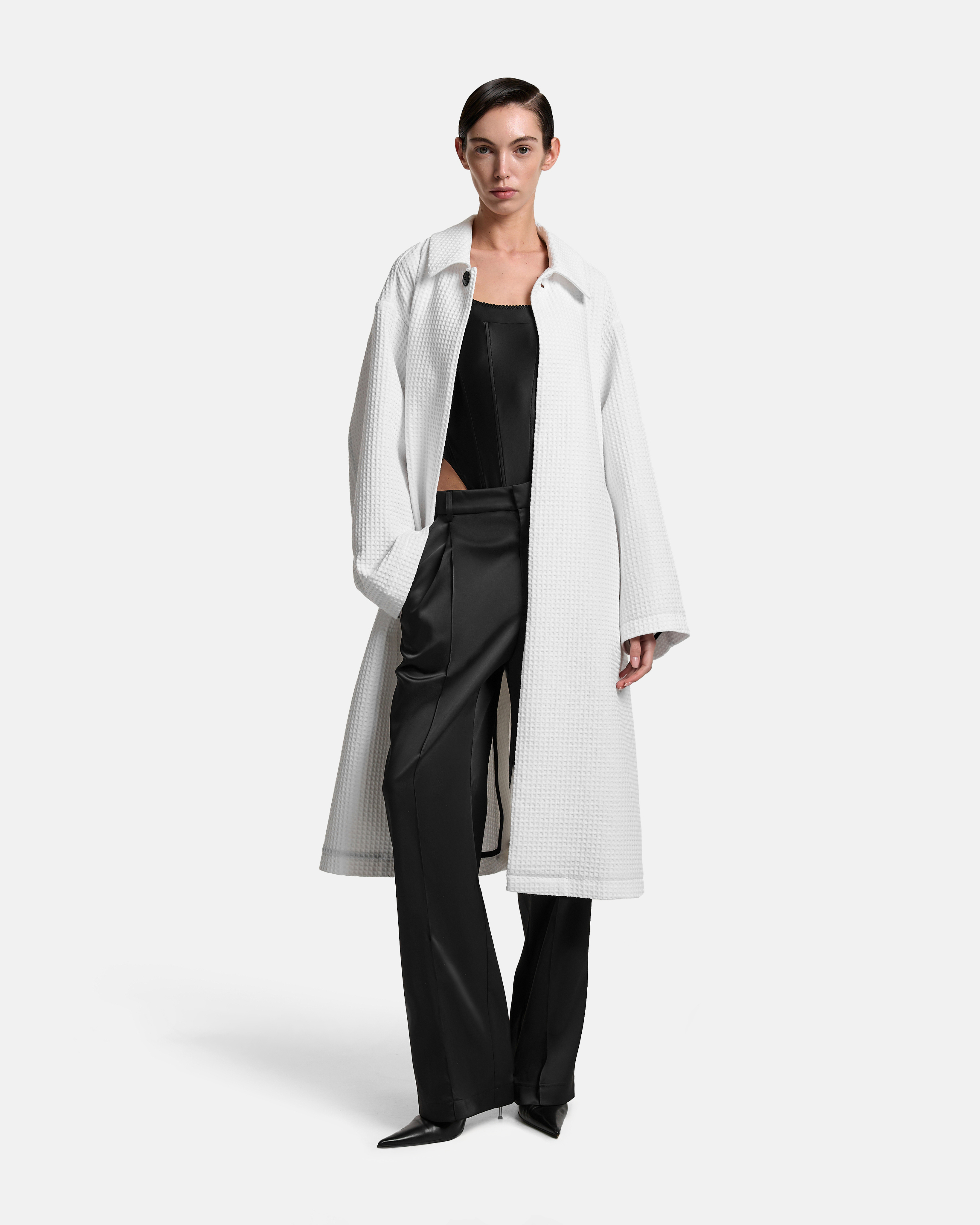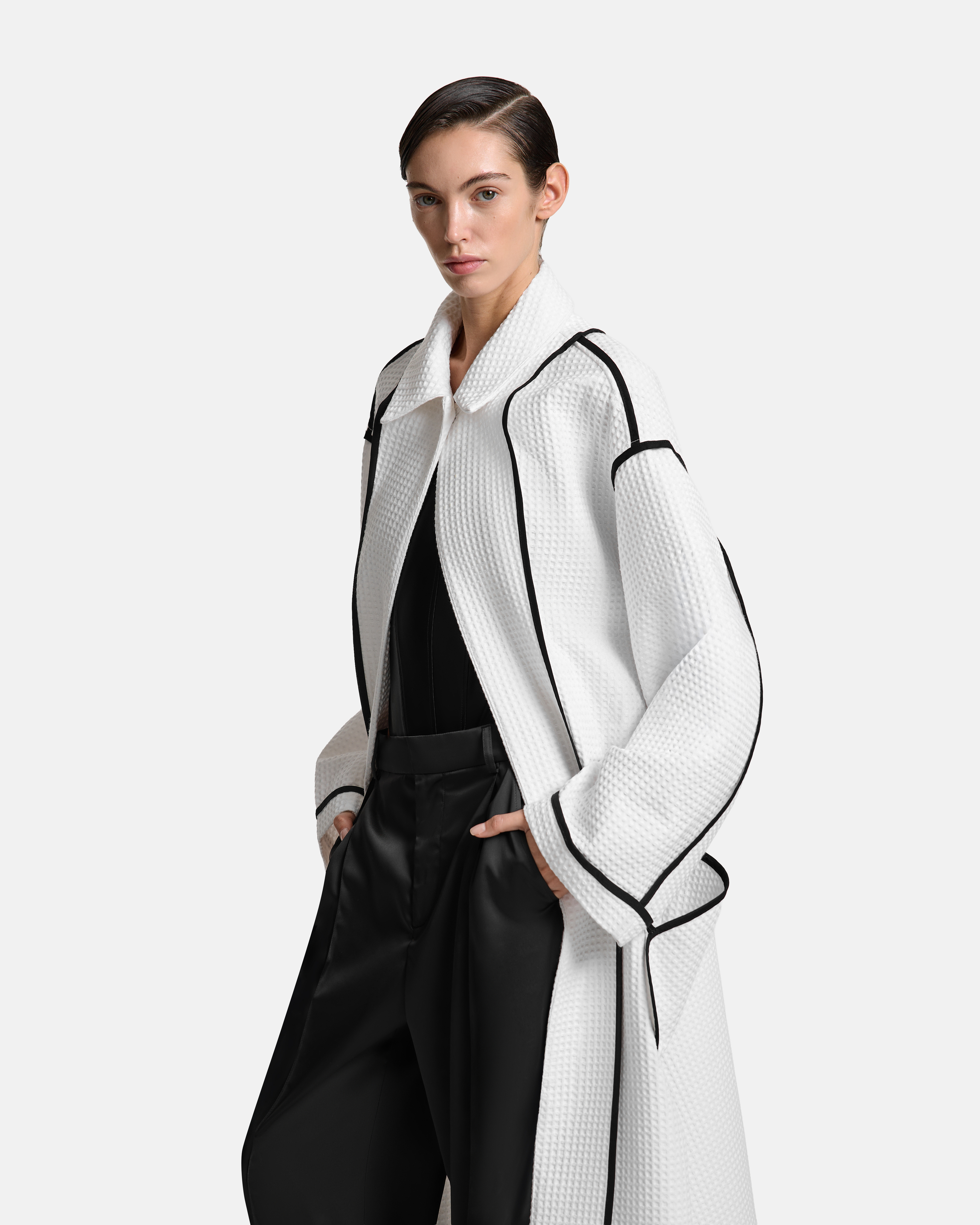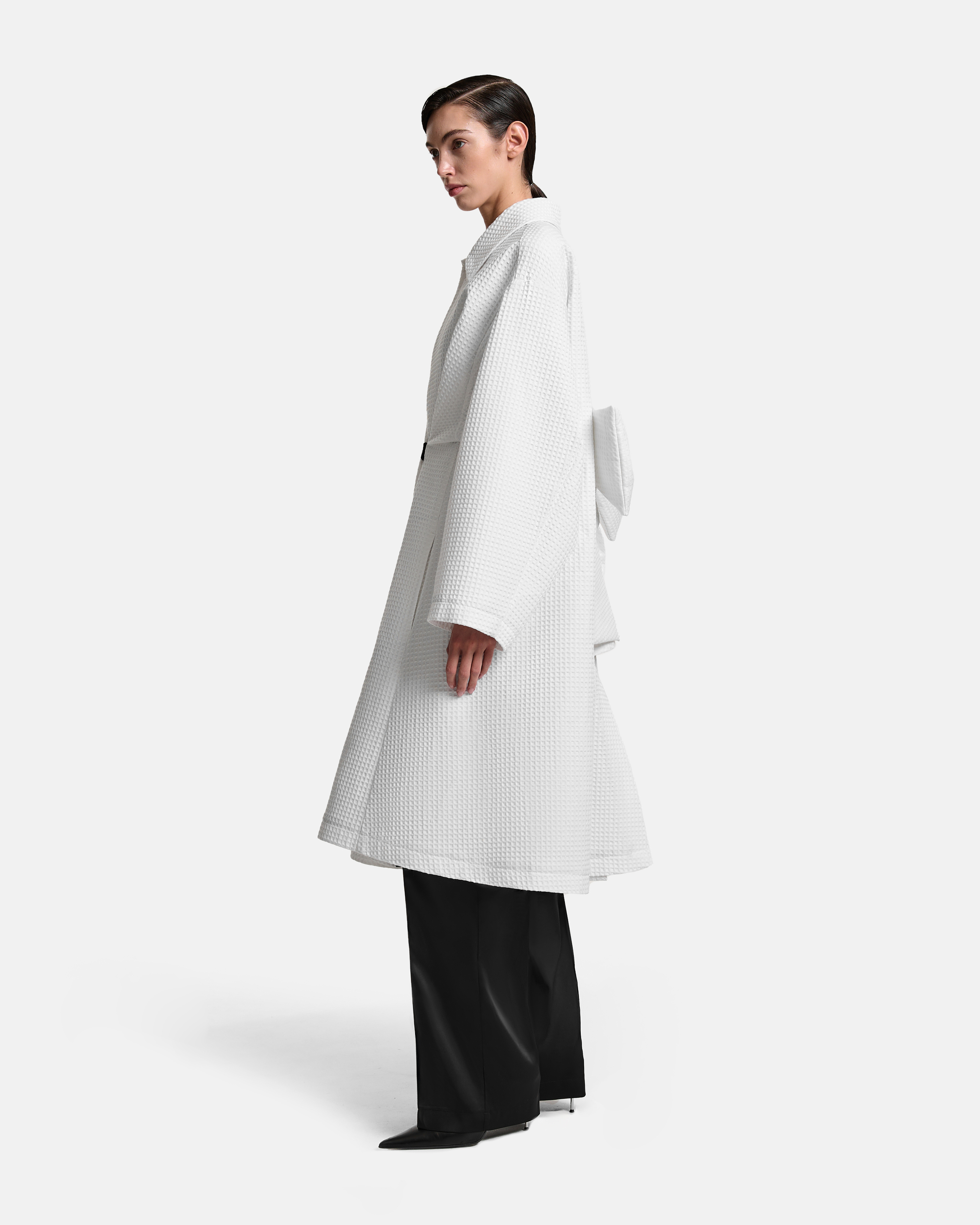 Платье двустороннее и живёт в двух состояниях: абсолютно белая или белая с чёрной контрастной обработкой по краю. На спинке — крепление для съёмного банта: деталь из «языка» белья, который мы часто цитируем. Есть бельевая застёжка — её можно застегнуть, чтобы сделать силуэт приталенным.