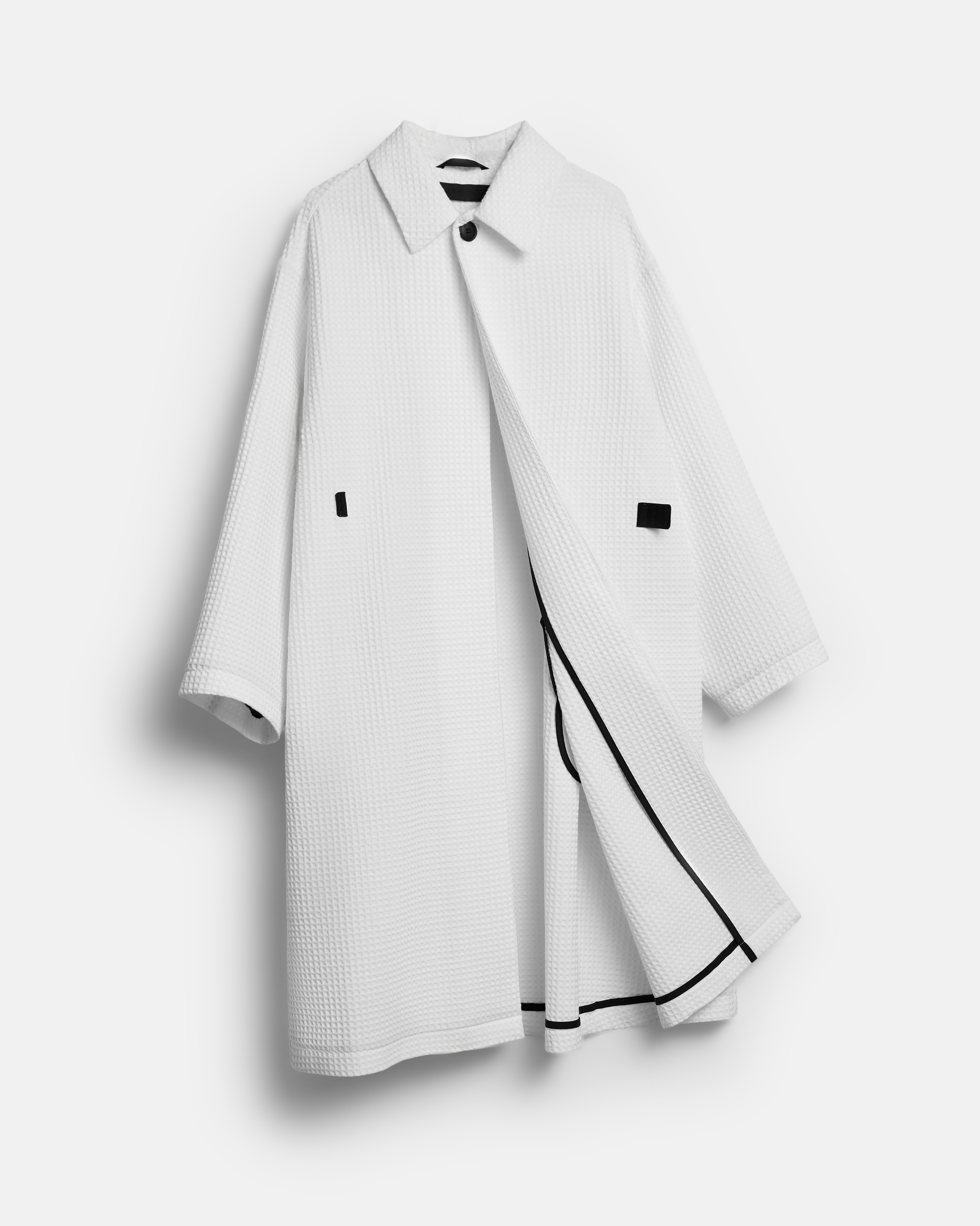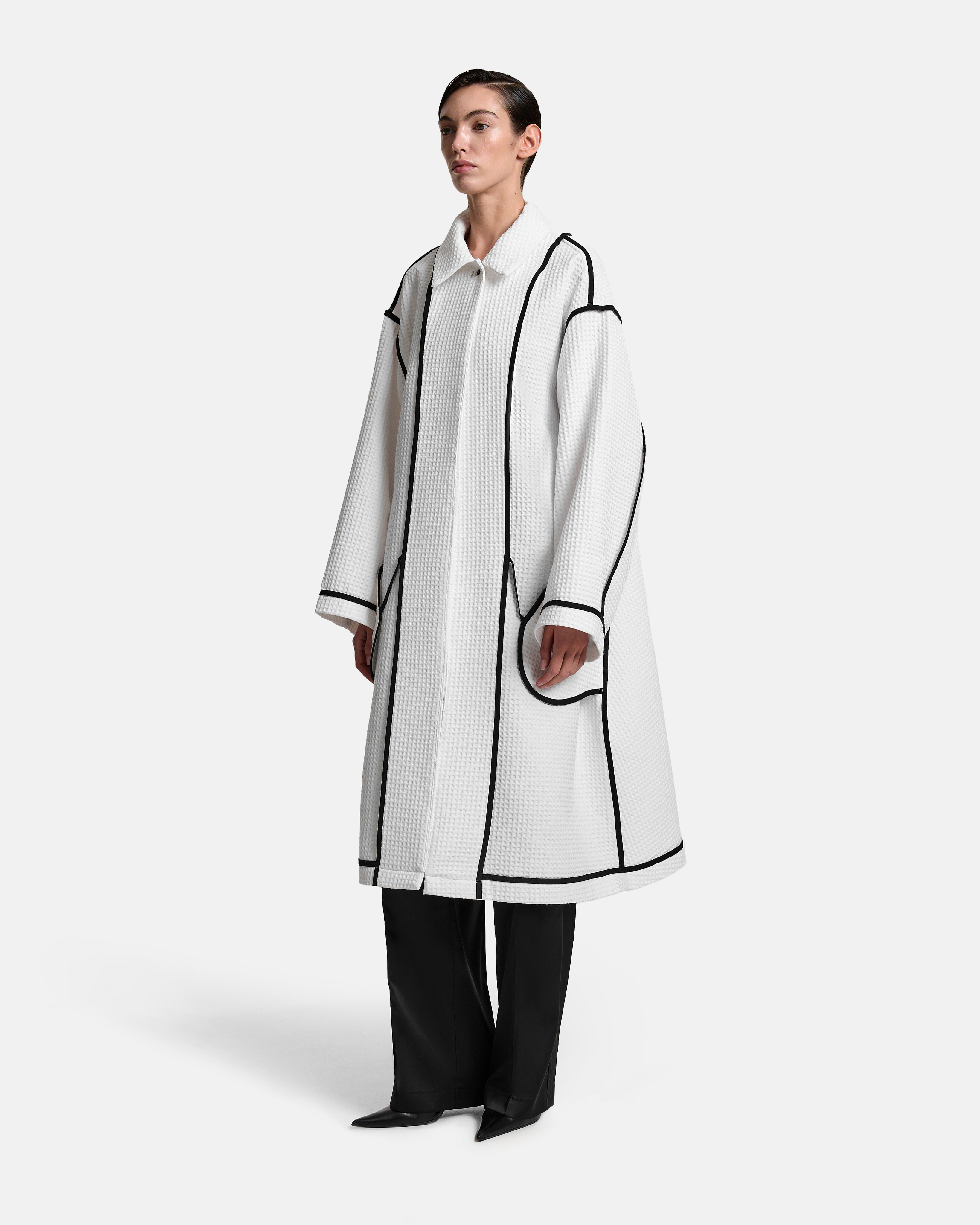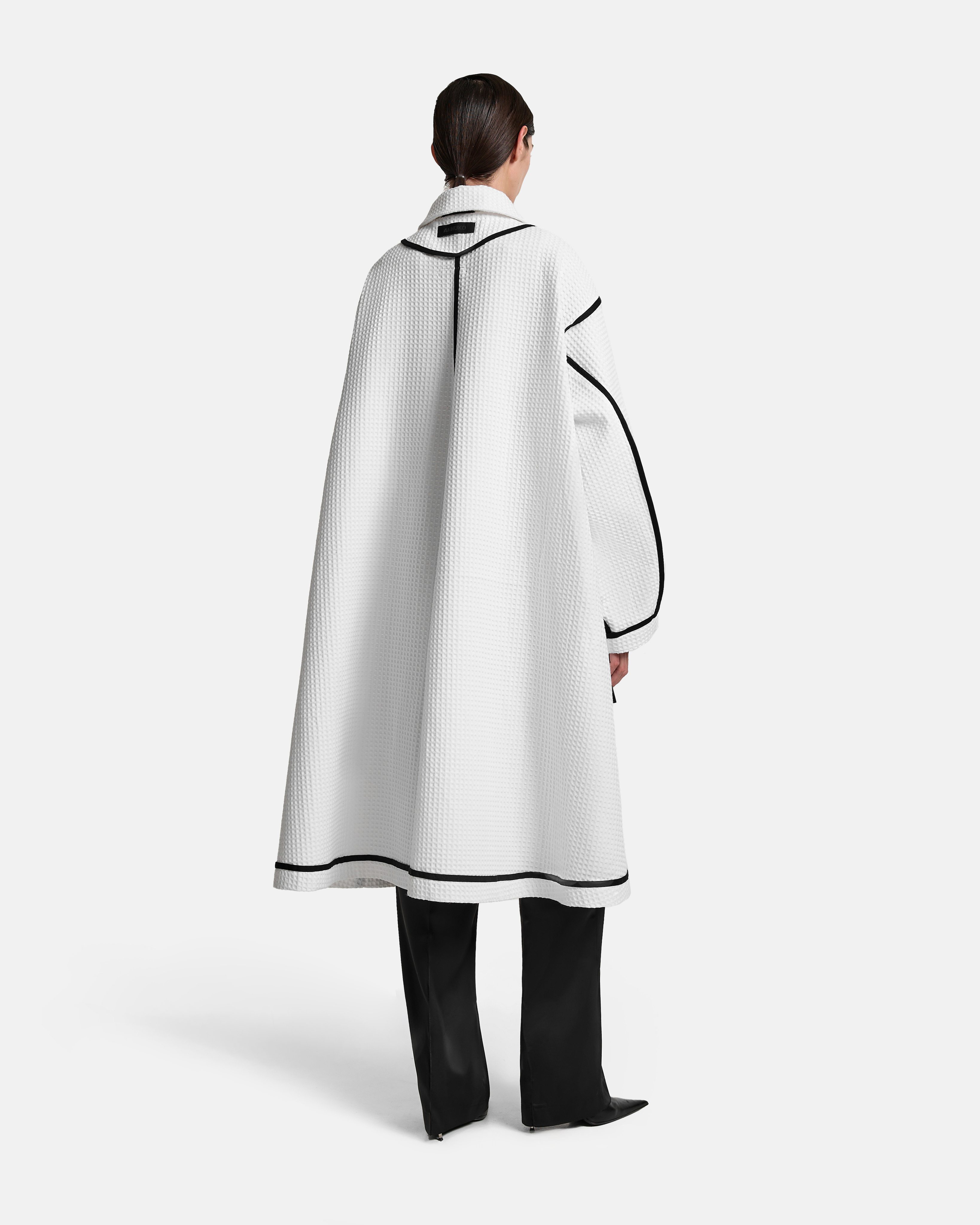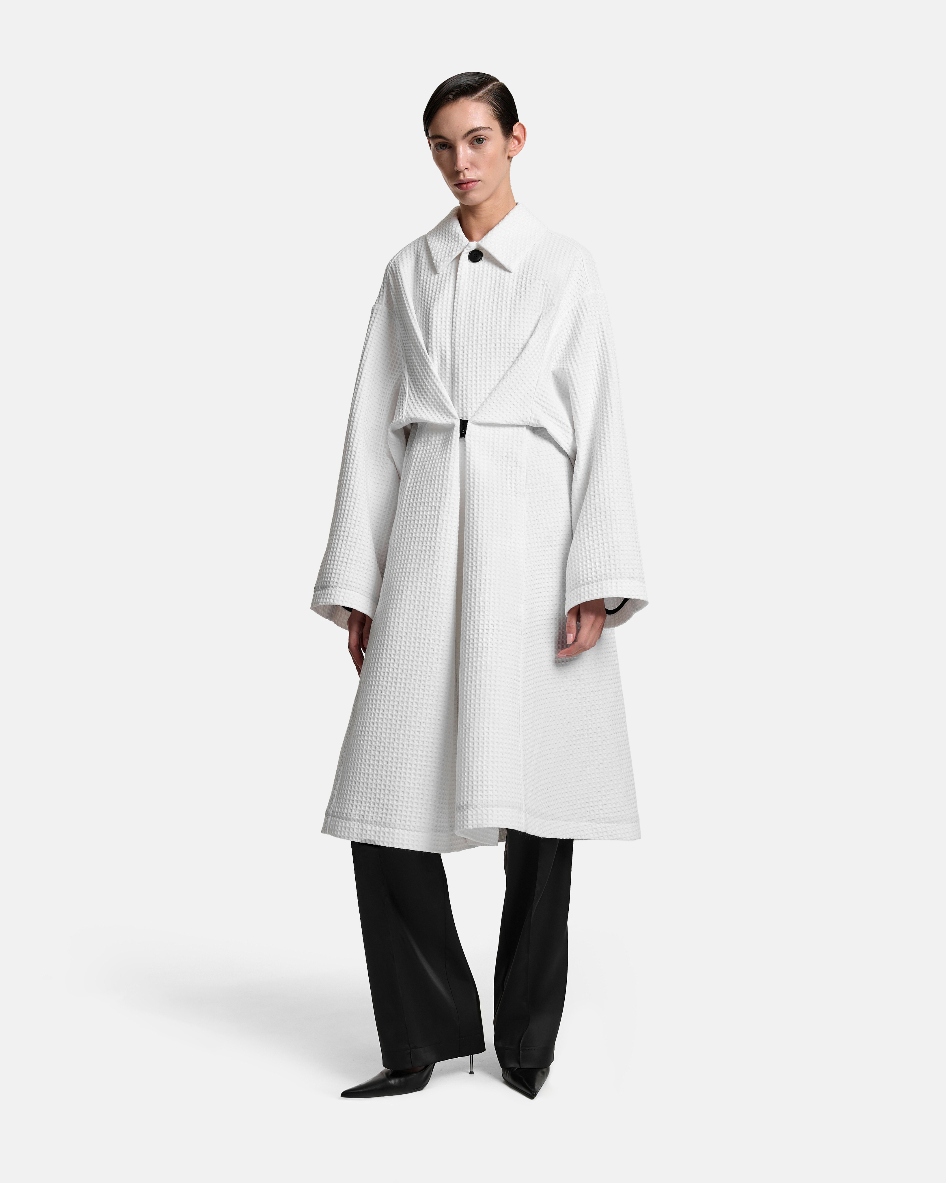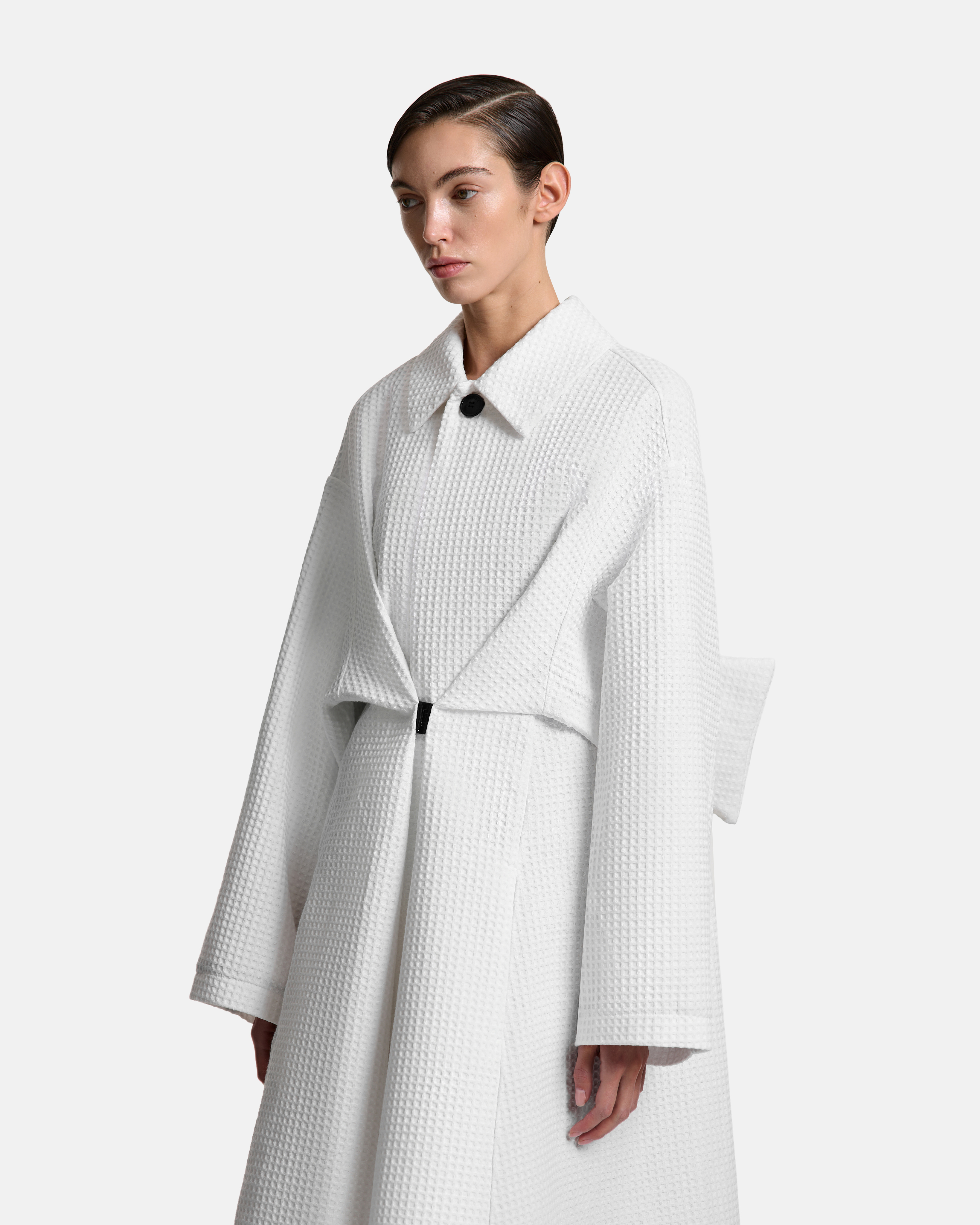 Мы взяли плащ и перевели его в плоскость платья: объёмный А‑силуэт со спущенным плечом, свободный рукав, длина ниже колена. Рубашечный воротник и лаконичная центральная застёжка с единственной видимой пуговицей у горловины — всё максимально чисто, фактурная ткань держит форму.