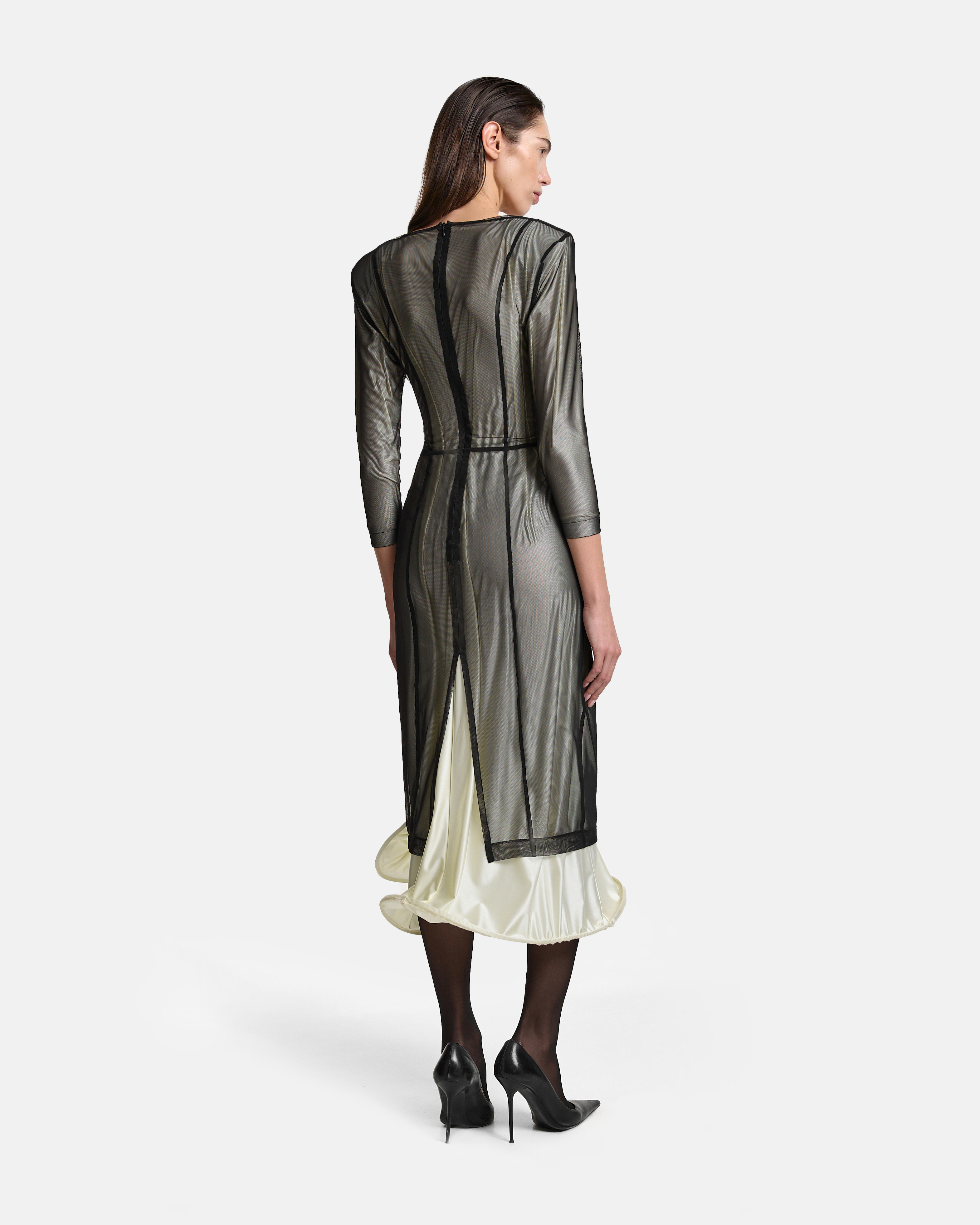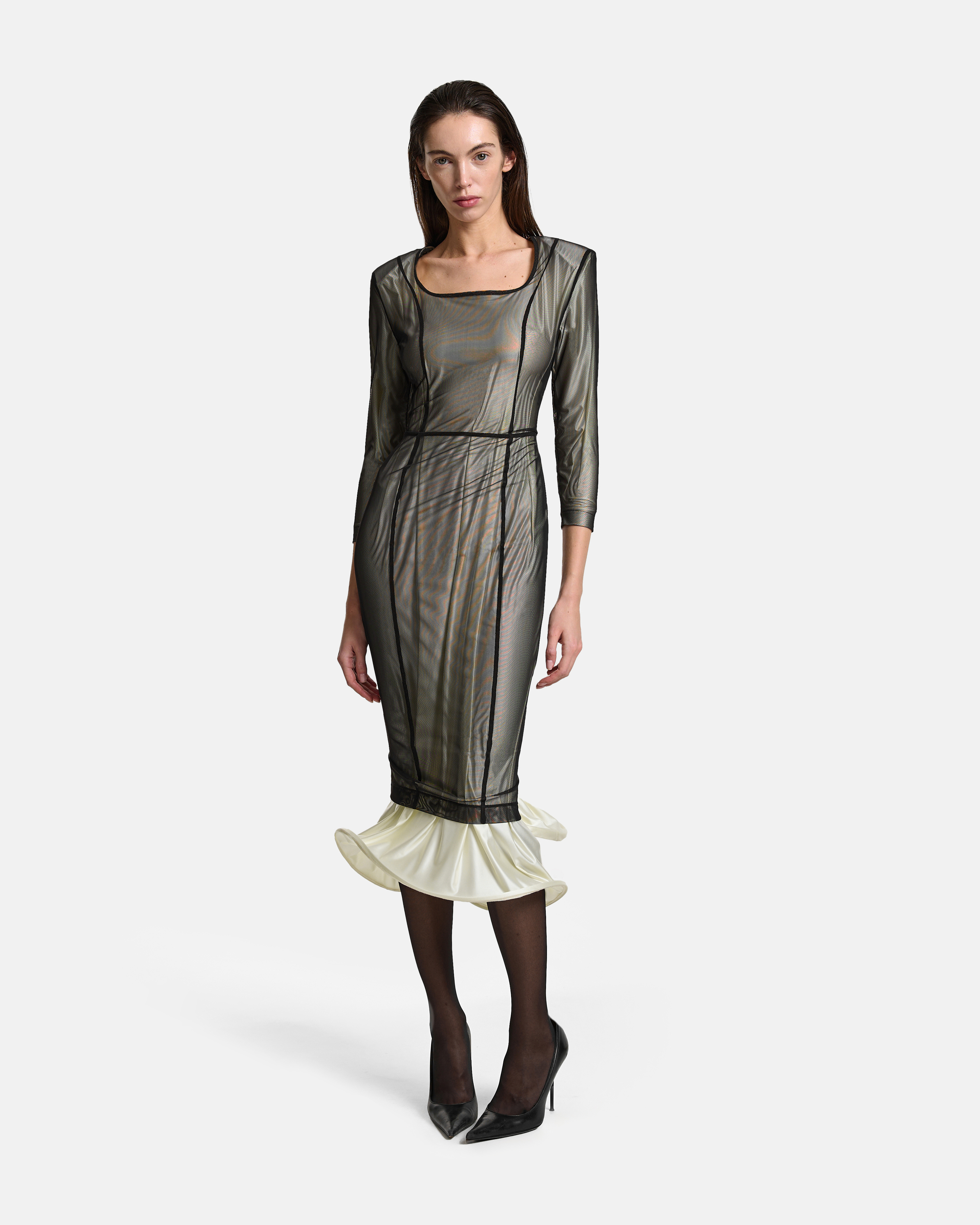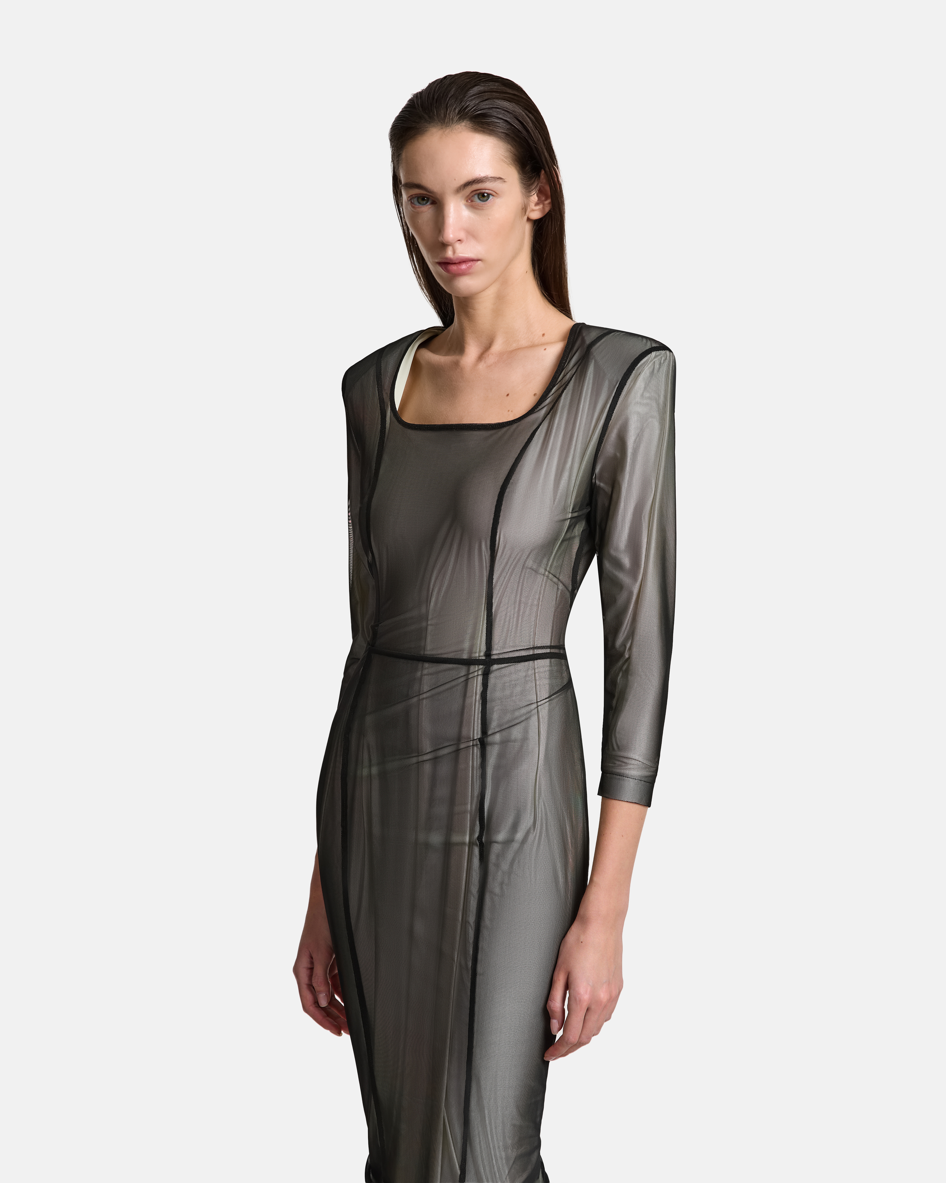 Нижний слой из гладкого бифлекса будто «запечатан» под полупрозрачной сеткой: свет скользит по бифлексу, а сверху остаётся графический контур с открытыми кантами швов. Силуэт прямой, длина миди, квадратный вырез и рукав 3/4 подчёркивают архитектуру верха; по талии и по переду проходят направляющие линии, собирающие форму.
