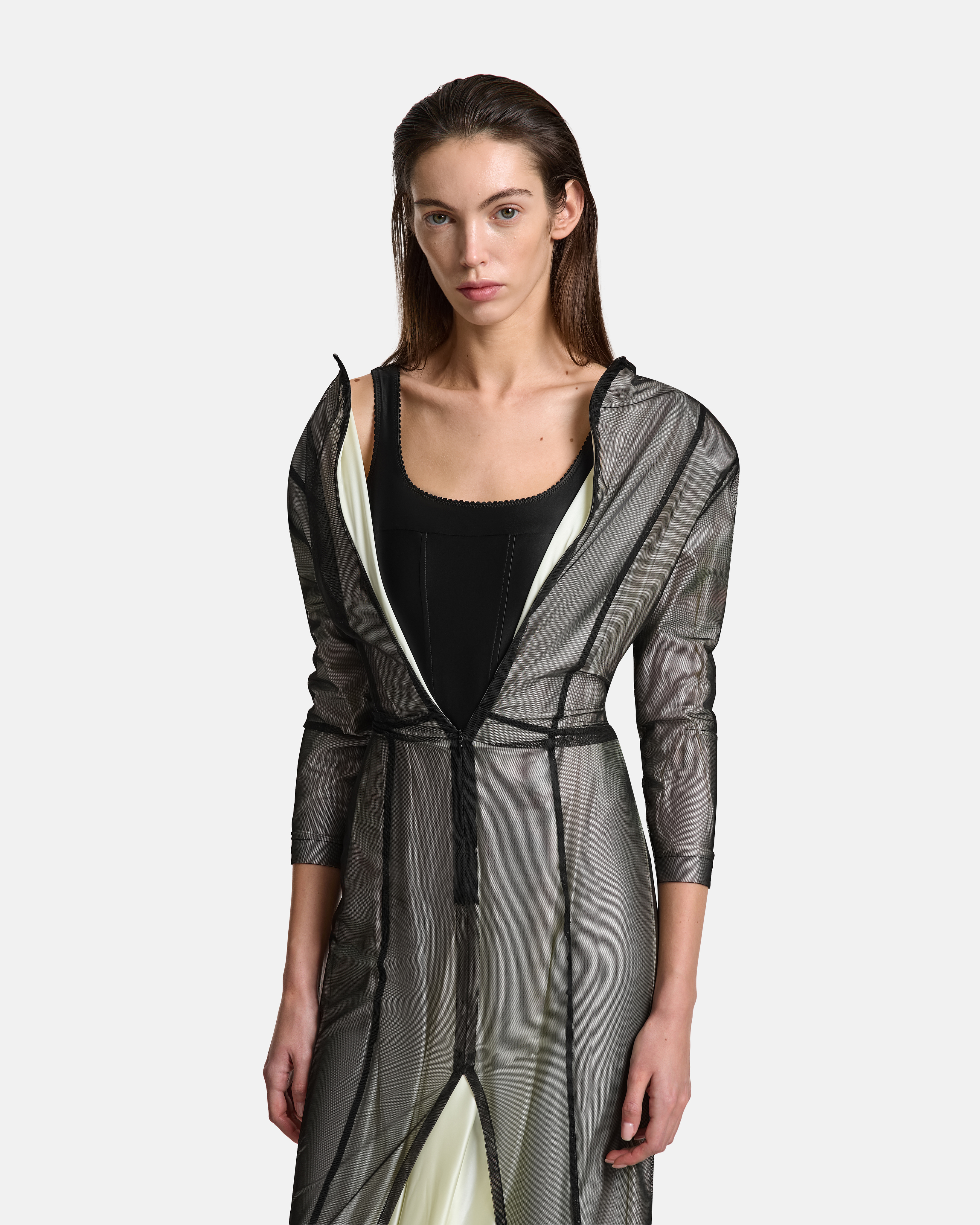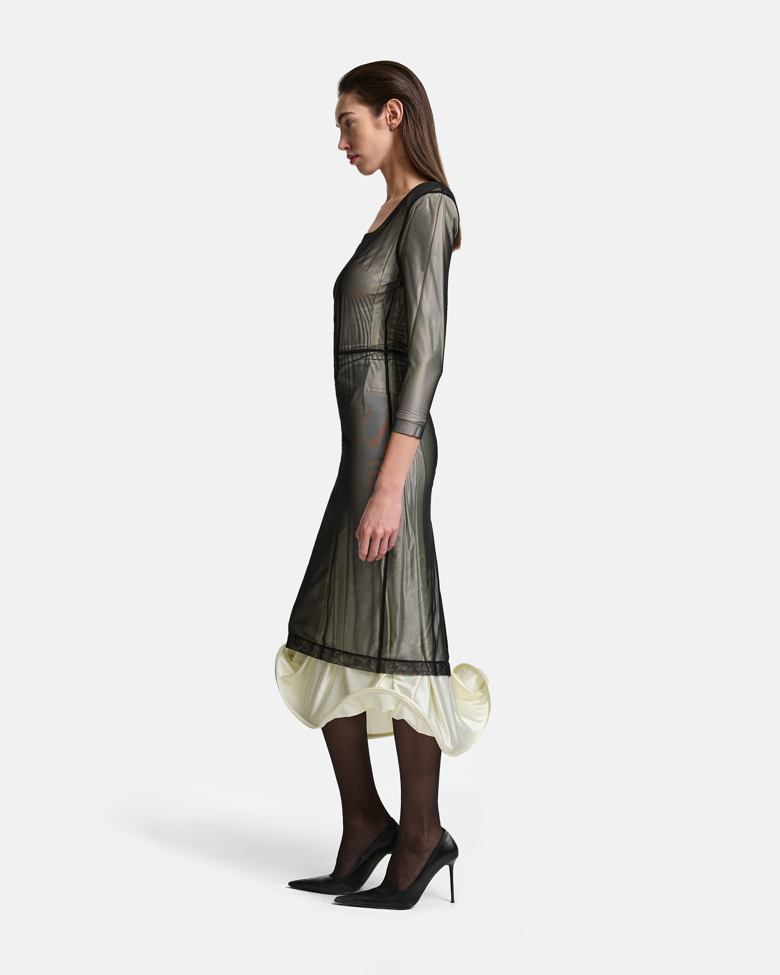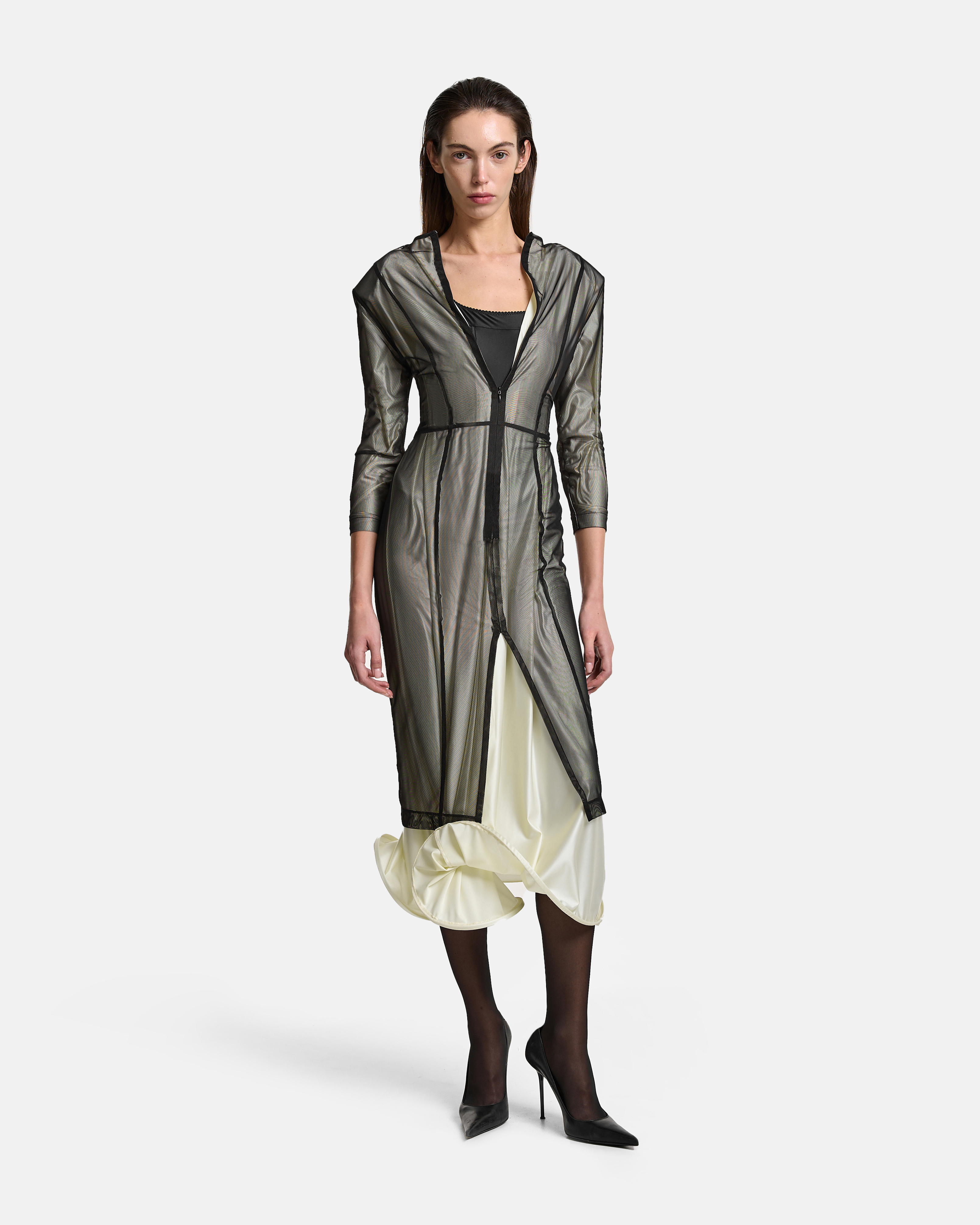 Нижний слой из гладкого бифлекса будто «запечатан» под полупрозрачной сеткой: свет скользит по бифлексу, а сверху остаётся графический контур с открытыми кантами швов. Силуэт прямой, длина миди, квадратный вырез и рукав 3/4 подчёркивают архитектуру верха; по талии и по переду проходят направляющие линии, собирающие форму.