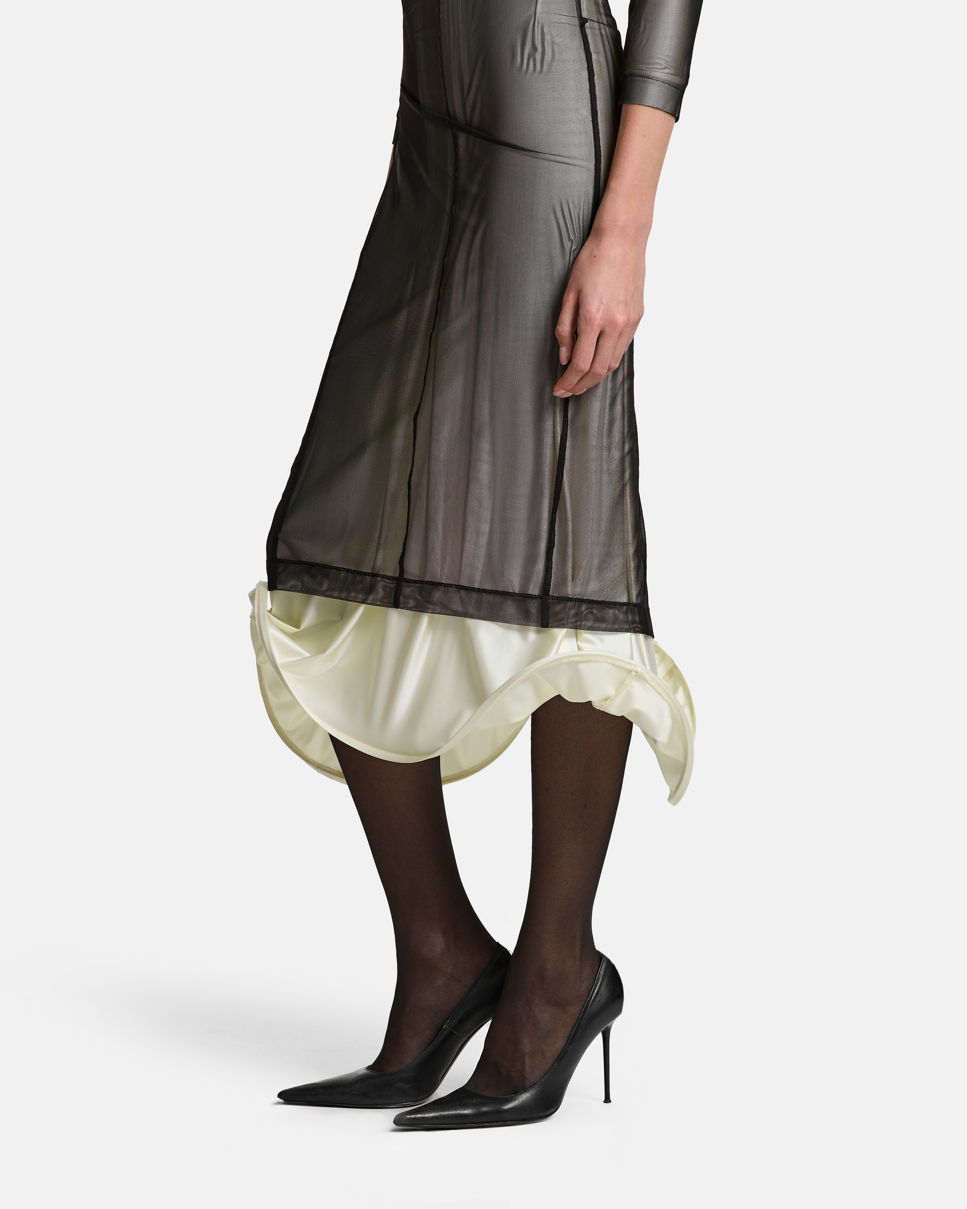 По низу юбки встроен тонкий обруч — он формирует устойчивые воланы, благодаря чему подол живёт собственной пластикой. На сетчатом слое сзади выполнена шлица для шага.
