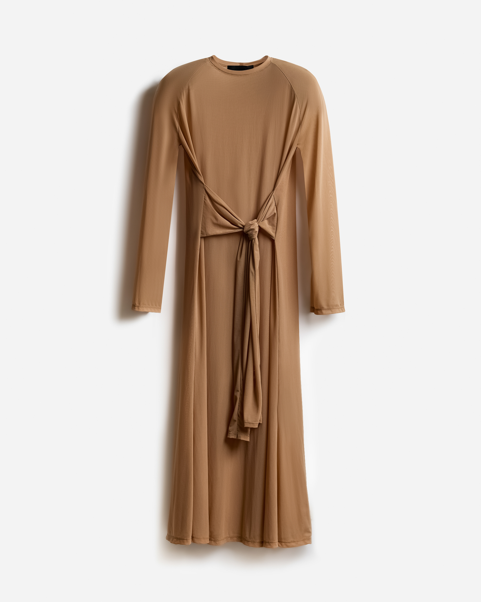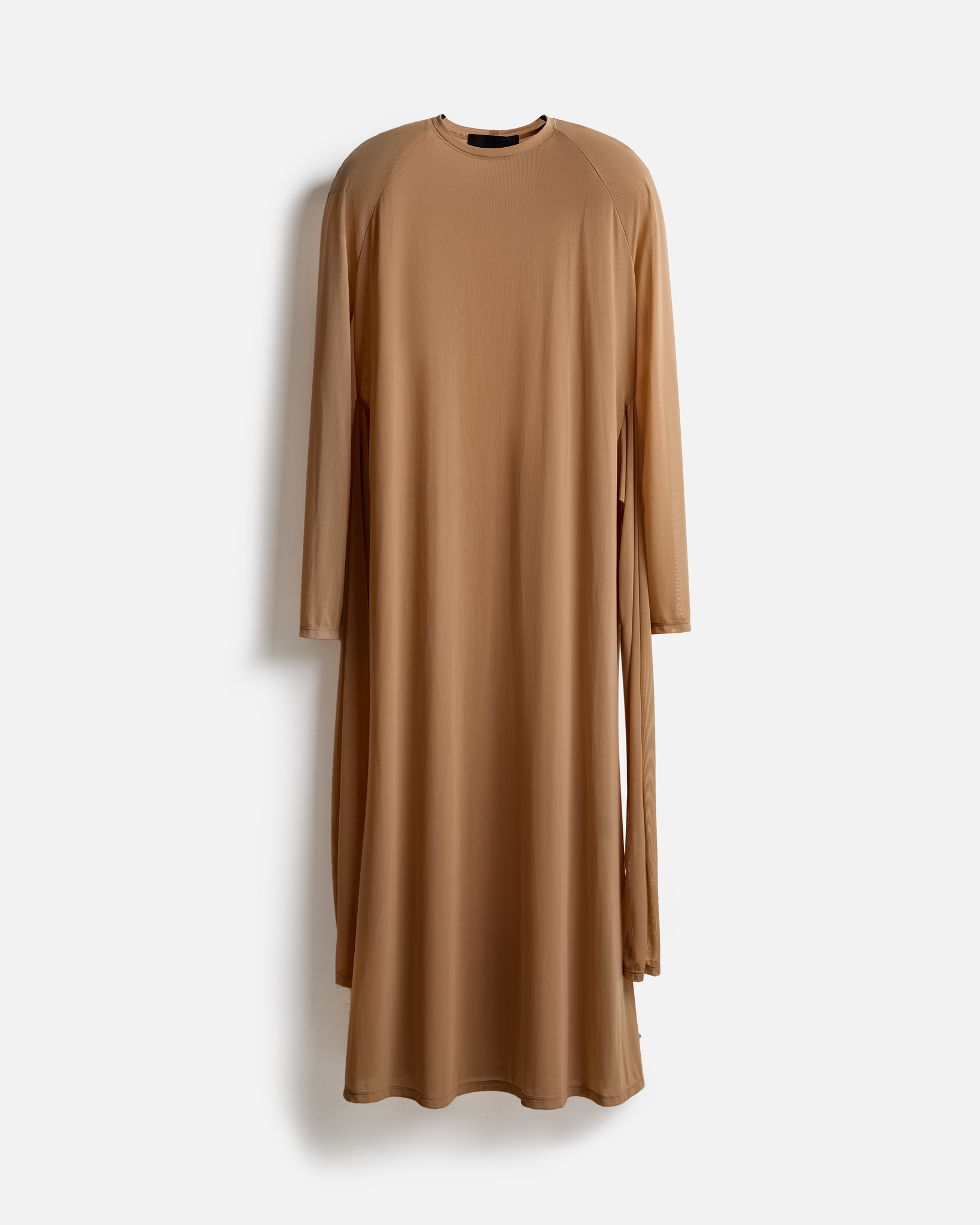 Платье-трансформер из полупрозрачной сетки с акцентированными подплечниками. В боковые швы вшиты длинные рукава, которые работают как пояс, позволяя менять посадку и создавать новые формы силуэта. Благодаря этому изделие может быть строгим и вытянутым или собранным и графичным.