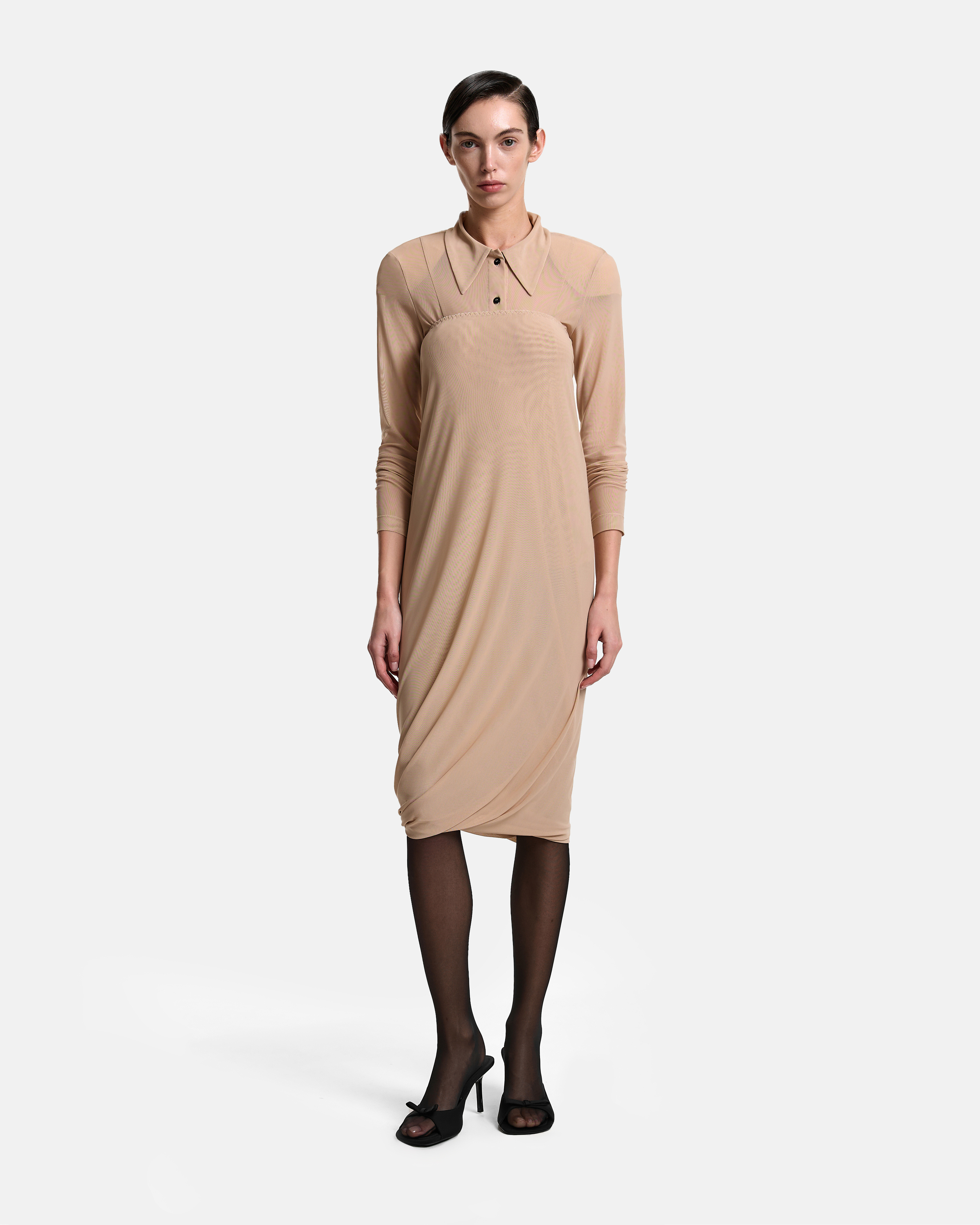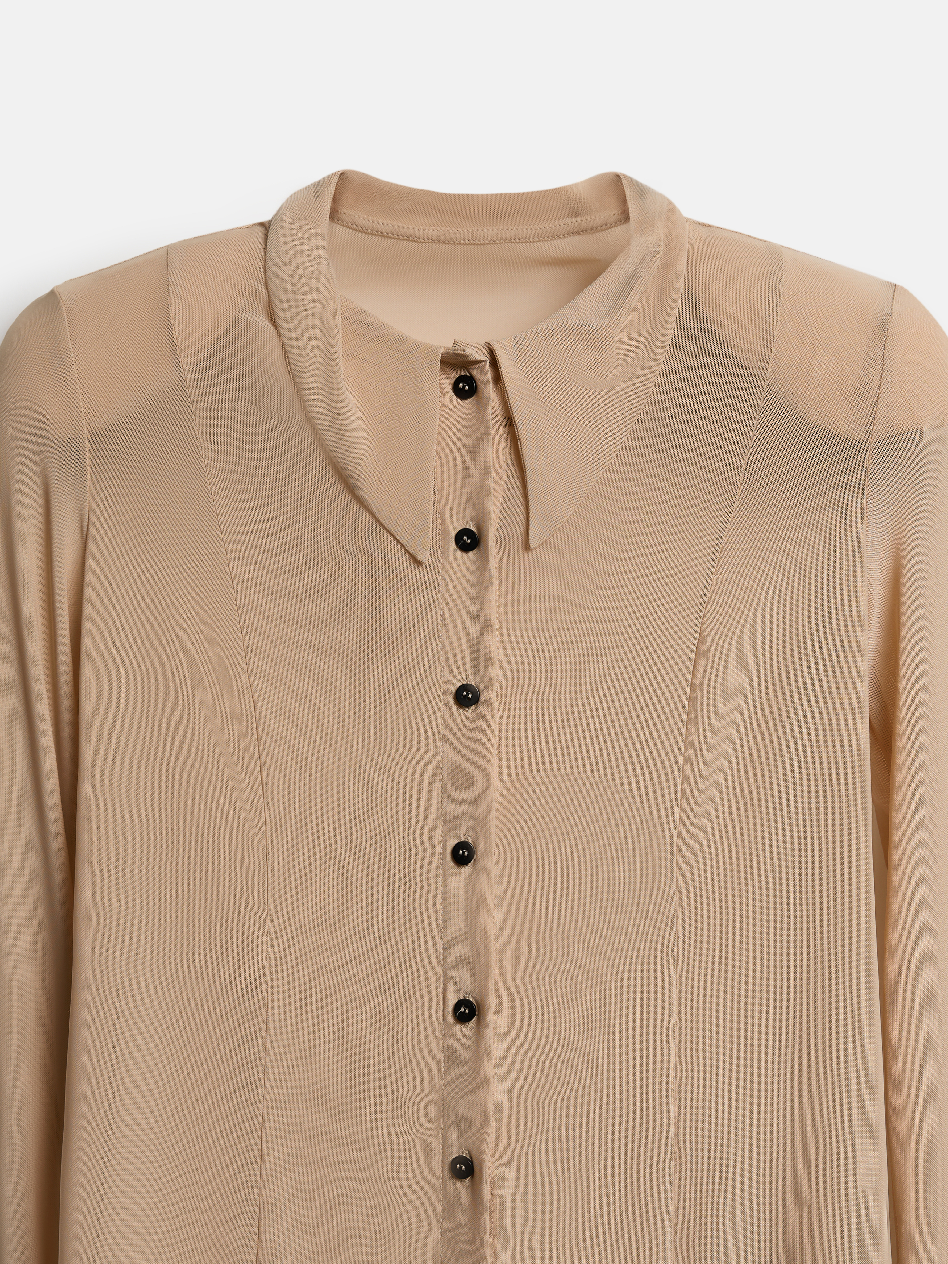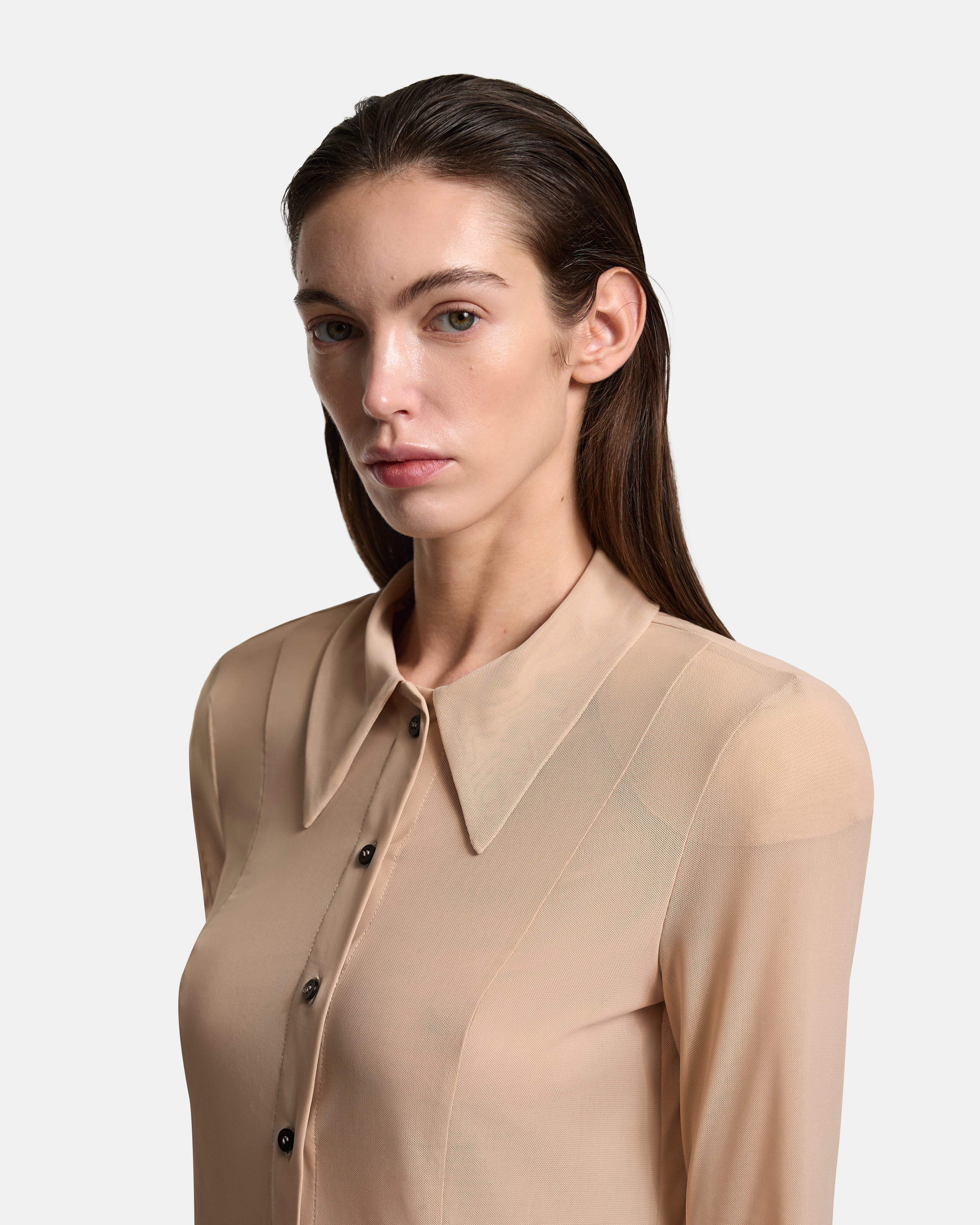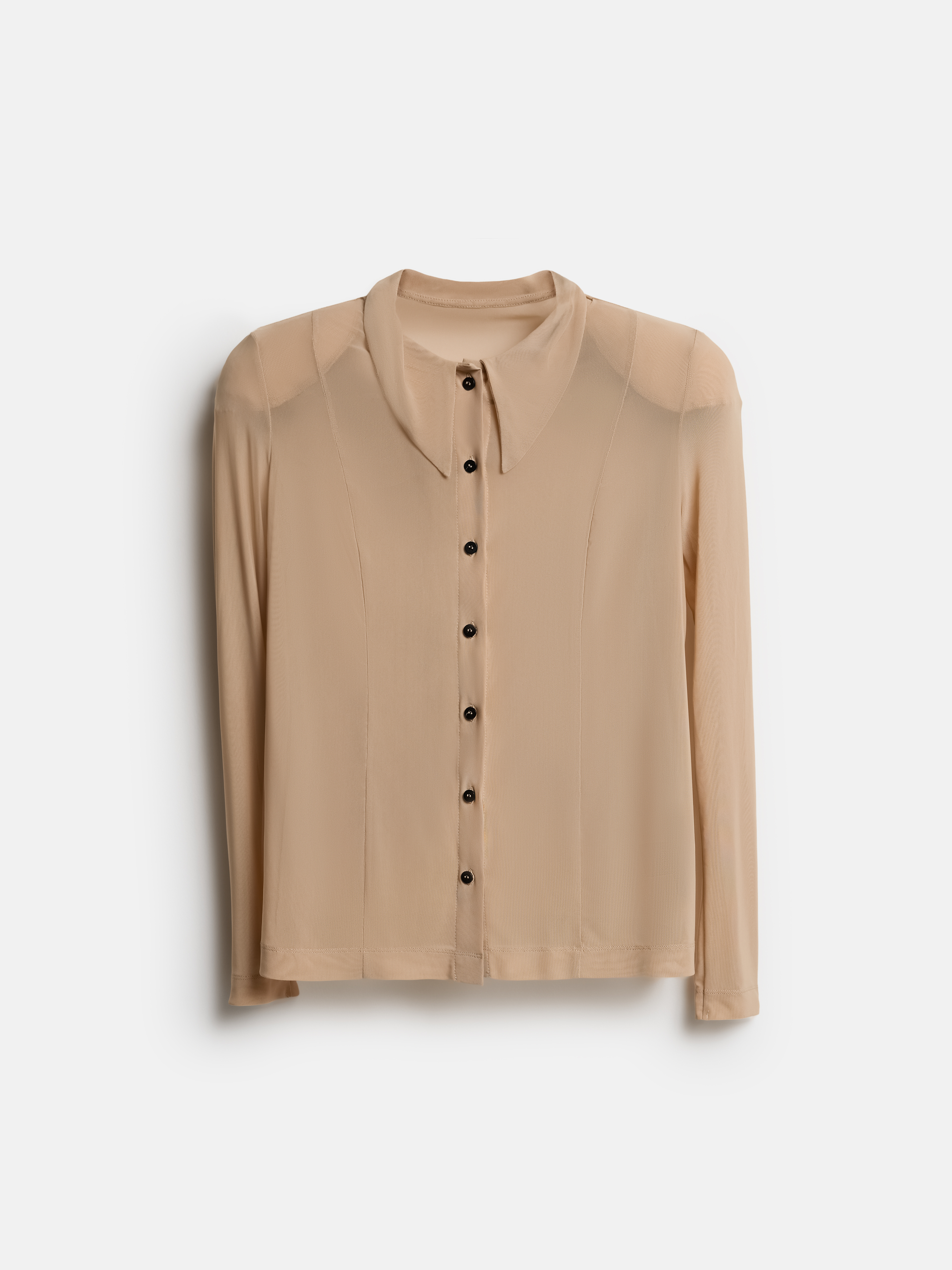 Мы взяли знакомый формат классической рубашки и перевели его в прозрачную плоскость. Матовая эластичная сетка слегка просвечивает, а встроенные подплечники придают плечам чёткую линию. Прямой рукав, по полочке идут вертикальные рельефные швы — они подчёркивают вертикаль силуэта и добавляют графики посадке. Рубашка застёгивается на пуговицы, расположенные на планке.