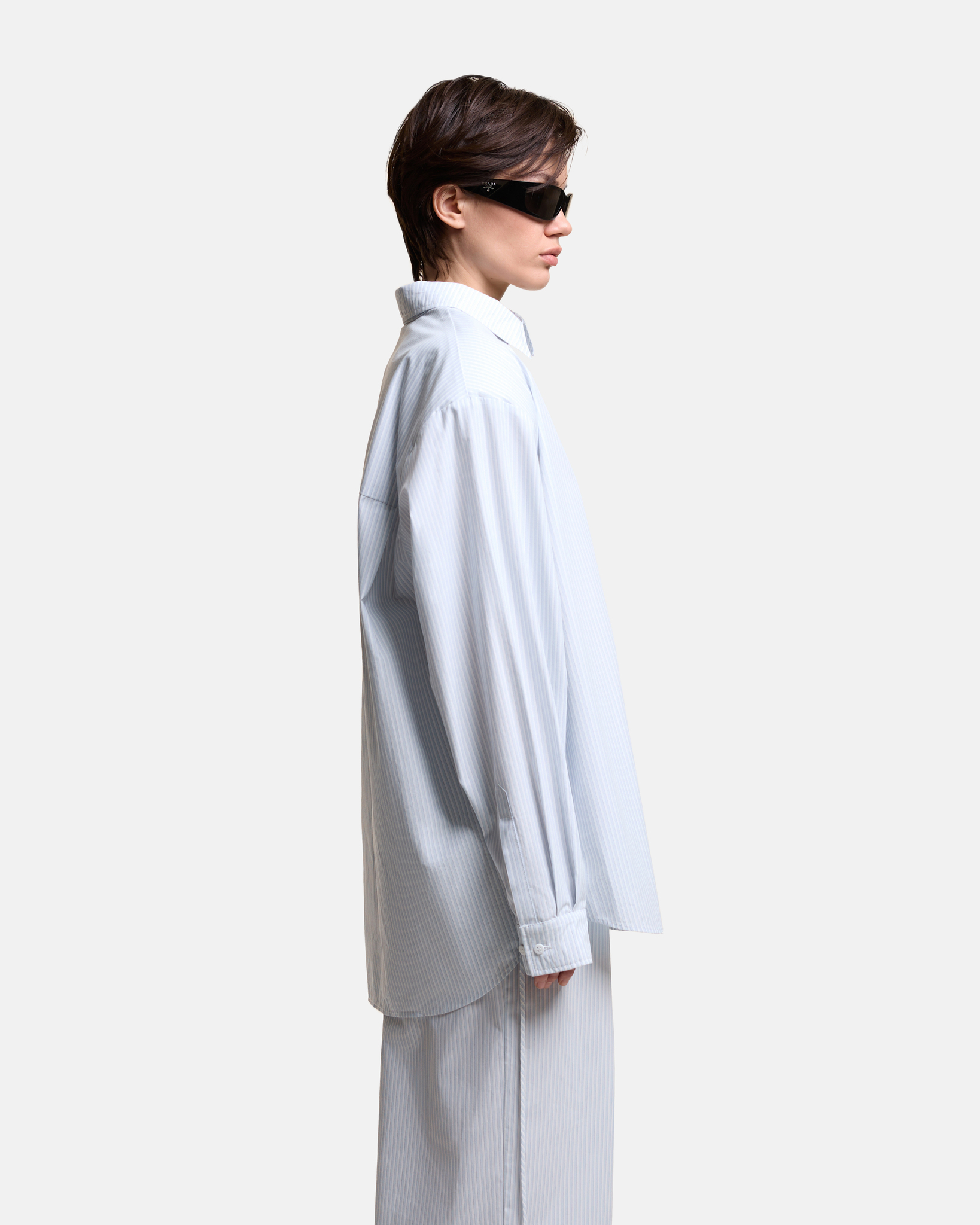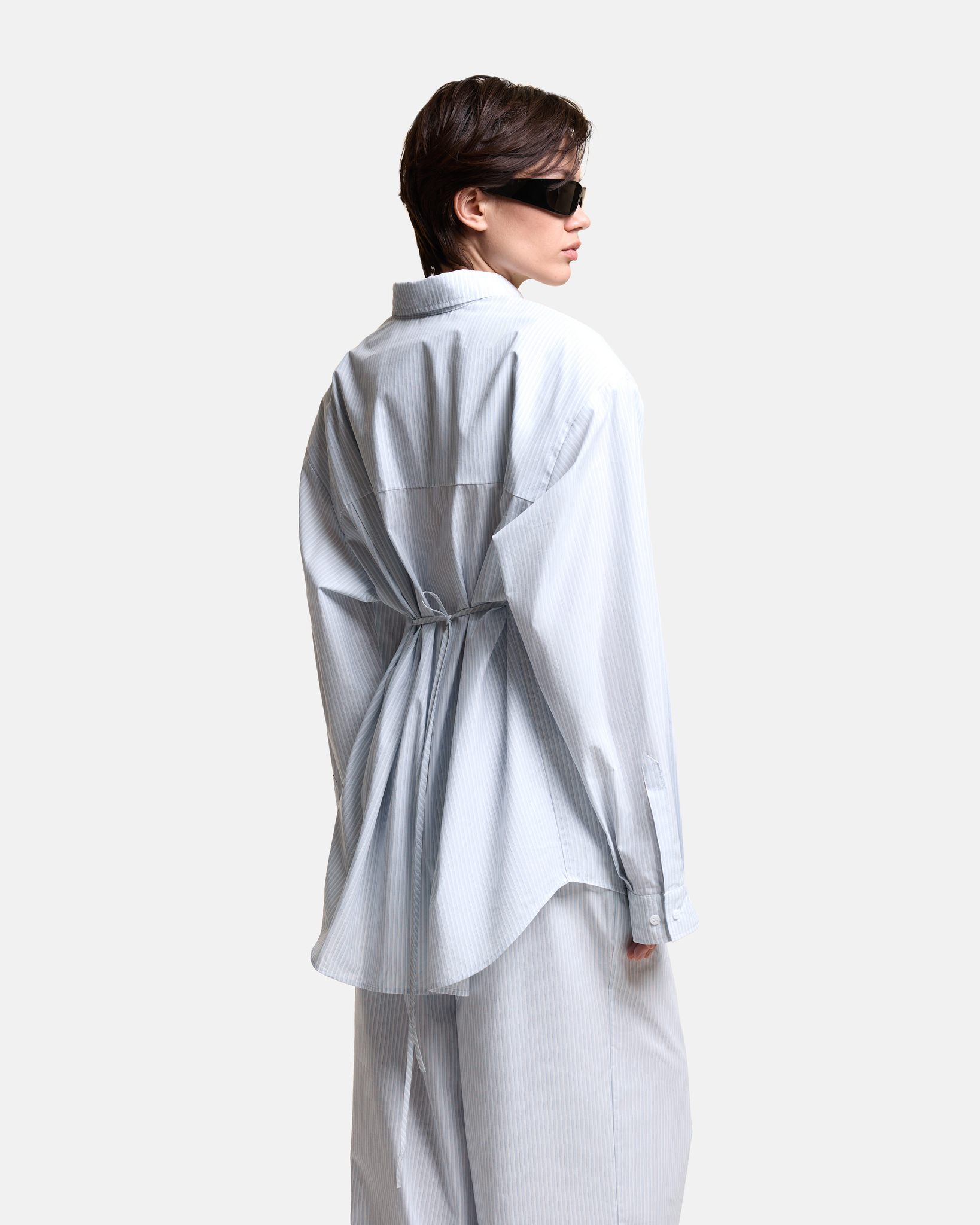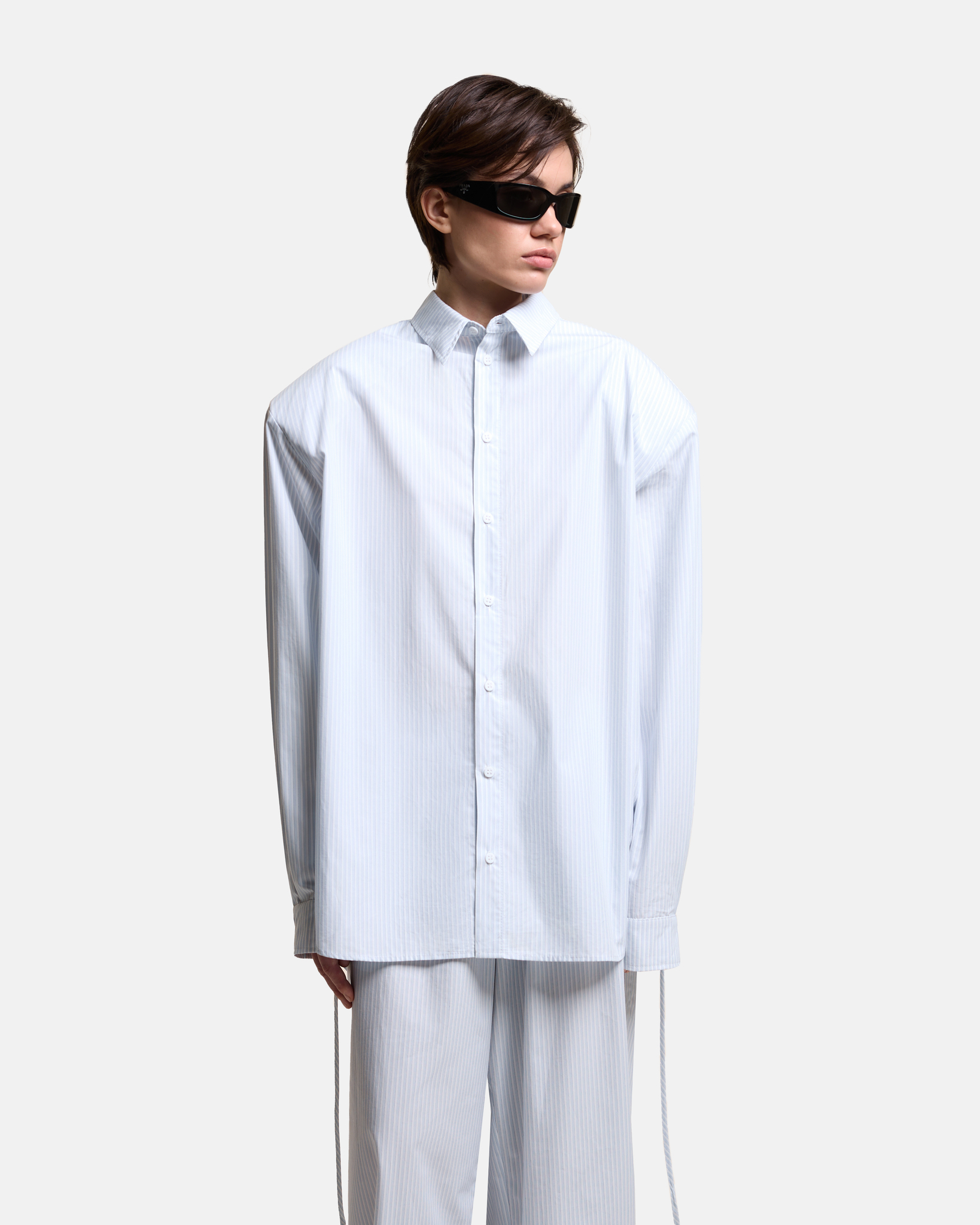 Рубашка со съемными подплечниками в полоску. Застегивается на пуговицы. Силуэт изделия возможно видоизменять с помощью лент выполненных из идентичной ткани.