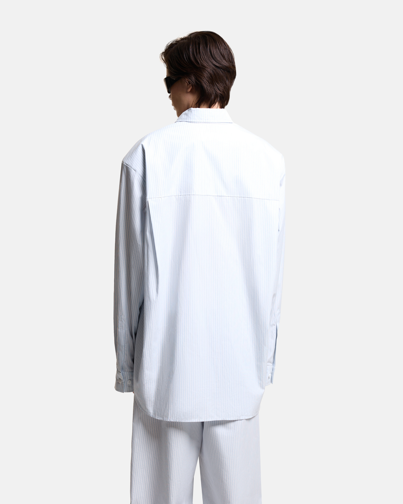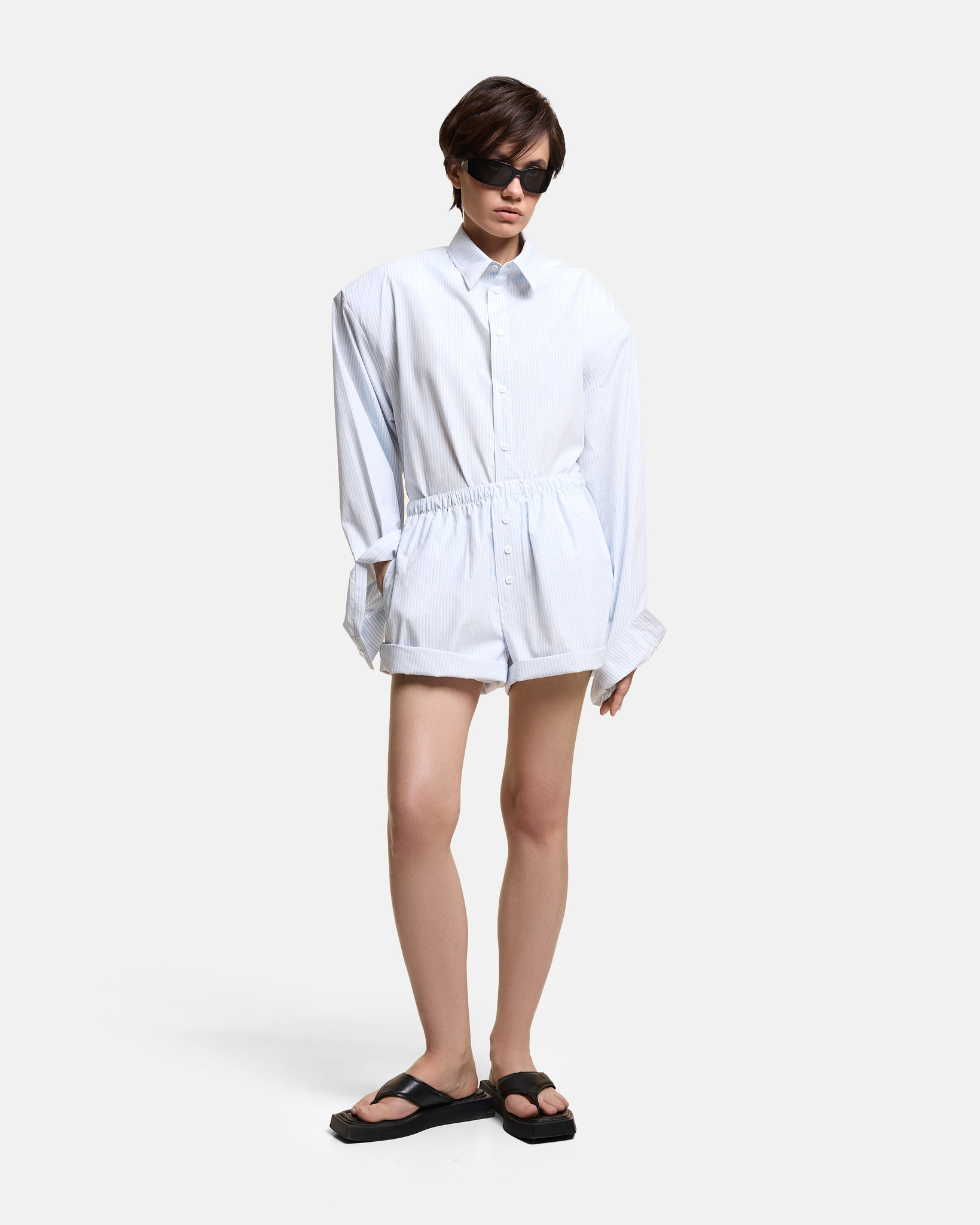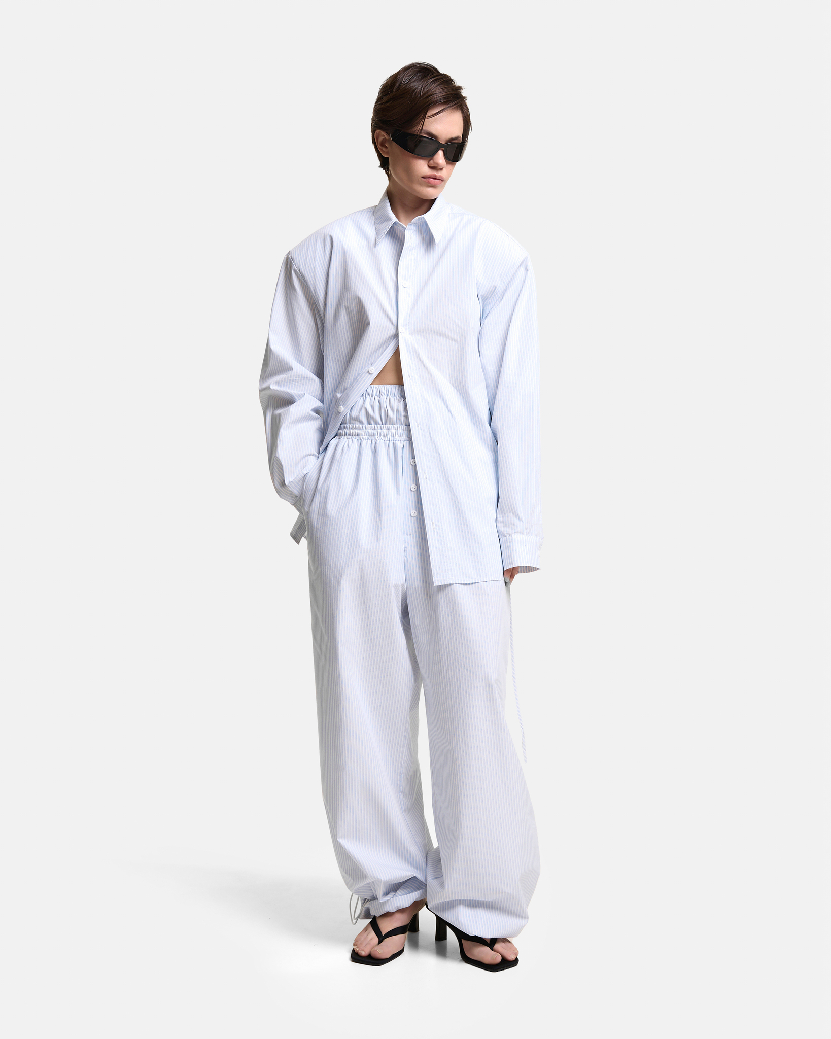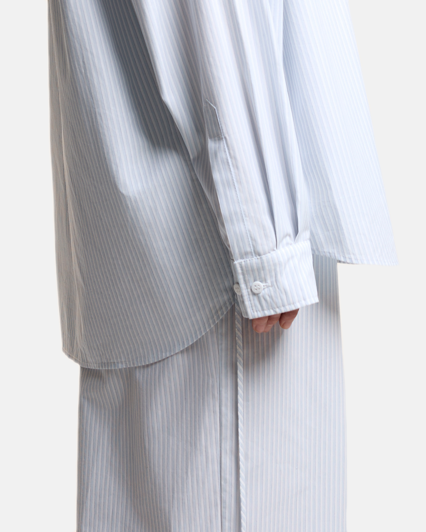 Рубашка со съемными подплечниками в полоску. Застегивается на пуговицы. Силуэт изделия возможно видоизменять с помощью лент выполненных из идентичной ткани.