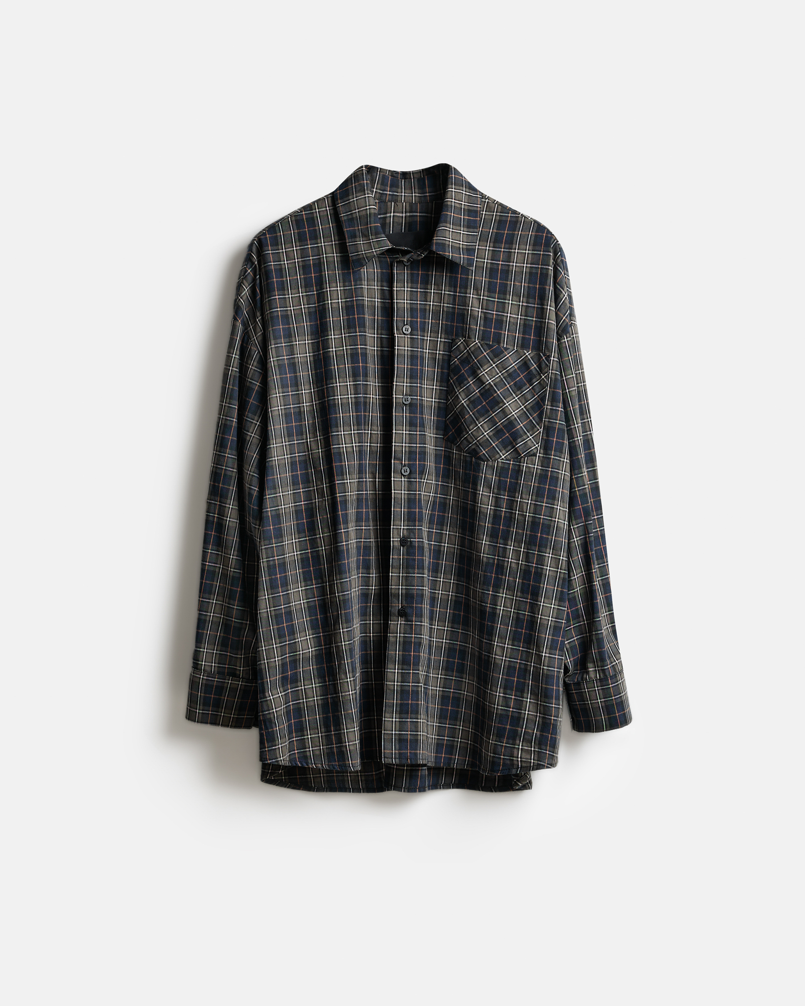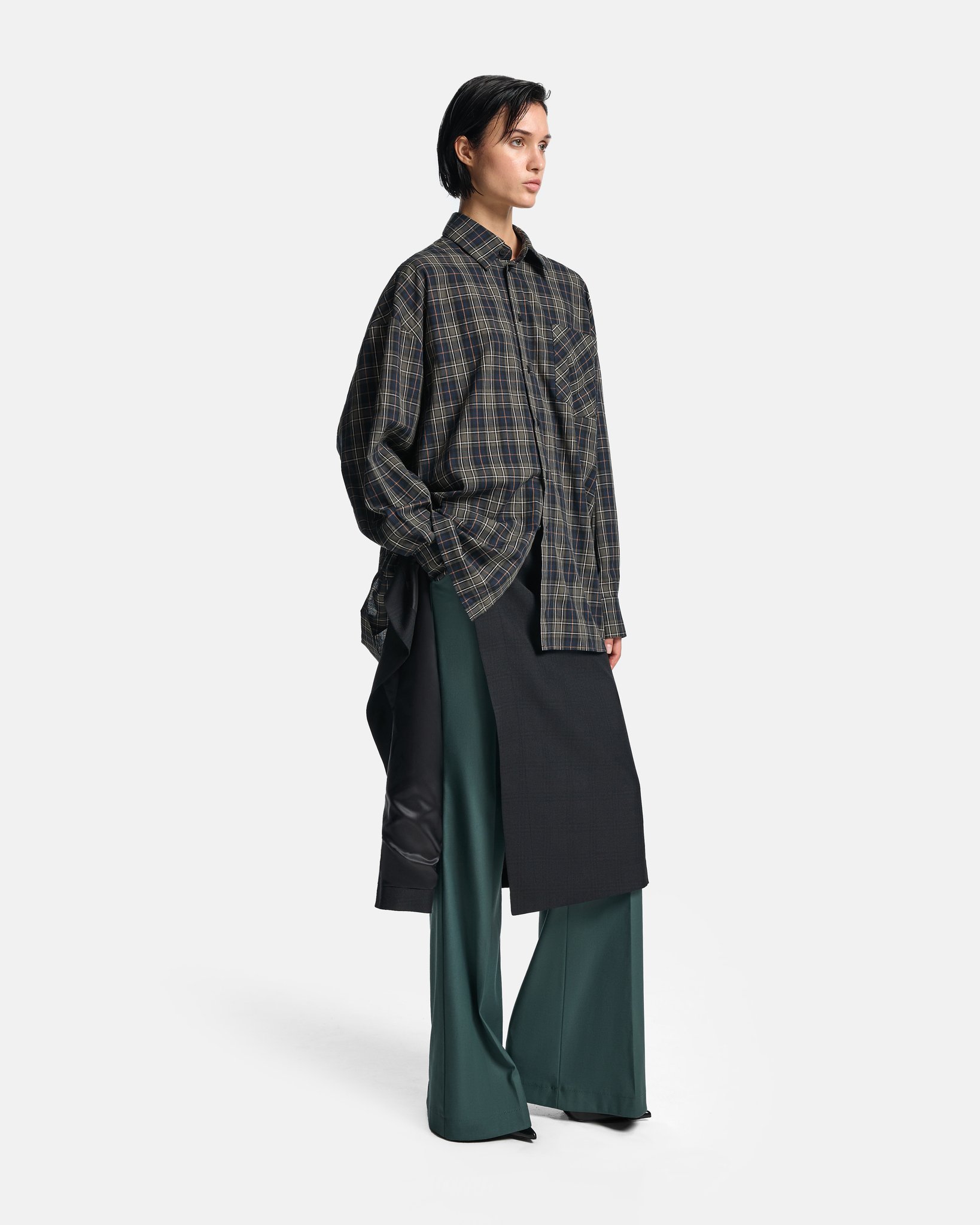 Рубашка из хлопка в клетку, переосмысленная через асимметрию. Классический силуэт смещён за счёт драпировки и нестандартной линии застёжки, из-за чего привычная форма выглядит будто «случайно» перекошенной. Карман, выкроенный по диагонали, поддерживает игру с геометрией.