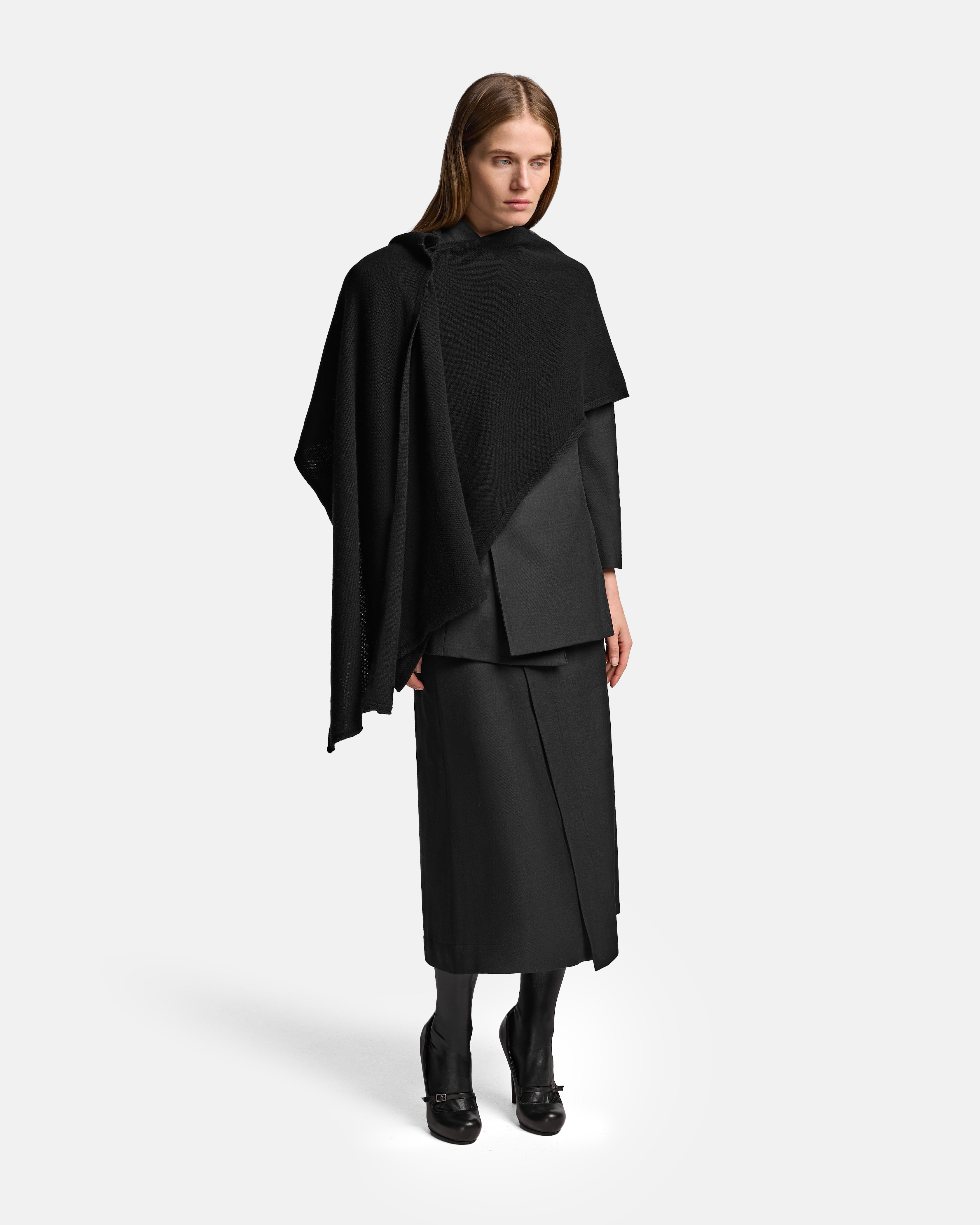 Мы задумывали его как универсальный элемент гардероба, который меняет своё назначение в зависимости от способа ношения. Минимальная обработка краёв и цельная форма подчёркивают идею чистоты и гибкости конструкции.