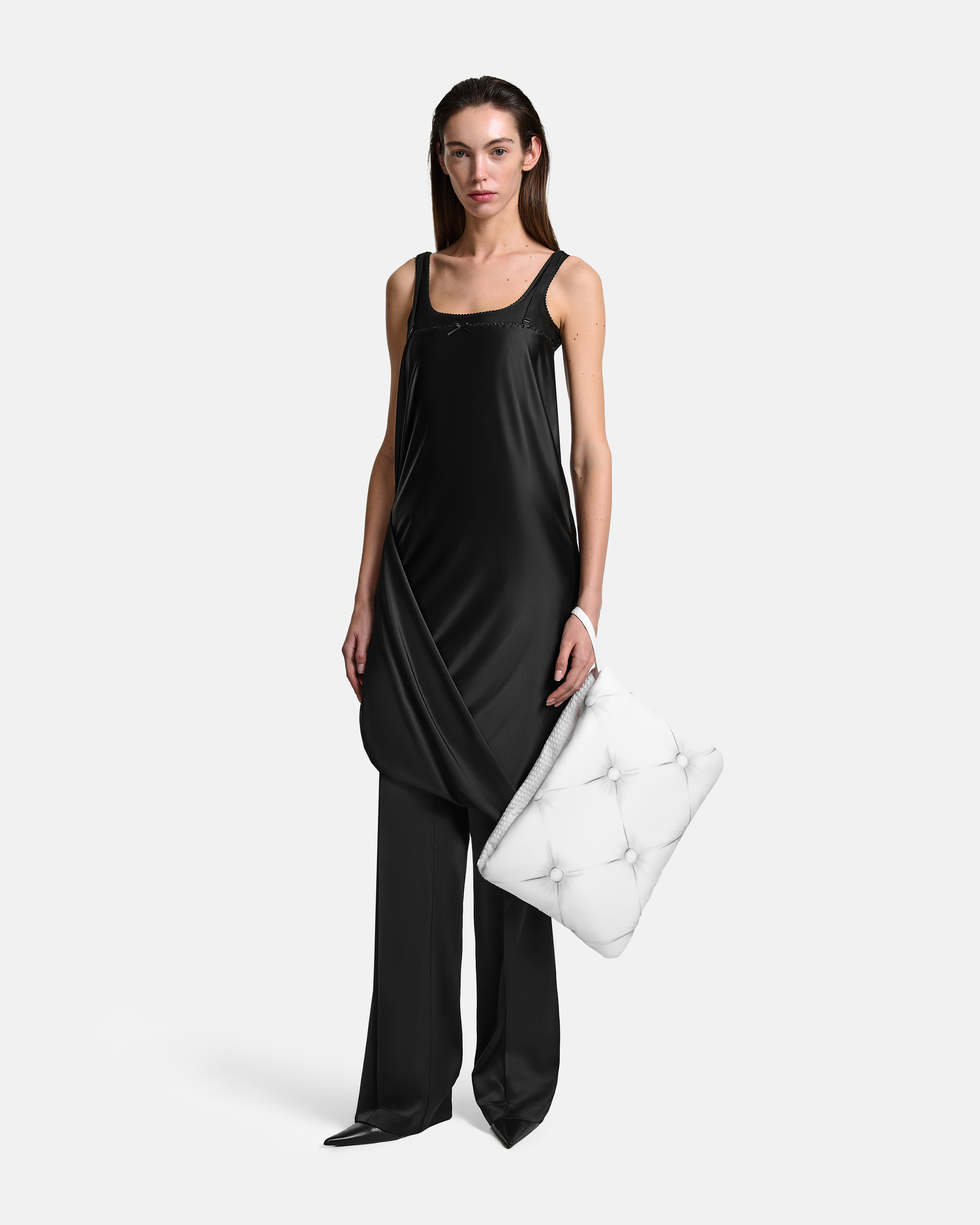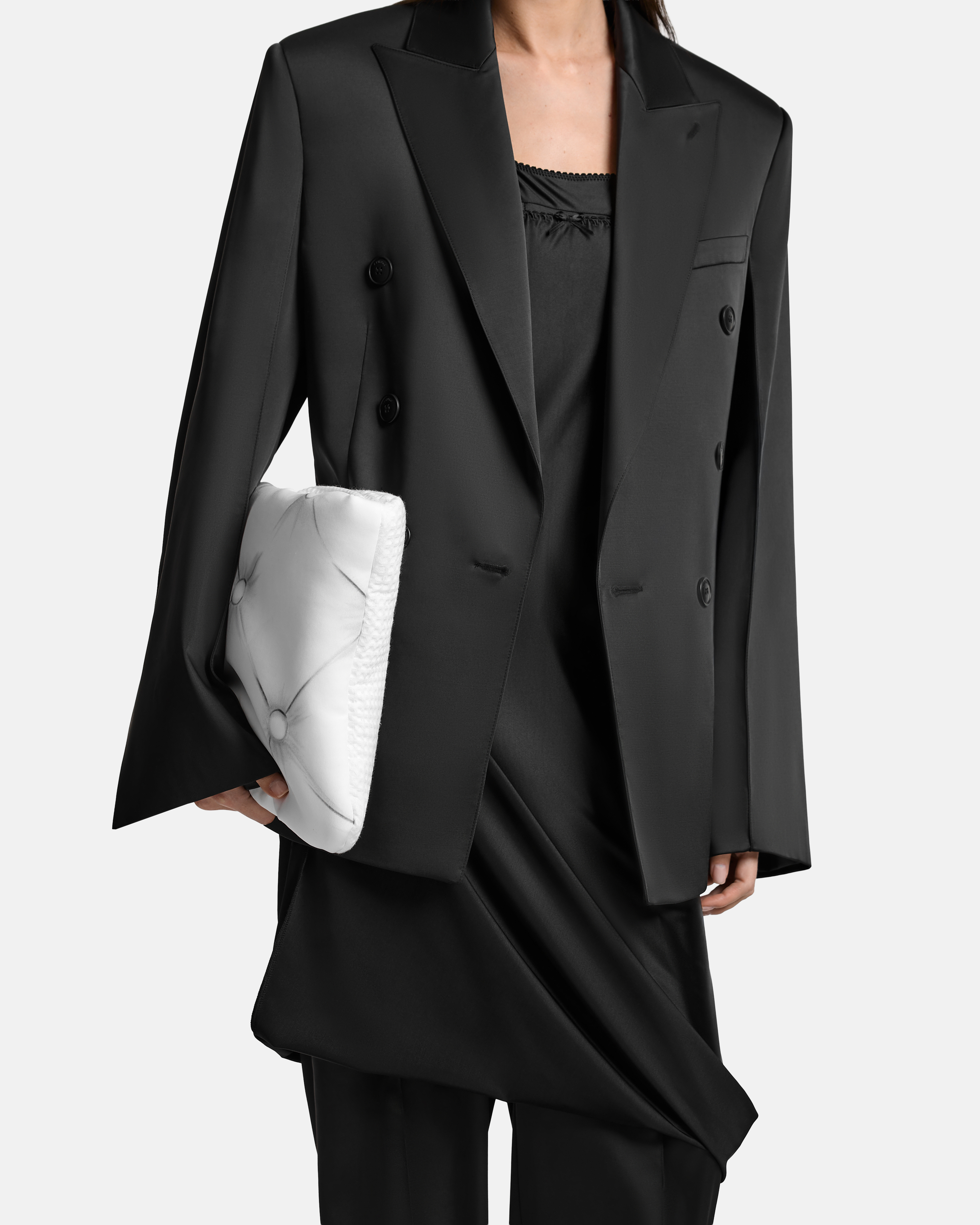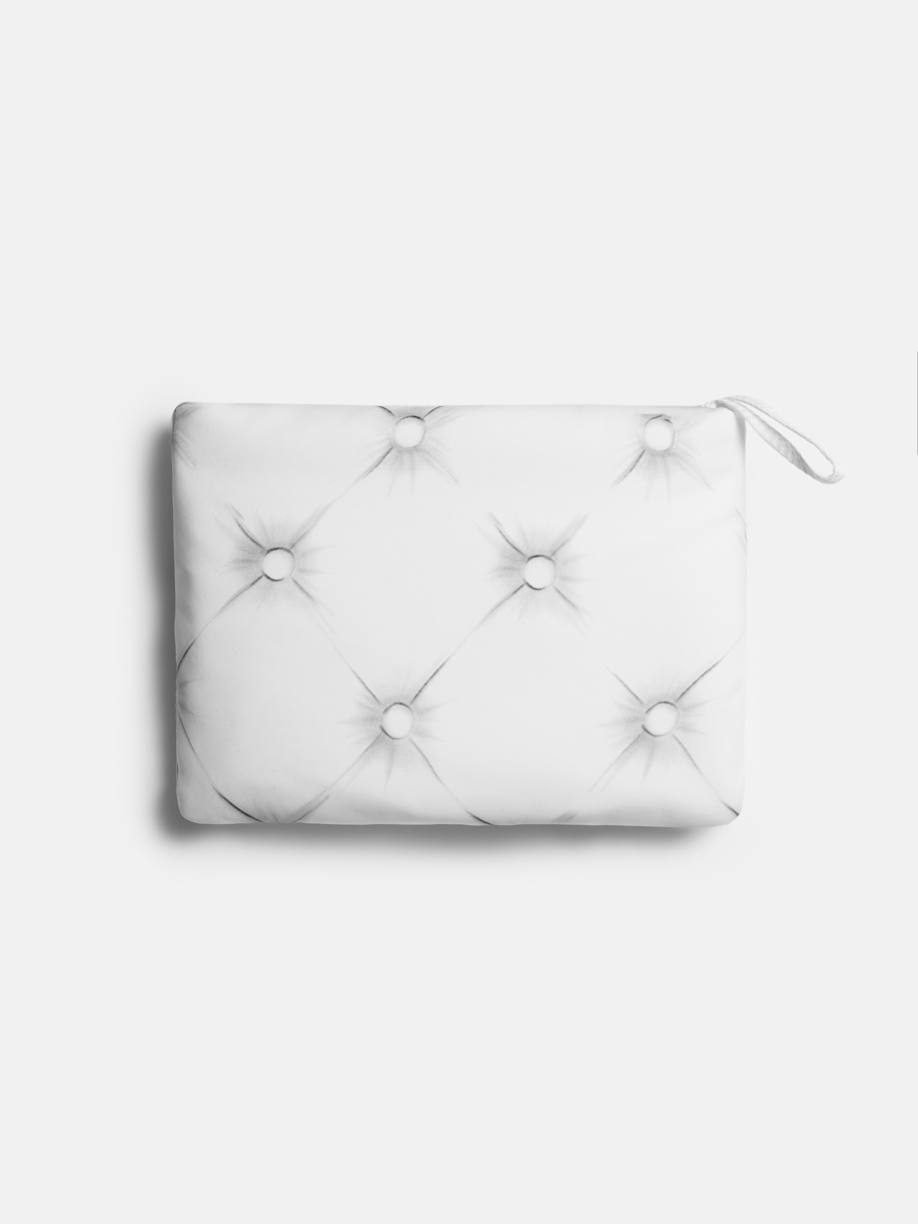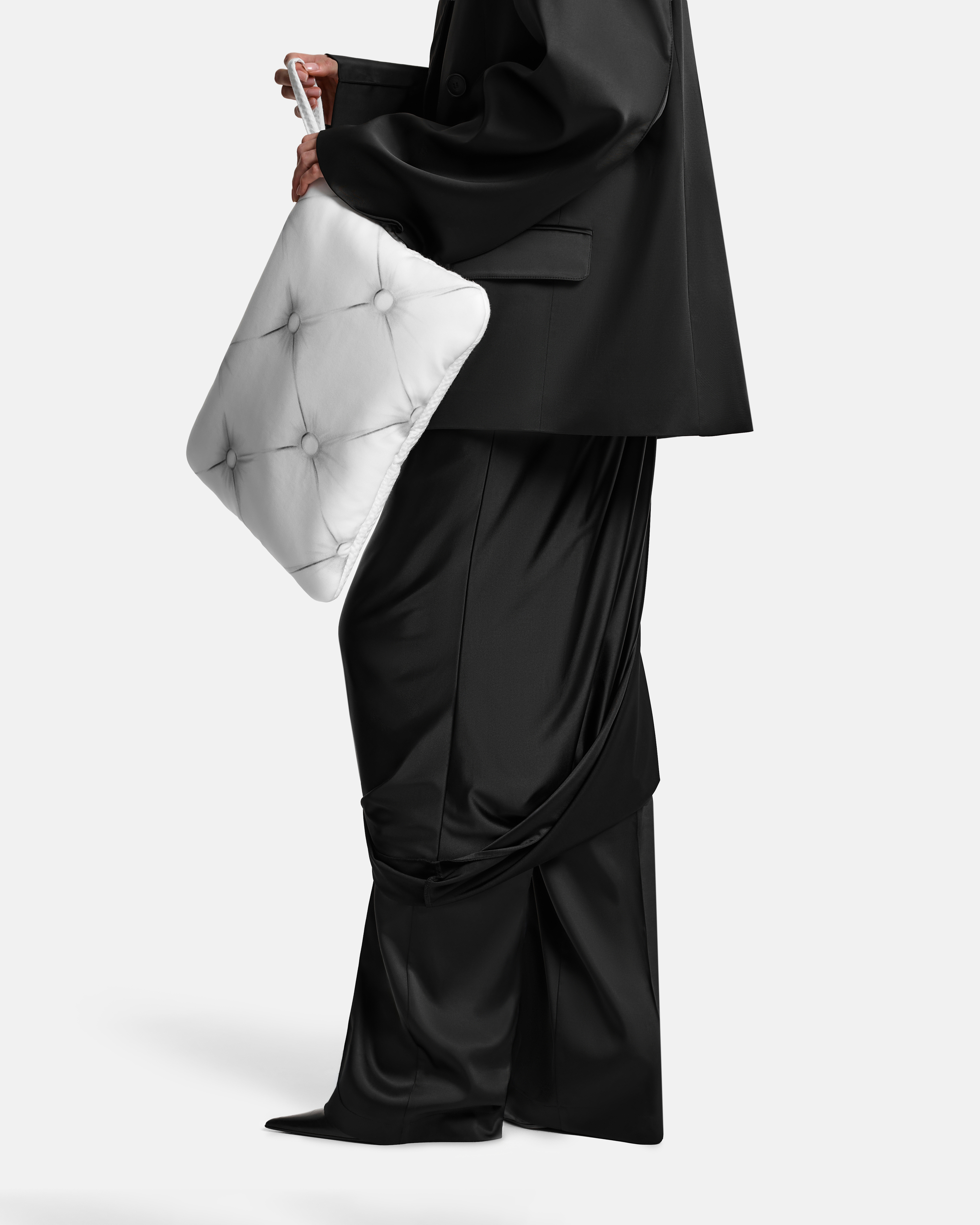 Мягкая сумка с нашей оптической «каретной стяжкой». Этот рисунок мы долго выверяли для платьев: иллюзия объёма и пуговиц читается с первого взгляда, но поверхность остаётся гладкой. На аксессуаре мотив работает как маленький объект‑манифест — отсылка к винтажной обивке.