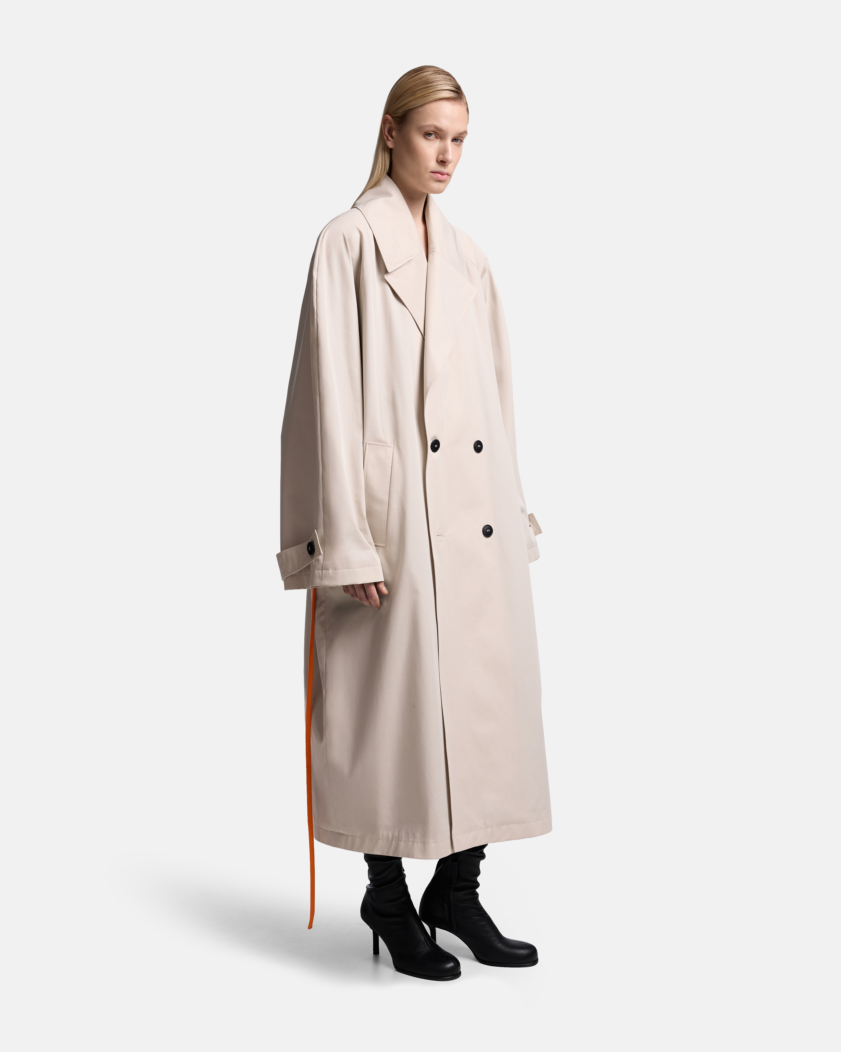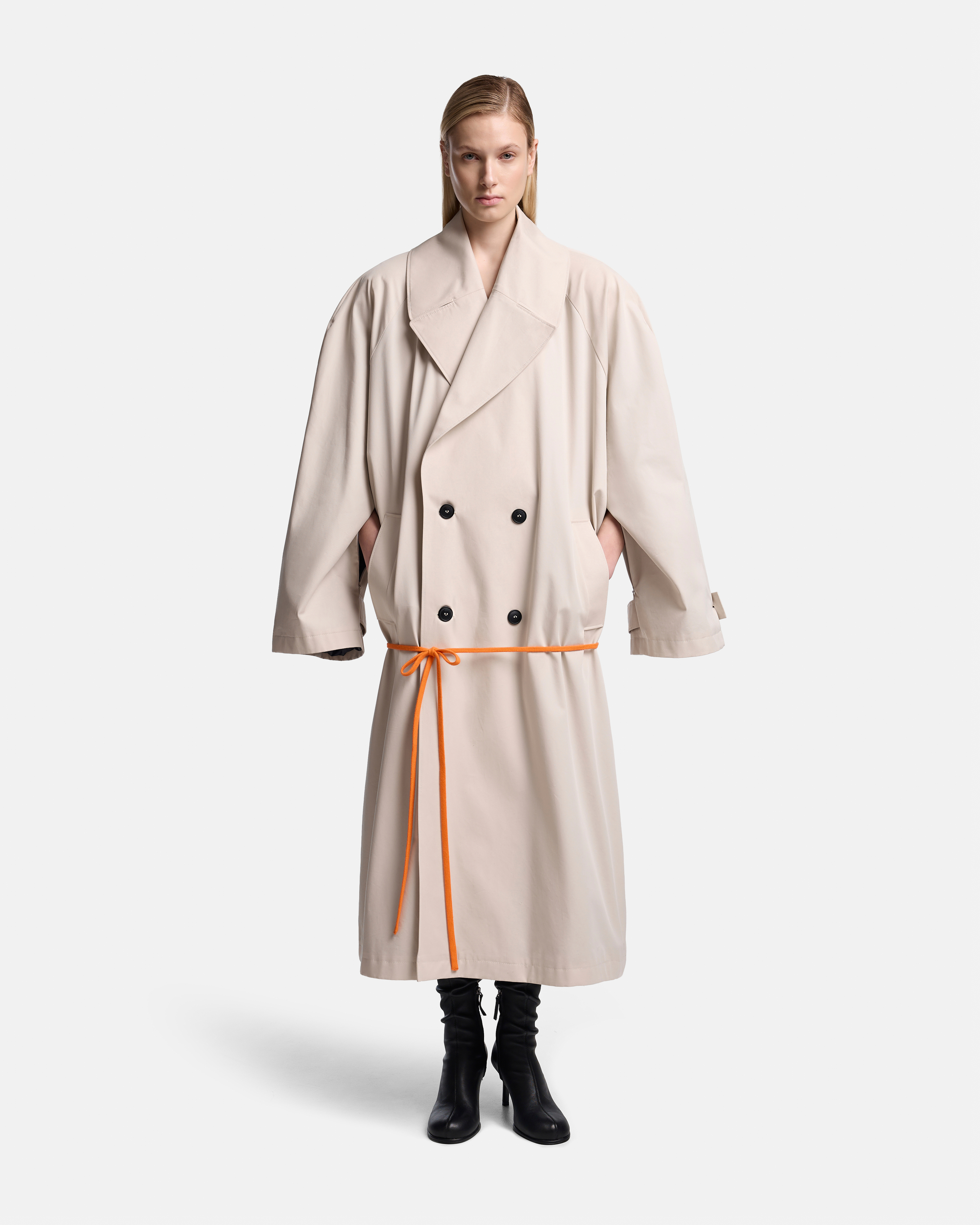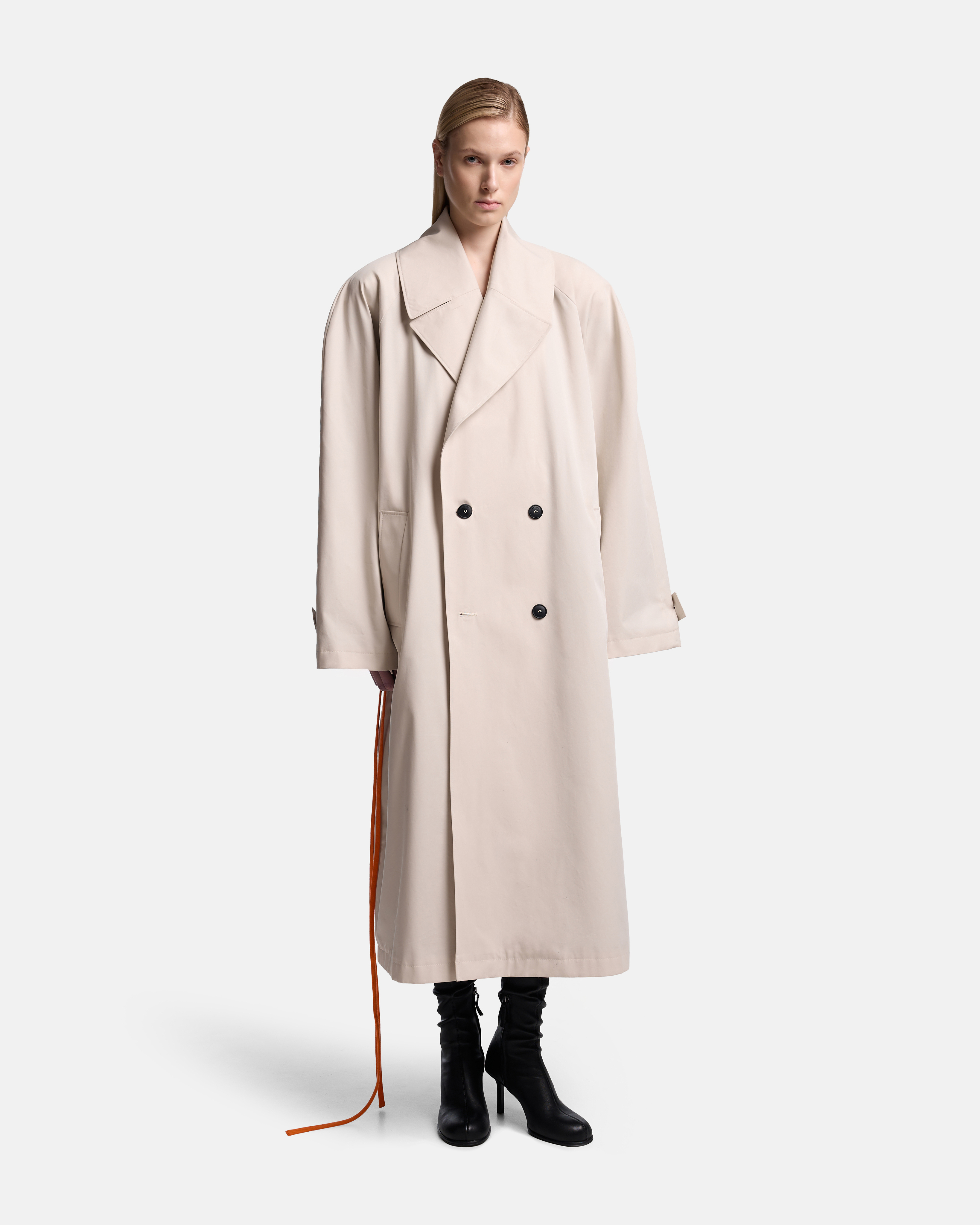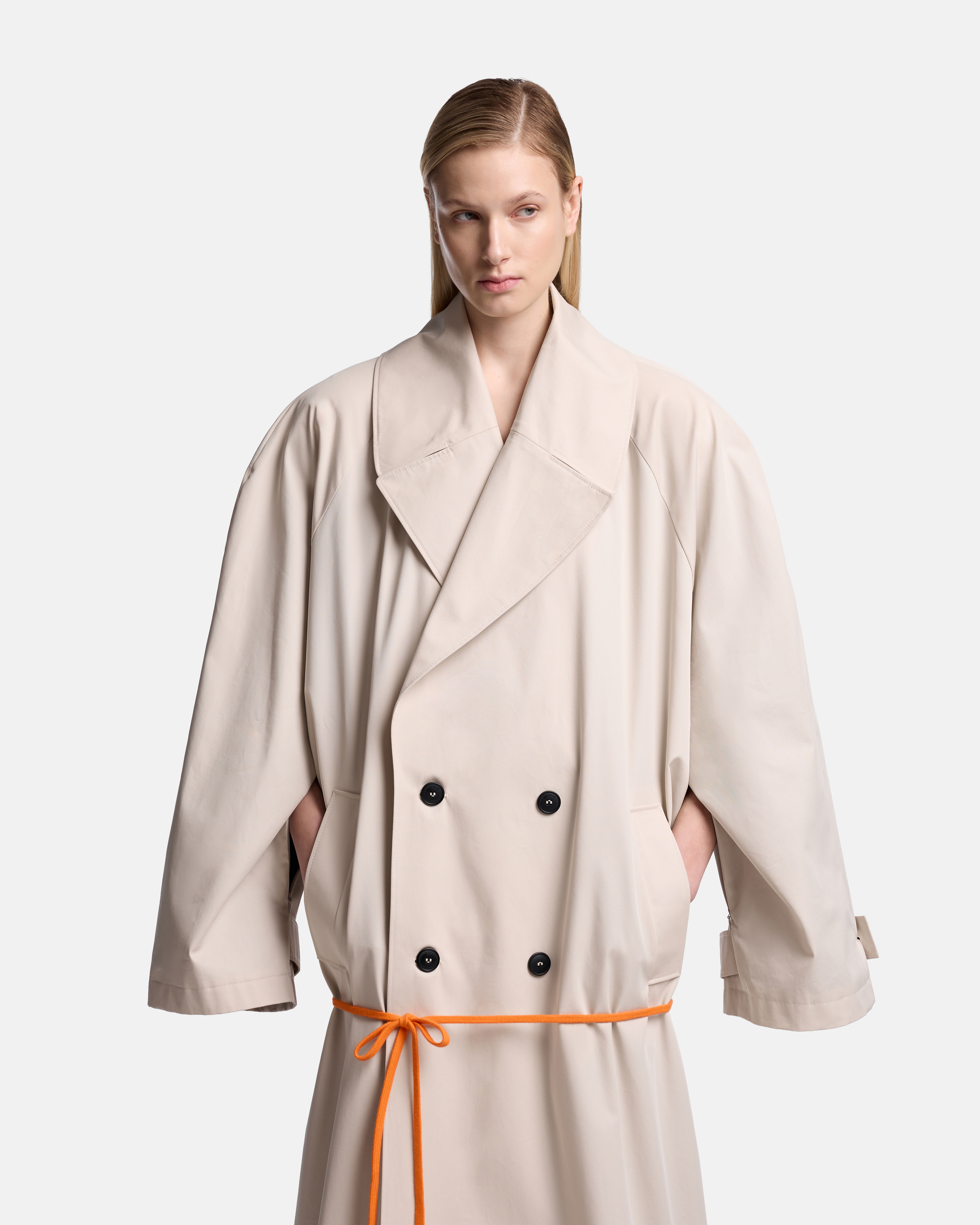 Тренч O-силуэта выстроен как объёмная, собранная форма. Реглан-конструкция с подплечниками формирует чёткую линию плеча, сохраняя мягкость общего объёма. Модель двубортная, застёгивается на пуговицы, оставаясь визуально сдержанной и архитектурной.