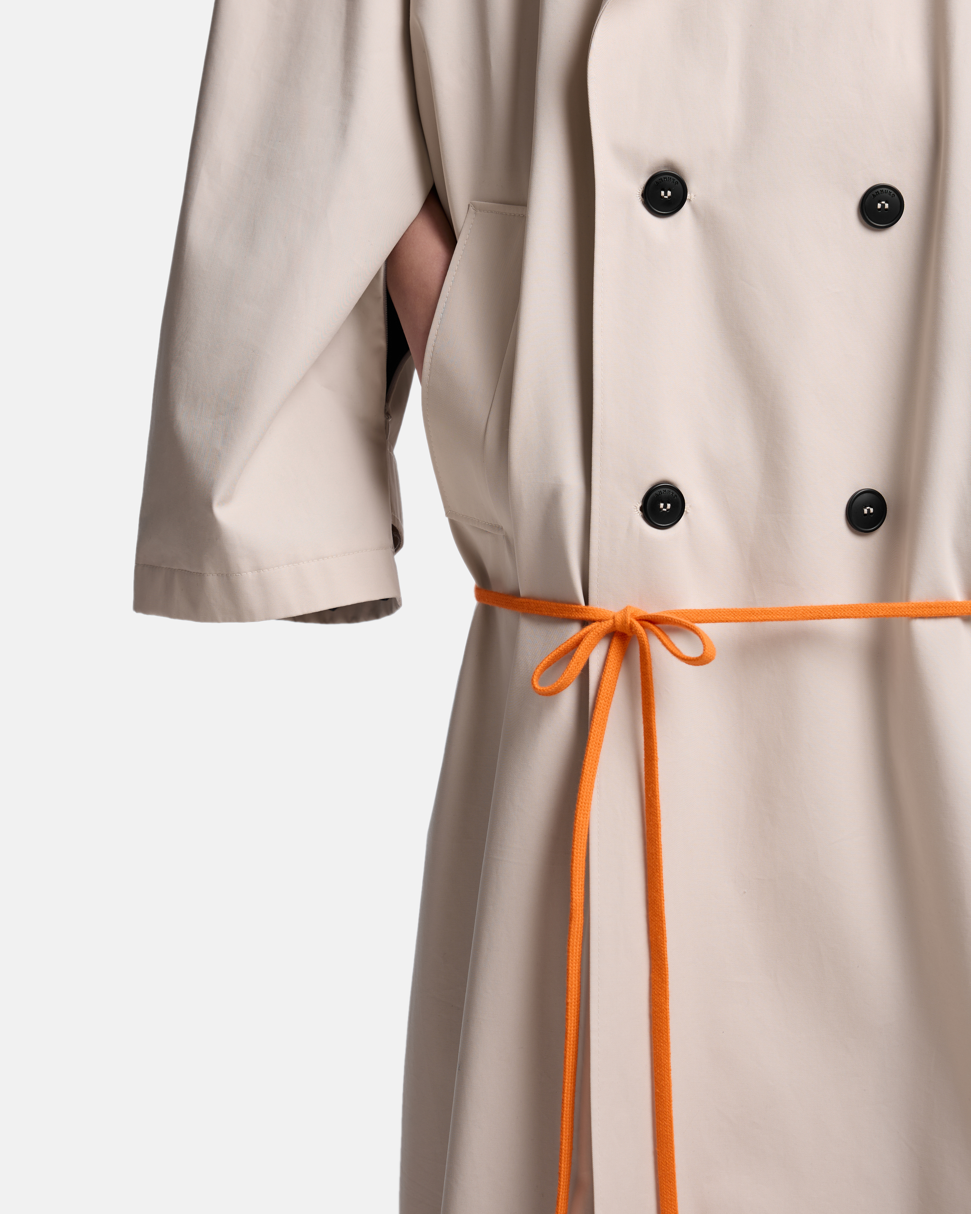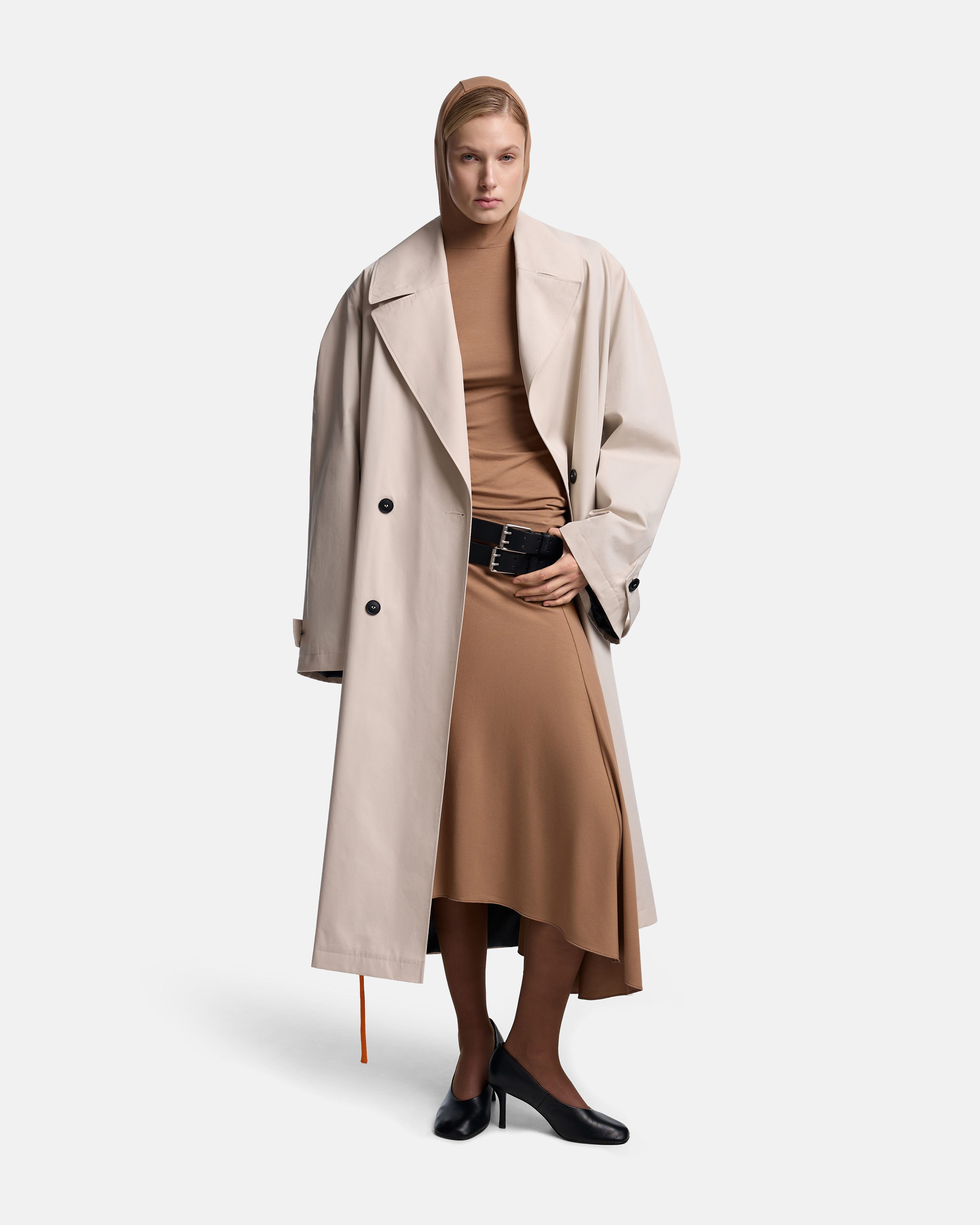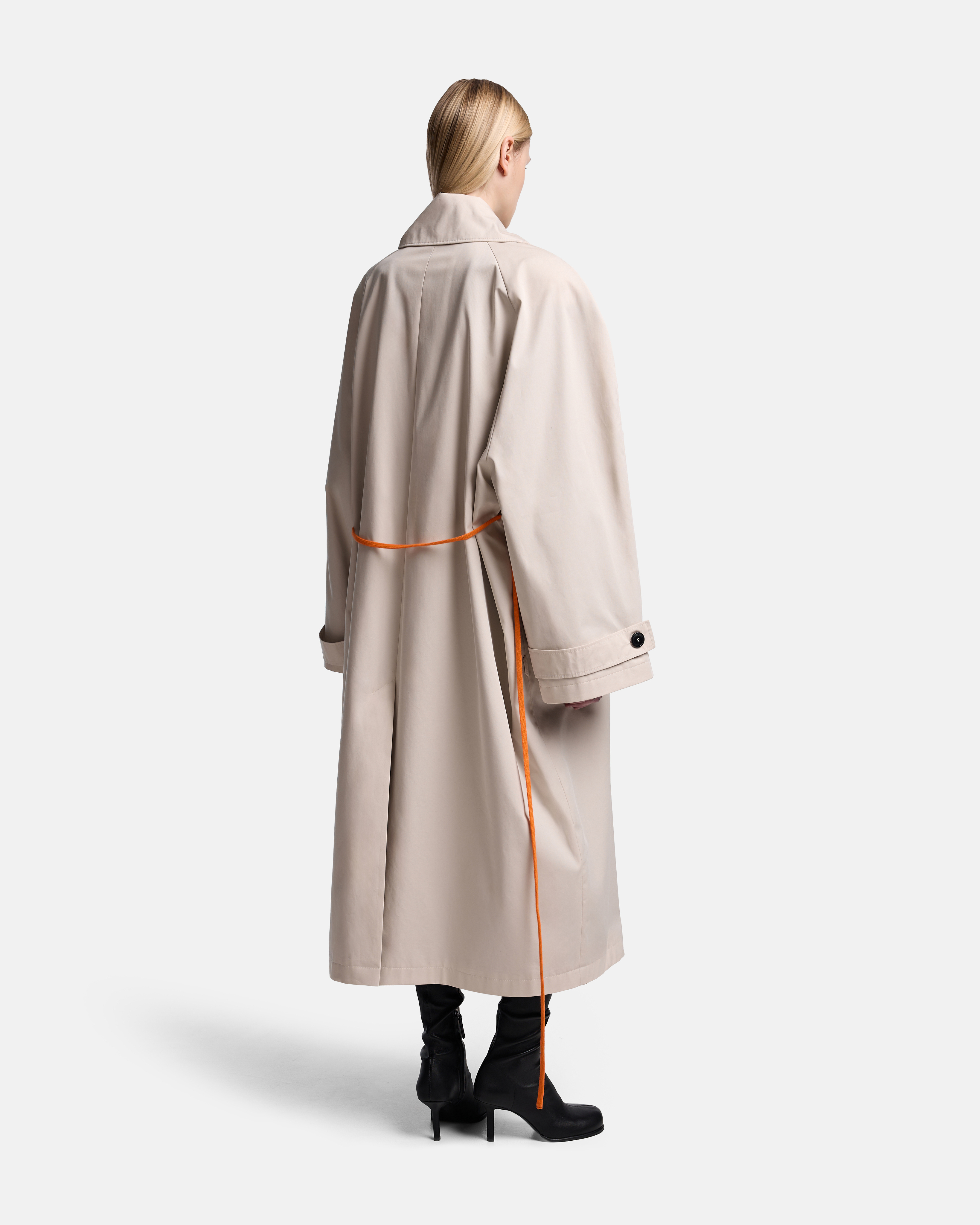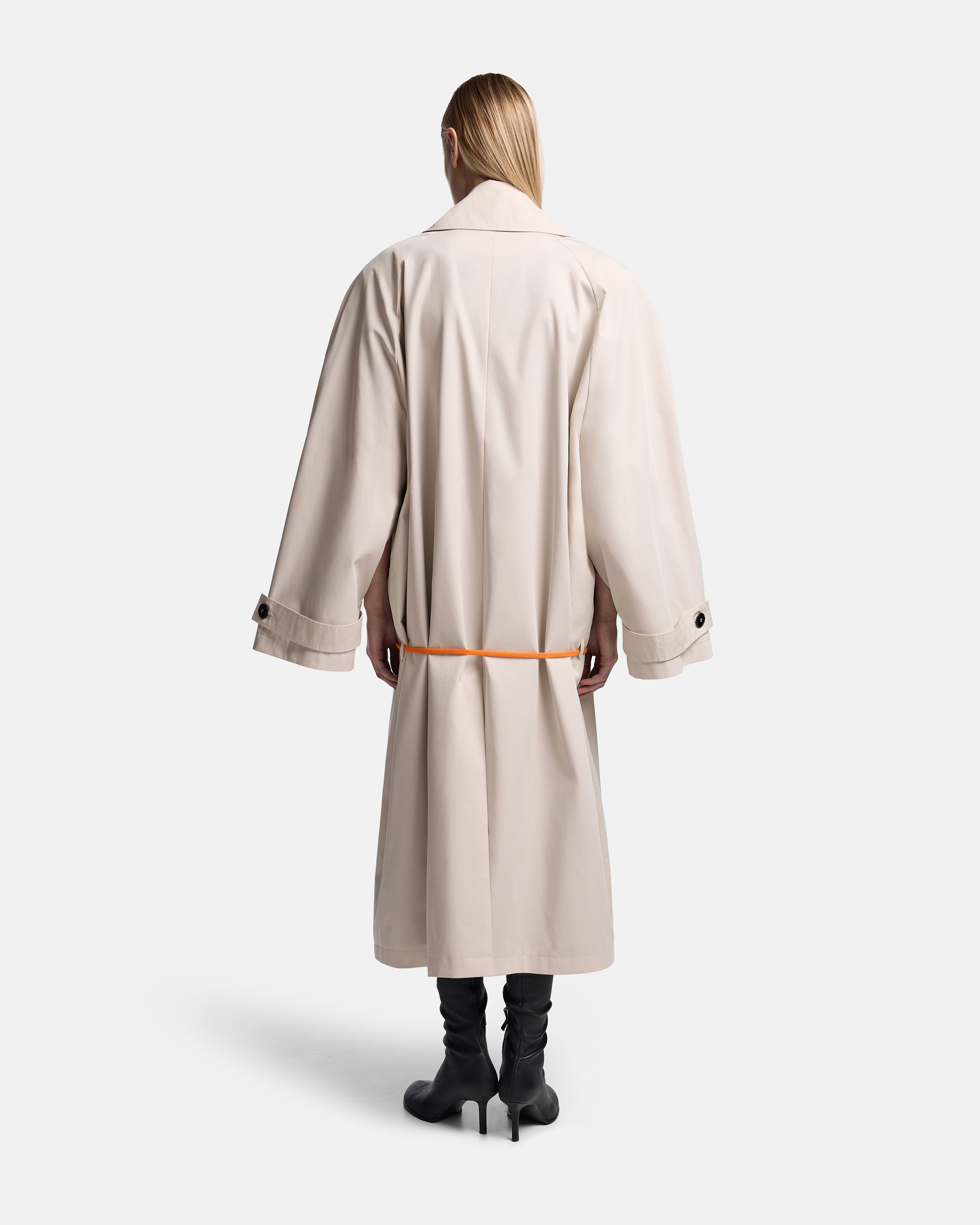 Тренч O-силуэта выстроен как объёмная, собранная форма. Реглан-конструкция с подплечниками формирует чёткую линию плеча, сохраняя мягкость общего объёма. Модель двубортная, застёгивается на пуговицы, оставаясь визуально сдержанной и архитектурной.