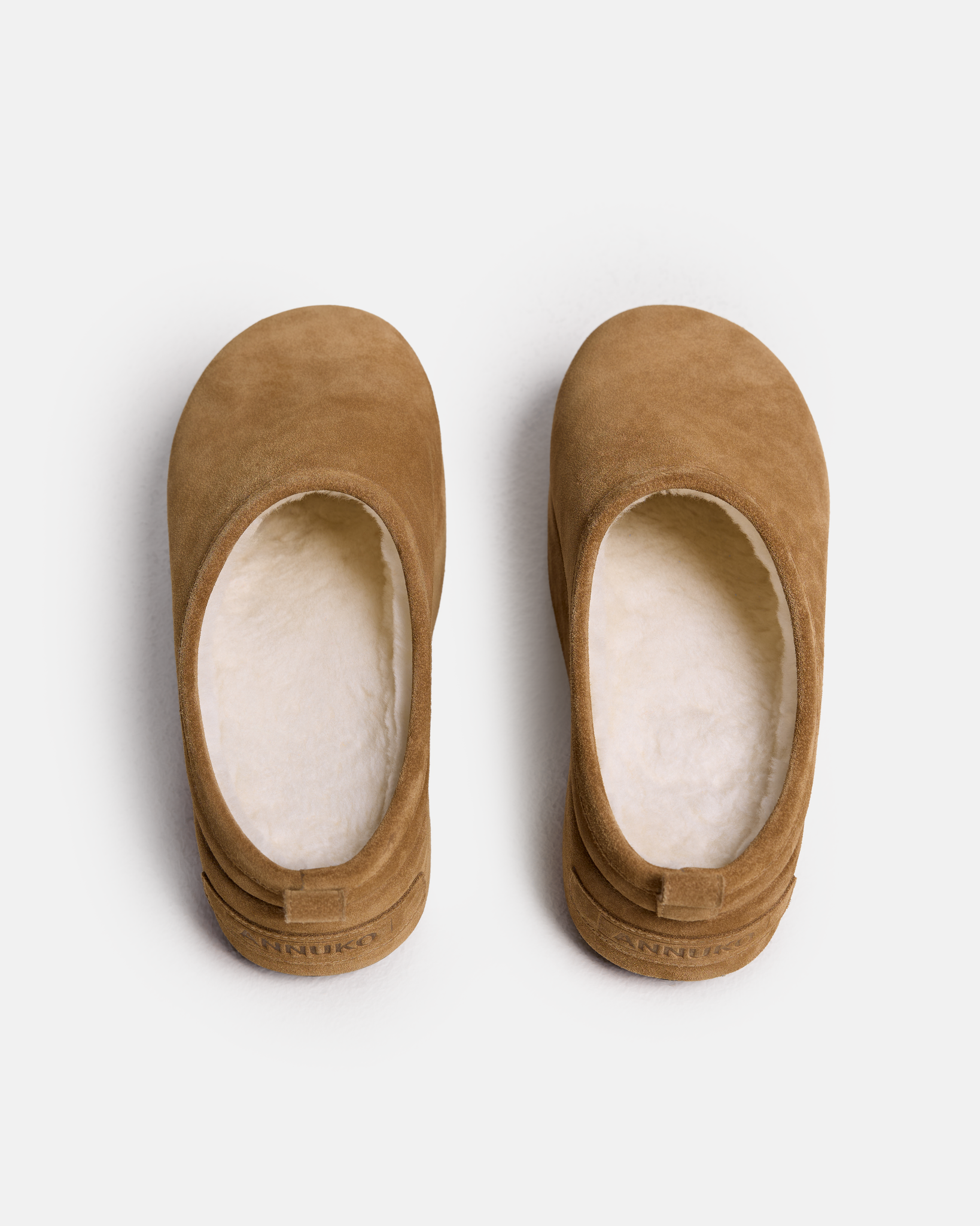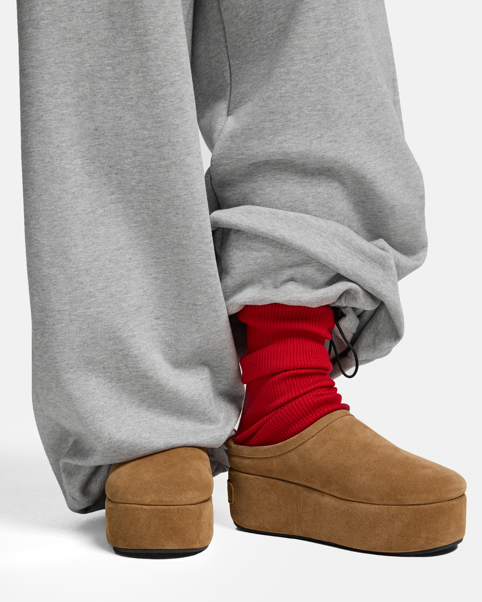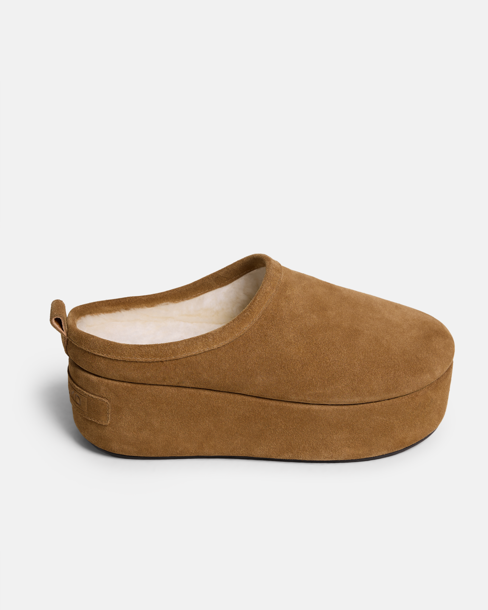 Угги на платформе выполнены из натуральной замши с внутренней отделкой из овчины. Форма намеренно сдержана: округлый нос и высокая подошва, которая меняет привычные пропорции классической модели. Мех внутри сохраняет тепло и со временем подстраивается под ногу, оставаясь частью конструкции. На пятке, в основании платформы, расположен логотип бренда.