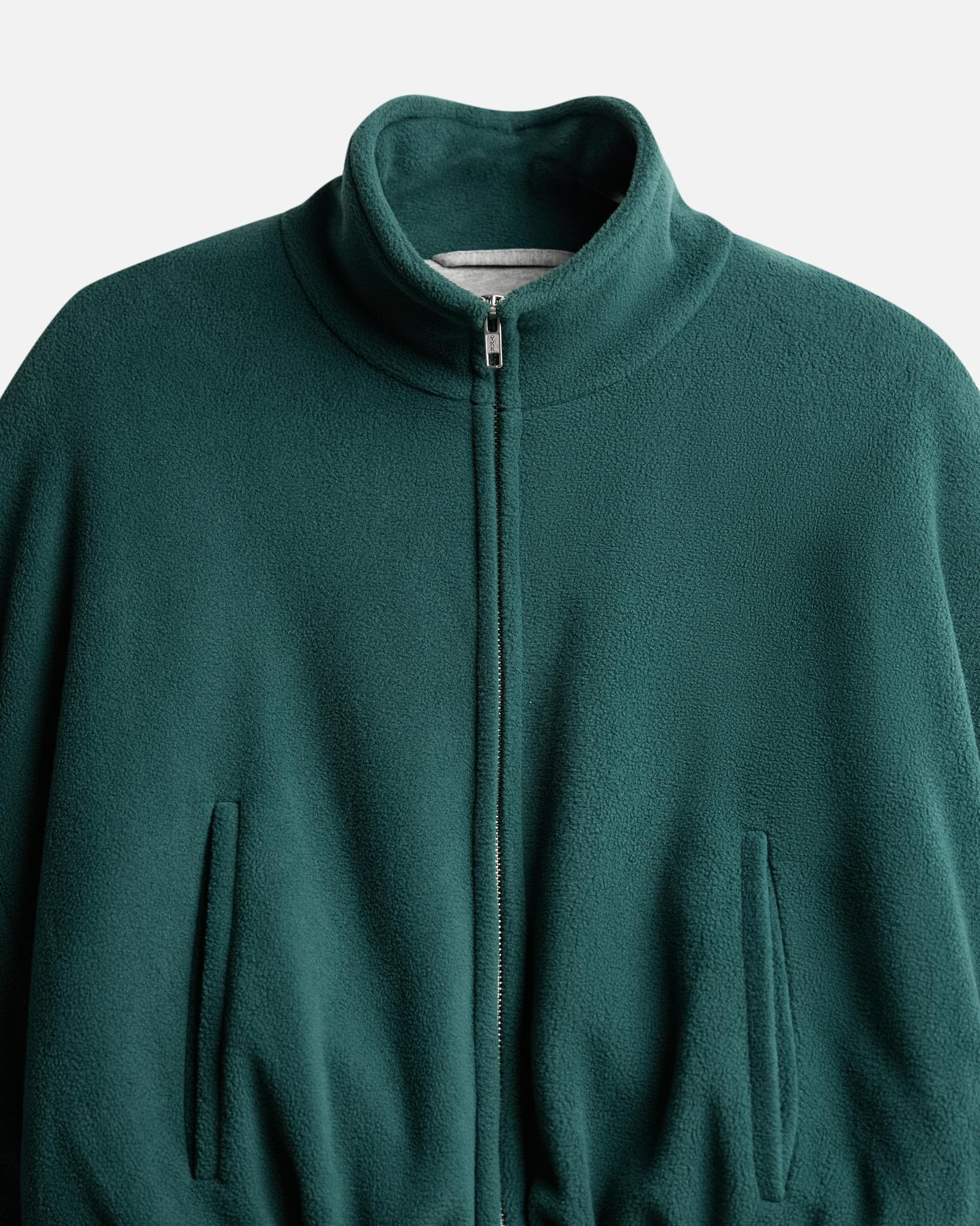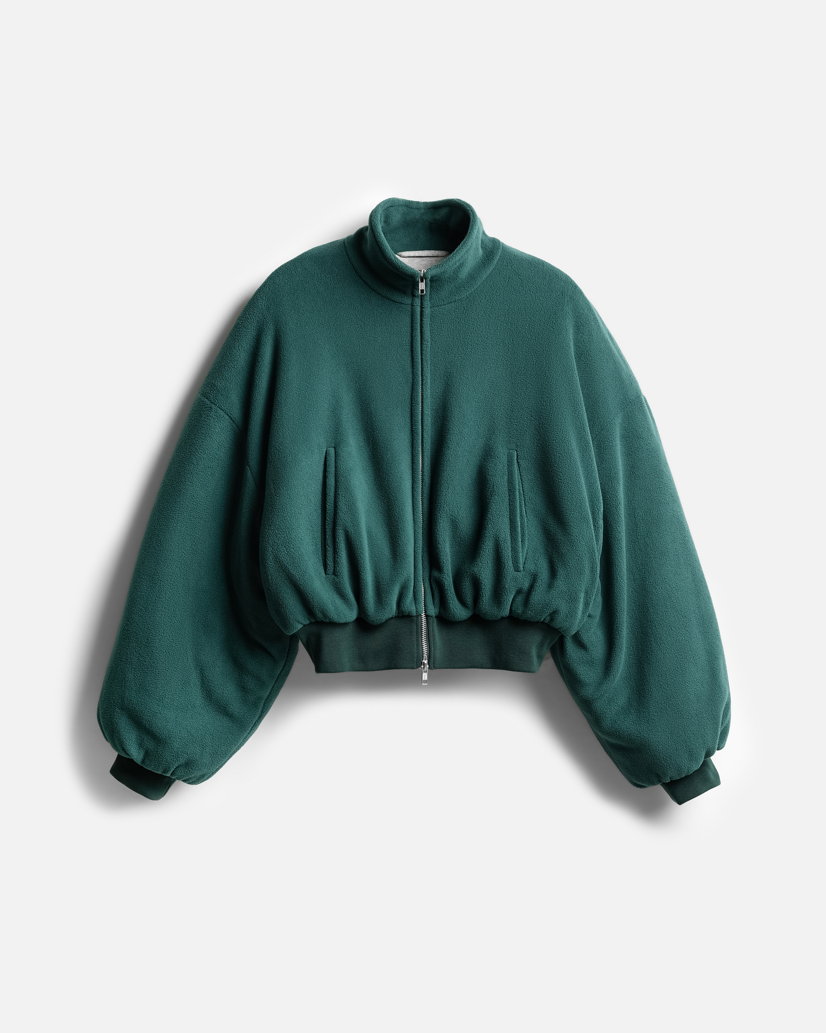 Утеплённый бомбер из флиса с воротником и молнией по центру. Объёмные рукава и собранный низ создают округлую форму, в которой чувствуется тактильность и защищённость. Вертикальные карманы встроены в конструкцию, сохраняя поверхность изделия чистой.