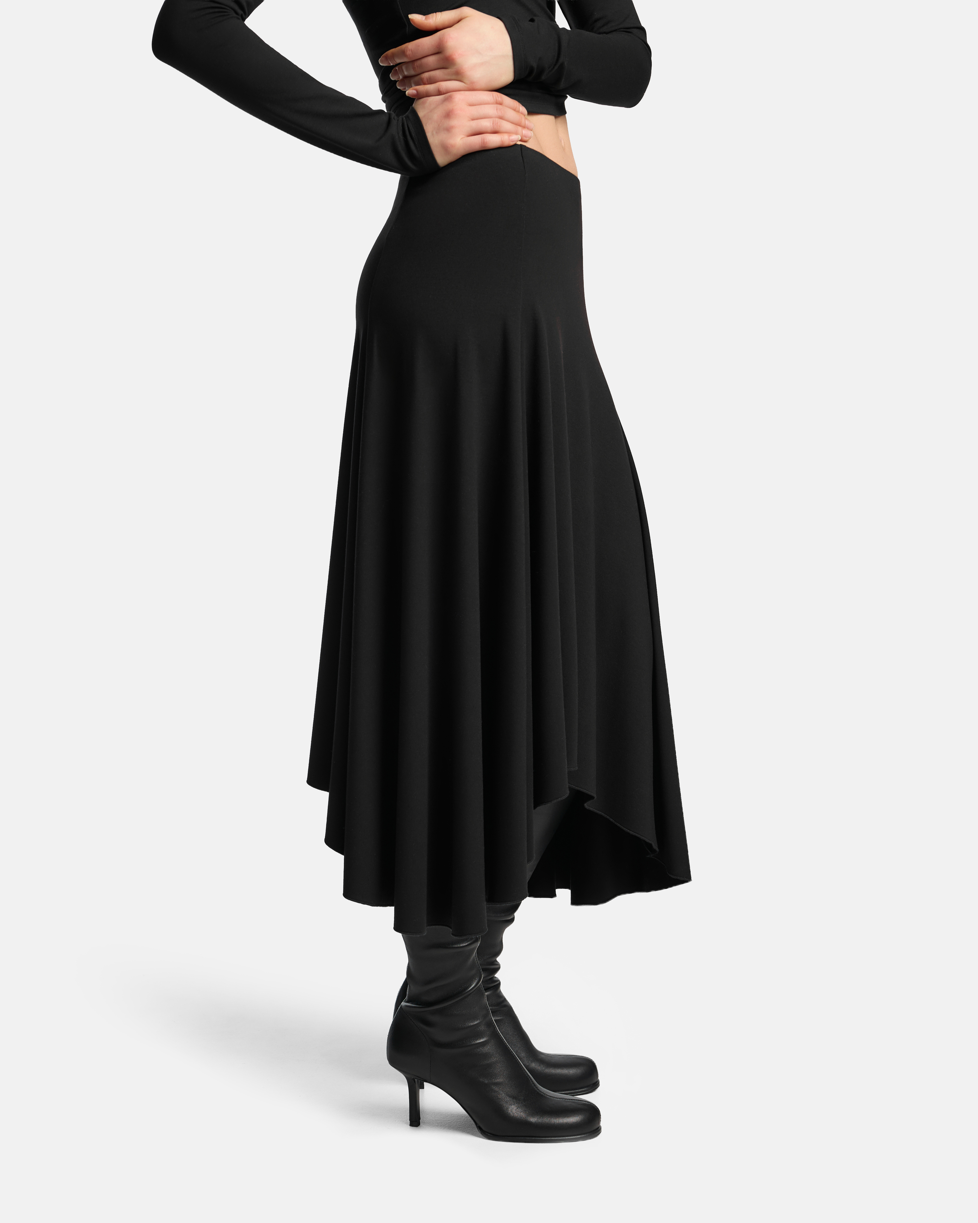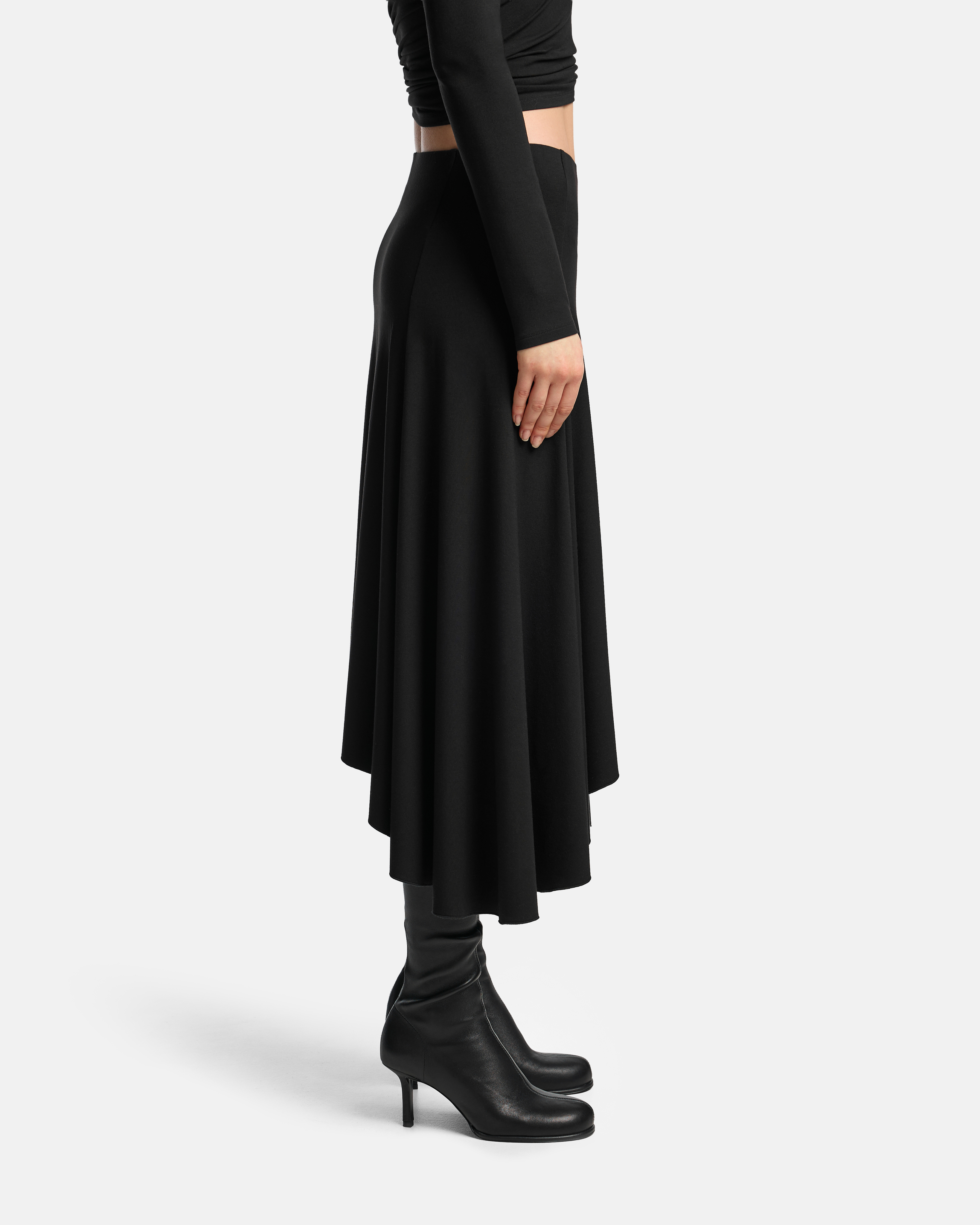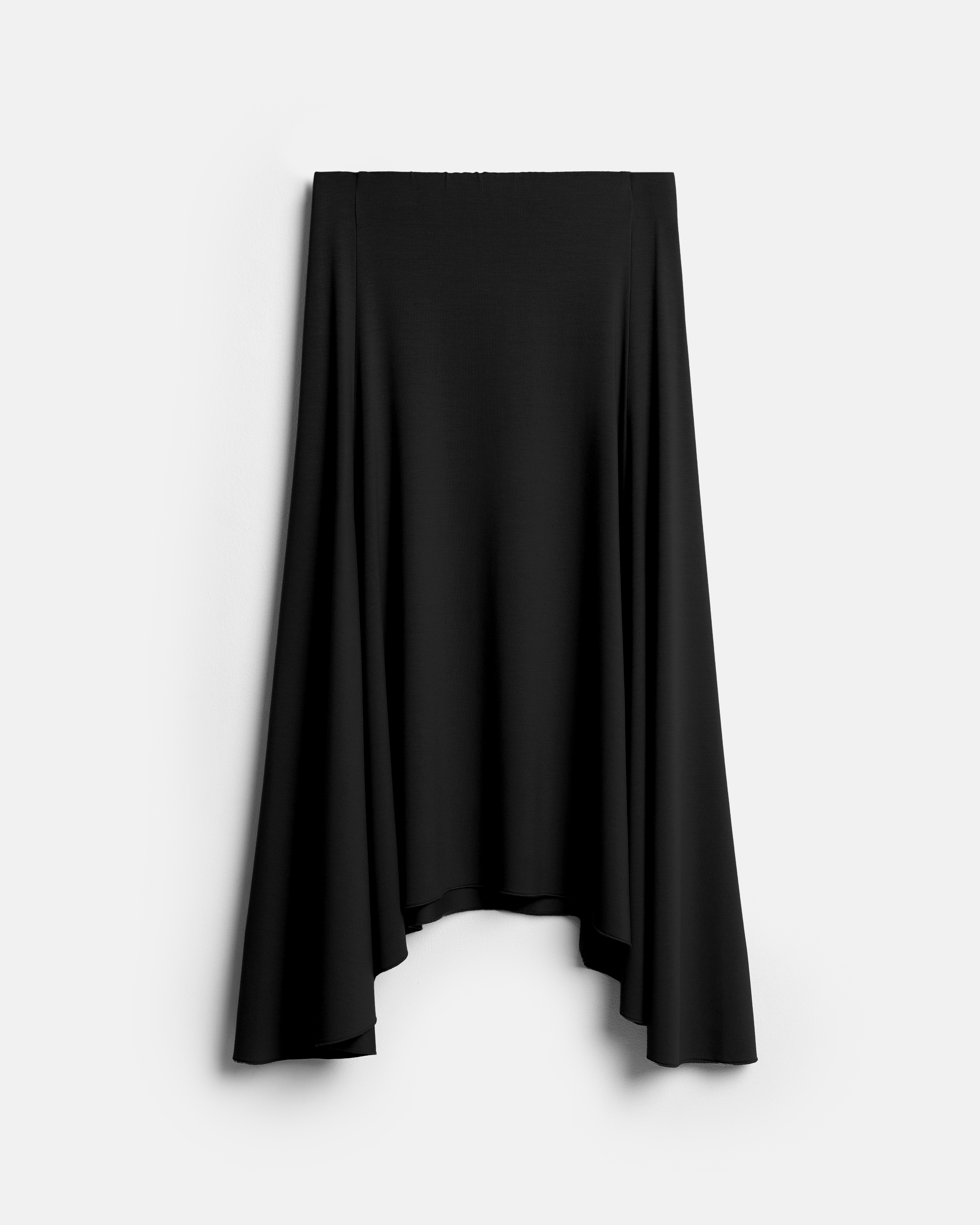 Юбка-солнце из вискозного трикотажа с неровным асимметричным краем и неупорядоченными складками, которые формируют подвижный, меняющийся силуэт. Линия низа выглядит неодинаково с разных ракурсов, создавая ощущение текучести и движения ткани.