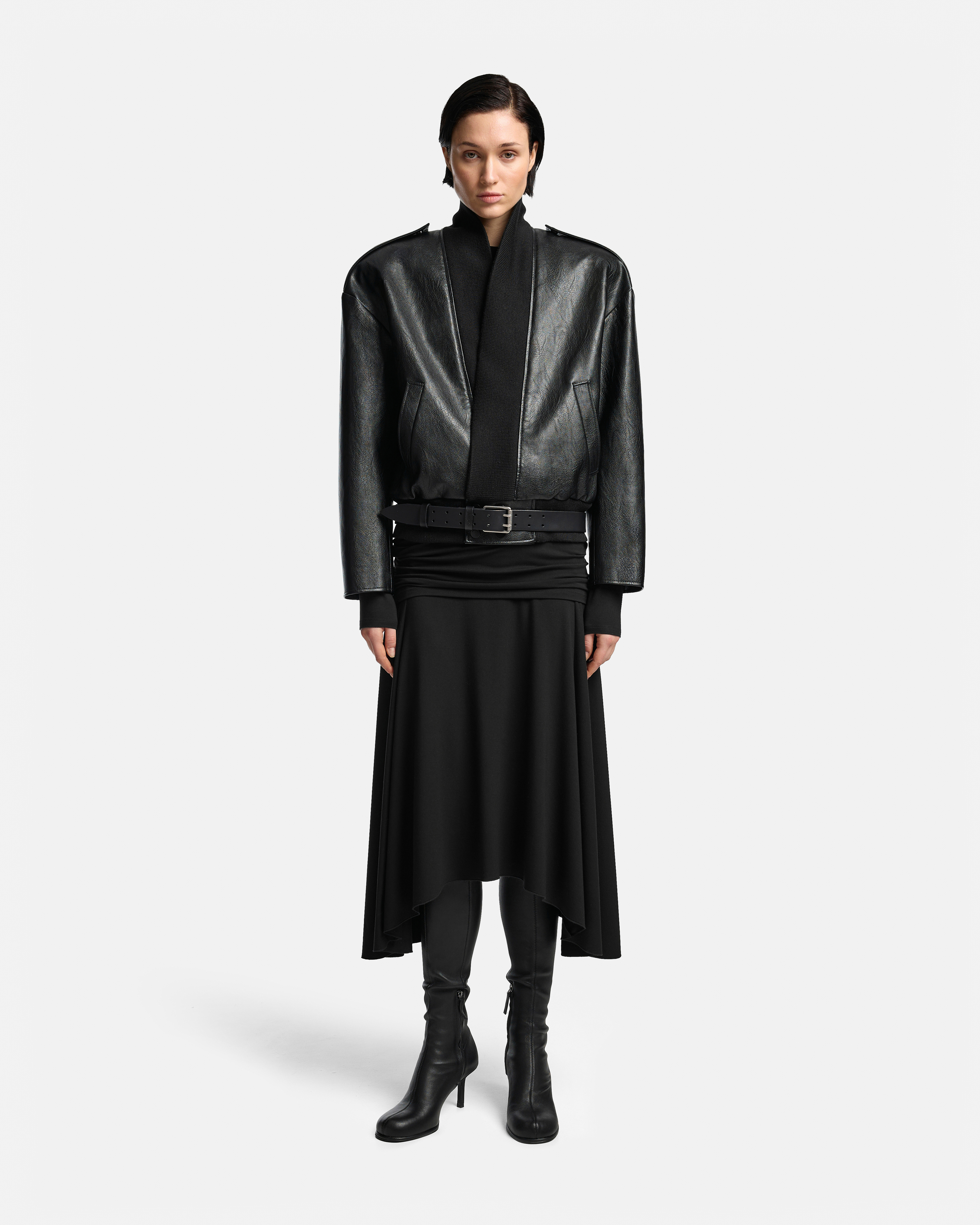 Конструкция предполагает вариативную посадку: изделие можно носить со смещением, меняя расположение удлинённых участков полотна, или переместить пояс на резинке с бёдер на талию — в этом случае длина визуально становится короче, а пропорции силуэта меняются.
