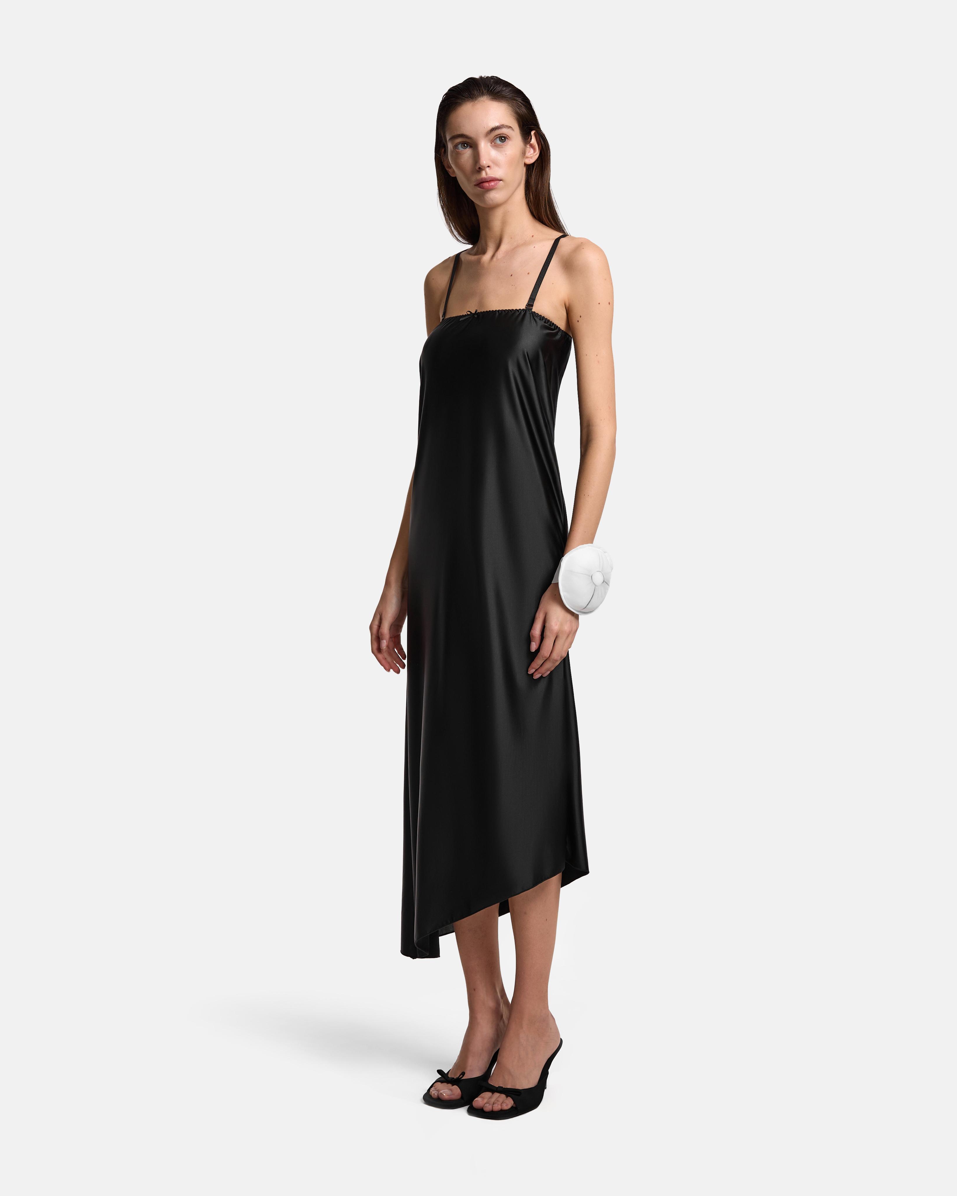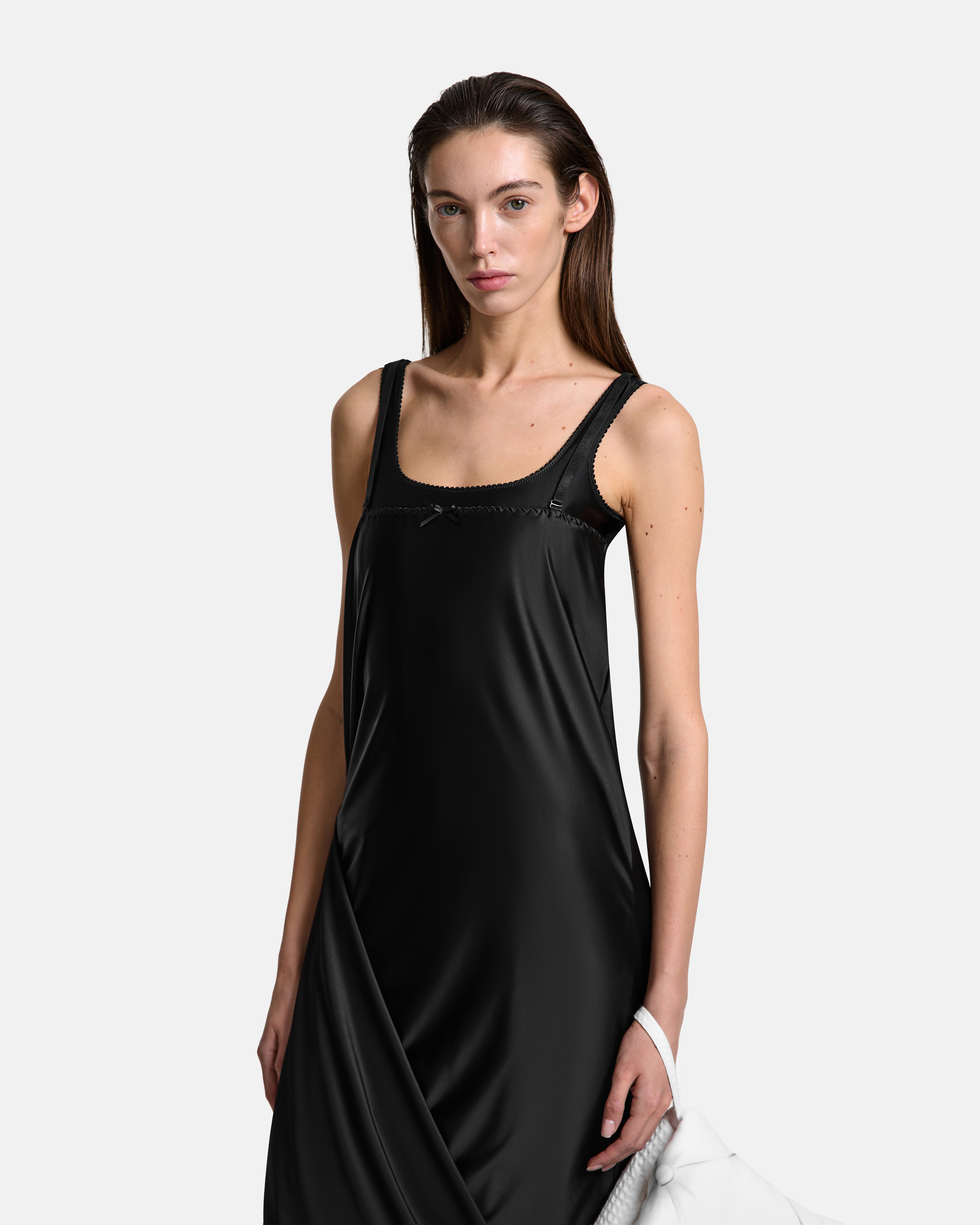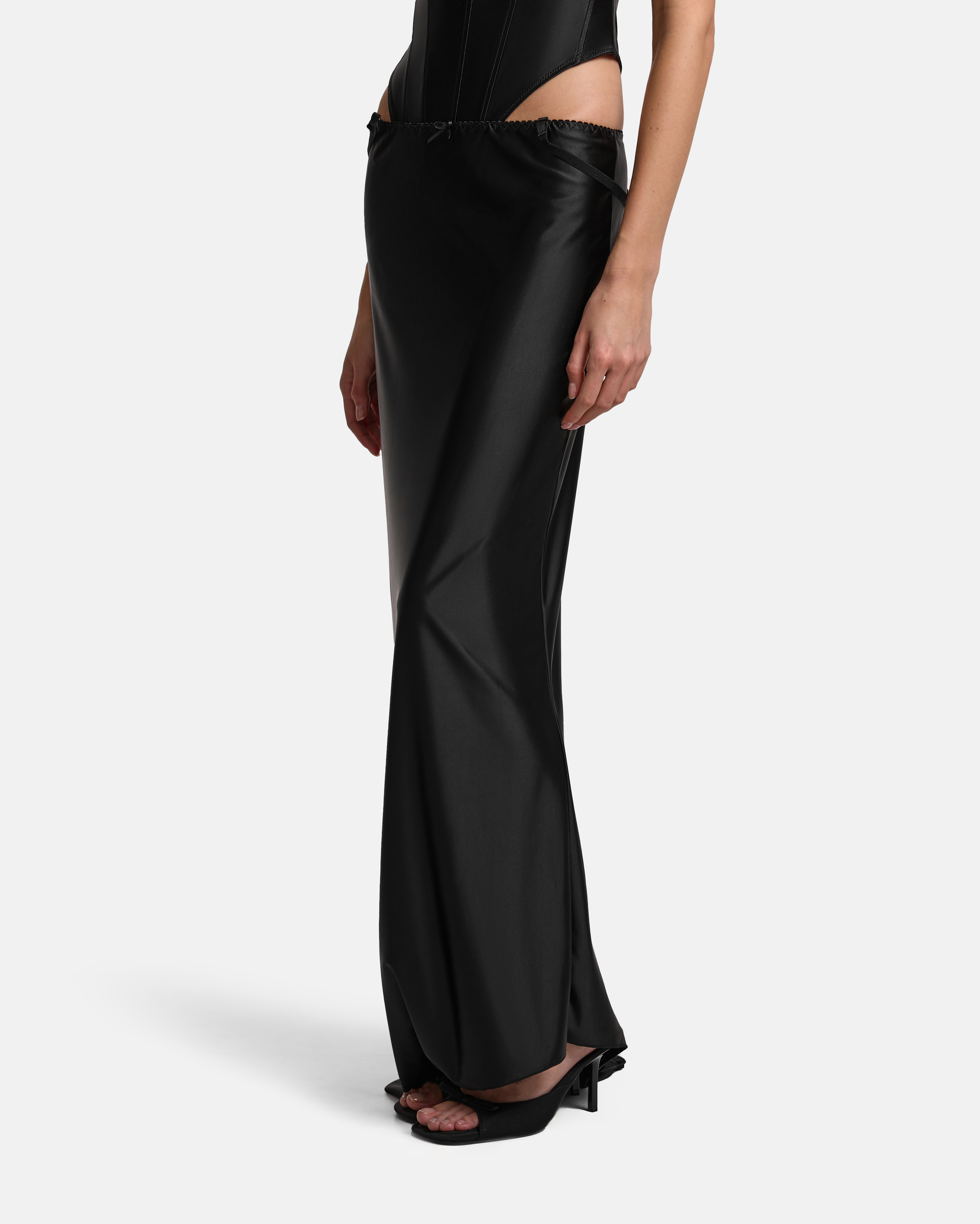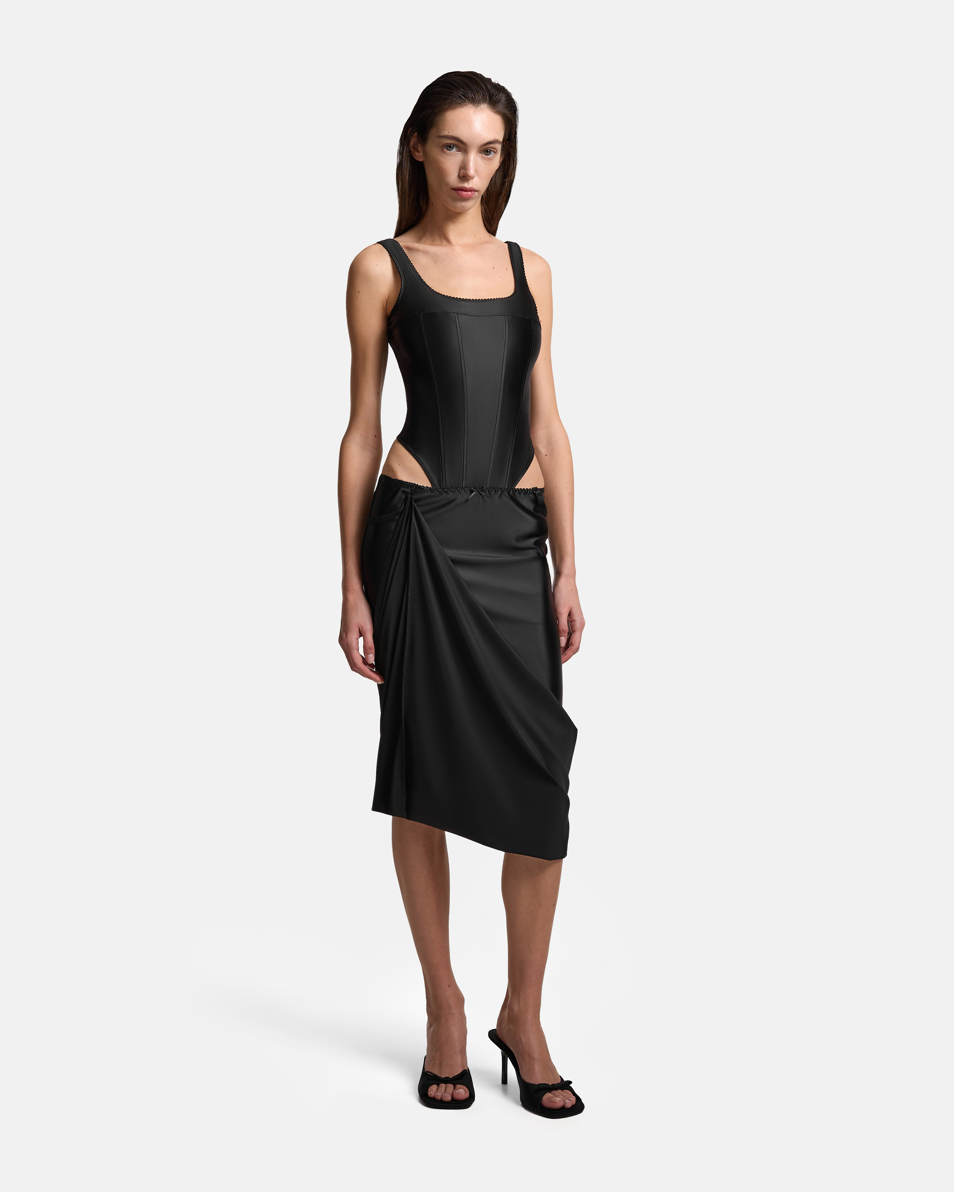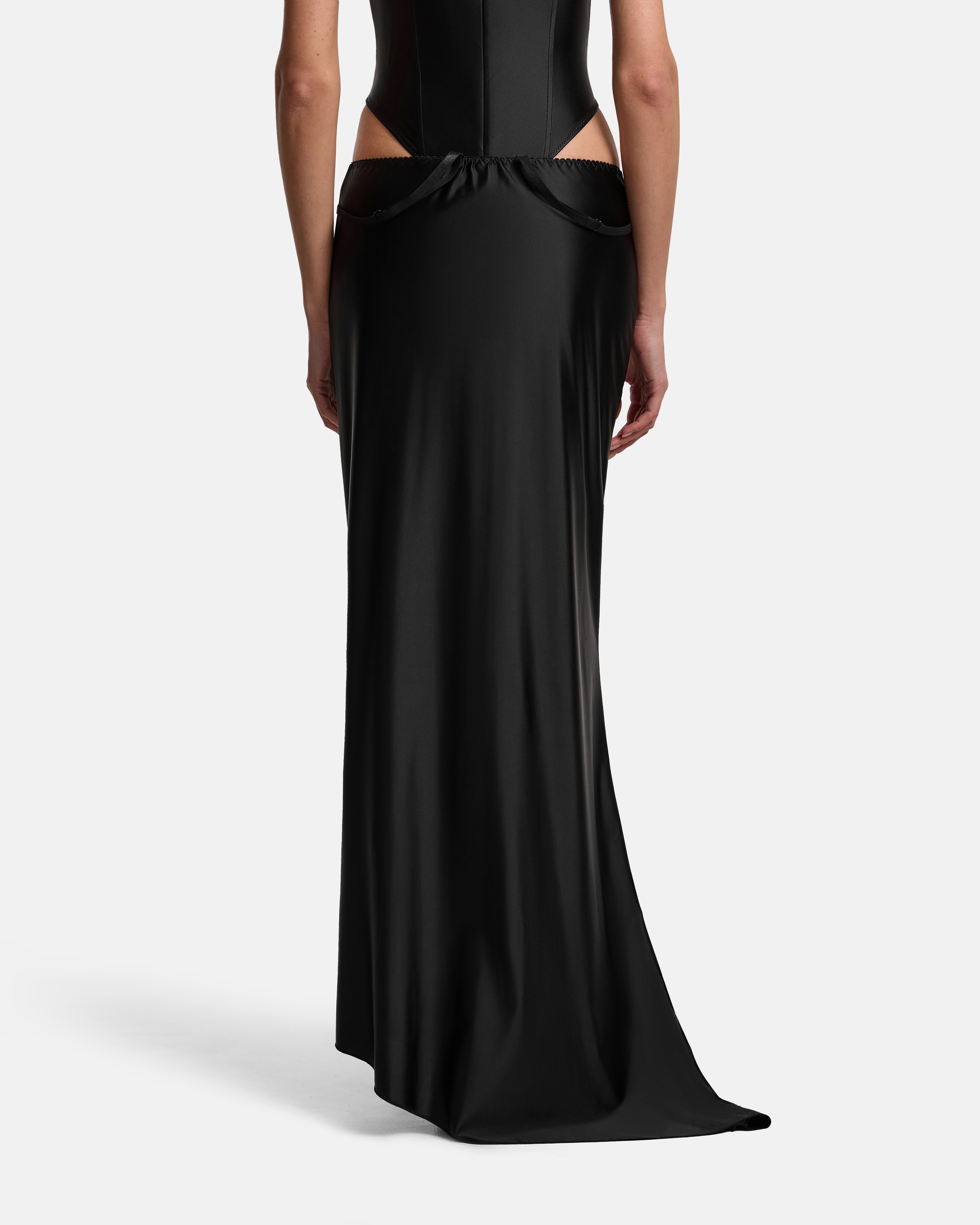 Юбка‑трансформер из бифлекса. Пояс на бельевой резинке — аккуратная фиксация и отсылка к нижнему белью. С одного бока выходит шлейф, продолжая линию юбки. В боковой шов вшит потайной крючок: за него можно собрать полотно, сформировать драпировку и укоротить длину. К поясу пришиты регулируемые бретели — изделие легко трансформируется в платье.